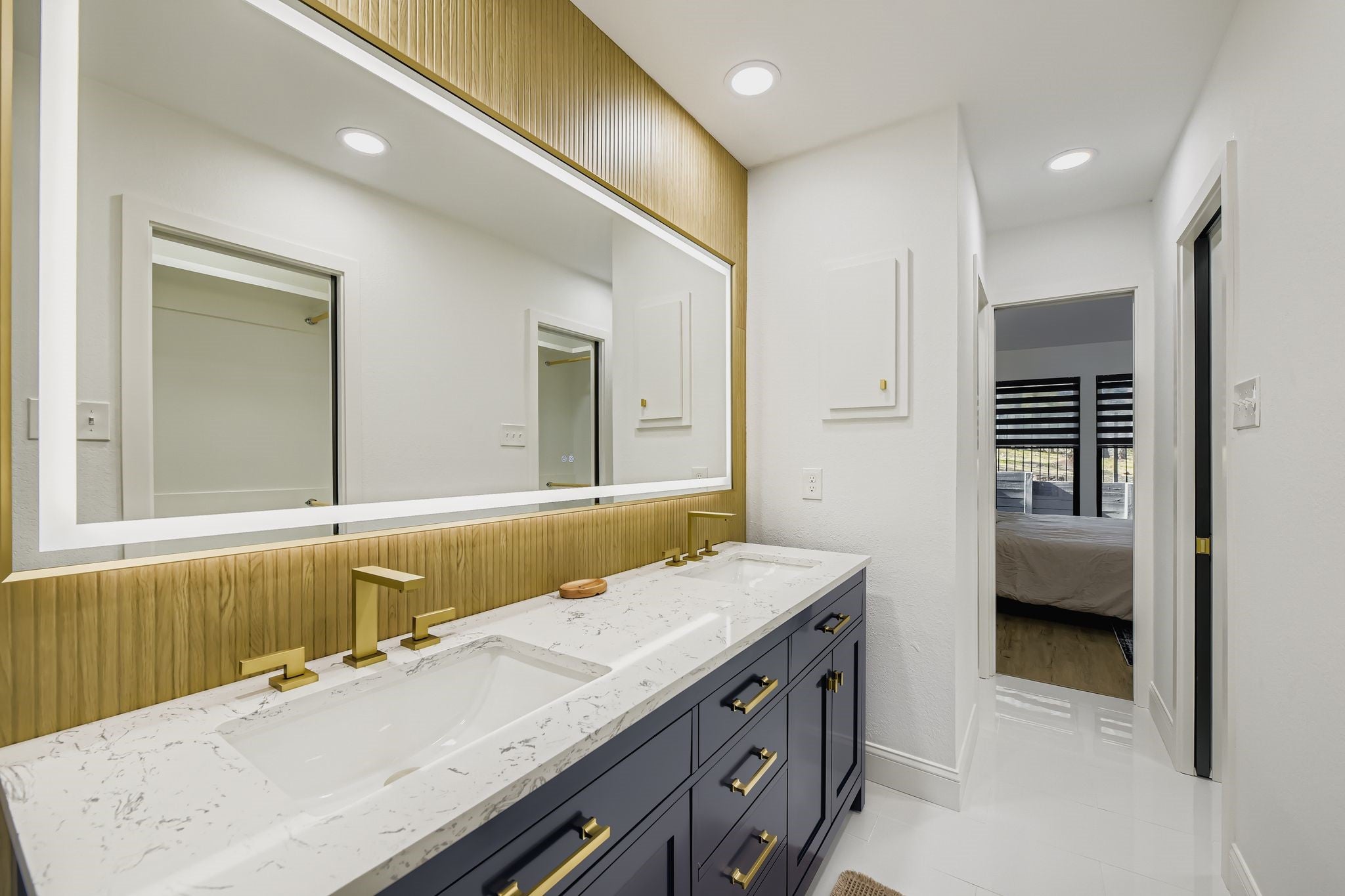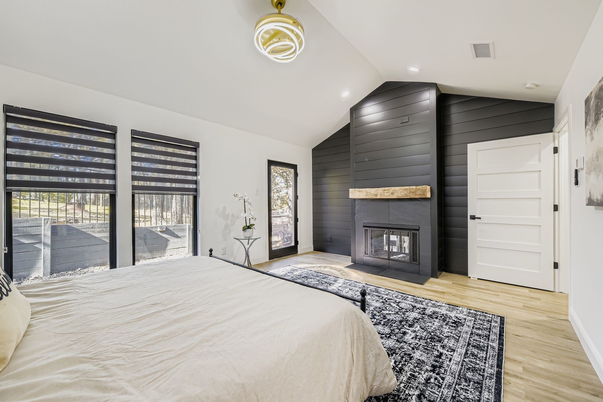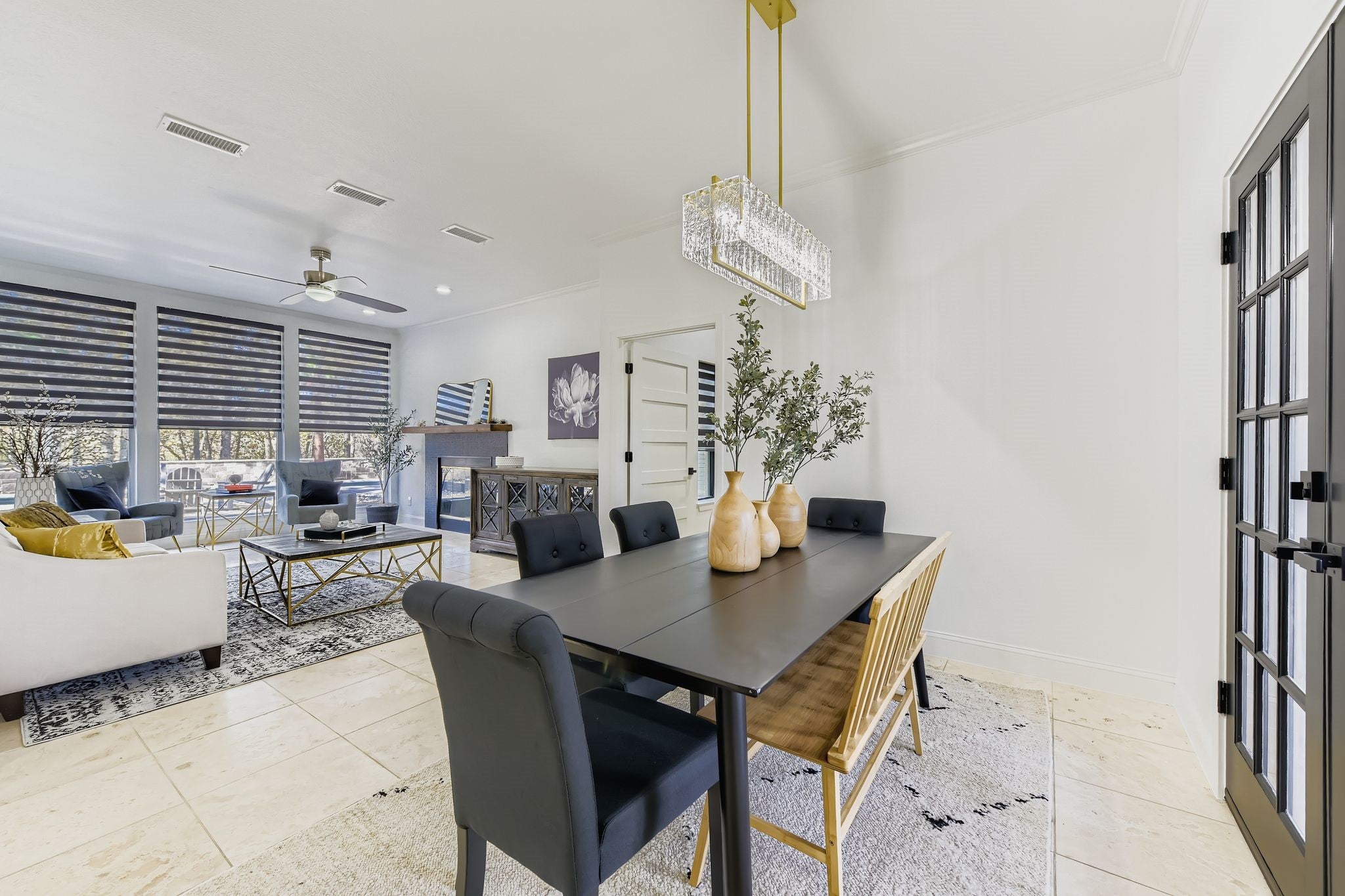 Newly renovated modern contemporary home situated on nearly two acres in Argyle ISD, offering exceptional privacy, peace, and quiet. A long driveway leads to this thoughtfully redesigned residence, featuring brushed gold-toned finishes, clean lines, and a striking see-through fireplace connecting the dining room with wet bar to the master bedroom, creating a unique and elegant focal point.