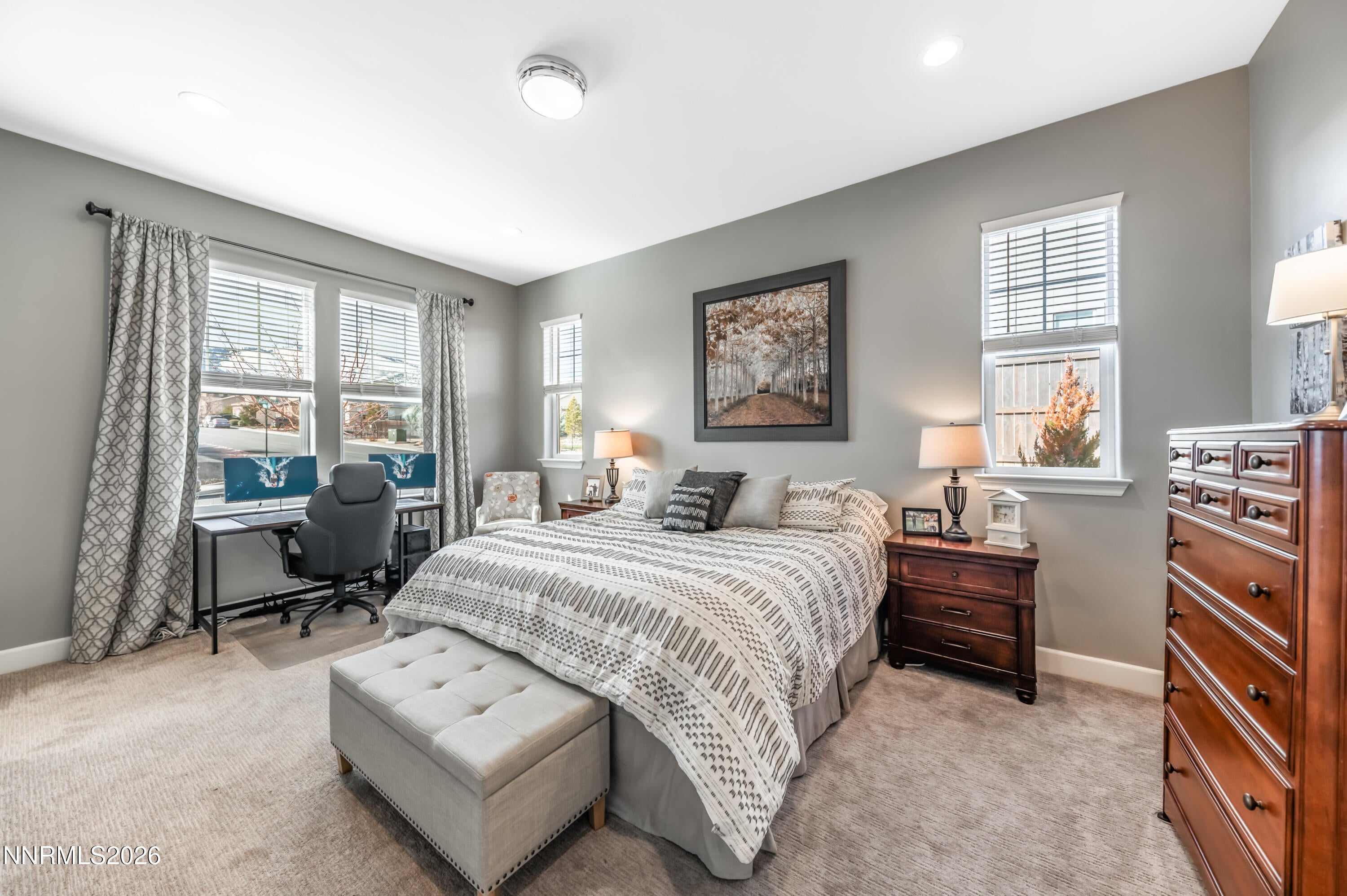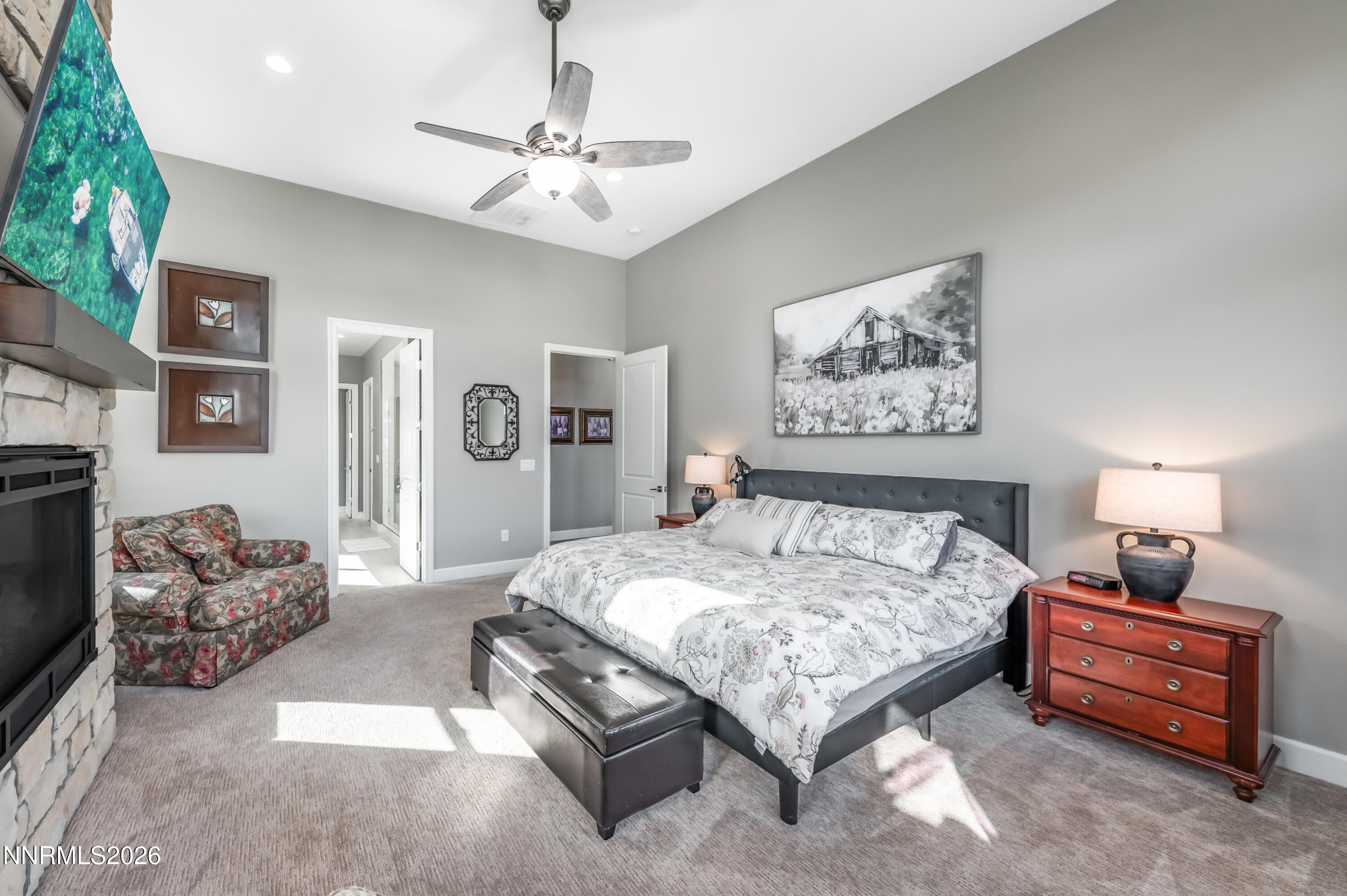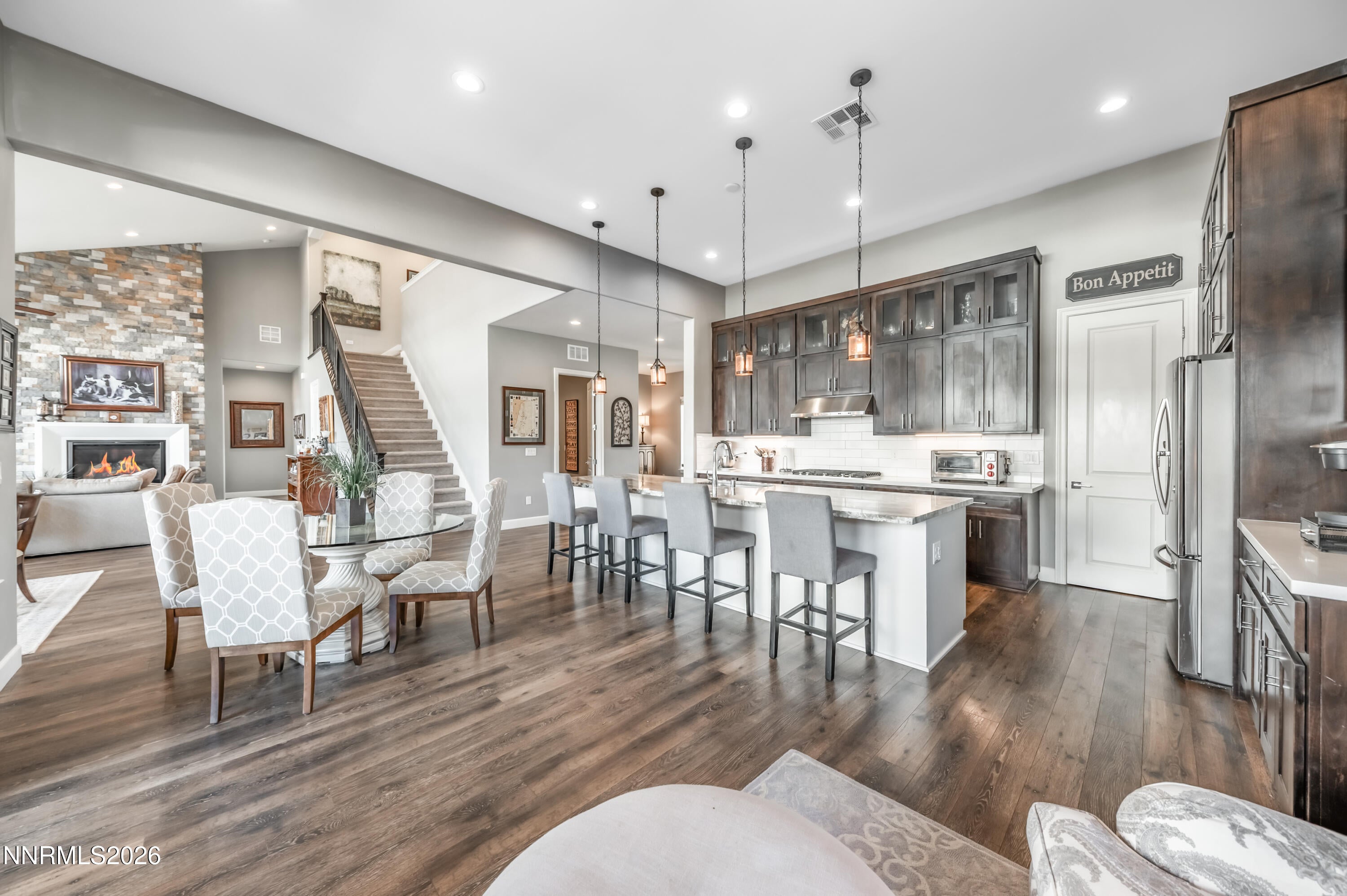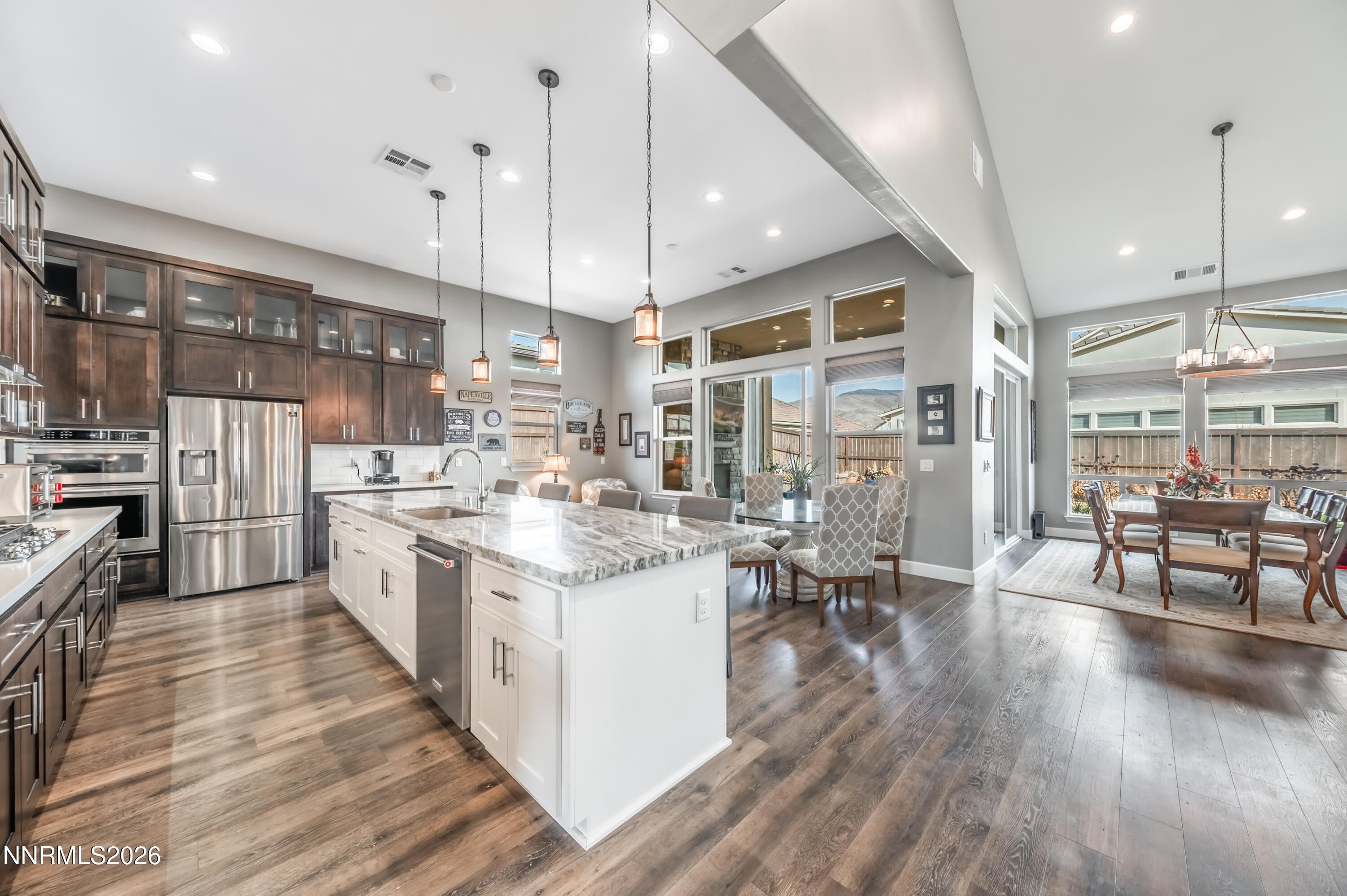 Welcome to 9075 Hudson Drive, where refined design meets effortless Nevada living. This thoughtfully crafted two-story home greets you with striking stone accents and a paver driveway, setting the tone for the quality and care found throughout. Inside, the heart of the home is an expansive chefs kitchenanchored by a generous granite island, rich cabinetry, stainless steel appliances, and pendant lighting that feels both stylish and inviting. Open sightlines connect seamlessly to the dining area and great room, making everyday living and entertaining feel wonderfully natural. The great room impresses with soaring ceilings, oversized windows, and a dramatic stone fireplace, creating a warm yet airy space to unwind. Natural light pours in, highlighting the homes neutral palette and beautiful flooring. The primary suite is a true retreat, offering ample space, soft natural light, and a spa-like bath designed for relaxation. Secondary bedrooms are well-proportioned and versatileperfect for guests, home offices, or creative spaces. Step outside to enjoy a covered balcony with sweeping mountain views, an ideal spot for morning coffee or evening sunsets. Low-maintenance landscaping ensures more time enjoying the surroundings and less time on upkeep. Set in desirable Verdi, this home combines peaceful neighborhood living with easy access to Reno, outdoor recreation, and the Truckee River corridor. Elegant. Comfortable. Perfectly positioned. This is a home that feels as good as it looks.