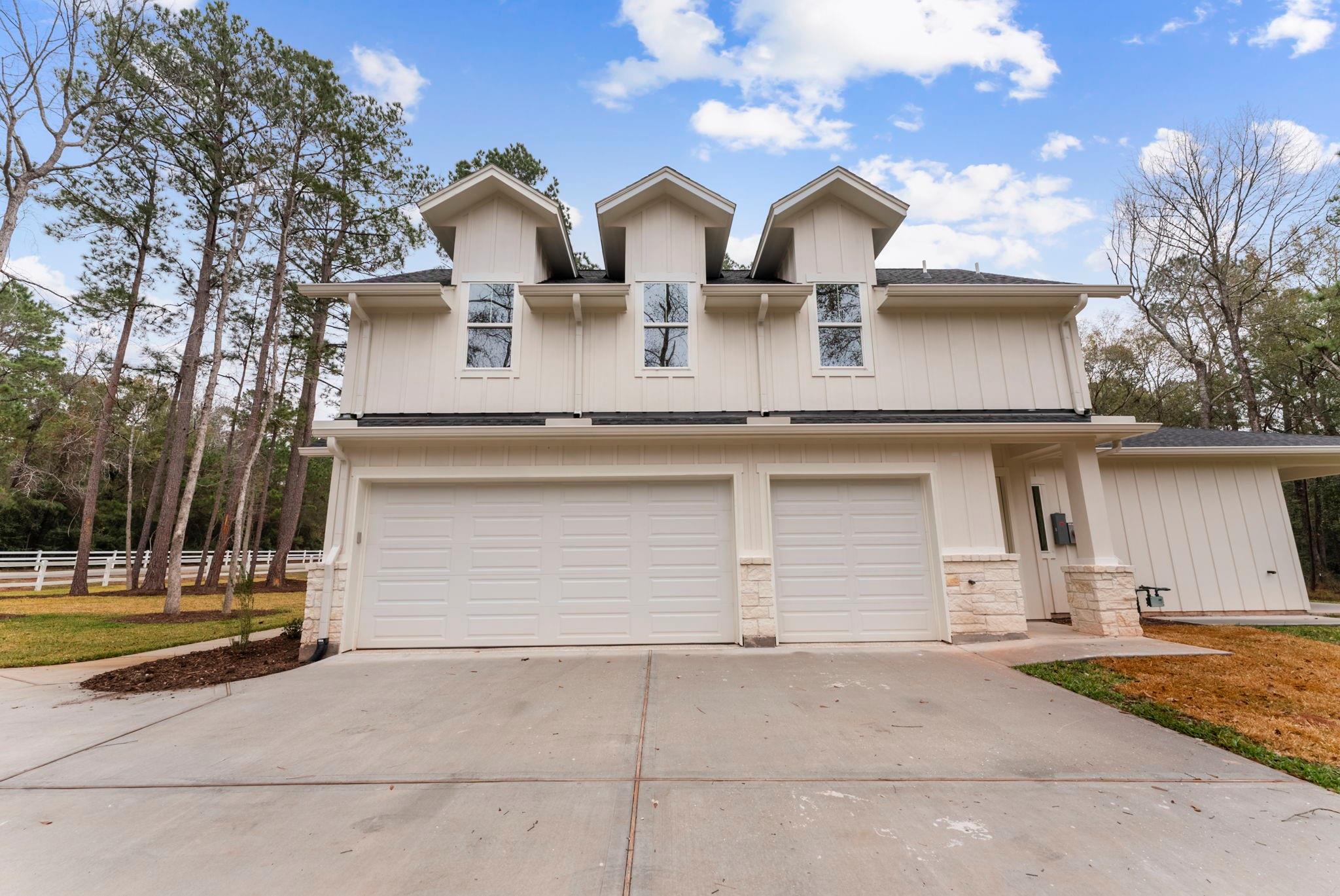 Absolutely beautiful custom farmhouse home on a full acre in the peaceful community of Thousand Oaks, just 5 minutes from The Woodlands! This home is perfectly situated on a lovely, wooded lot with plenty of privacy and space for a huge pool plus anything else your heart desires. From the welcoming front porch to the balconies overlooking the private wooded lot, you will love all of the opportunities to soak in the peacefulness of the country. Gorgeous wide plank wood flooring flows through the home. The family room is accented with wooden beams and a floating mantle above the large stone fireplace. Downstairs you will find the primary bedroom suite overlooking the backyard plus one additional bedroom with ensuite bath and huge custom closet. Upstairs are two additional bedrooms with ensuite baths, private balconies, and custom closets, plus a game room and an enormous bed or bonus room. Patio with vaulted ceiling & outdoor kitchen. Lovely, peaceful - the perfect place to call home!