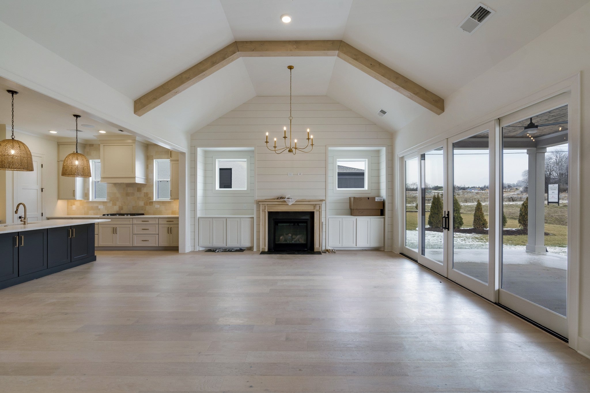 Exceptional Woodridge Homes custom design in an intimate 16-lot community. This thoughtfully crafted residence showcases main-level living with two bedrooms, plus a gourmet kitchen featuring gas cooktop, generous island, and walk-in pantry. The vaulted great room with architectural beamed ceiling creates an impressive gathering space.