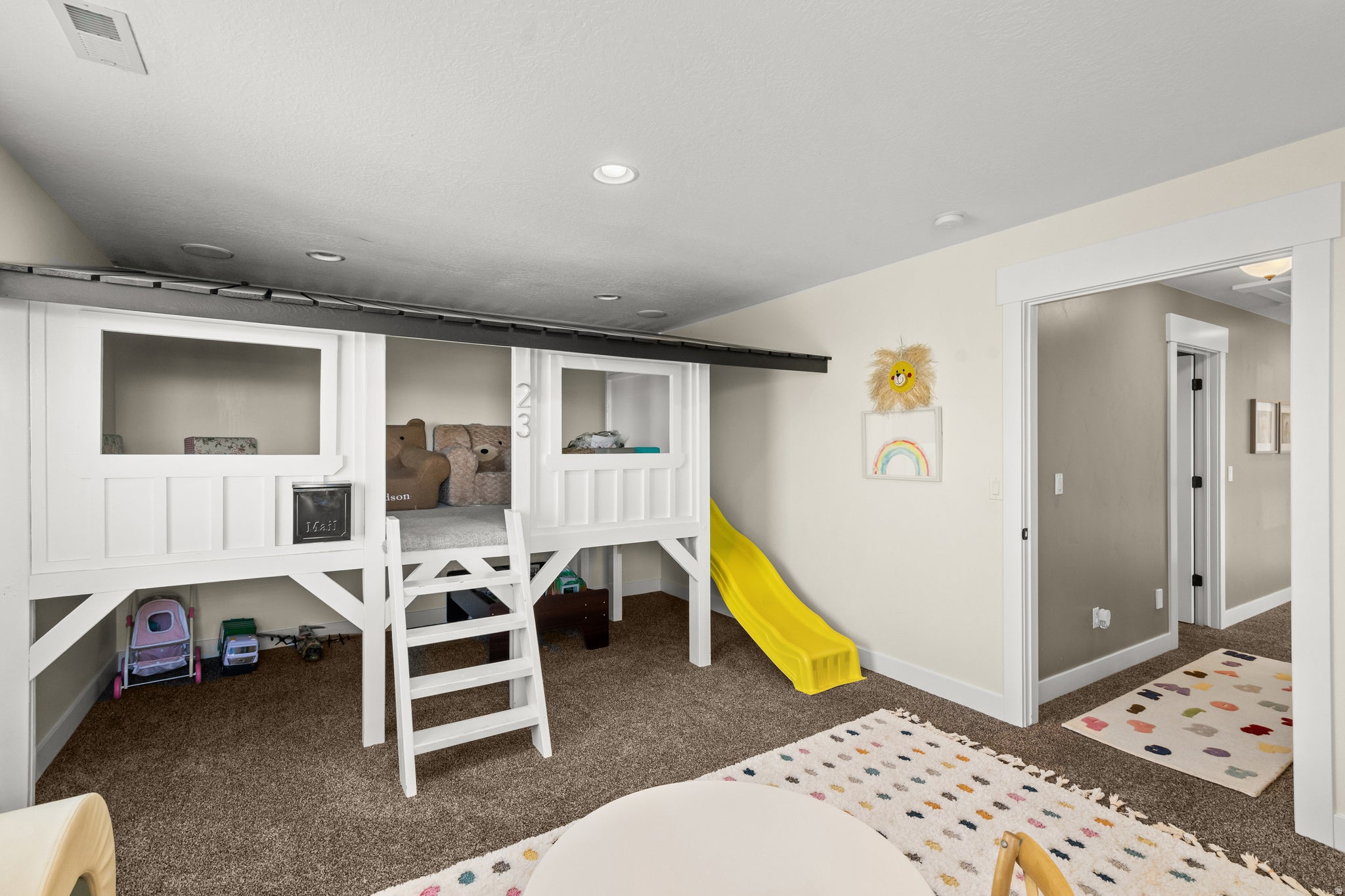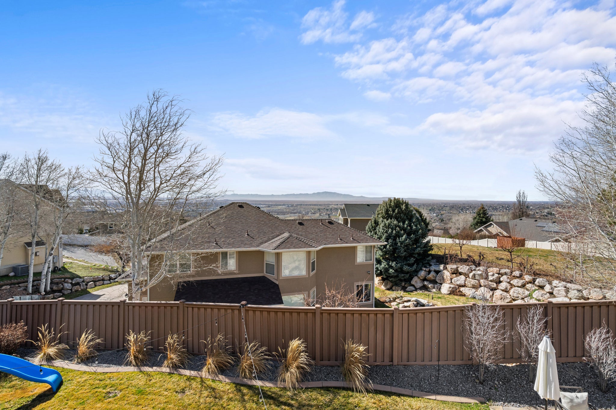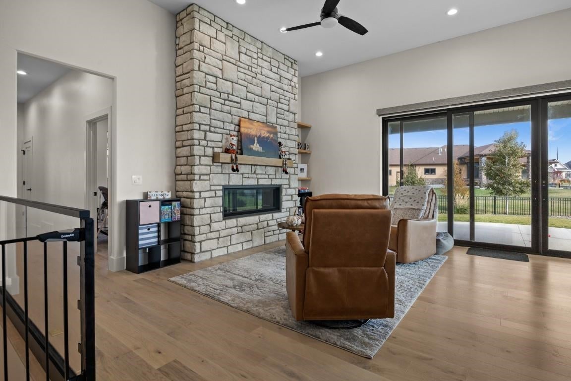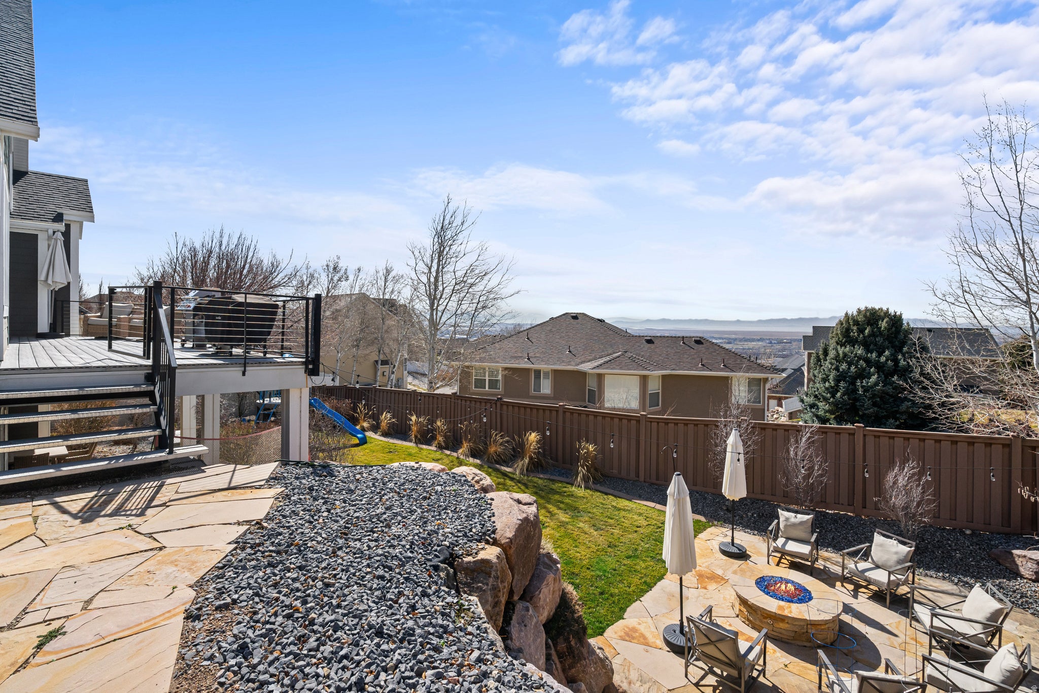 Perfectly positioned on the coveted Farmington East Bench! This custom two-story offers main-level living with breathtaking mountain & lake views. Close to scenic hiking trails, a neighborhood park, with the shopping, dining, & entertainment of Station Park close by. Designed with entertaining in mind, this home features a spacious open-concept great room & kitchen with upgraded trim throughout, soft-close cabinetry, a custom range hood, farmhouse sink, & built-in dining bench seating. Multiple exits lead to the large deck, creating seamless indoor-outdoor living perfect to take in the views. The vaulted primary suite on the main level offers a luxurious retreat with a spa-style bathroom featuring a soaker tub, walk-in shower, separate vanities, & a large walk-in closet. Upstairs youll find three additional bedrooms & a versatile loft/office space, including a bedroom currently designed as a playroom complete with a custom built playhouse. The fully finished basement is built for fun & gathering with laminate flooring, a large wet bar, & an open-concept theater room with stage seating. Kids will love the slide & playroom tucked under the stairs. Additional highlights include a custom safe/vault room, large guest bedroom with walk-in closet, hidden storage room, & walkout access to a covered patio. Outside, enjoy mature landscaping with drip irrigation, RV parking, and a 4 car epoxy-coated garage with built-in storage & workbench.