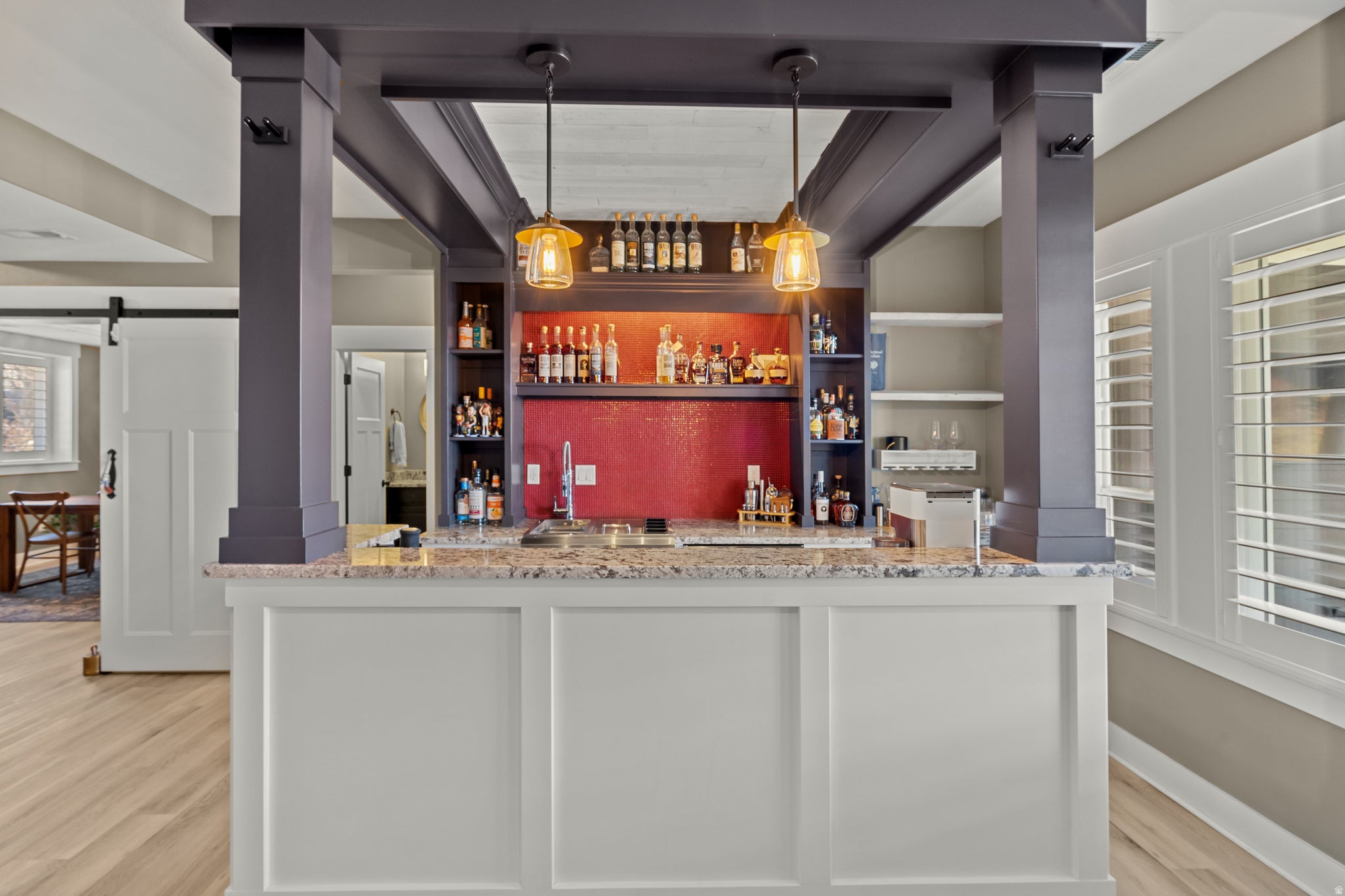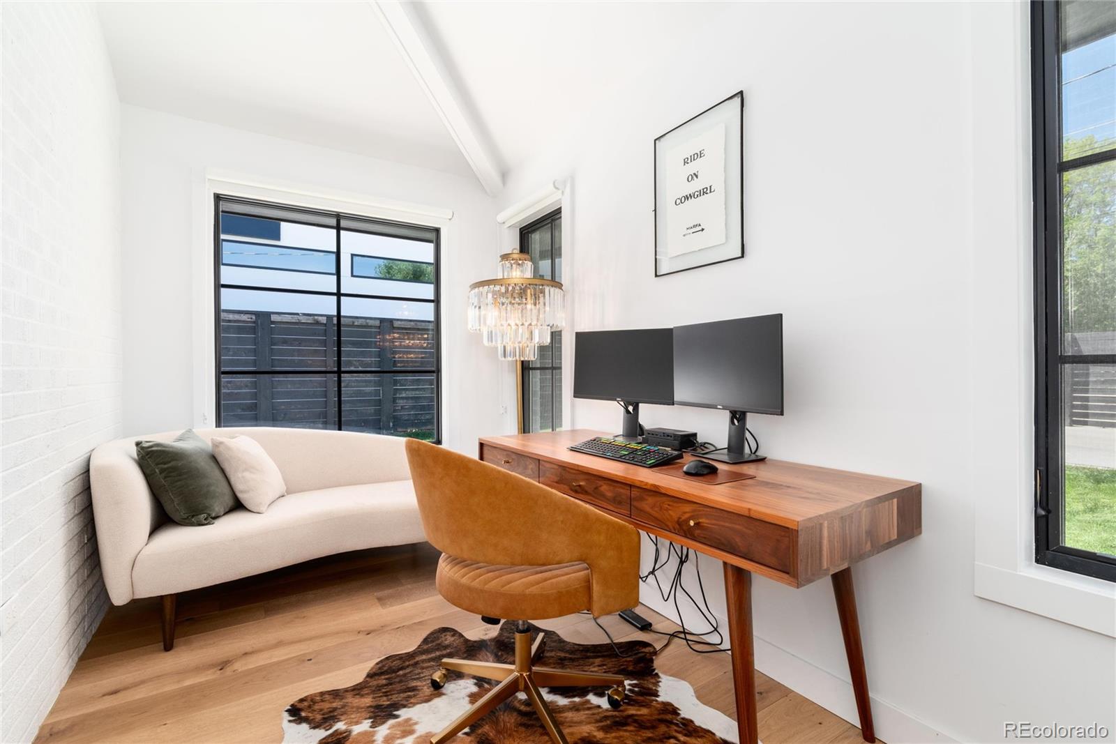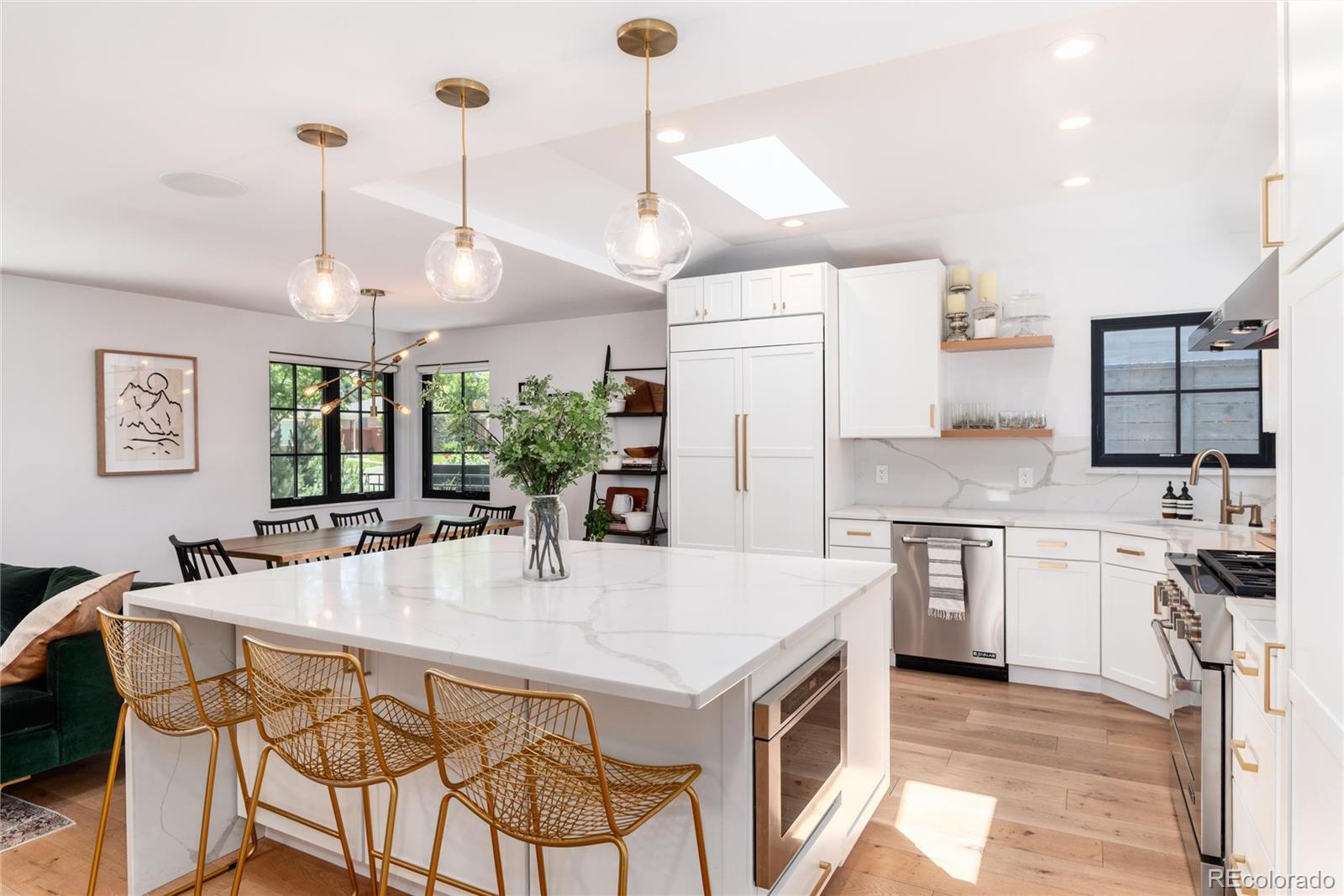 Take the virtual tour and see for yourself how expansive this home truly feels: https://media.cineflyfilms.com/1065-S-Monroe-St. Ideally located in the heart of sought-after Belcaro, this 3-bedroom, 2-bath mid-century modern ranch blends timeless design with contemporary luxury. The gourmet kitchen is a chefs dream, showcasing a stunning quartz waterfall island and top-tier JennAir appliances. The spacious family room is filled with natural light from expansive picture windows and features vaulted ceilings, a Haiku smart fan, and French doors leading out to the beautifully landscaped backyard. The luxurious primary suite includes vaulted ceilings, an oversized walk-in closet with a premium organization system, and a versatile den with exposed brick and glass French doors-ideal for a private office or reading nook. The en-suite bath is a showstopper with a skylight, double vanity, quartz counters, and a large glass-enclosed shower with modern brass fixtures. Two additional bedrooms are generously sized and beautifully detailed with custom wall paneling and wainscoting. The second full bath has been fully remodeled to match the homes elevated style. Outside, enjoy a spacious fenced backyard with lush landscaping, rose bushes, and a large patio perfect for gatherings. A detached two-car garage completes this exceptional property. Situated in the historic and picturesque Belcaro neighborhood, this home offers easy access to Cherry Creek, Wash Park, South Gaylord Street, and an abundance of trendy shops, award-winning restaurants, and vibrant nightlife. Updates include: *Tankless Water Heater *Smart Ceiling Fans, Thermostat & Gargage Door Opener *New Roof in 2023 *New Windows & French Door *Water Filtration System *Updated Electrical Wiring *Updated Landscaping & so much more!