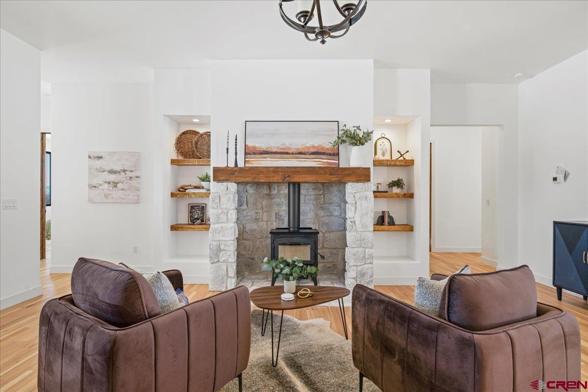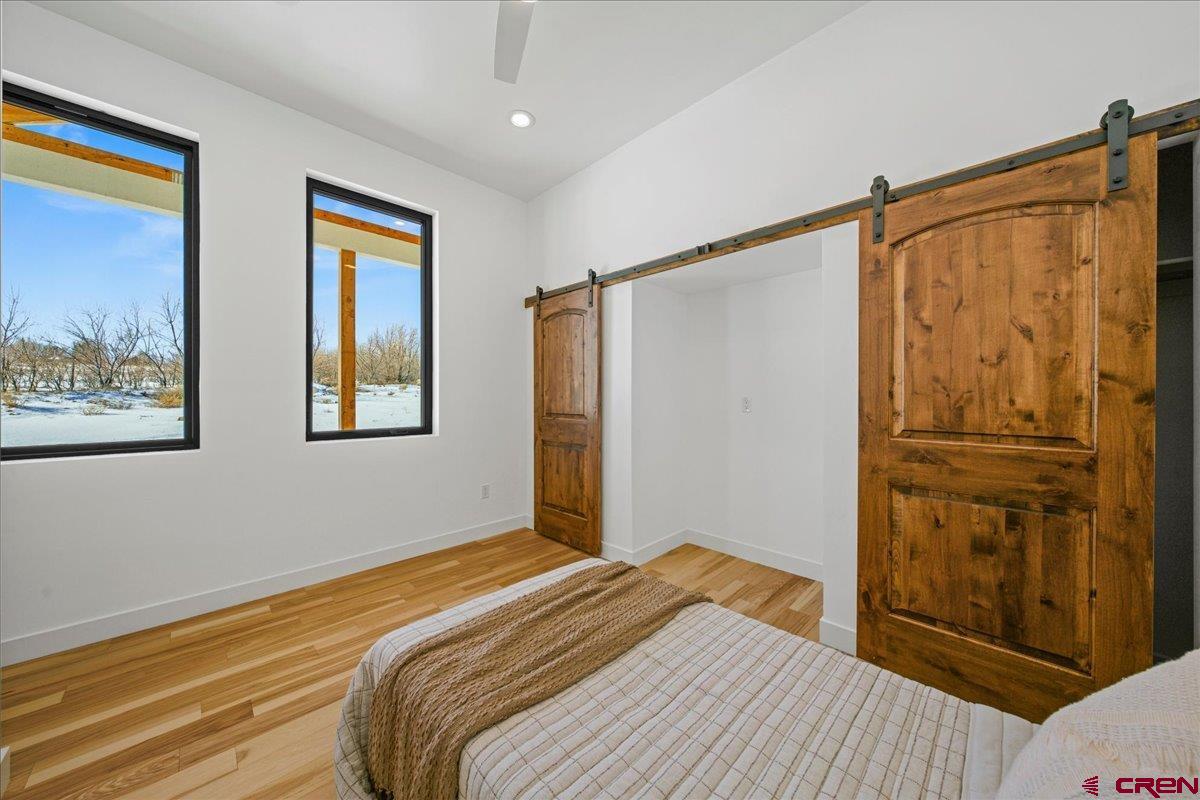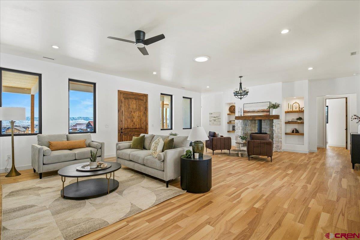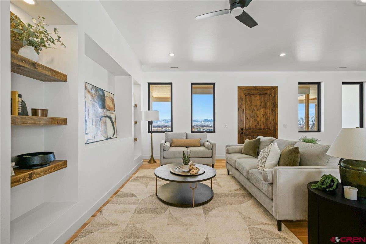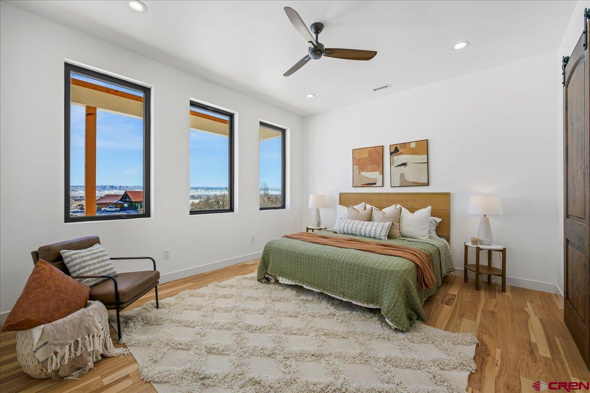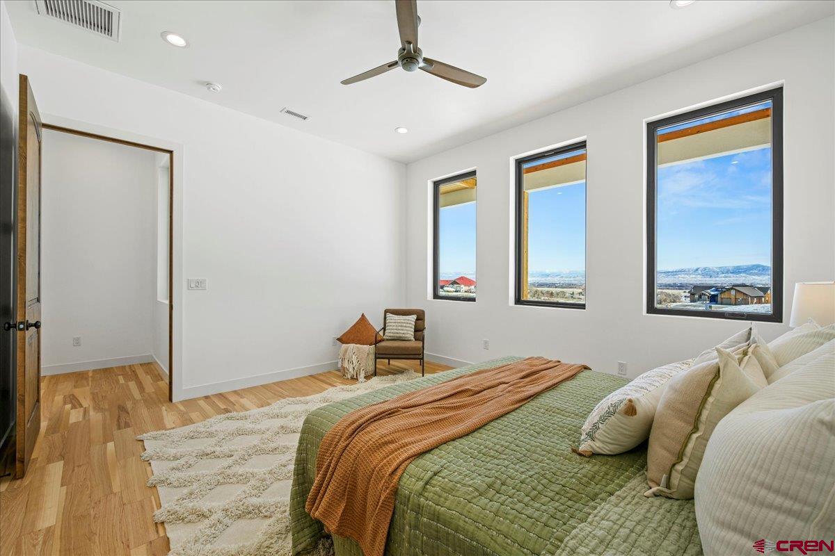 This 2800 sq ft newly built custom home sits on a stunning 3 irrigated acre lot overlooking beautiful Spring Creek Mesa. The residence features four bedrooms and three bathrooms, with an oversized 3 car-attached garage. Spacious kitchen with Quartzite countertops, ample counter space, and two ovens for convenient cooking. The large 7 x 15 walk-in pantry is spacious with plenty of room for storage of small appliances and extras. There is a separate dining area that has built in custom cabinets and Alder doors leading to the large deck for entertaining guests. The large & spacious living room include natural hickory flooring and 10 ft ceilings throughout the entire home. There is built in shelving and a beautiful stone surrounding wood burning stove. The large windows in the living room add natural light and highlight the views of beautiful Spring Creek Mesa. The primary bedroom is large and continues with the natural hickory flooring. The bathroom features a stand-alone tub, large walk-in tiled shower, and his & hers Quartzite counters with double sinks. There is also a large walk-in closet. The three additional bedrooms also have hickory flooring and Alder doors. There is a half bath with a sink conveniently located off the garage entrance and large mud room. Outside features include natural wood decking in front and the back of the home. There are large natural wood exposed beams on the front and back porches with tongue and grove soffits. The owner originally built this home for himself, so you know there was a little extra care put in the construction, this is not your typical spec home. This house is well-built from foundation to roof and includes a protective French drain for the foundation. The insulation is also the best you can get with closed cell spray foam in the walls and roof decks. The paint is eco-nontoxic. The base is secured atop a 16-inch thick sandstone layer, providing reliable support and stability.