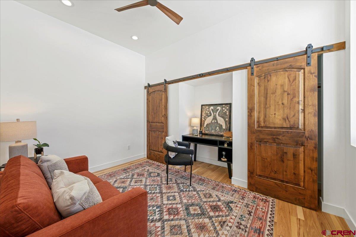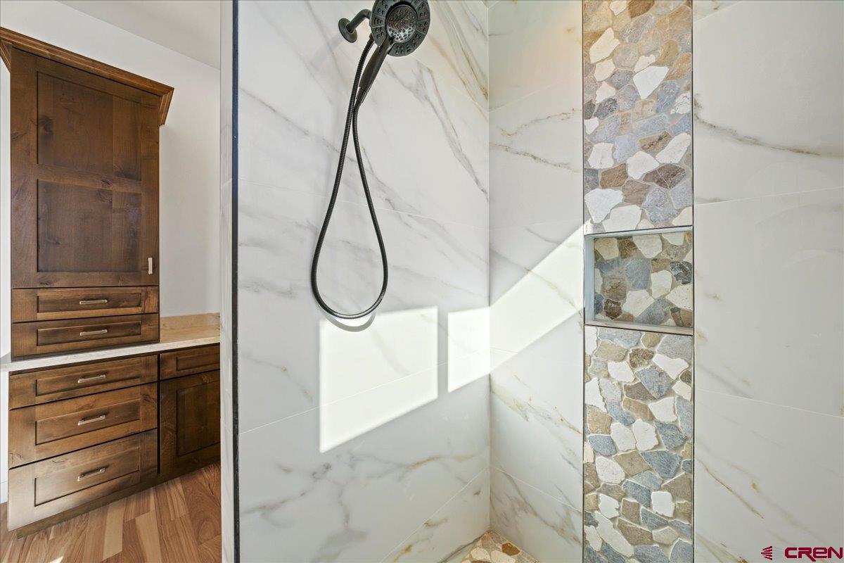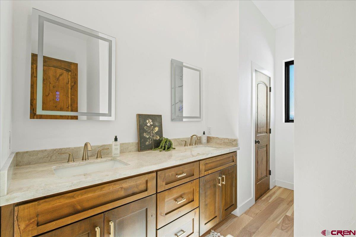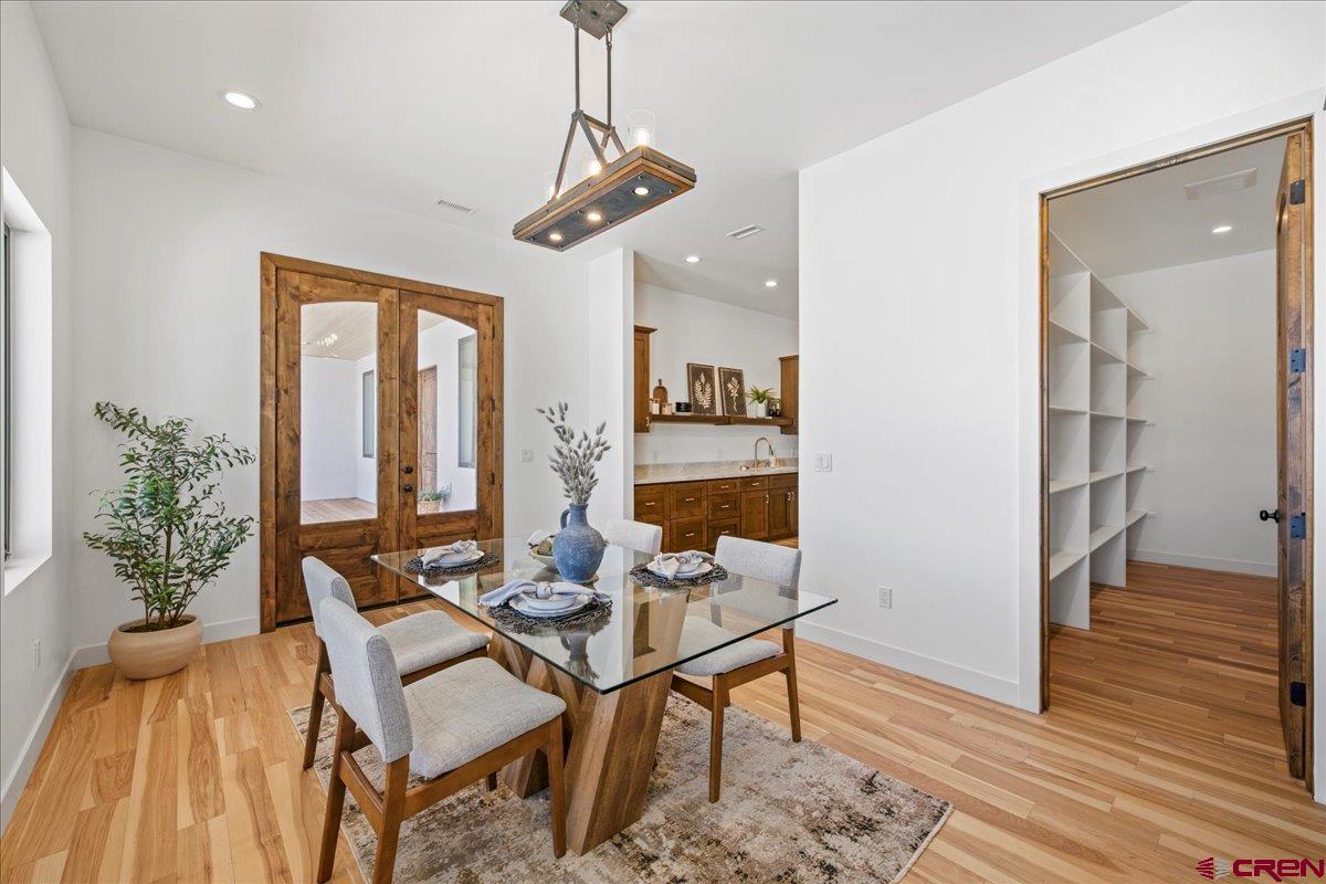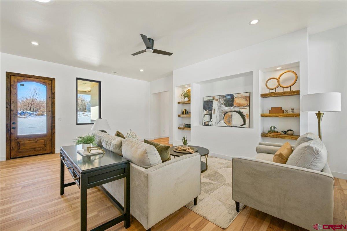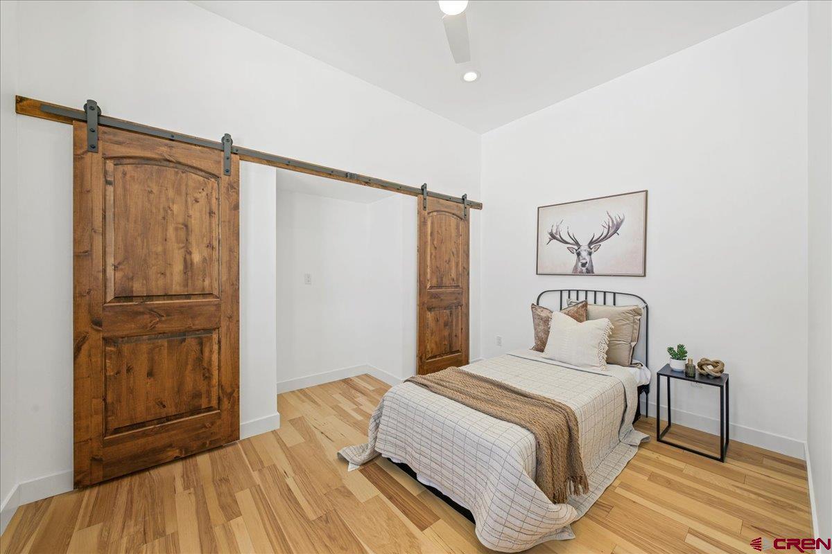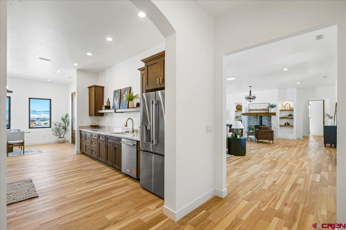 This 2800 sq ft newly built custom home sits on a stunning 3 irrigated acre lot overlooking beautiful Spring Creek Mesa. The residence features four bedrooms and three bathrooms, with an oversized 3 car-attached garage. Spacious kitchen with Quartzite countertops, ample counter space, and two ovens for convenient cooking. The large 7 x 15 walk-in pantry is spacious with plenty of room for storage of small appliances and extras. There is a separate dining area that has built in custom cabinets and Alder doors leading to the large deck for entertaining guests. The large & spacious living room include natural hickory flooring and 10 ft ceilings throughout the entire home. There is built in shelving and a beautiful stone surrounding wood burning stove. The large windows in the living room add natural light and highlight the views of beautiful Spring Creek Mesa. The primary bedroom is large and continues with the natural hickory flooring. The bathroom features a stand-alone tub, large walk-in tiled shower, and his & hers Quartzite counters with double sinks. There is also a large walk-in closet. The three additional bedrooms also have hickory flooring and Alder doors. There is a half bath with a sink conveniently located off the garage entrance and large mud room. Outside features include natural wood decking in front and the back of the home. There are large natural wood exposed beams on the front and back porches with tongue and grove soffits. The owner originally built this home for himself, so you know there was a little extra care put in the construction, this is not your typical spec home. This house is well-built from foundation to roof and includes a protective French drain for the foundation. The insulation is also the best you can get with closed cell spray foam in the walls and roof decks. The paint is eco-nontoxic. The base is secured atop a 16-inch thick sandstone layer, providing reliable support and stability.