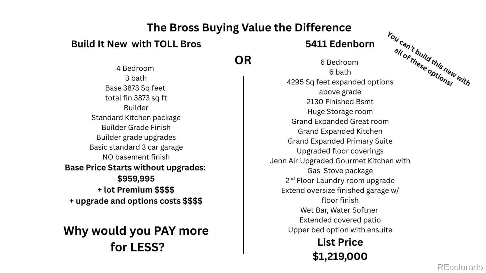 Why wait 8-10 months and spend 1.4M to build? Move-in ready luxury home with 350K in upgrades already included! You can own a fully upgraded, expanded Bross model luxury home in MontaineCastle Rocks premier community surrounded by trails, open space, and sweeping mountain views? This exceptional Toll Brothers semi-custom residence offers 6 bedrooms, 6 bathrooms, 4,295 finished square feet above grade plus a 2,130-square-foot finished basement, delivering the space, design, and completed upgrades most new builds simply dont include. A grand two-story foyer opens into an expanded great room centered on a dramatic floor-to-ceiling stone fireplace with wrought-iron accents, designer lighting, and upgraded flooring throughout. The grand expanded kitchen is designed for everyday living and entertaining, featuring JennAir gourmet appliances, a gas cooktop, honed quartz countertops, upgraded cabinetry, oversized island, walk-in pantry, and open dining areas flowing to an extended covered patioperfect for Colorado evenings and mountain sunsets. The expanded main-level primary suite offers a spa-like retreat with soaking tub, glass shower, and generous walk-in closet, while a flexible study or guest room adds versatility. Upstairs, spacious secondary bedroomsincluding an ensuite optionpair with the convenience of a second-floor laundry, rarely found in base new construction. The fully finished basement enhances entertaining with a wet bar, media and game areas, added living space, and a huge storage roomimprovements costly to complete after buying new. Additional highlights include an extended oversized finished garage with floor coating, EV outlet, water softener, whole-home humidifier, and upgraded HVAC. Enjoy Montaines resort-style amenitiesclubhouse, pool, fitness center, hot tub, and scenic trailsminutes from downtown Castle Rock and I-25, delivering more space, more upgrades, and immediate move-in luxury without the wait or added cost of building new.