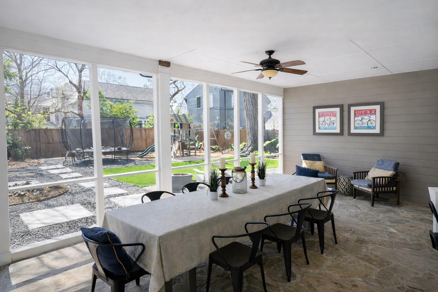 Garden Oaks GEM on an oversized lot, this rare single-story built in 2001 offers the exterior charm of a classic Garden Oaks home w/the strength & stability of newer construction. Thoughtful updates blend seamlessly w/everyday function. 2015 kitchen remodel anchors the home w/large quartzite island, thoughtful storage & open to living dining areas. Private primary suite feels like a retreat w/vaulted 10 ceilings, large closet with peninsula, sitting area & spa bath featuring travertine floors, jetted tub & large shower w/dual heads body sprayers. Outside, the oversized yard w/turf (2022) a putting green means less mud, maintenance & more year-round fun, while the screened porch w/flagstone tile expands your living space. Detached garage w/covered walk adds convenience. Updates-Roof 2021, 2 Trane HVAC units-2021, tankless H20 heater, generator transfer switch, 220V plug for EV charger, French drains, LED Lighting & chandeliers, Wallpaper, extensive built ins & wainscoting