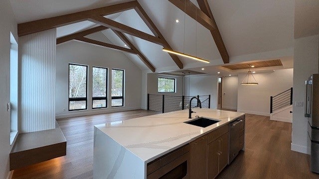 Youll love this brand-new upscale townhouse in downtown Whitefish with close proximity to the Whitefish River and The Wave. Excellent design concepts have been thoughtfully incorporated both inside and out giving it great curb appeal and an exquisite contemporary feel inside. The interior has a very spacious feel with an awesome kitchen and living area that offer high end finishes, vaulted ceilings, and lots of large windows. There are 4 bedrooms, 4 nicely appointed bathrooms, and the master suite has a very nice bathroom with walk-in closet and built ins. Other features include a shoe/coat area off of the garage, a laundry room, heated bathroom floor in master, and last but not least a third level office with a private spectacular deck that has views of Big Mountain. Be the first owner of this fantastic property.