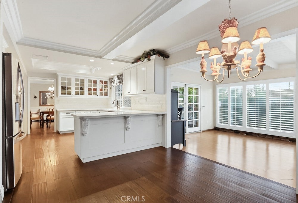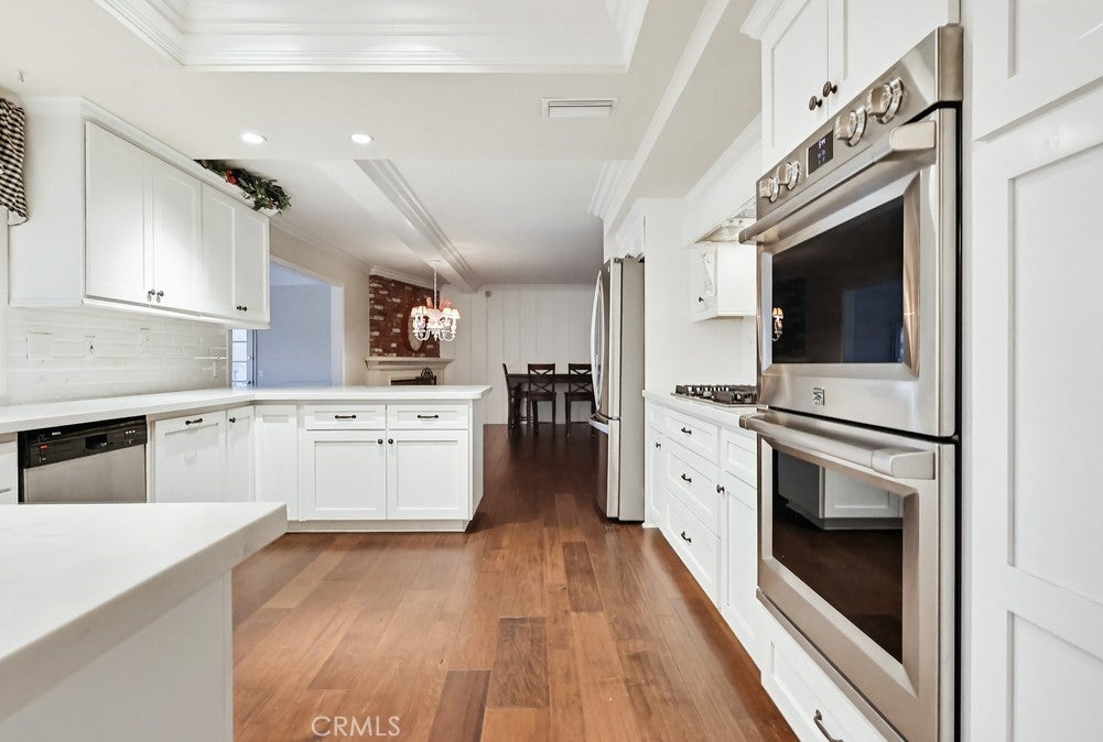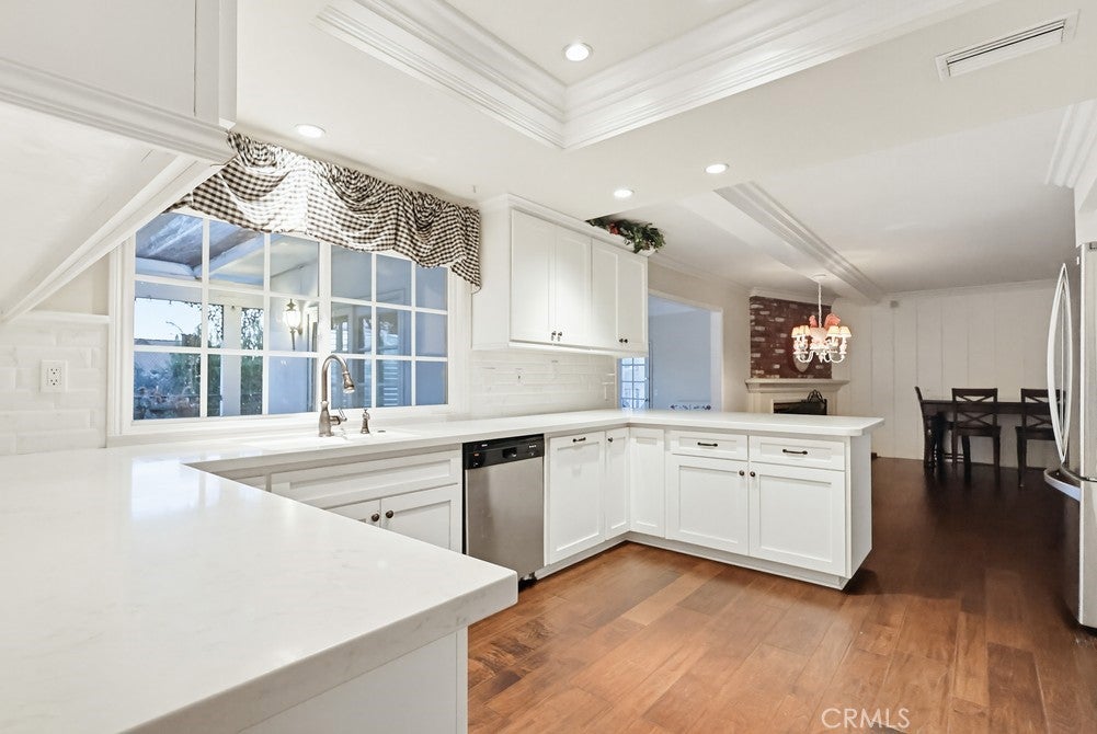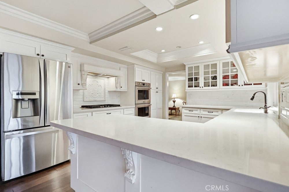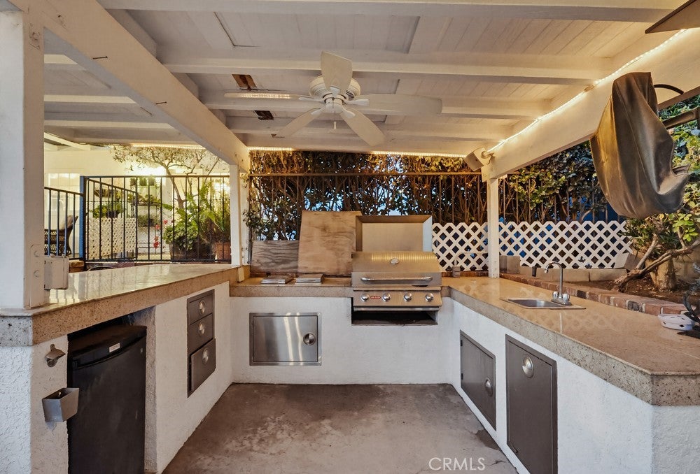 Welcome to 1962 Olivewood Street, a spacious two-story pool home ideally situated on a rare corner lot with beautiful views of the San Gabriel Mountainsthe only corner property along Emerald offering this unique vantage point. Excellent curb appeal welcomes you with a lush front lawn and inviting brick front porch and entry, creating a warm and timeless first impression.Inside, the home features a thoughtfully designed layout including a sunken family room, formal dining area, sunroom, and expansive living spaces ideal for both everyday living and entertaining. Plantation shutters throughout the home, including the sunroom, provide style and privacy, while crown molding throughout the downstairs living areas and in the primary bedroom adds architectural character.The living room and kitchen showcase coffered ceilings with recessed lighting along with a cozy gas fireplace featuring a brick hearth and wood mantle, creating an inviting central gathering space. Beautiful wood flooring flows throughout the kitchen, dining, and family room areas, enhancing warmth and continuity throughout the main level.The updated kitchen is designed with both functionality and style in mind, featuring shaker-style cabinetry, quartz countertops, subway tile backsplash, and a custom mosaic accent backsplash behind the cooktop. Additional upgrades include rollout cabinet drawers and dual Lazy Susan storage, maximizing organization and usability.Upstairs, all bedrooms are generously sized and include ceiling fans, while the primary suite offers dual closets and crown molding, creating a comfortable retreat. The upstairs hallway bathroom has been updated with a shaker-style vanity, granite countertops, and tile flooring. Bathrooms and select living areas also feature tasteful wainscoting accents that enhance the homes overall charm.The bright sunroom adds flexible living space and opens through double doors from the dining area to an outdoor patio, creating seamless indoor-outdoor flow.The backyard is ideal for entertaining with a private sunken pool area, fire pit, and a fully equipped outdoor kitchen featuring a barbecue, sink, refrigerator, ceiling fan, TV, and ambient string lighting, perfect for enjoying Southern California living year-round.A rare opportunity combining mountain views, a premier corner location, spacious living areas, and exceptional indoor-outdoor amenities in one of La Vernes most desirable neighborhoods. Dont miss out on this opportunity!