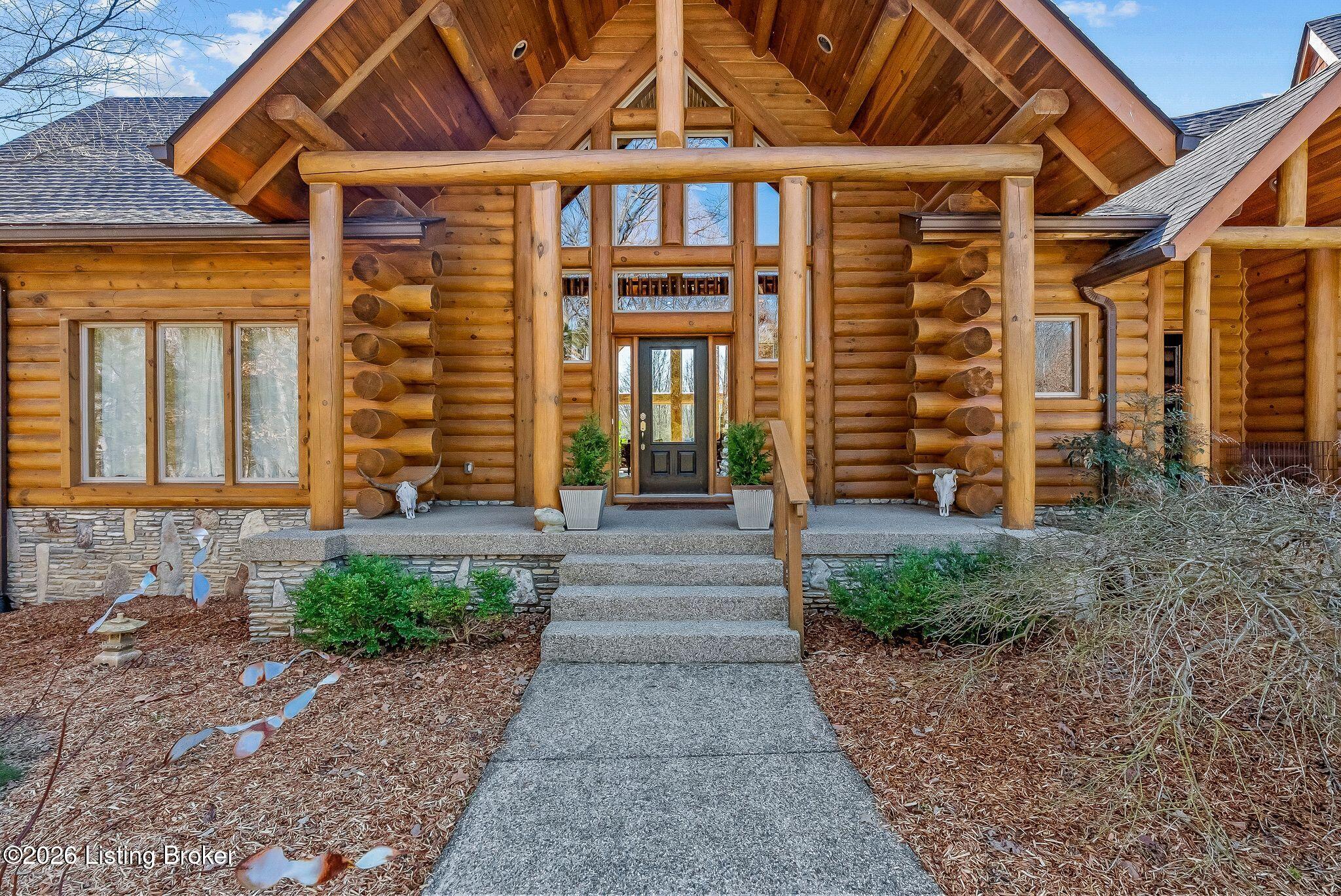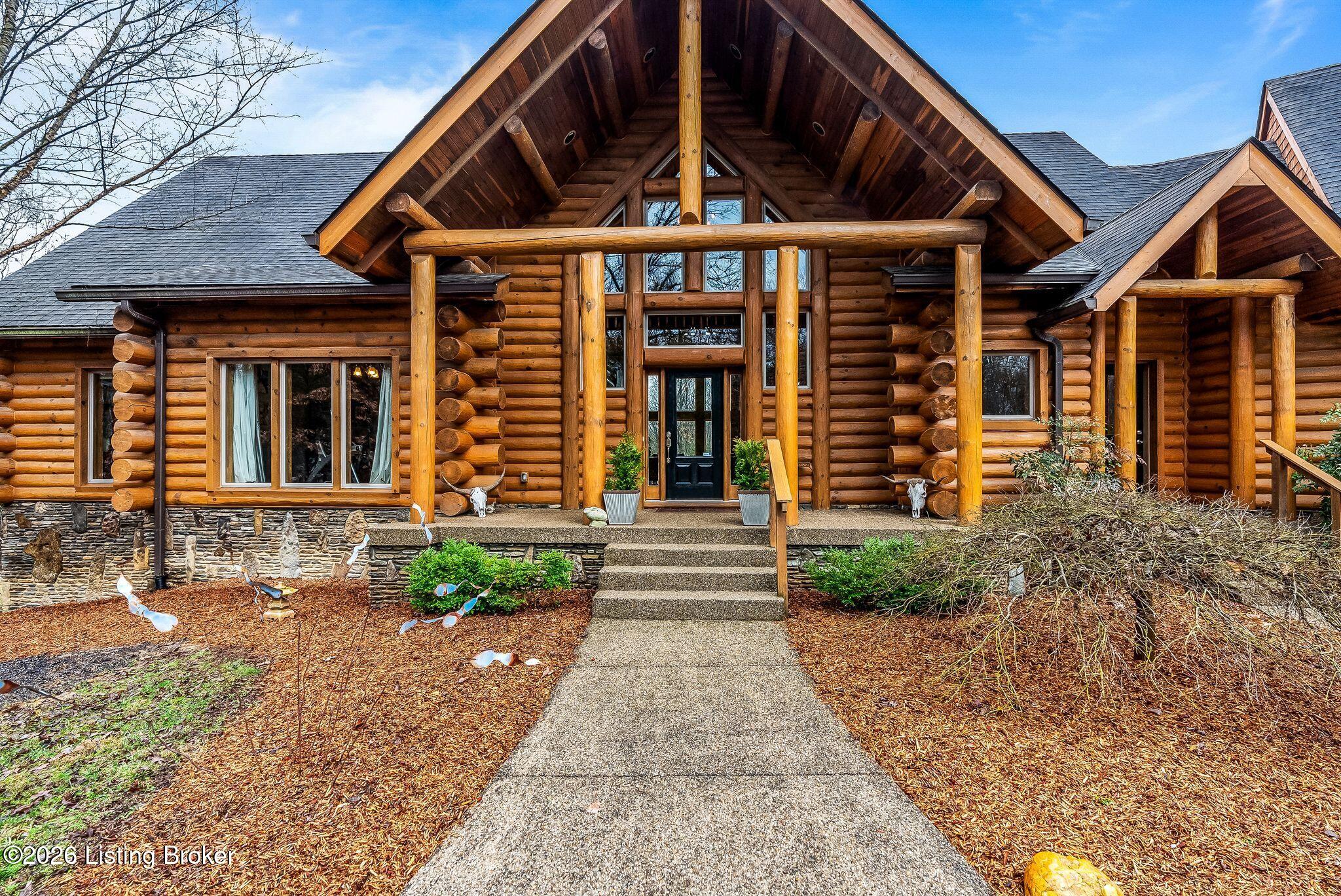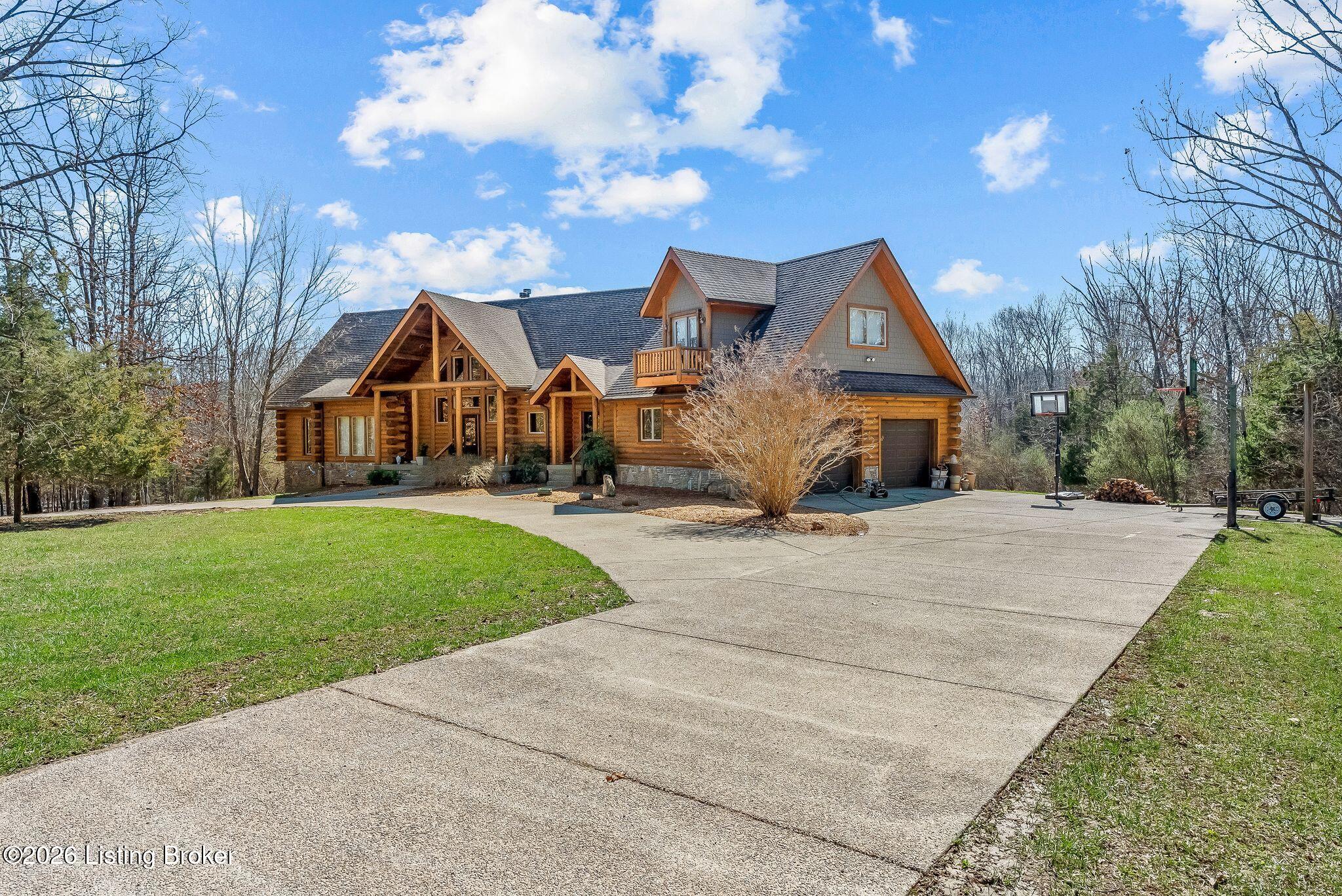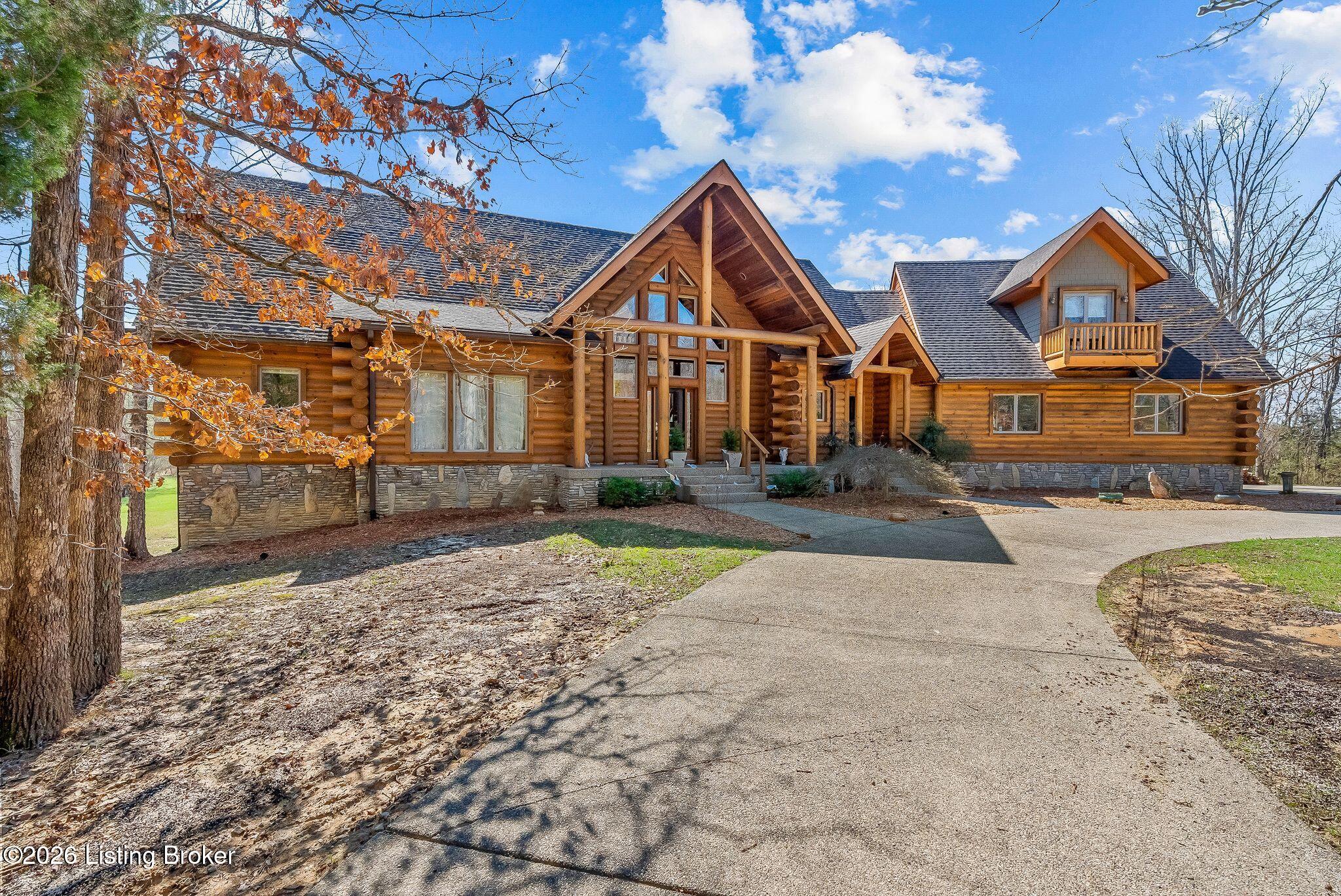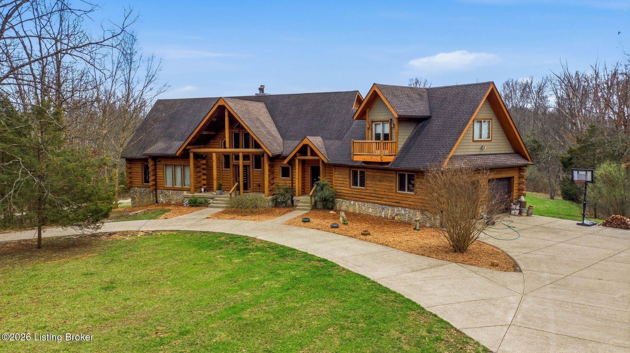 Welcome to 2212 Ballard School Rd in LaGrange, a spectacular custom-built log estate set on 16 private acres with breathtaking views of woods and pasture in every direction. Tucked mile off the main road, this property offers exceptional privacy while still being just minutes from LaGrange shopping, dining, and I-71. Step inside to a breathtaking great room defined by a dramatic 2.5-story vaulted ceiling and an expansive A-frame wall of windows that fills the space with sunlight and captures sweeping views of the peaceful surroundings. Extraordinary, handcrafted stone masonry anchors the room with a beautiful fireplace and continues throughout both the interior and exterior of the home, highlighting the craftsmanship of this one-of-a-kind property. Acacia wood floors run through the entry, great room, kitchen, and primary suite, adding warmth and character. The first-floor primary suite offers a relaxing retreat with a trey ceiling, sitting area, dual walk-in closets, and private deck overlooking the rear property. The spacious bath includes dual vanity, large tub and walk in shower creating a comfortable and functional layout. Designed for everyday living and entertaining, the kitchen opens to the dining and living areas and includes an oversized pantry, mudroom, and convenient laundry access with direct entry to the oversized two-car garage. Built-in speakers enhance both the kitchen and outdoor deck spaces. Off the dining area, a large deck provides the perfect setting for enjoying the surrounding countryside. Upstairs, youll find four generously sized bedrooms, including one with a private balcony overlooking the front of the property and another with an en-suite bath. The upper level also features a loft and an additional full bathroom. The finished walkout lower level offers additional living and entertaining space, featuring a bar area and a beautifully crafted hearth with a wood stove, along with doors that open to the rear patio and outdoor gathering area. An additional 1,600 square feet of unfinished basement provide excellent expansion potential, including two framed and electrically wired rooms ready to be finished and plumbing already installed for a future basement bathroom. Outdoor living is equally impressive with five patios and decks, including the private primary suite balcony. The property also features an outdoor firepit, stone pizza oven, outdoor grilling area, deer stands, dog kennels, and even an ATV included with the property, making the acreage a true outdoor playground. Recent improvements include newly stripped and resealed logs along the rear of the home and rebuilt balcony railings. The home is also equipped with dual geothermal heat pump systems and a whole-house Culligan water filtration system with separate drinking water filtration including a new water heater (2025). With 16 acres of rolling land, partial woods, expansive views, and unmatched privacy, this extraordinary property offers the perfect blend of rustic elegance, modern efficiency, and convenient location. A rare opportunity to own this one-of-a-kind property that offers privacy, character, and incredible craftsmanship while still being conveniently located near LaGrange amenities.