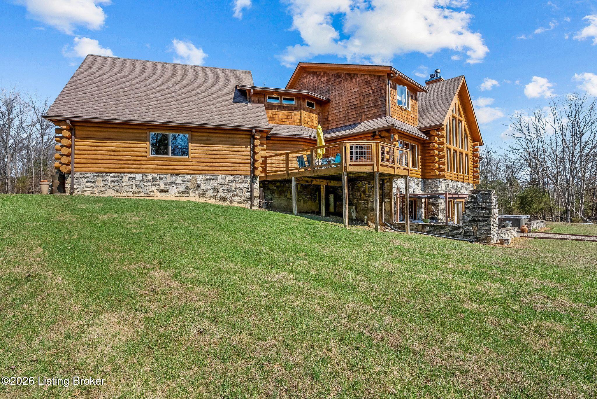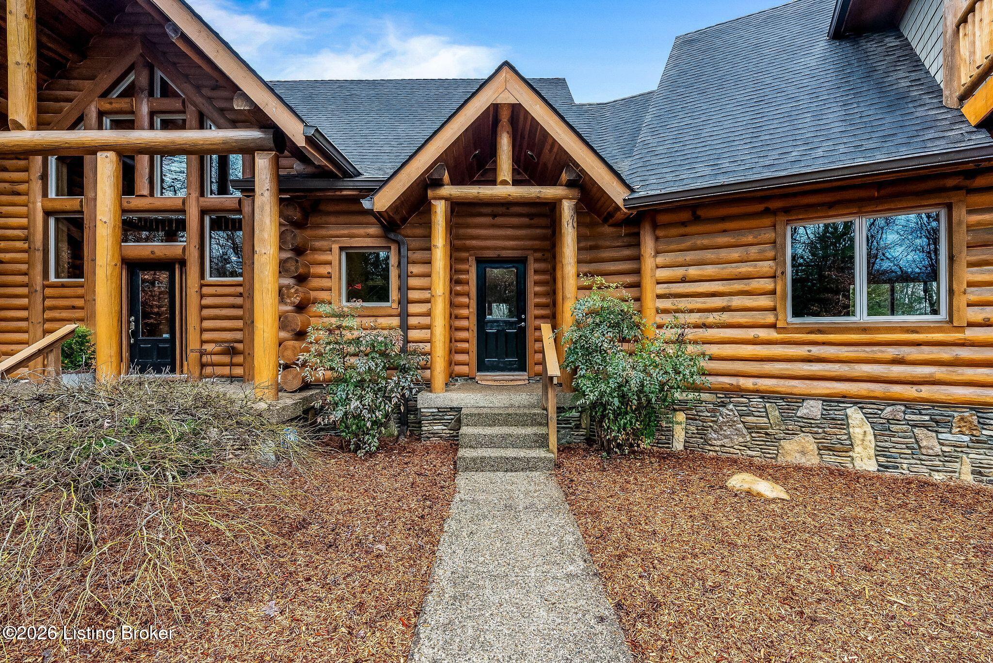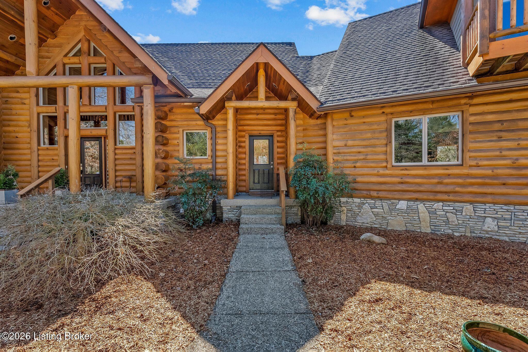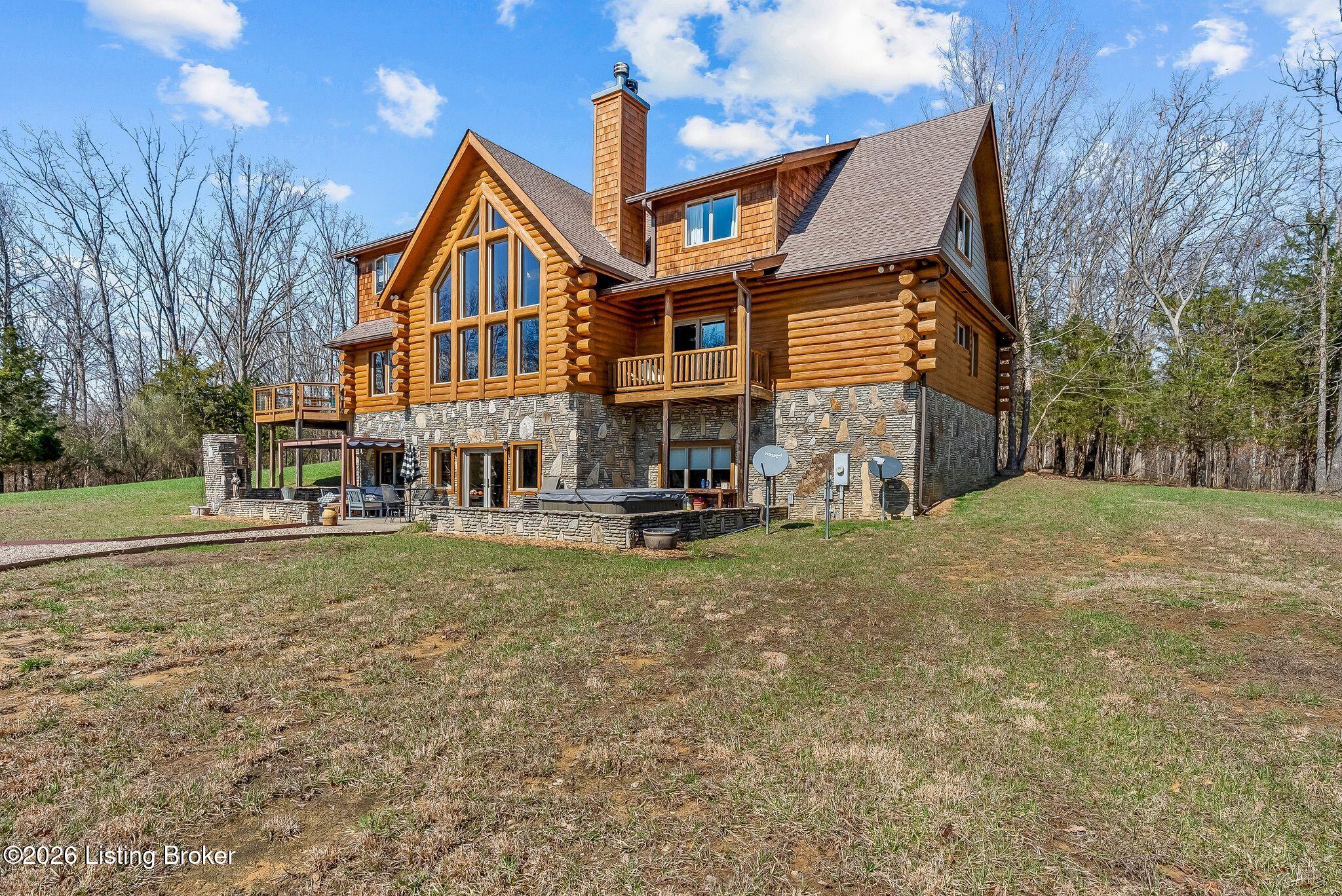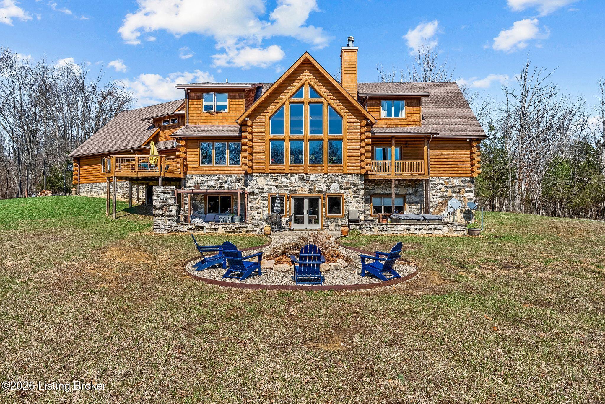 Welcome to 2212 Ballard School Rd in LaGrange, a spectacular custom-built log estate set on 16 private acres with breathtaking views of woods and pasture in every direction. Tucked mile off the main road, this property offers exceptional privacy while still being just minutes from LaGrange shopping, dining, and I-71. Step inside to a breathtaking great room defined by a dramatic 2.5-story vaulted ceiling and an expansive A-frame wall of windows that fills the space with sunlight and captures sweeping views of the peaceful surroundings. Extraordinary, handcrafted stone masonry anchors the room with a beautiful fireplace and continues throughout both the interior and exterior of the home, highlighting the craftsmanship of this one-of-a-kind property. Acacia wood floors run through the entry, great room, kitchen, and primary suite, adding warmth and character. The first-floor primary suite offers a relaxing retreat with a trey ceiling, sitting area, dual walk-in closets, and private deck overlooking the rear property. The spacious bath includes dual vanity, large tub and walk in shower creating a comfortable and functional layout. Designed for everyday living and entertaining, the kitchen opens to the dining and living areas and includes an oversized pantry, mudroom, and convenient laundry access with direct entry to the oversized two-car garage. Built-in speakers enhance both the kitchen and outdoor deck spaces. Off the dining area, a large deck provides the perfect setting for enjoying the surrounding countryside. Upstairs, youll find four generously sized bedrooms, including one with a private balcony overlooking the front of the property and another with an en-suite bath. The upper level also features a loft and an additional full bathroom. The finished walkout lower level offers additional living and entertaining space, featuring a bar area and a beautifully crafted hearth with a wood stove, along with doors that open to the rear patio and outdoor gathering area. An additional 1,600 square feet of unfinished basement provide excellent expansion potential, including two framed and electrically wired rooms ready to be finished and plumbing already installed for a future basement bathroom. Outdoor living is equally impressive with five patios and decks, including the private primary suite balcony. The property also features an outdoor firepit, stone pizza oven, outdoor grilling area, deer stands, dog kennels, and even an ATV included with the property, making the acreage a true outdoor playground. Recent improvements include newly stripped and resealed logs along the rear of the home and rebuilt balcony railings. The home is also equipped with dual geothermal heat pump systems and a whole-house Culligan water filtration system with separate drinking water filtration including a new water heater (2025). With 16 acres of rolling land, partial woods, expansive views, and unmatched privacy, this extraordinary property offers the perfect blend of rustic elegance, modern efficiency, and convenient location. A rare opportunity to own this one-of-a-kind property that offers privacy, character, and incredible craftsmanship while still being conveniently located near LaGrange amenities.