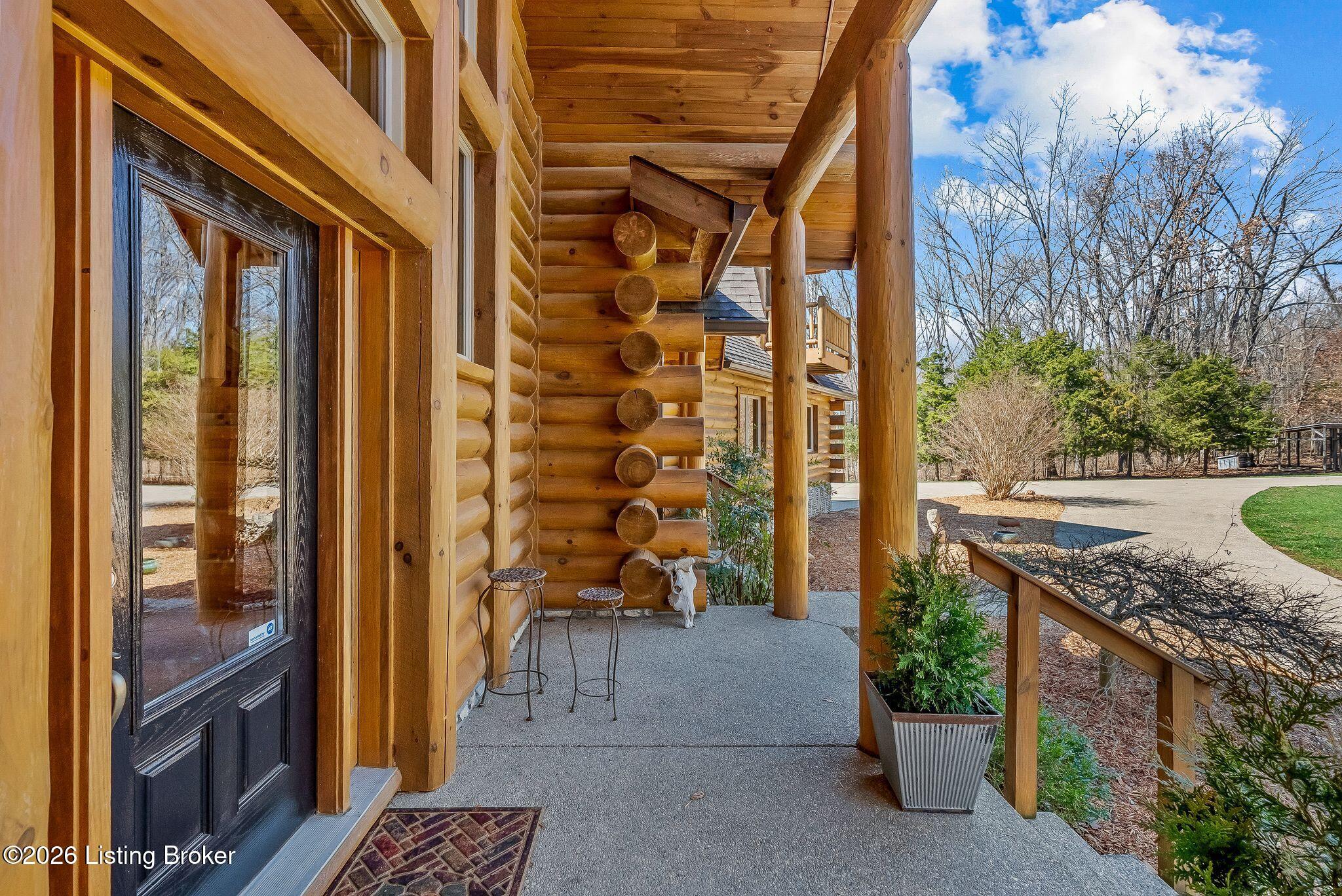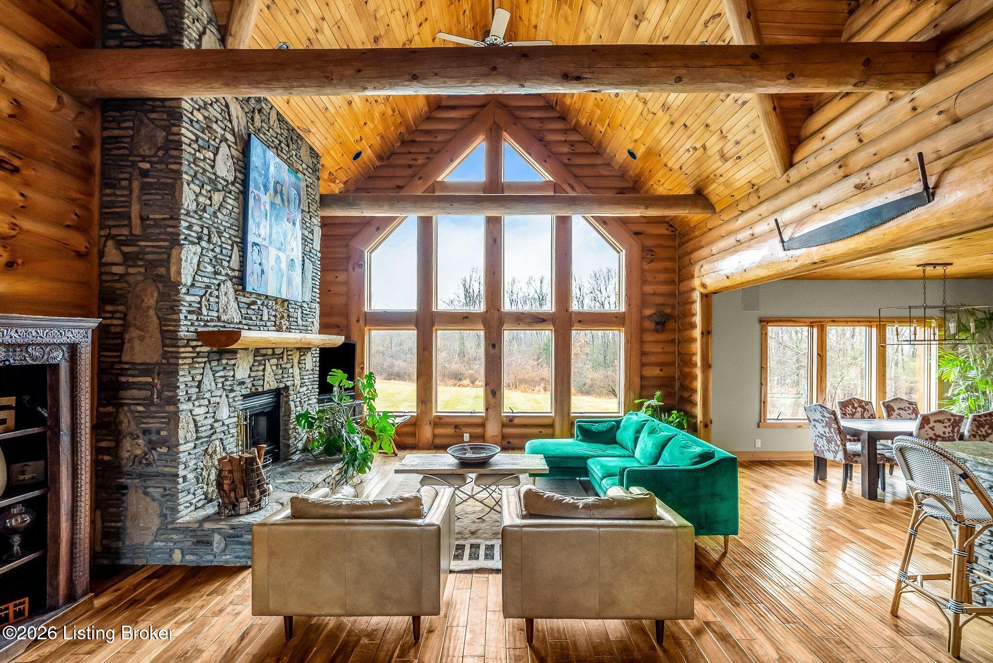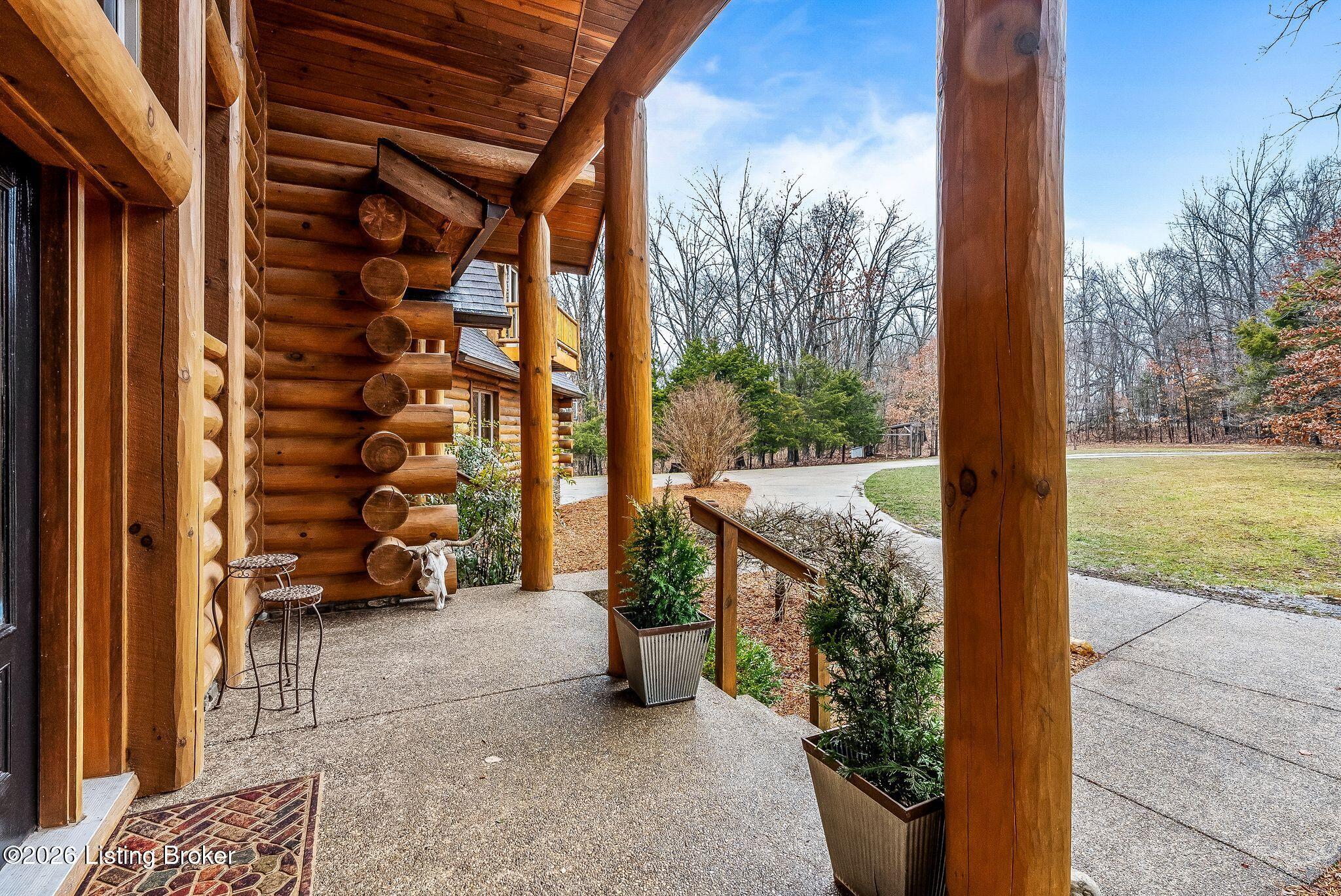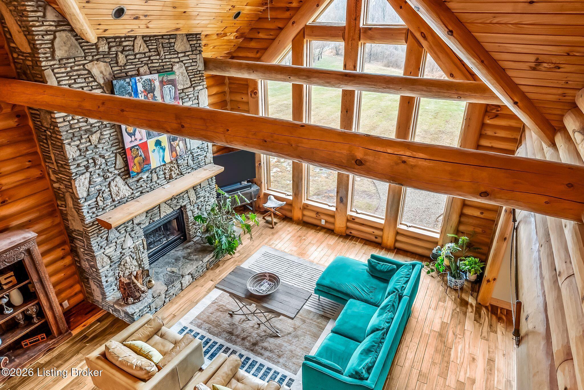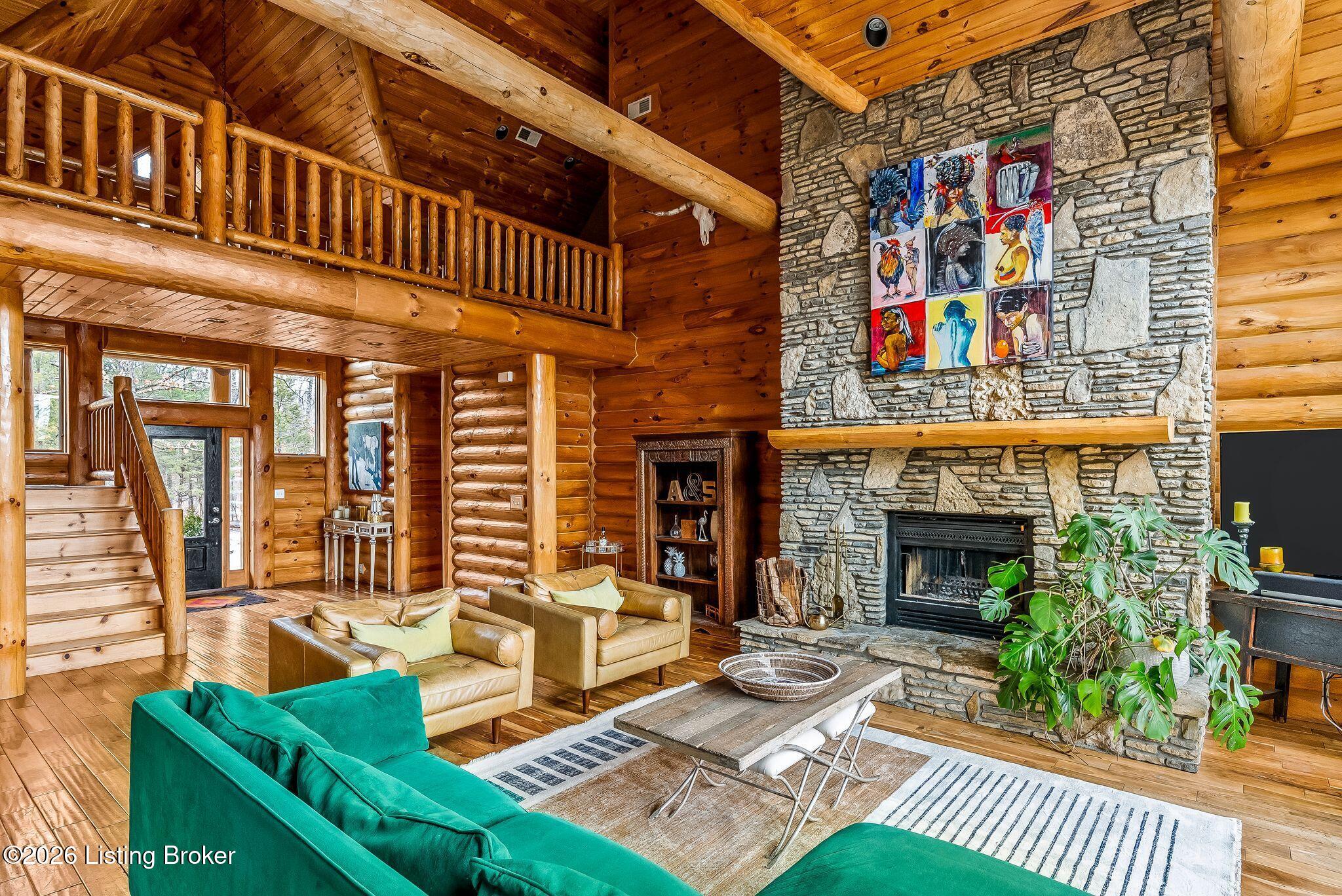 Welcome to 2212 Ballard School Rd in LaGrange, a spectacular custom-built log estate set on 16 private acres with breathtaking views of woods and pasture in every direction. Tucked mile off the main road, this property offers exceptional privacy while still being just minutes from LaGrange shopping, dining, and I-71. Step inside to a breathtaking great room defined by a dramatic 2.5-story vaulted ceiling and an expansive A-frame wall of windows that fills the space with sunlight and captures sweeping views of the peaceful surroundings. Extraordinary, handcrafted stone masonry anchors the room with a beautiful fireplace and continues throughout both the interior and exterior of the home, highlighting the craftsmanship of this one-of-a-kind property. Acacia wood floors run through the entry, great room, kitchen, and primary suite, adding warmth and character. The first-floor primary suite offers a relaxing retreat with a trey ceiling, sitting area, dual walk-in closets, and private deck overlooking the rear property. The spacious bath includes dual vanity, large tub and walk in shower creating a comfortable and functional layout. Designed for everyday living and entertaining, the kitchen opens to the dining and living areas and includes an oversized pantry, mudroom, and convenient laundry access with direct entry to the oversized two-car garage. Built-in speakers enhance both the kitchen and outdoor deck spaces. Off the dining area, a large deck provides the perfect setting for enjoying the surrounding countryside. Upstairs, youll find four generously sized bedrooms, including one with a private balcony overlooking the front of the property and another with an en-suite bath. The upper level also features a loft and an additional full bathroom. The finished walkout lower level offers additional living and entertaining space, featuring a bar area and a beautifully crafted hearth with a wood stove, along with doors that open to the rear patio and outdoor gathering area. An additional 1,600 square feet of unfinished basement provide excellent expansion potential, including two framed and electrically wired rooms ready to be finished and plumbing already installed for a future basement bathroom. Outdoor living is equally impressive with five patios and decks, including the private primary suite balcony. The property also features an outdoor firepit, stone pizza oven, outdoor grilling area, deer stands, dog kennels, and even an ATV included with the property, making the acreage a true outdoor playground. Recent improvements include newly stripped and resealed logs along the rear of the home and rebuilt balcony railings. The home is also equipped with dual geothermal heat pump systems and a whole-house Culligan water filtration system with separate drinking water filtration including a new water heater (2025). With 16 acres of rolling land, partial woods, expansive views, and unmatched privacy, this extraordinary property offers the perfect blend of rustic elegance, modern efficiency, and convenient location. A rare opportunity to own this one-of-a-kind property that offers privacy, character, and incredible craftsmanship while still being conveniently located near LaGrange amenities.
