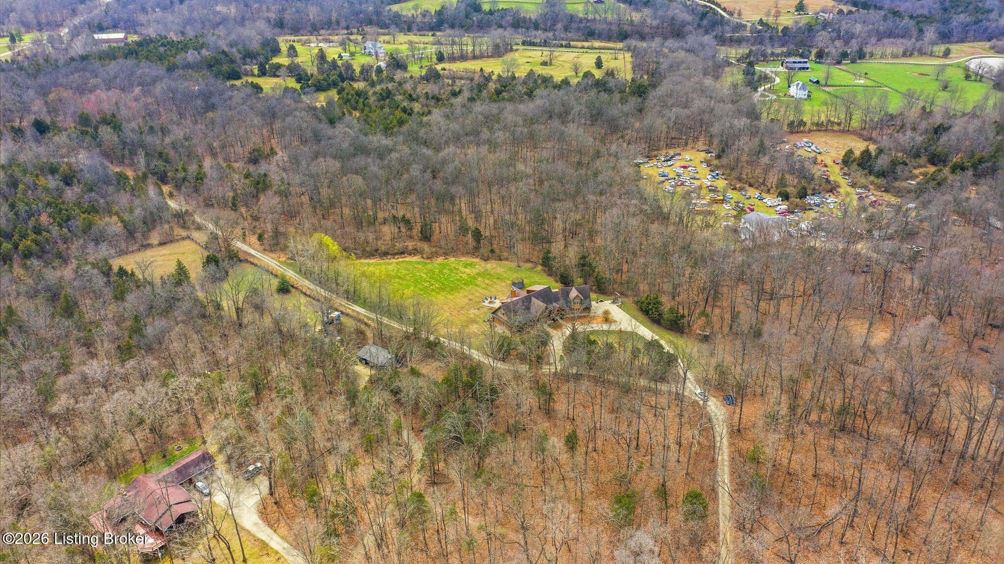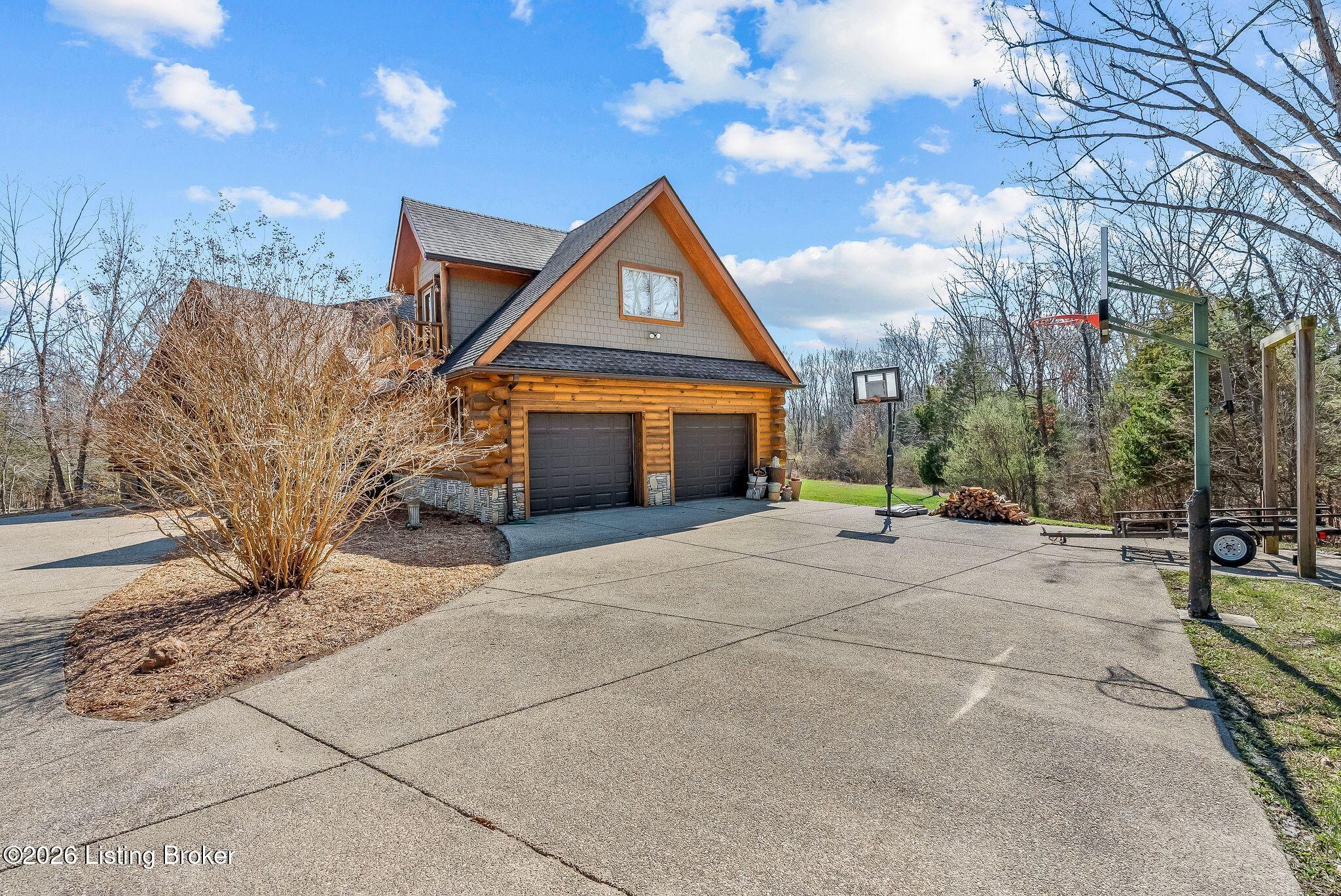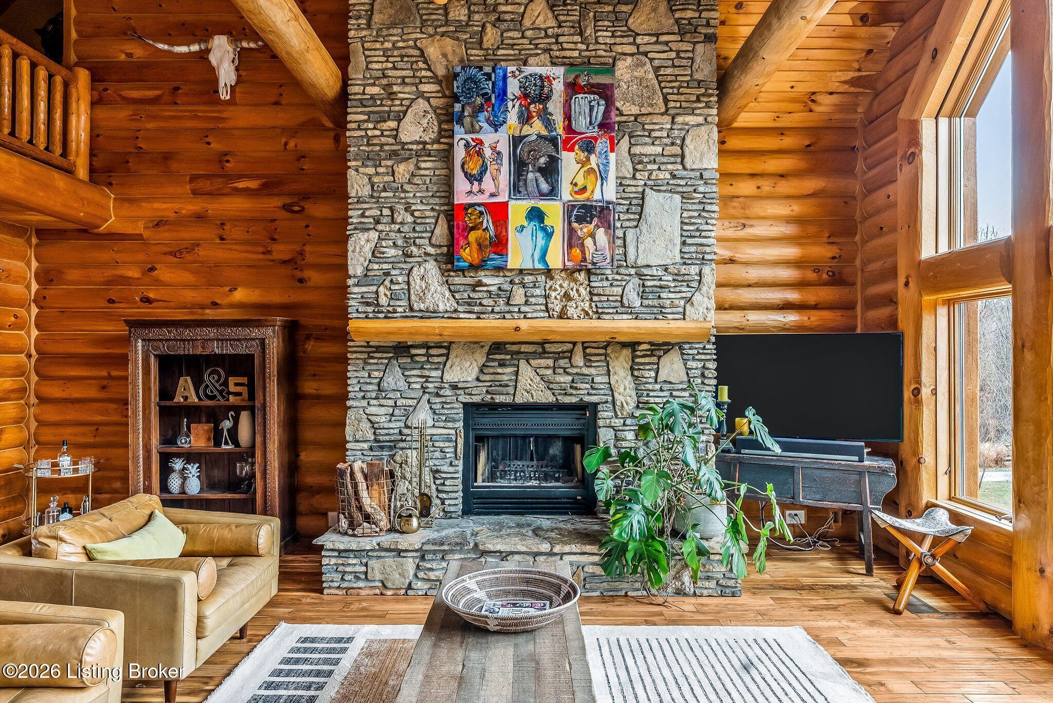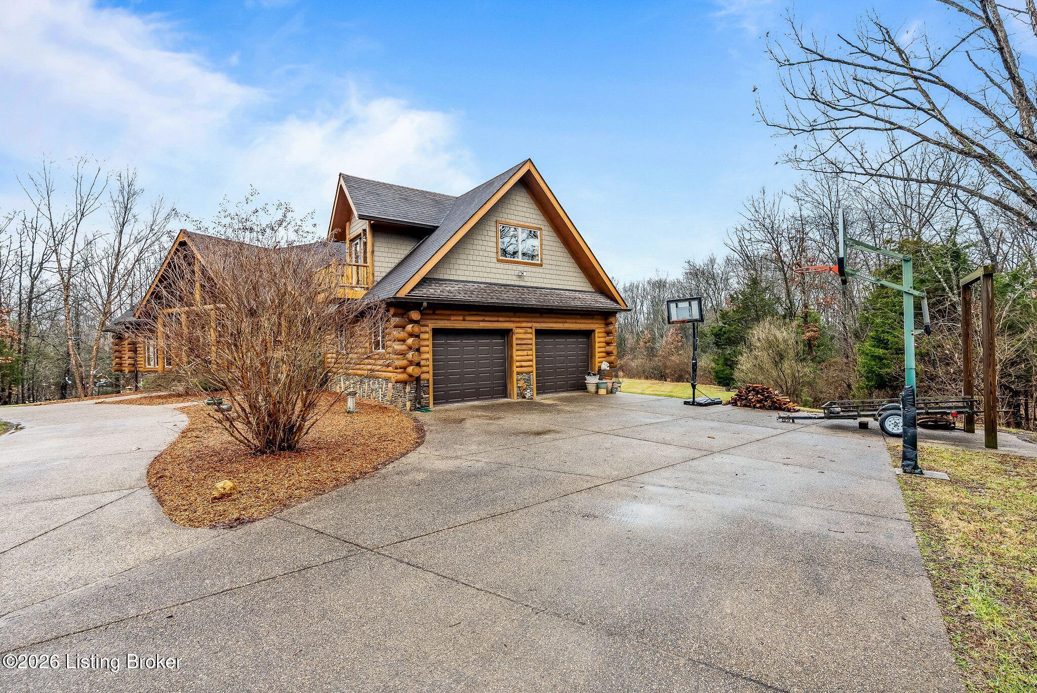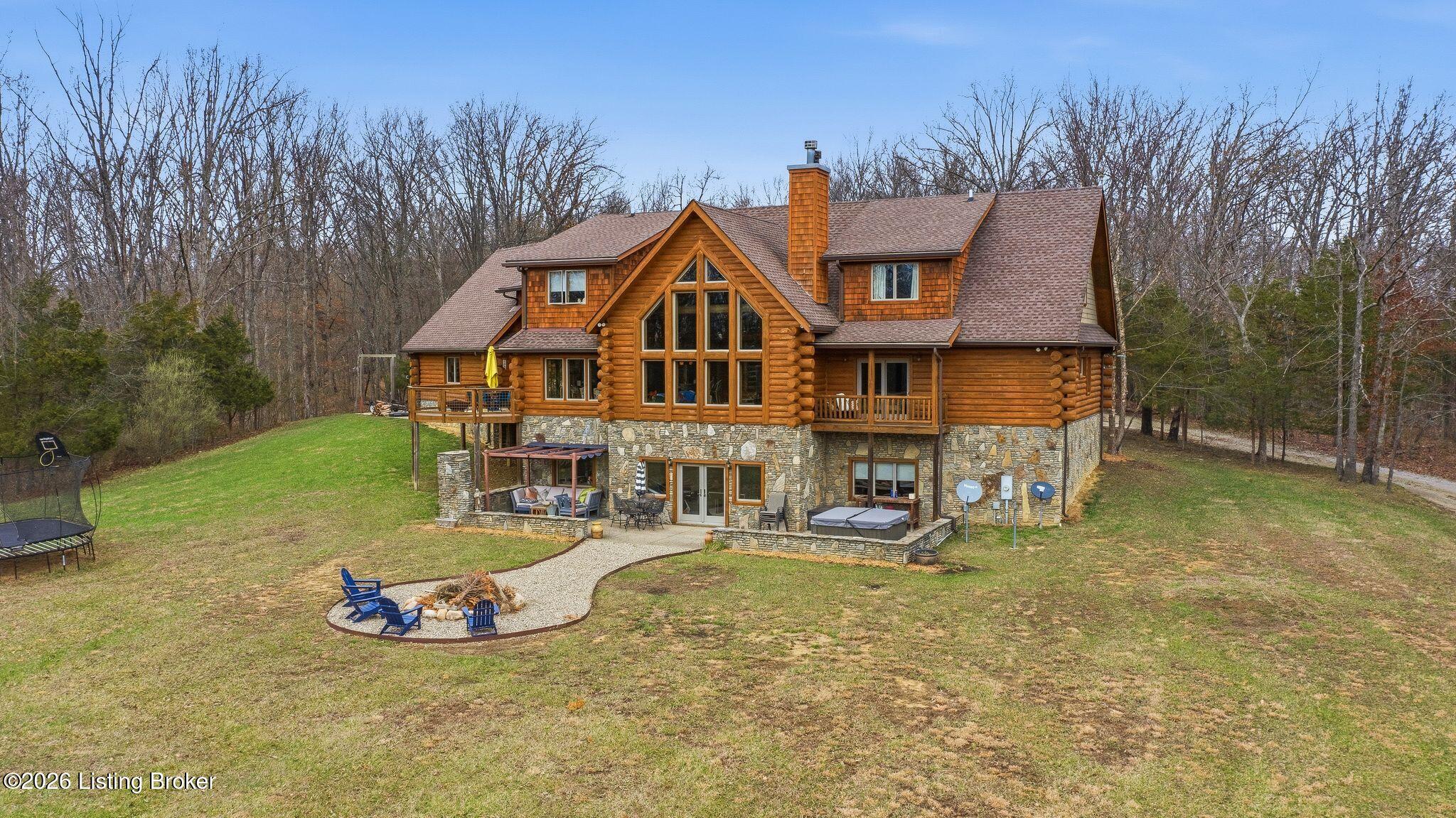 Welcome to 2212 Ballard School Rd in LaGrange, a spectacular custom-built log estate set on 16 private acres with breathtaking views of woods and pasture in every direction. Tucked mile off the main road, this property offers exceptional privacy while still being just minutes from LaGrange shopping, dining, and I-71. Step inside to a breathtaking great room defined by a dramatic 2.5-story vaulted ceiling and an expansive A-frame wall of windows that fills the space with sunlight and captures sweeping views of the peaceful surroundings. Extraordinary, handcrafted stone masonry anchors the room with a beautiful fireplace and continues throughout both the interior and exterior of the home, highlighting the craftsmanship of this one-of-a-kind property. Acacia wood floors run through the entry, great room, kitchen, and primary suite, adding warmth and character. The first-floor primary suite offers a relaxing retreat with a trey ceiling, sitting area, dual walk-in closets, and private deck overlooking the rear property. The spacious bath includes dual vanity, large tub and walk in shower creating a comfortable and functional layout. Designed for everyday living and entertaining, the kitchen opens to the dining and living areas and includes an oversized pantry, mudroom, and convenient laundry access with direct entry to the oversized two-car garage. Built-in speakers enhance both the kitchen and outdoor deck spaces. Off the dining area, a large deck provides the perfect setting for enjoying the surrounding countryside. Upstairs, youll find four generously sized bedrooms, including one with a private balcony overlooking the front of the property and another with an en-suite bath. The upper level also features a loft and an additional full bathroom. The finished walkout lower level offers additional living and entertaining space, featuring a bar area and a beautifully crafted hearth with a wood stove, along with doors that open to the rear patio and outdoor gathering area. An additional 1,600 square feet of unfinished basement provide excellent expansion potential, including two framed and electrically wired rooms ready to be finished and plumbing already installed for a future basement bathroom. Outdoor living is equally impressive with five patios and decks, including the private primary suite balcony. The property also features an outdoor firepit, stone pizza oven, outdoor grilling area, deer stands, dog kennels, and even an ATV included with the property, making the acreage a true outdoor playground. Recent improvements include newly stripped and resealed logs along the rear of the home and rebuilt balcony railings. The home is also equipped with dual geothermal heat pump systems and a whole-house Culligan water filtration system with separate drinking water filtration including a new water heater (2025). With 16 acres of rolling land, partial woods, expansive views, and unmatched privacy, this extraordinary property offers the perfect blend of rustic elegance, modern efficiency, and convenient location. A rare opportunity to own this one-of-a-kind property that offers privacy, character, and incredible craftsmanship while still being conveniently located near LaGrange amenities.