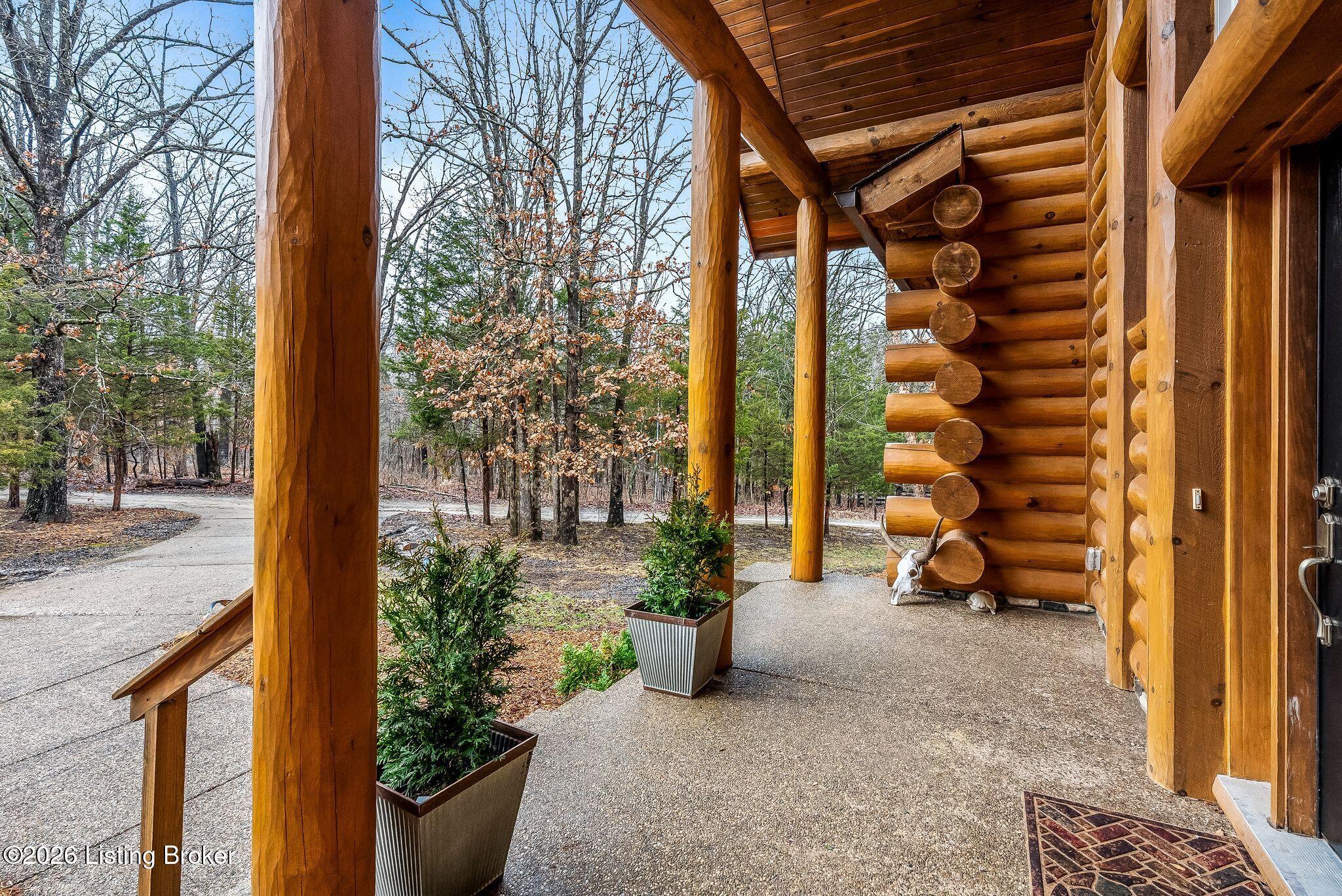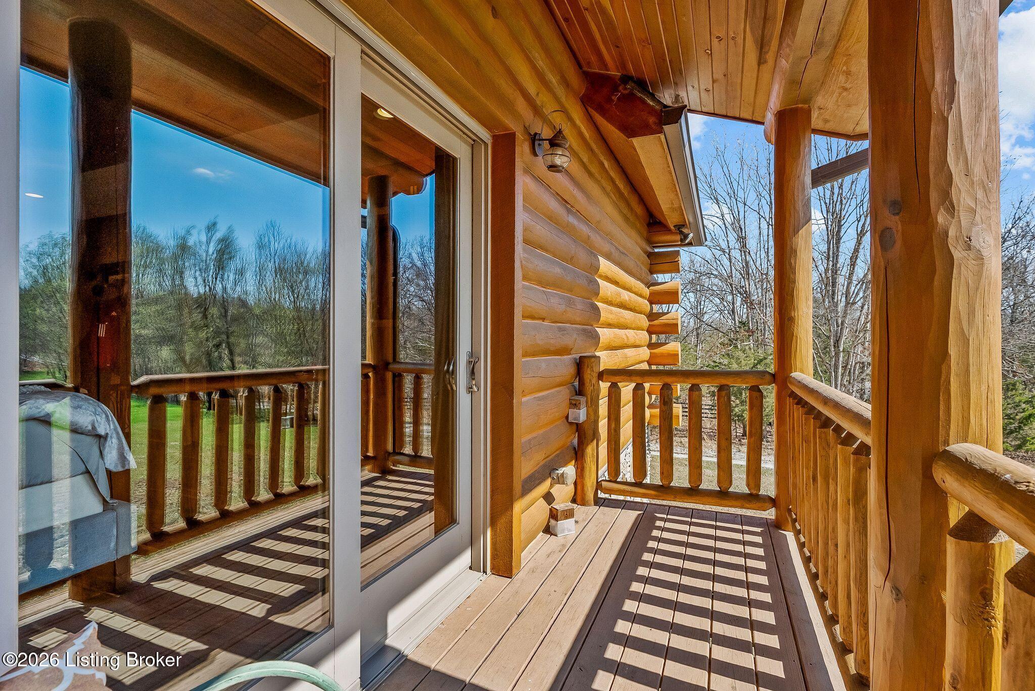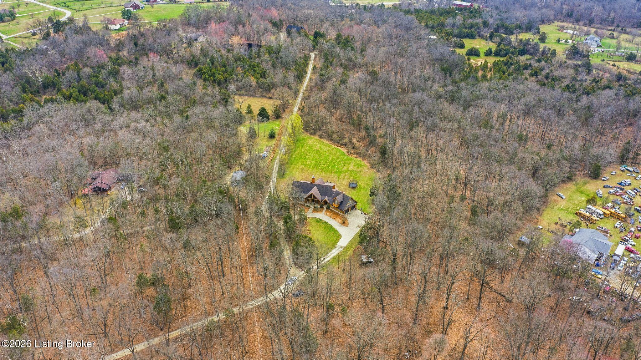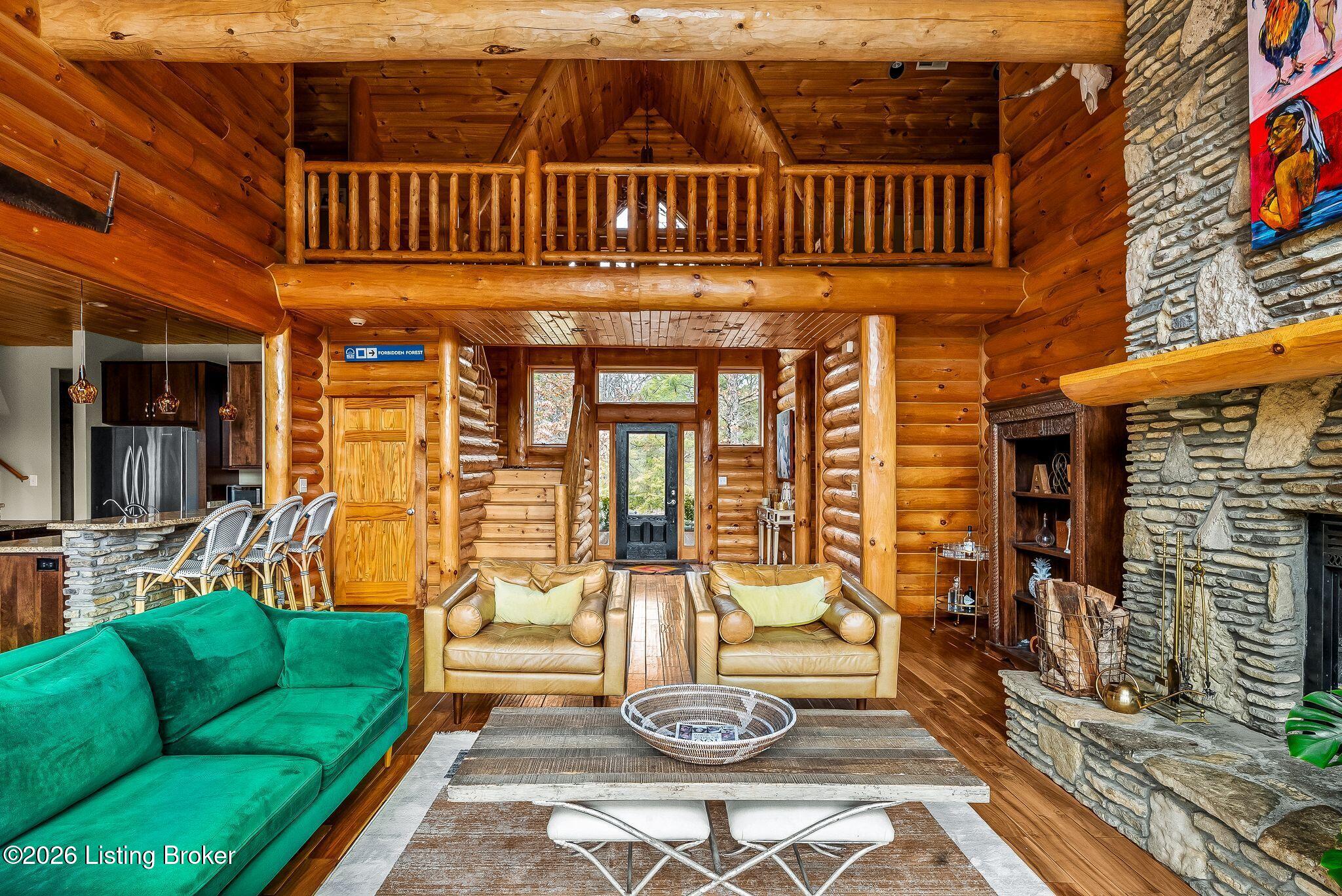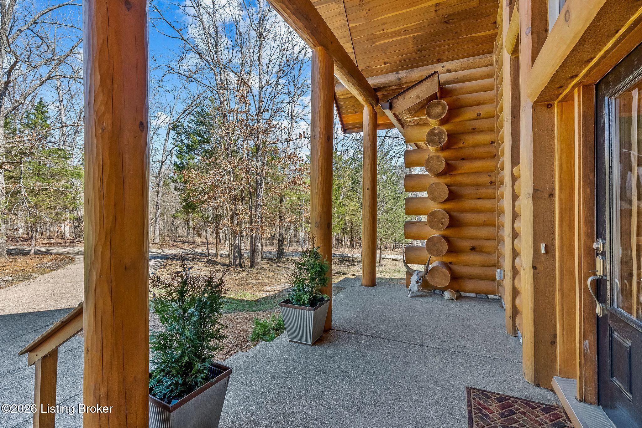 Welcome to 2212 Ballard School Rd in LaGrange, a spectacular custom-built log estate set on 16 private acres with breathtaking views of woods and pasture in every direction. Tucked mile off the main road, this property offers exceptional privacy while still being just minutes from LaGrange shopping, dining, and I-71. Step inside to a breathtaking great room defined by a dramatic 2.5-story vaulted ceiling and an expansive A-frame wall of windows that fills the space with sunlight and captures sweeping views of the peaceful surroundings. Extraordinary, handcrafted stone masonry anchors the room with a beautiful fireplace and continues throughout both the interior and exterior of the home, highlighting the craftsmanship of this one-of-a-kind property. Acacia wood floors run through the entry, great room, kitchen, and primary suite, adding warmth and character. The first-floor primary suite offers a relaxing retreat with a trey ceiling, sitting area, dual walk-in closets, and private deck overlooking the rear property. The spacious bath includes dual vanity, large tub and walk in shower creating a comfortable and functional layout. Designed for everyday living and entertaining, the kitchen opens to the dining and living areas and includes an oversized pantry, mudroom, and convenient laundry access with direct entry to the oversized two-car garage. Built-in speakers enhance both the kitchen and outdoor deck spaces. Off the dining area, a large deck provides the perfect setting for enjoying the surrounding countryside. Upstairs, youll find four generously sized bedrooms, including one with a private balcony overlooking the front of the property and another with an en-suite bath. The upper level also features a loft and an additional full bathroom. The finished walkout lower level offers additional living and entertaining space, featuring a bar area and a beautifully crafted hearth with a wood stove, along with doors that open to the rear patio and outdoor gathering area. An additional 1,600 square feet of unfinished basement provide excellent expansion potential, including two framed and electrically wired rooms ready to be finished and plumbing already installed for a future basement bathroom. Outdoor living is equally impressive with five patios and decks, including the private primary suite balcony. The property also features an outdoor firepit, stone pizza oven, outdoor grilling area, deer stands, dog kennels, and even an ATV included with the property, making the acreage a true outdoor playground. Recent improvements include newly stripped and resealed logs along the rear of the home and rebuilt balcony railings. The home is also equipped with dual geothermal heat pump systems and a whole-house Culligan water filtration system with separate drinking water filtration including a new water heater (2025). With 16 acres of rolling land, partial woods, expansive views, and unmatched privacy, this extraordinary property offers the perfect blend of rustic elegance, modern efficiency, and convenient location. A rare opportunity to own this one-of-a-kind property that offers privacy, character, and incredible craftsmanship while still being conveniently located near LaGrange amenities.