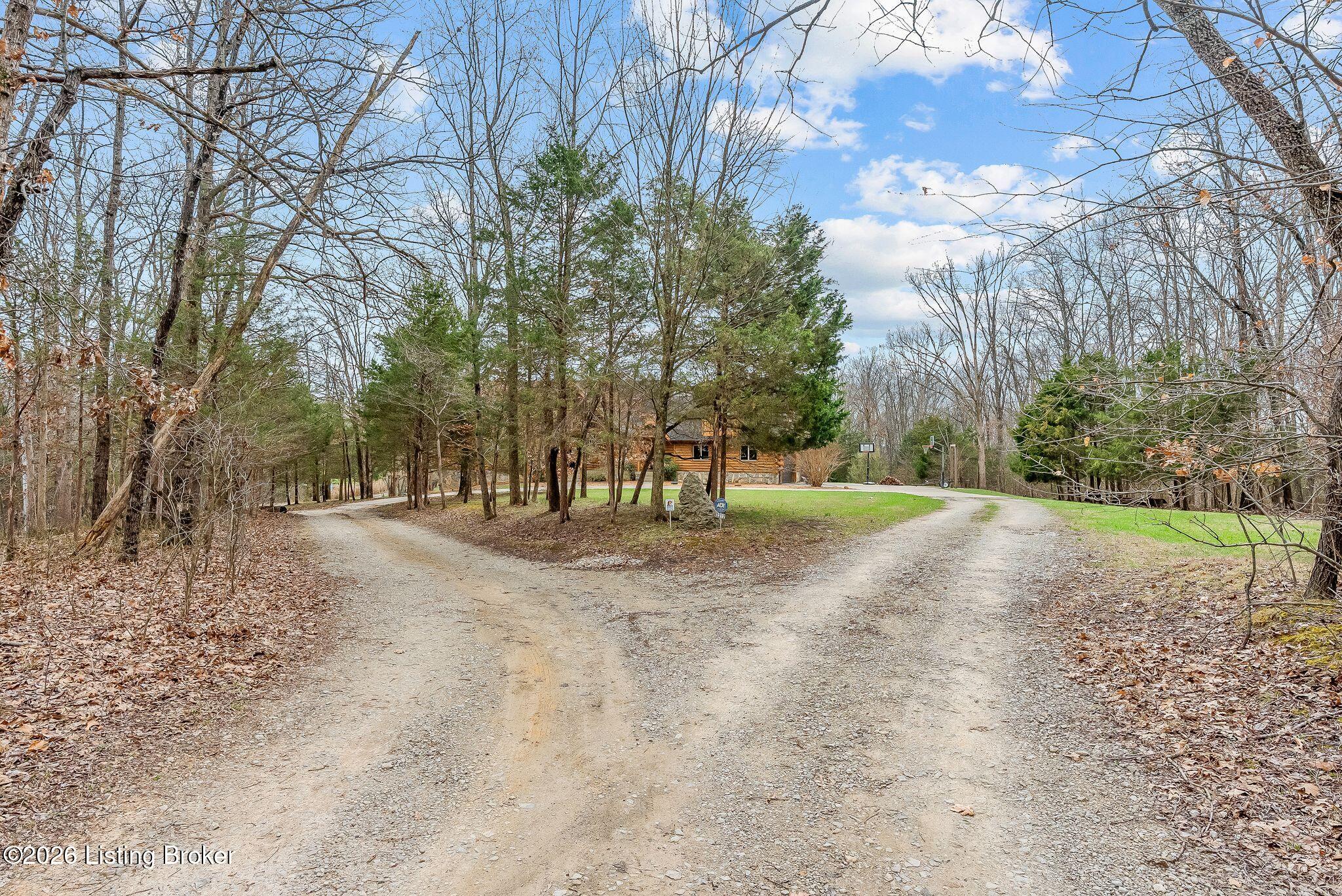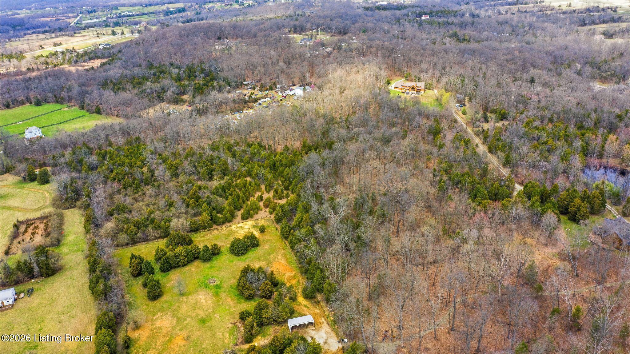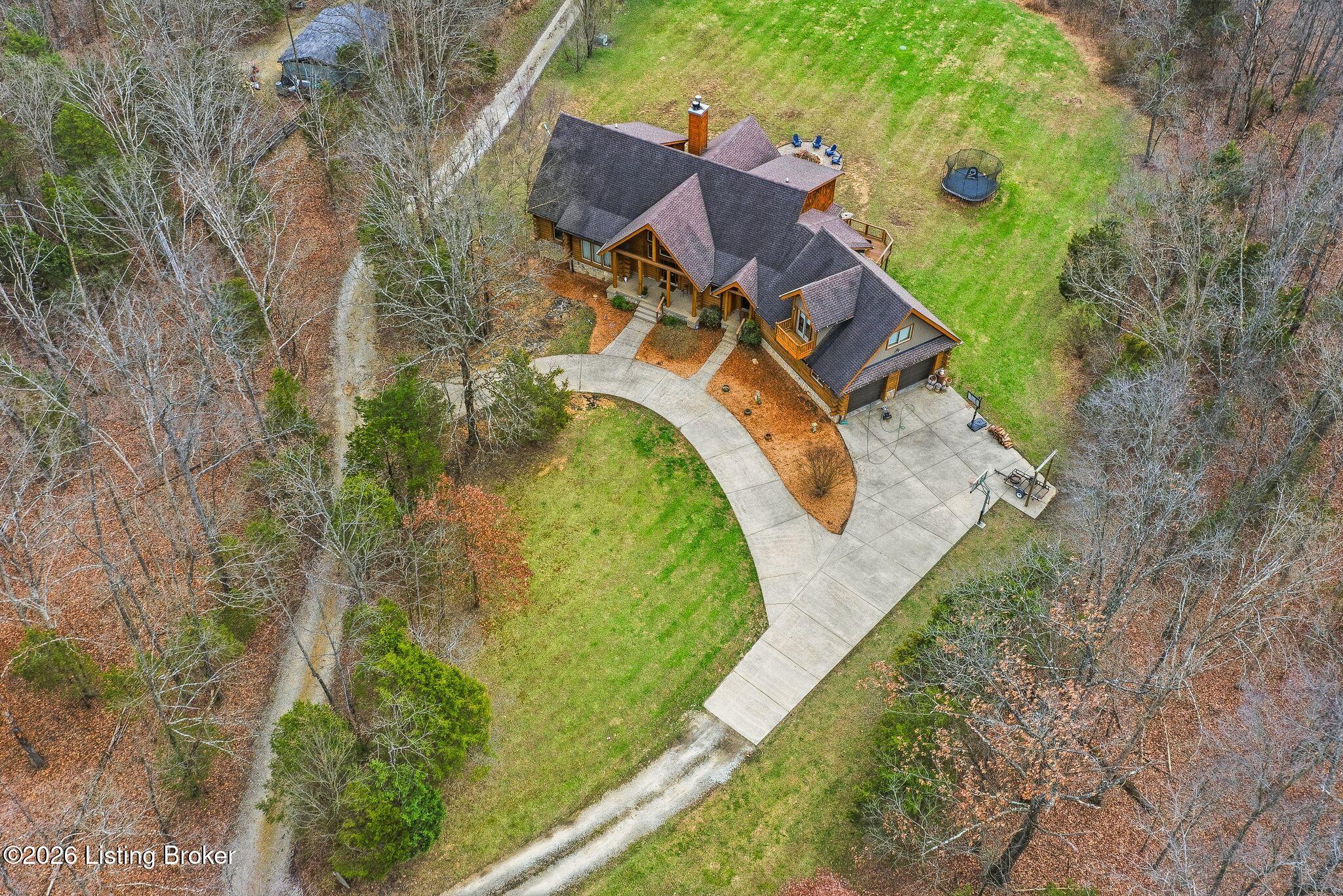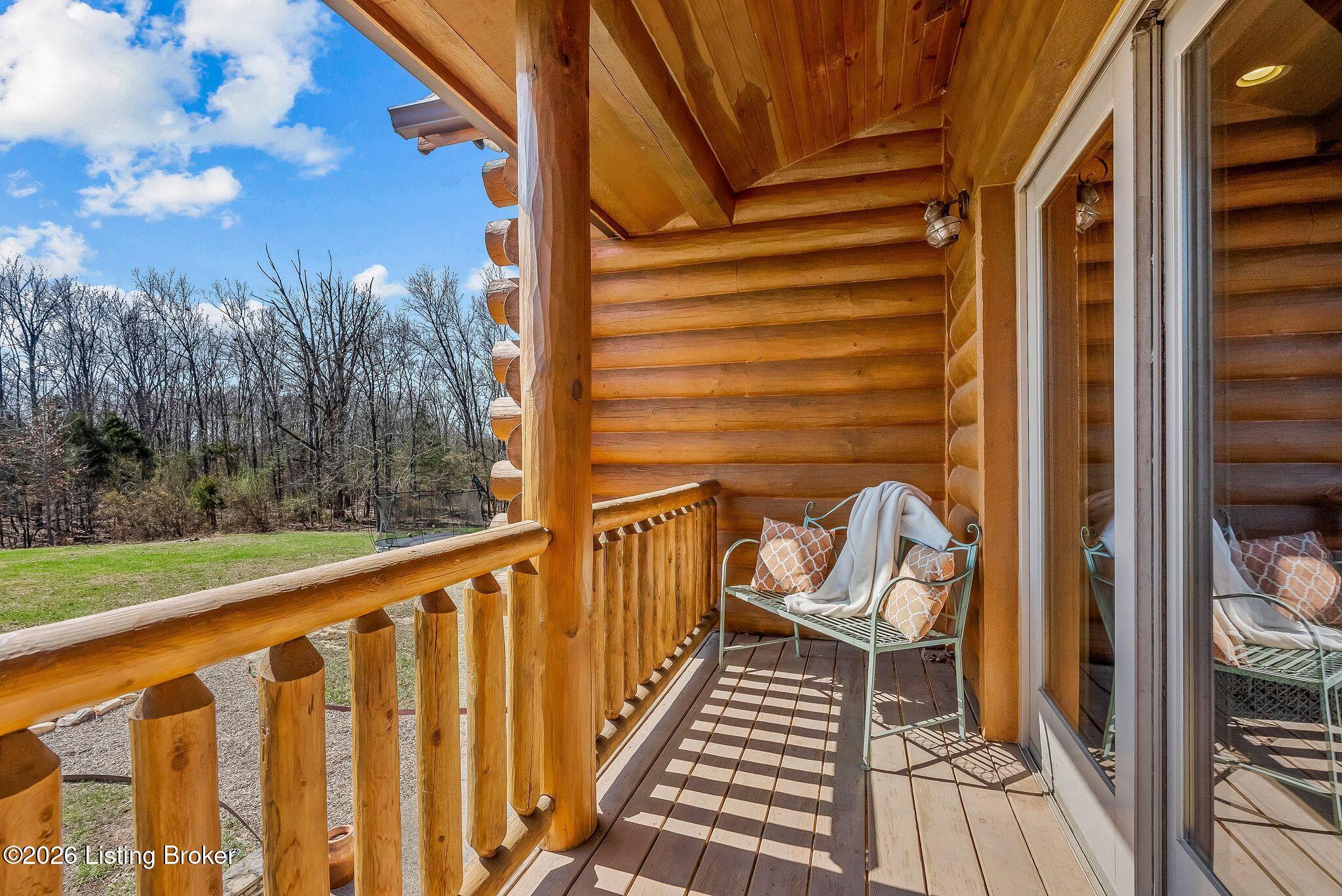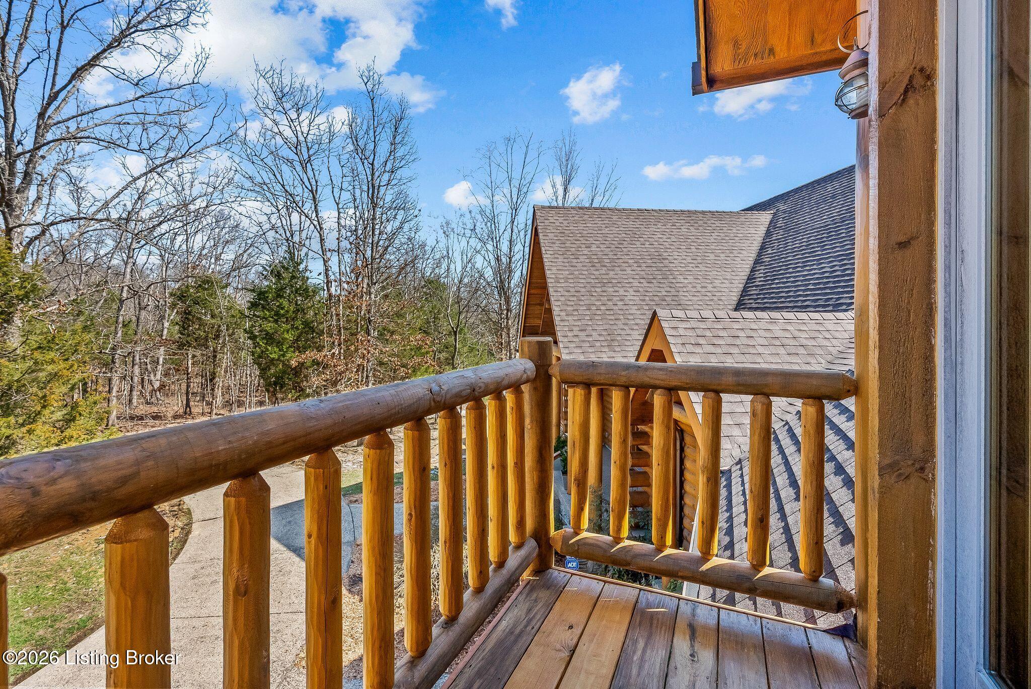 Welcome to 2212 Ballard School Rd in LaGrange, a spectacular custom-built log estate set on 16 private acres with breathtaking views of woods and pasture in every direction. Tucked mile off the main road, this property offers exceptional privacy while still being just minutes from LaGrange shopping, dining, and I-71. Step inside to a breathtaking great room defined by a dramatic 2.5-story vaulted ceiling and an expansive A-frame wall of windows that fills the space with sunlight and captures sweeping views of the peaceful surroundings. Extraordinary, handcrafted stone masonry anchors the room with a beautiful fireplace and continues throughout both the interior and exterior of the home, highlighting the craftsmanship of this one-of-a-kind property. Acacia wood floors run through the entry, great room, kitchen, and primary suite, adding warmth and character. The first-floor primary suite offers a relaxing retreat with a trey ceiling, sitting area, dual walk-in closets, and private deck overlooking the rear property. The spacious bath includes dual vanity, large tub and walk in shower creating a comfortable and functional layout. Designed for everyday living and entertaining, the kitchen opens to the dining and living areas and includes an oversized pantry, mudroom, and convenient laundry access with direct entry to the oversized two-car garage. Built-in speakers enhance both the kitchen and outdoor deck spaces. Off the dining area, a large deck provides the perfect setting for enjoying the surrounding countryside. Upstairs, youll find four generously sized bedrooms, including one with a private balcony overlooking the front of the property and another with an en-suite bath. The upper level also features a loft and an additional full bathroom. The finished walkout lower level offers additional living and entertaining space, featuring a bar area and a beautifully crafted hearth with a wood stove, along with doors that open to the rear patio and outdoor gathering area. An additional 1,600 square feet of unfinished basement provide excellent expansion potential, including two framed and electrically wired rooms ready to be finished and plumbing already installed for a future basement bathroom. Outdoor living is equally impressive with five patios and decks, including the private primary suite balcony. The property also features an outdoor firepit, stone pizza oven, outdoor grilling area, deer stands, dog kennels, and even an ATV included with the property, making the acreage a true outdoor playground. Recent improvements include newly stripped and resealed logs along the rear of the home and rebuilt balcony railings. The home is also equipped with dual geothermal heat pump systems and a whole-house Culligan water filtration system with separate drinking water filtration including a new water heater (2025). With 16 acres of rolling land, partial woods, expansive views, and unmatched privacy, this extraordinary property offers the perfect blend of rustic elegance, modern efficiency, and convenient location. A rare opportunity to own this one-of-a-kind property that offers privacy, character, and incredible craftsmanship while still being conveniently located near LaGrange amenities.