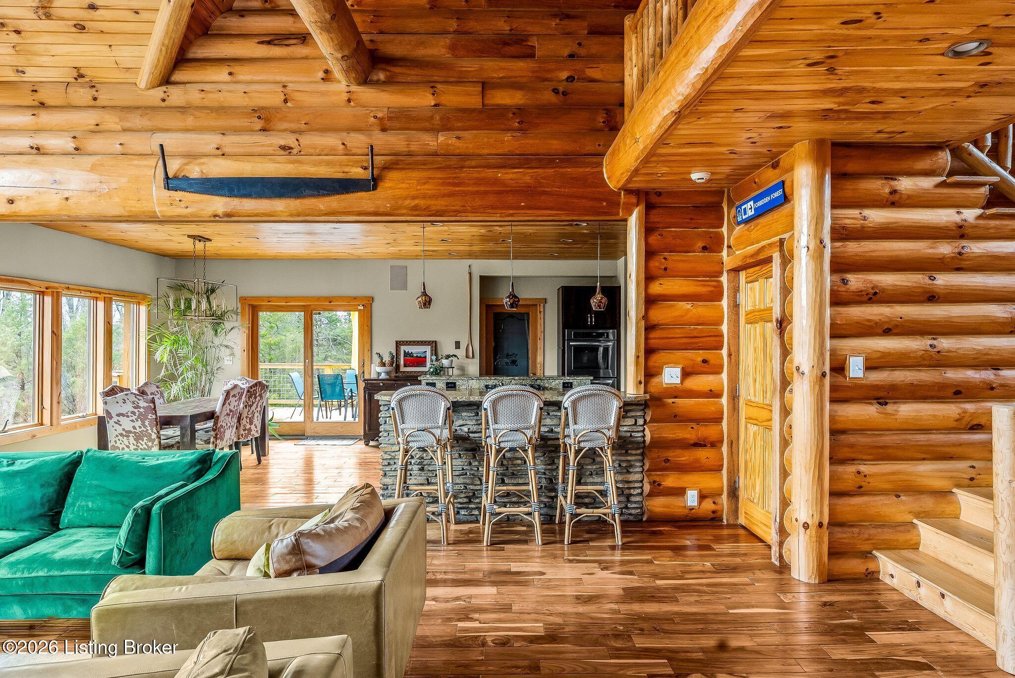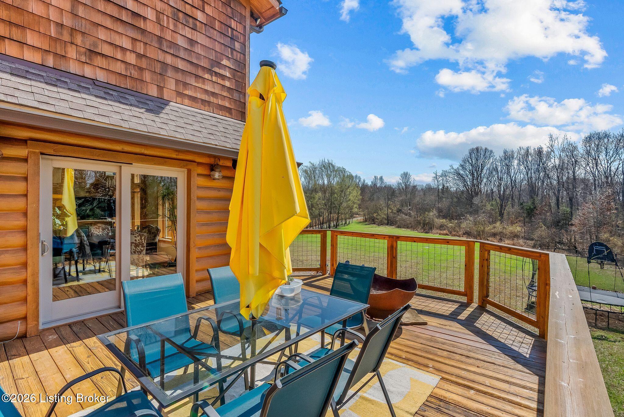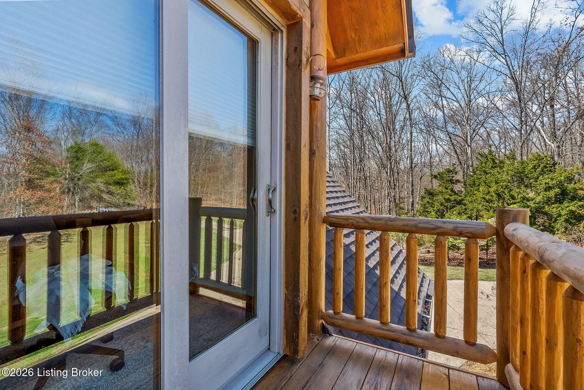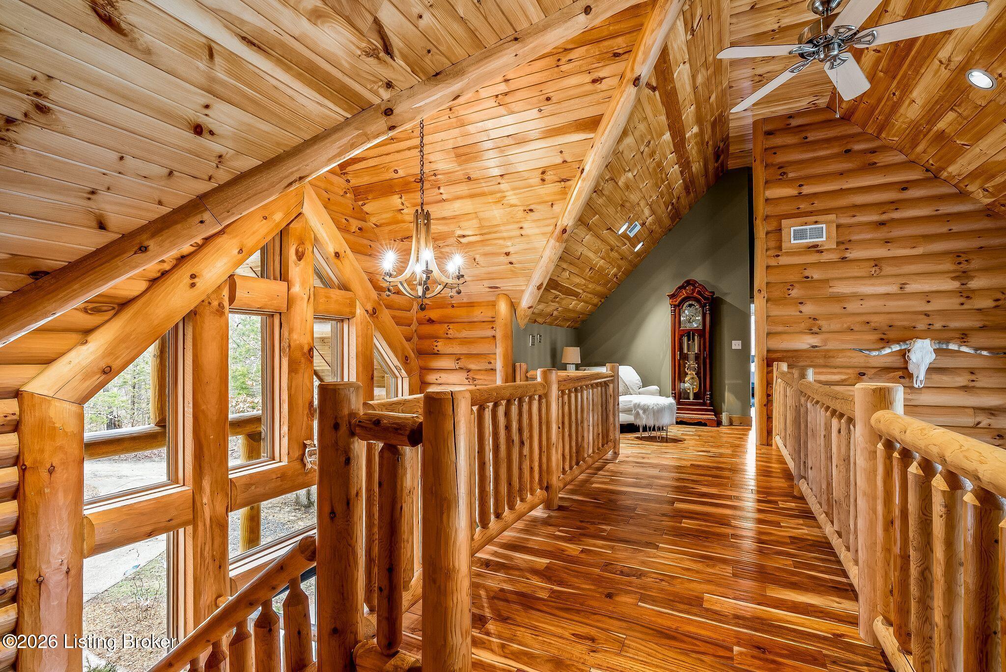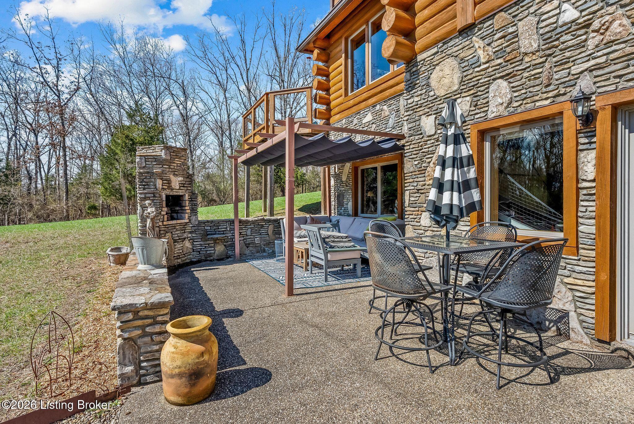 Welcome to 2212 Ballard School Rd in LaGrange, a spectacular custom-built log estate set on 16 private acres with breathtaking views of woods and pasture in every direction. Tucked mile off the main road, this property offers exceptional privacy while still being just minutes from LaGrange shopping, dining, and I-71. Step inside to a breathtaking great room defined by a dramatic 2.5-story vaulted ceiling and an expansive A-frame wall of windows that fills the space with sunlight and captures sweeping views of the peaceful surroundings. Extraordinary, handcrafted stone masonry anchors the room with a beautiful fireplace and continues throughout both the interior and exterior of the home, highlighting the craftsmanship of this one-of-a-kind property. Acacia wood floors run through the entry, great room, kitchen, and primary suite, adding warmth and character. The first-floor primary suite offers a relaxing retreat with a trey ceiling, sitting area, dual walk-in closets, and private deck overlooking the rear property. The spacious bath includes dual vanity, large tub and walk in shower creating a comfortable and functional layout. Designed for everyday living and entertaining, the kitchen opens to the dining and living areas and includes an oversized pantry, mudroom, and convenient laundry access with direct entry to the oversized two-car garage. Built-in speakers enhance both the kitchen and outdoor deck spaces. Off the dining area, a large deck provides the perfect setting for enjoying the surrounding countryside. Upstairs, youll find four generously sized bedrooms, including one with a private balcony overlooking the front of the property and another with an en-suite bath. The upper level also features a loft and an additional full bathroom. The finished walkout lower level offers additional living and entertaining space, featuring a bar area and a beautifully crafted hearth with a wood stove, along with doors that open to the rear patio and outdoor gathering area. An additional 1,600 square feet of unfinished basement provide excellent expansion potential, including two framed and electrically wired rooms ready to be finished and plumbing already installed for a future basement bathroom. Outdoor living is equally impressive with five patios and decks, including the private primary suite balcony. The property also features an outdoor firepit, stone pizza oven, outdoor grilling area, deer stands, dog kennels, and even an ATV included with the property, making the acreage a true outdoor playground. Recent improvements include newly stripped and resealed logs along the rear of the home and rebuilt balcony railings. The home is also equipped with dual geothermal heat pump systems and a whole-house Culligan water filtration system with separate drinking water filtration including a new water heater (2025). With 16 acres of rolling land, partial woods, expansive views, and unmatched privacy, this extraordinary property offers the perfect blend of rustic elegance, modern efficiency, and convenient location. A rare opportunity to own this one-of-a-kind property that offers privacy, character, and incredible craftsmanship while still being conveniently located near LaGrange amenities.