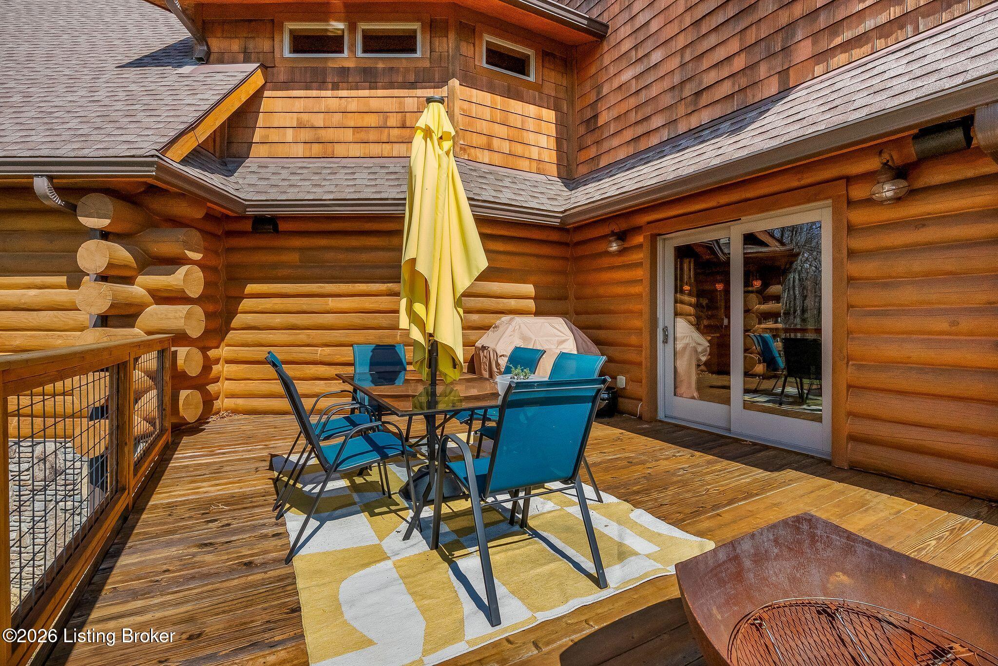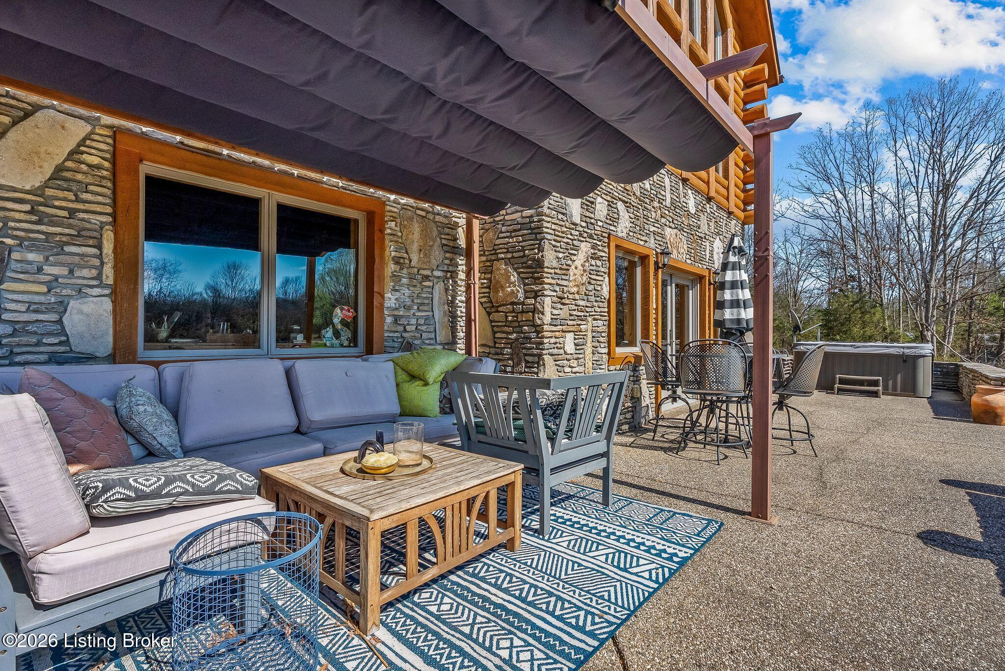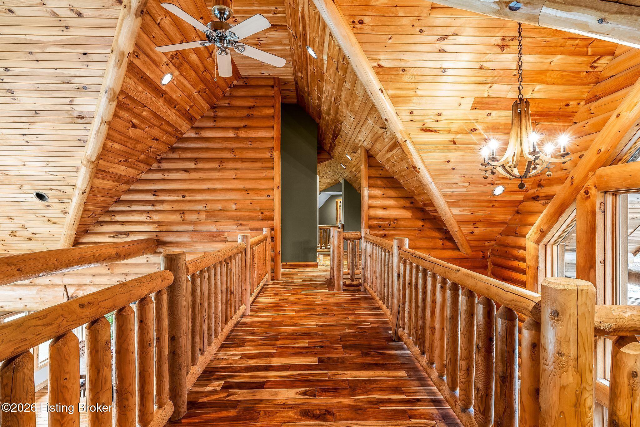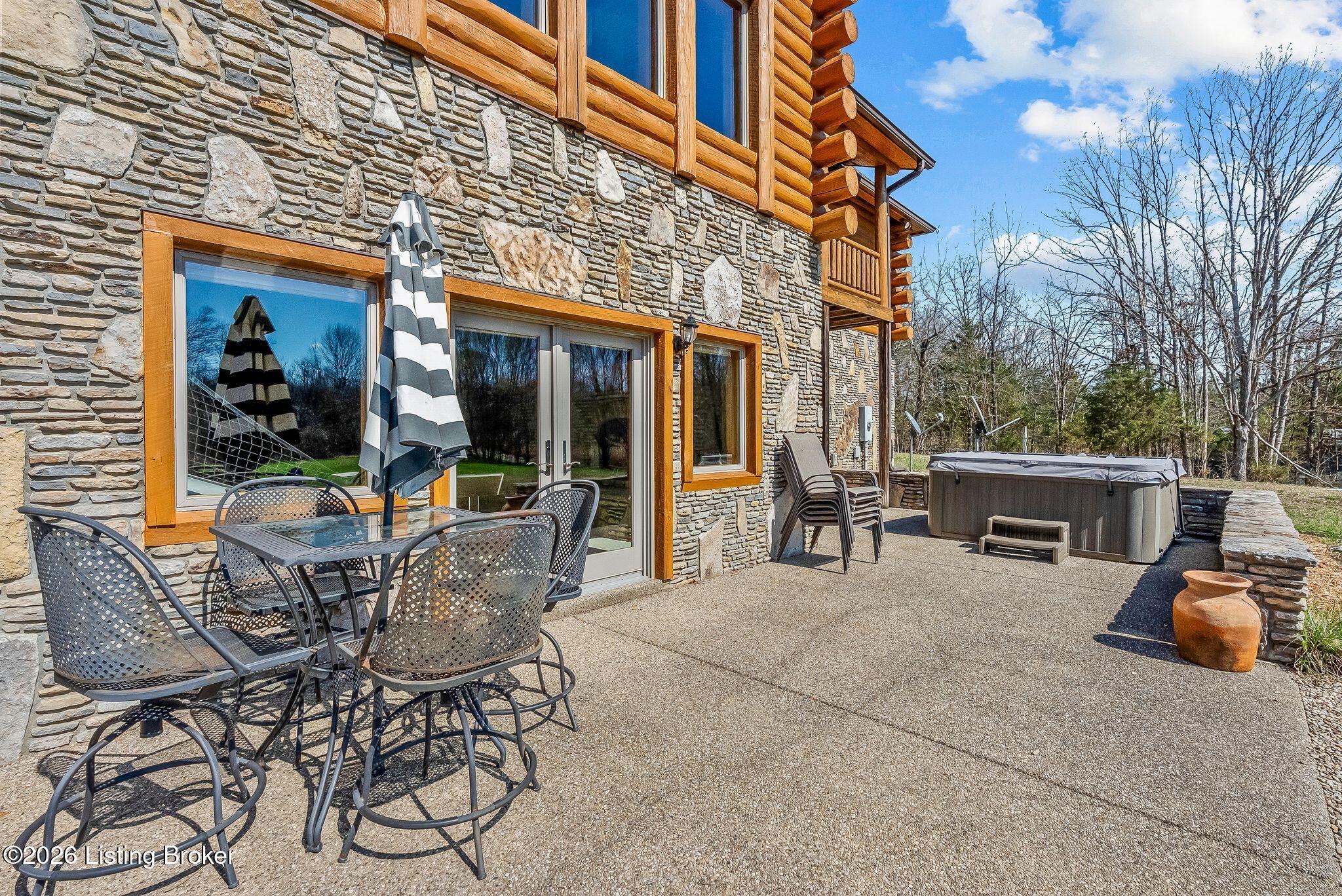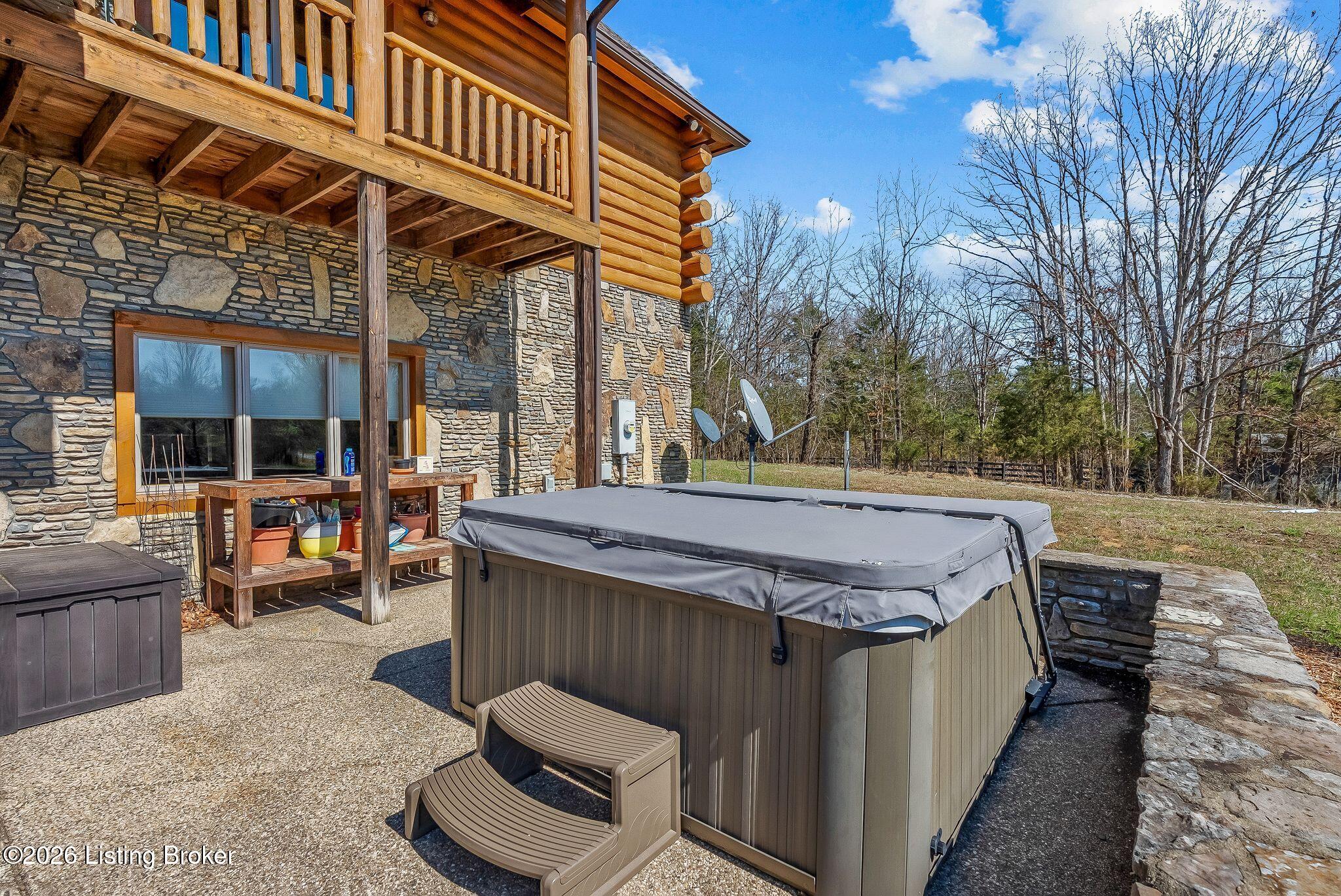 Welcome to 2212 Ballard School Rd in LaGrange, a spectacular custom-built log estate set on 16 private acres with breathtaking views of woods and pasture in every direction. Tucked mile off the main road, this property offers exceptional privacy while still being just minutes from LaGrange shopping, dining, and I-71. Step inside to a breathtaking great room defined by a dramatic 2.5-story vaulted ceiling and an expansive A-frame wall of windows that fills the space with sunlight and captures sweeping views of the peaceful surroundings. Extraordinary, handcrafted stone masonry anchors the room with a beautiful fireplace and continues throughout both the interior and exterior of the home, highlighting the craftsmanship of this one-of-a-kind property. Acacia wood floors run through the entry, great room, kitchen, and primary suite, adding warmth and character. The first-floor primary suite offers a relaxing retreat with a trey ceiling, sitting area, dual walk-in closets, and private deck overlooking the rear property. The spacious bath includes dual vanity, large tub and walk in shower creating a comfortable and functional layout. Designed for everyday living and entertaining, the kitchen opens to the dining and living areas and includes an oversized pantry, mudroom, and convenient laundry access with direct entry to the oversized two-car garage. Built-in speakers enhance both the kitchen and outdoor deck spaces. Off the dining area, a large deck provides the perfect setting for enjoying the surrounding countryside. Upstairs, youll find four generously sized bedrooms, including one with a private balcony overlooking the front of the property and another with an en-suite bath. The upper level also features a loft and an additional full bathroom. The finished walkout lower level offers additional living and entertaining space, featuring a bar area and a beautifully crafted hearth with a wood stove, along with doors that open to the rear patio and outdoor gathering area. An additional 1,600 square feet of unfinished basement provide excellent expansion potential, including two framed and electrically wired rooms ready to be finished and plumbing already installed for a future basement bathroom. Outdoor living is equally impressive with five patios and decks, including the private primary suite balcony. The property also features an outdoor firepit, stone pizza oven, outdoor grilling area, deer stands, dog kennels, and even an ATV included with the property, making the acreage a true outdoor playground. Recent improvements include newly stripped and resealed logs along the rear of the home and rebuilt balcony railings. The home is also equipped with dual geothermal heat pump systems and a whole-house Culligan water filtration system with separate drinking water filtration including a new water heater (2025). With 16 acres of rolling land, partial woods, expansive views, and unmatched privacy, this extraordinary property offers the perfect blend of rustic elegance, modern efficiency, and convenient location. A rare opportunity to own this one-of-a-kind property that offers privacy, character, and incredible craftsmanship while still being conveniently located near LaGrange amenities.