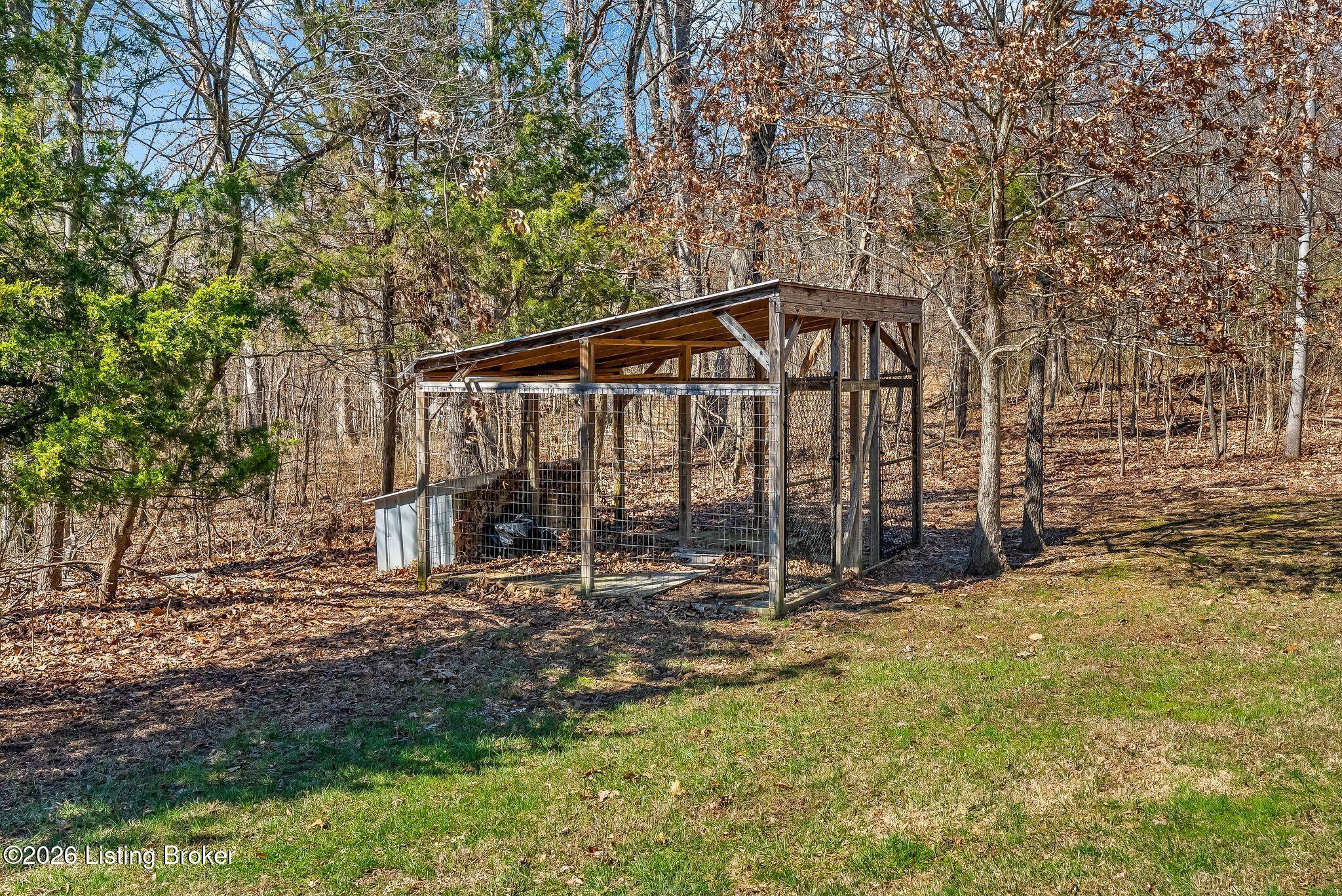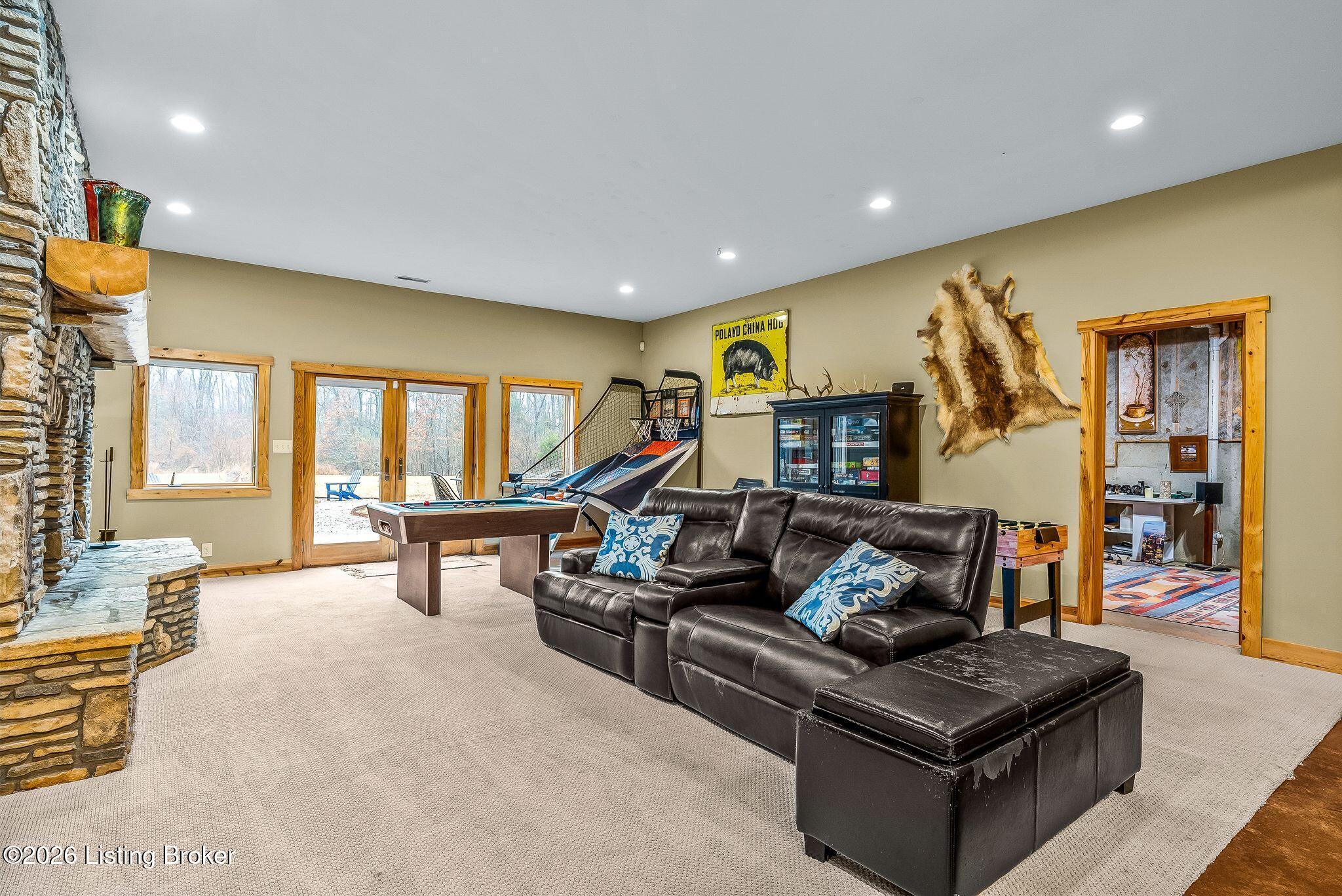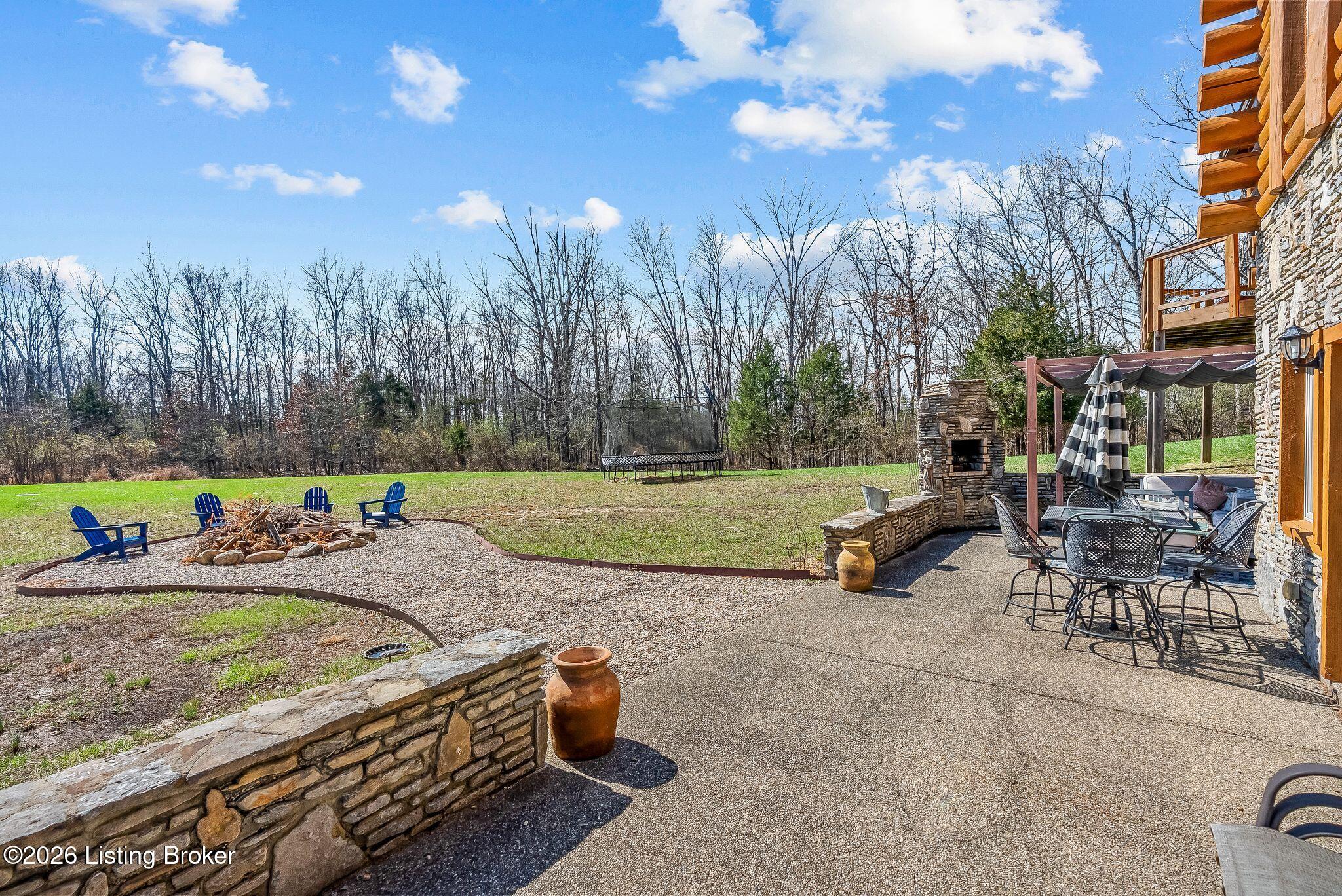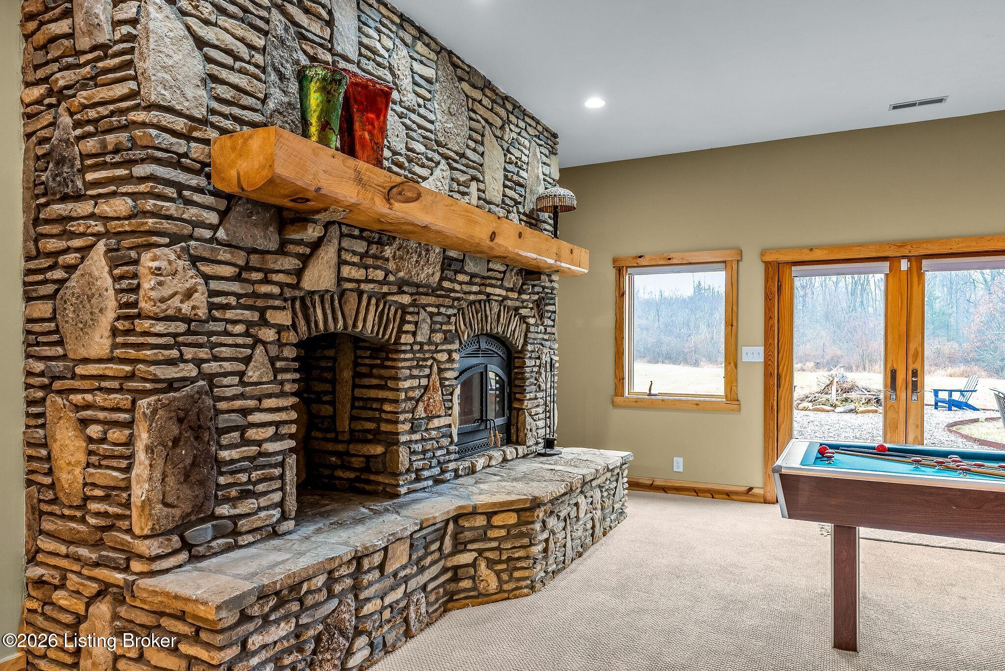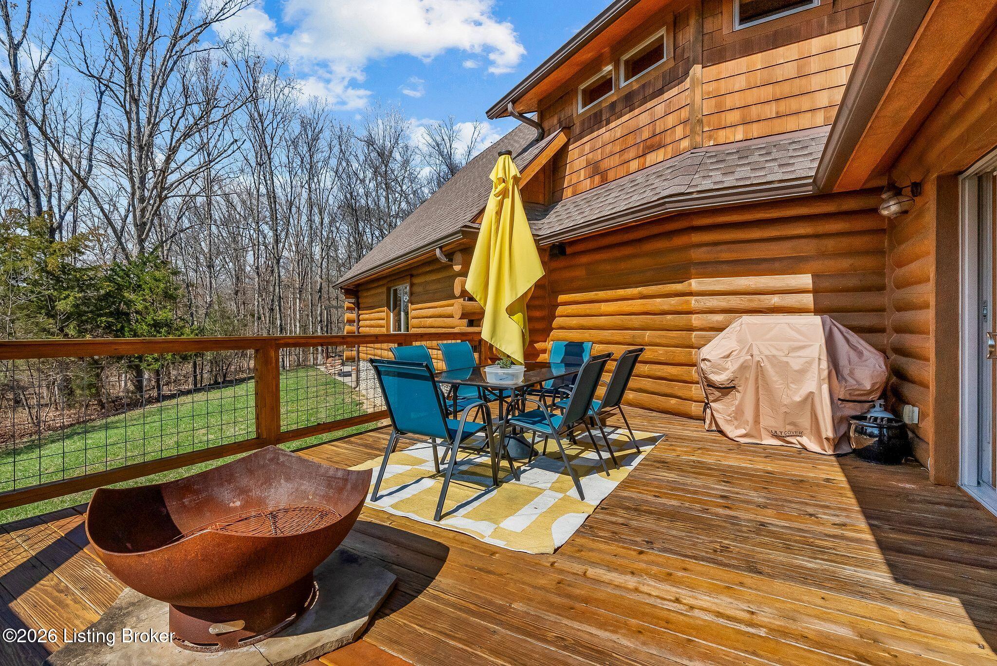 Welcome to 2212 Ballard School Rd in LaGrange, a spectacular custom-built log estate set on 16 private acres with breathtaking views of woods and pasture in every direction. Tucked mile off the main road, this property offers exceptional privacy while still being just minutes from LaGrange shopping, dining, and I-71. Step inside to a breathtaking great room defined by a dramatic 2.5-story vaulted ceiling and an expansive A-frame wall of windows that fills the space with sunlight and captures sweeping views of the peaceful surroundings. Extraordinary, handcrafted stone masonry anchors the room with a beautiful fireplace and continues throughout both the interior and exterior of the home, highlighting the craftsmanship of this one-of-a-kind property. Acacia wood floors run through the entry, great room, kitchen, and primary suite, adding warmth and character. The first-floor primary suite offers a relaxing retreat with a trey ceiling, sitting area, dual walk-in closets, and private deck overlooking the rear property. The spacious bath includes dual vanity, large tub and walk in shower creating a comfortable and functional layout. Designed for everyday living and entertaining, the kitchen opens to the dining and living areas and includes an oversized pantry, mudroom, and convenient laundry access with direct entry to the oversized two-car garage. Built-in speakers enhance both the kitchen and outdoor deck spaces. Off the dining area, a large deck provides the perfect setting for enjoying the surrounding countryside. Upstairs, youll find four generously sized bedrooms, including one with a private balcony overlooking the front of the property and another with an en-suite bath. The upper level also features a loft and an additional full bathroom. The finished walkout lower level offers additional living and entertaining space, featuring a bar area and a beautifully crafted hearth with a wood stove, along with doors that open to the rear patio and outdoor gathering area. An additional 1,600 square feet of unfinished basement provide excellent expansion potential, including two framed and electrically wired rooms ready to be finished and plumbing already installed for a future basement bathroom. Outdoor living is equally impressive with five patios and decks, including the private primary suite balcony. The property also features an outdoor firepit, stone pizza oven, outdoor grilling area, deer stands, dog kennels, and even an ATV included with the property, making the acreage a true outdoor playground. Recent improvements include newly stripped and resealed logs along the rear of the home and rebuilt balcony railings. The home is also equipped with dual geothermal heat pump systems and a whole-house Culligan water filtration system with separate drinking water filtration including a new water heater (2025). With 16 acres of rolling land, partial woods, expansive views, and unmatched privacy, this extraordinary property offers the perfect blend of rustic elegance, modern efficiency, and convenient location. A rare opportunity to own this one-of-a-kind property that offers privacy, character, and incredible craftsmanship while still being conveniently located near LaGrange amenities.