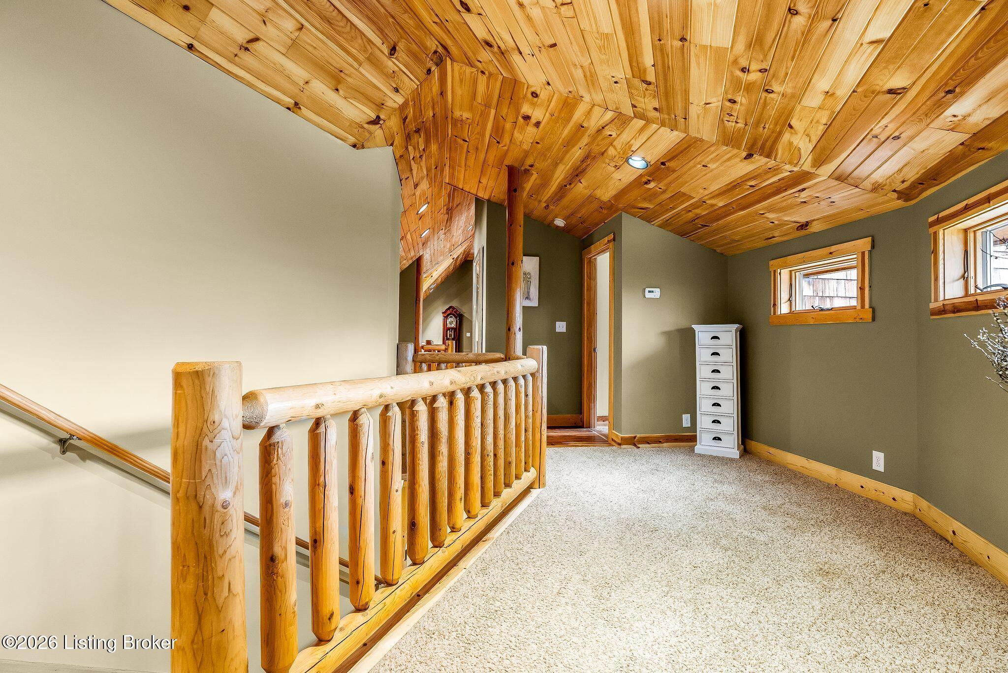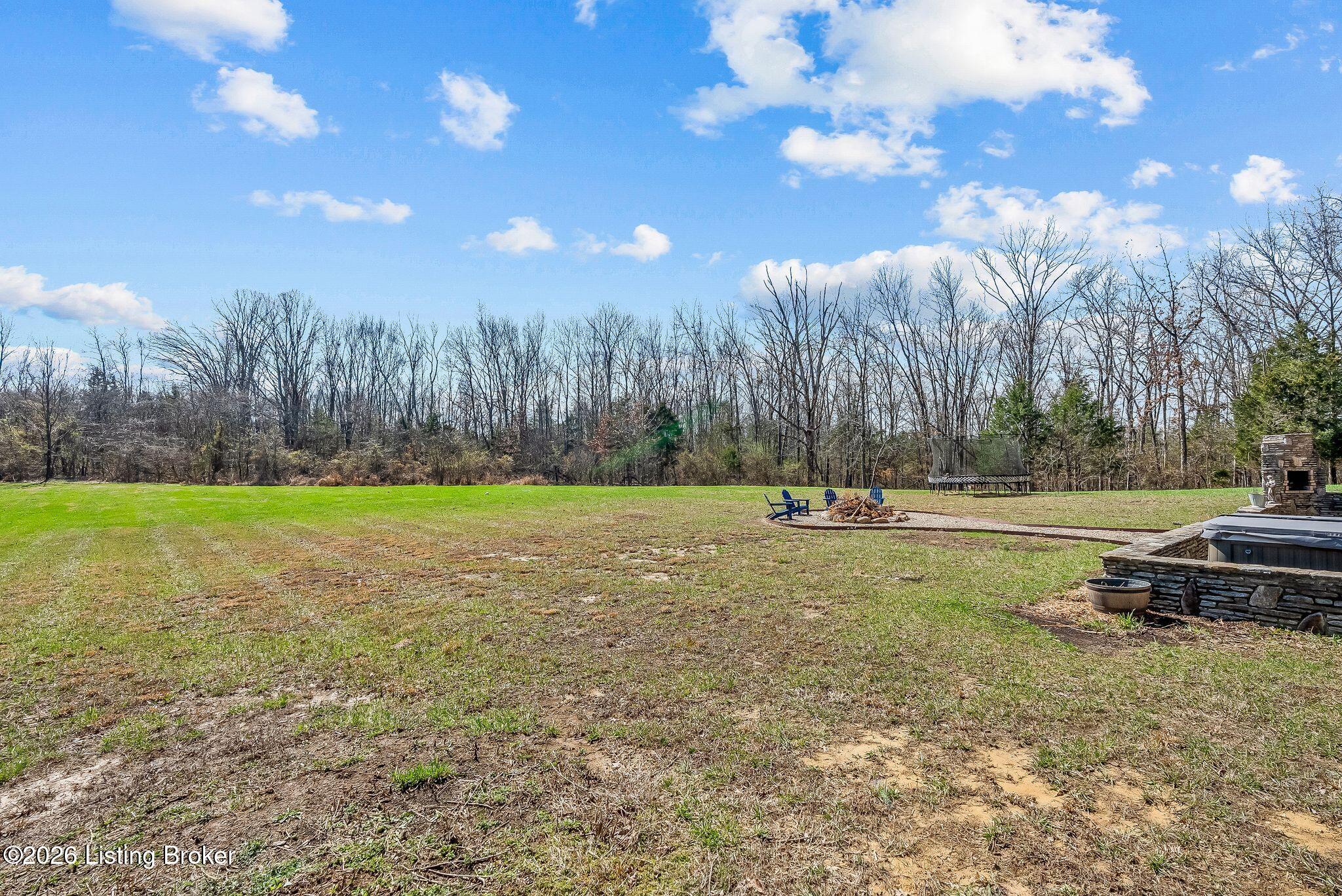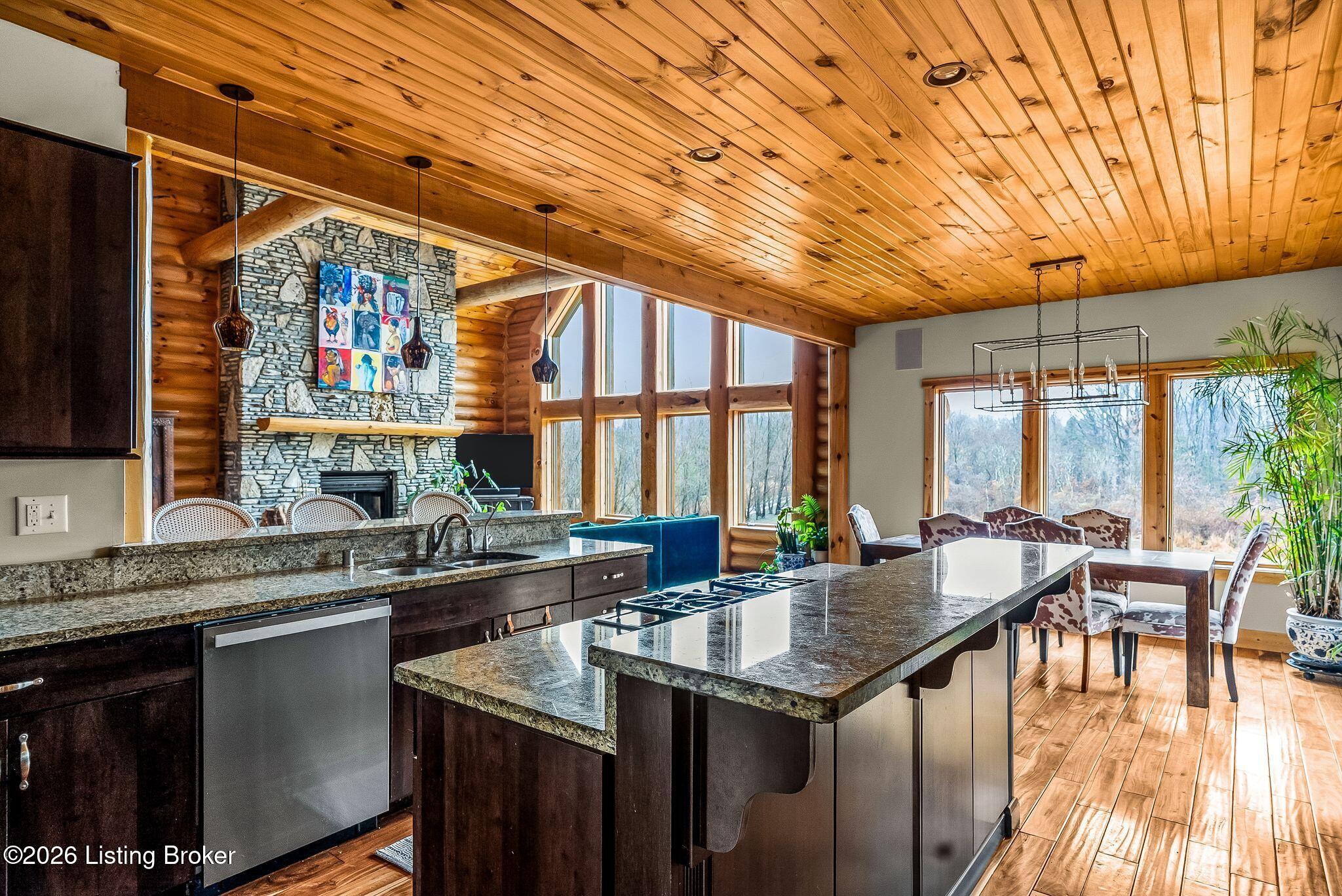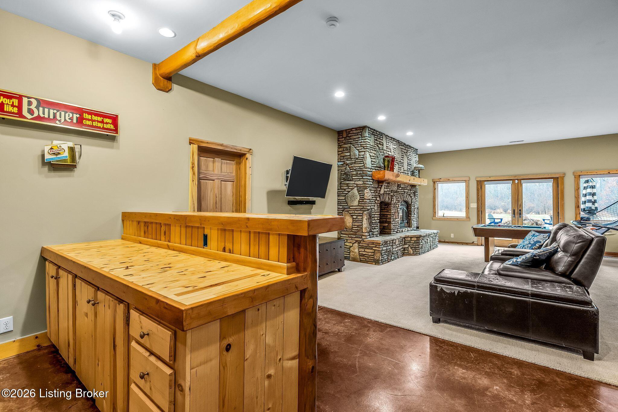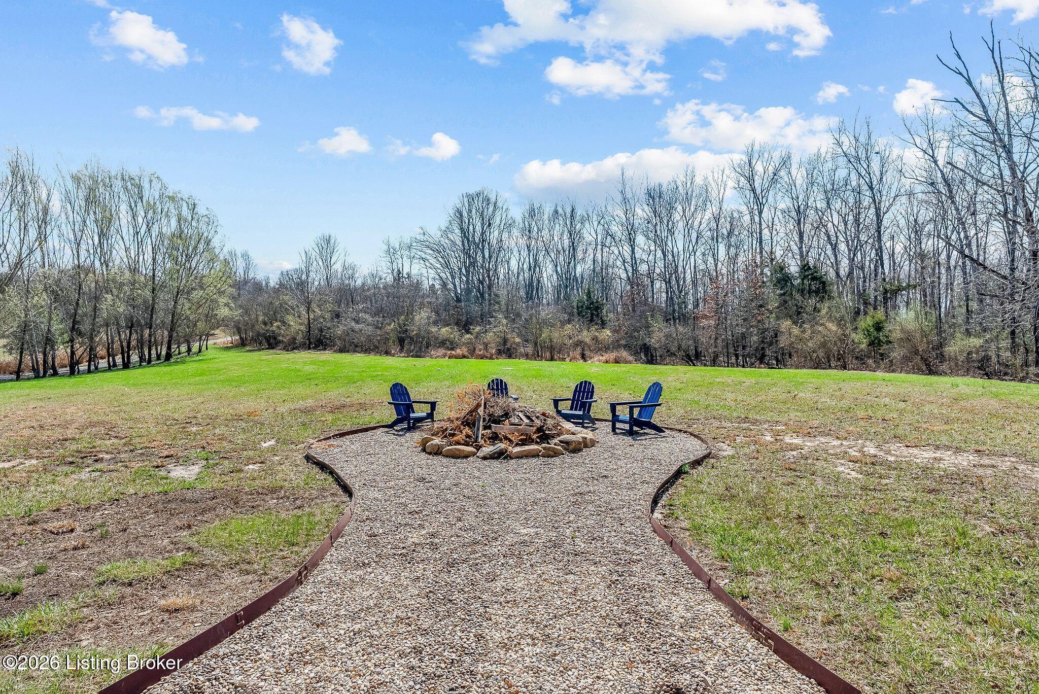Welcome to 2212 Ballard School Rd in LaGrange, a spectacular custom-built log estate set on 16 private acres with breathtaking views of woods and pasture in every direction. Tucked mile off the main road, this property offers exceptional privacy while still being just minutes from LaGrange shopping, dining, and I-71. Step inside to a breathtaking great room defined by a dramatic 2.5-story vaulted ceiling and an expansive A-frame wall of windows that fills the space with sunlight and captures sweeping views of the peaceful surroundings. Extraordinary, handcrafted stone masonry anchors the room with a beautiful fireplace and continues throughout both the interior and exterior of the home, highlighting the craftsmanship of this one-of-a-kind property. Acacia wood floors run through the entry, great room, kitchen, and primary suite, adding warmth and character. The first-floor primary suite offers a relaxing retreat with a trey ceiling, sitting area, dual walk-in closets, and private deck overlooking the rear property. The spacious bath includes dual vanity, large tub and walk in shower creating a comfortable and functional layout. Designed for everyday living and entertaining, the kitchen opens to the dining and living areas and includes an oversized pantry, mudroom, and convenient laundry access with direct entry to the oversized two-car garage. Built-in speakers enhance both the kitchen and outdoor deck spaces. Off the dining area, a large deck provides the perfect setting for enjoying the surrounding countryside. Upstairs, youll find four generously sized bedrooms, including one with a private balcony overlooking the front of the property and another with an en-suite bath. The upper level also features a loft and an additional full bathroom. The finished walkout lower level offers additional living and entertaining space, featuring a bar area and a beautifully crafted hearth with a wood stove, along with doors that open to the rear patio and outdoor gathering area. An additional 1,600 square feet of unfinished basement provide excellent expansion potential, including two framed and electrically wired rooms ready to be finished and plumbing already installed for a future basement bathroom. Outdoor living is equally impressive with five patios and decks, including the private primary suite balcony. The property also features an outdoor firepit, stone pizza oven, outdoor grilling area, deer stands, dog kennels, and even an ATV included with the property, making the acreage a true outdoor playground. Recent improvements include newly stripped and resealed logs along the rear of the home and rebuilt balcony railings. The home is also equipped with dual geothermal heat pump systems and a whole-house Culligan water filtration system with separate drinking water filtration including a new water heater (2025). With 16 acres of rolling land, partial woods, expansive views, and unmatched privacy, this extraordinary property offers the perfect blend of rustic elegance, modern efficiency, and convenient location. A rare opportunity to own this one-of-a-kind property that offers privacy, character, and incredible craftsmanship while still being conveniently located near LaGrange amenities.