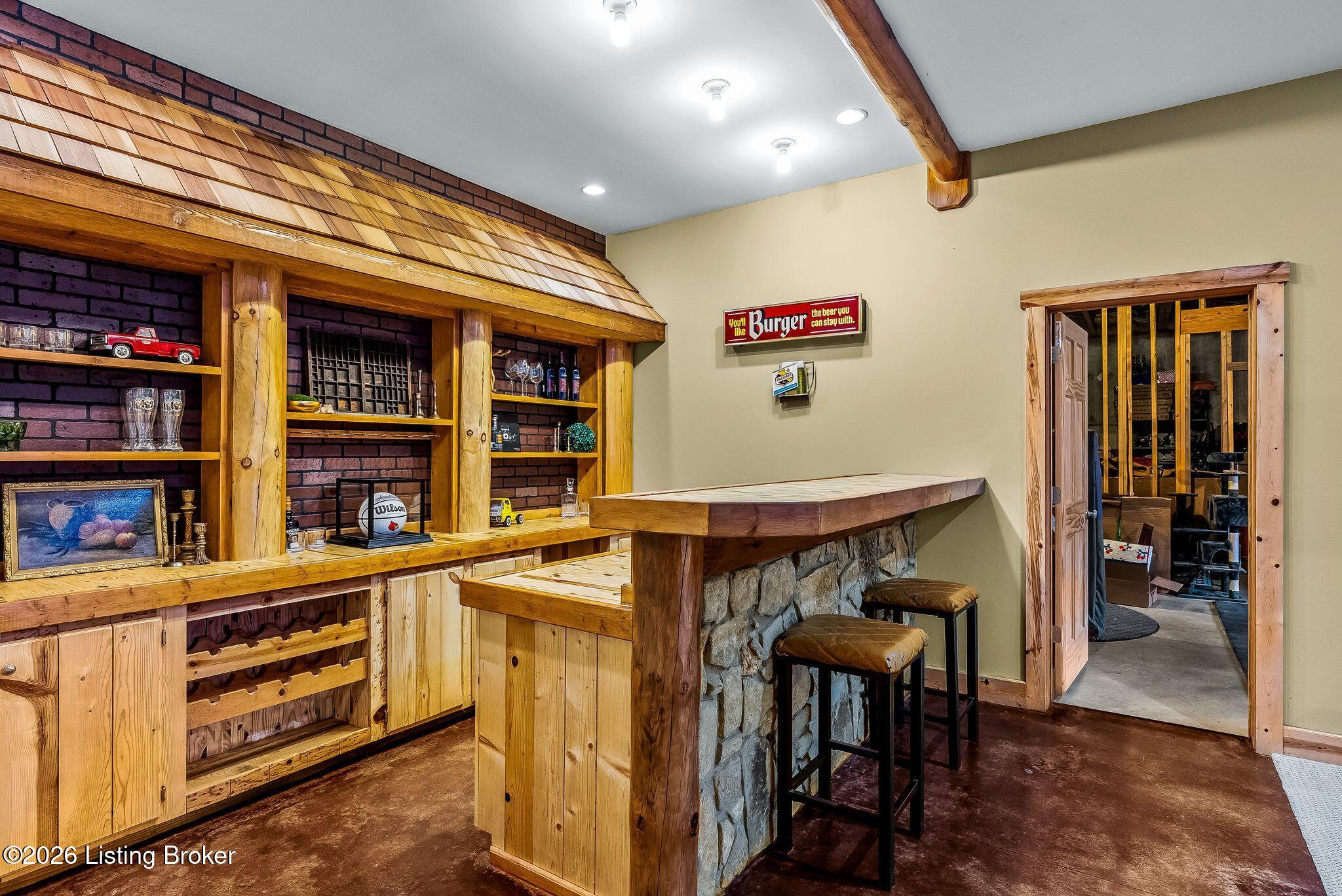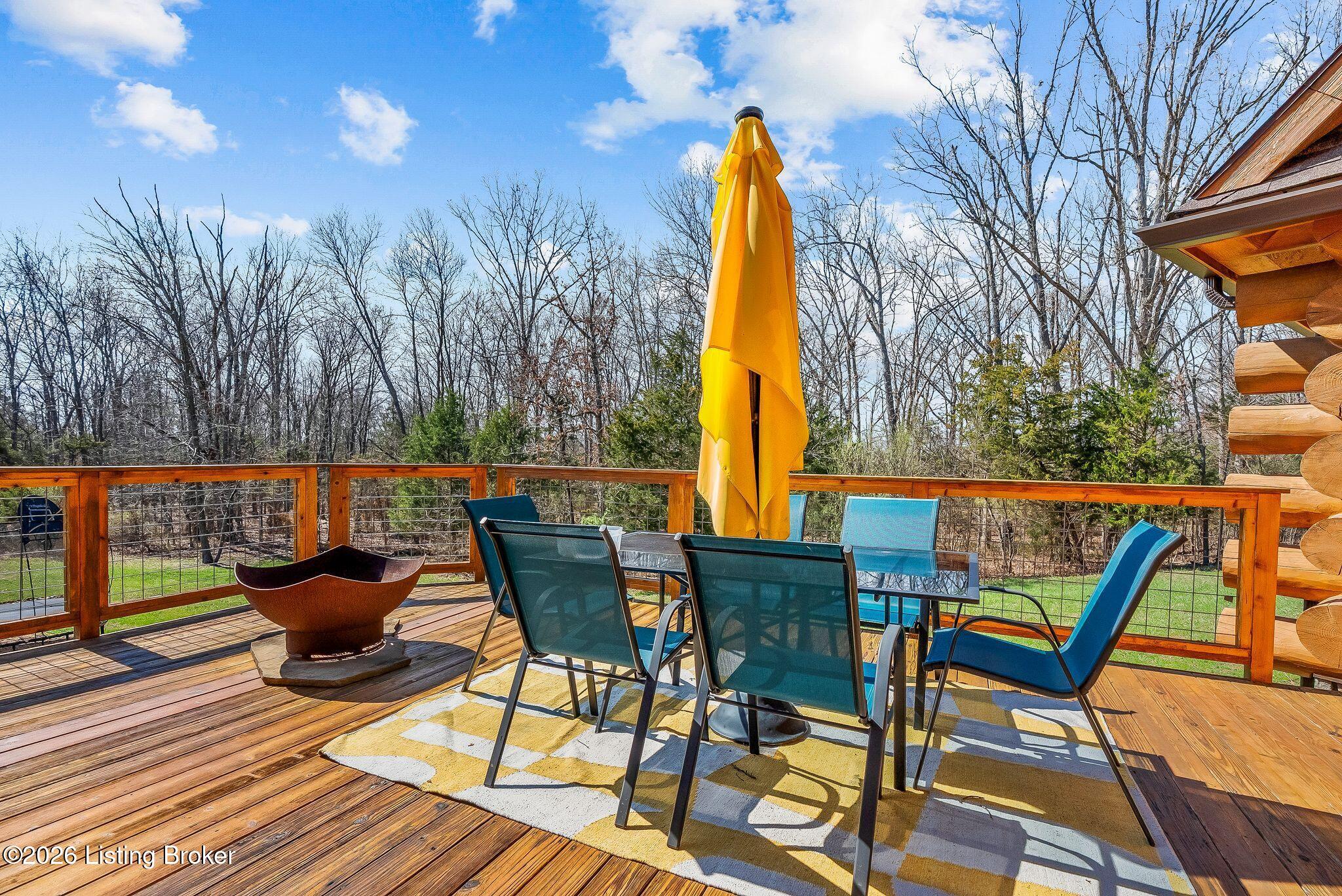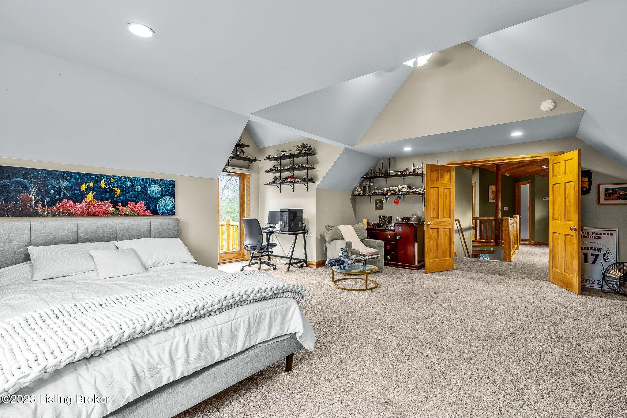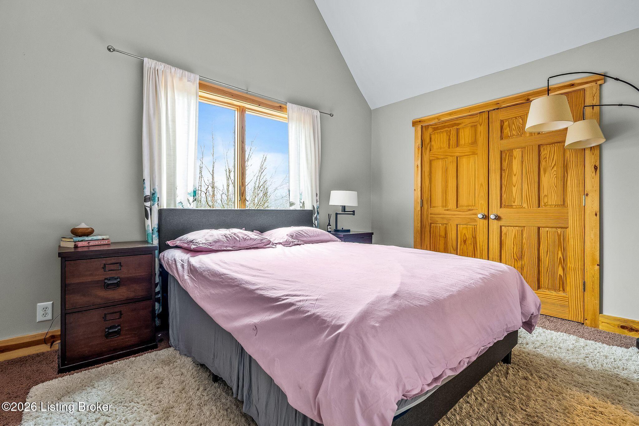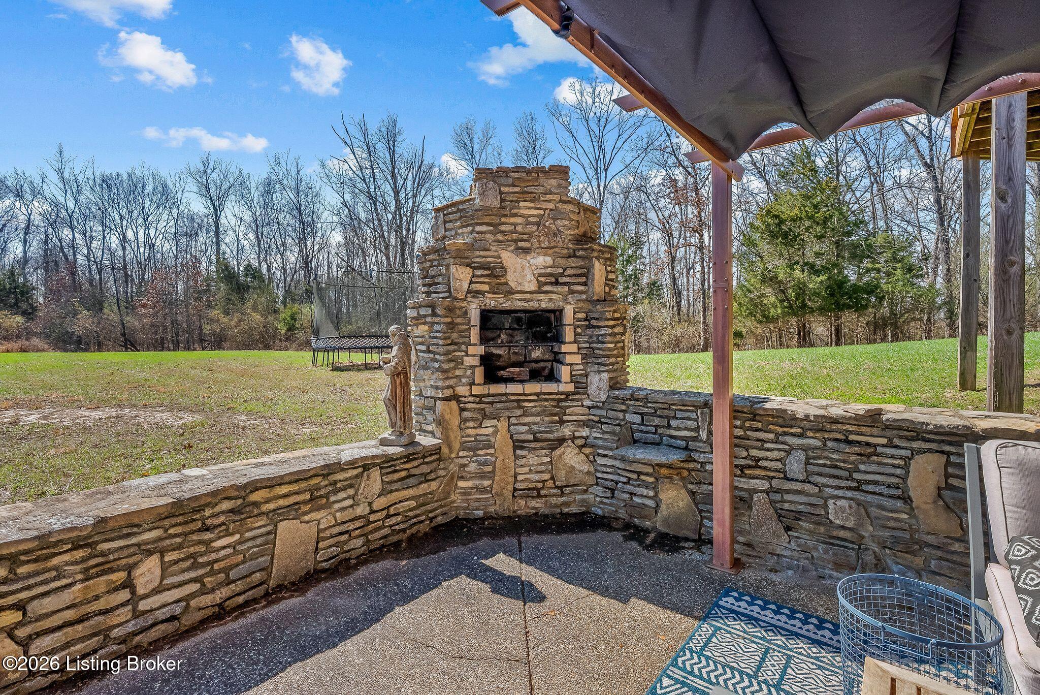 Welcome to 2212 Ballard School Rd in LaGrange, a spectacular custom-built log estate set on 16 private acres with breathtaking views of woods and pasture in every direction. Tucked mile off the main road, this property offers exceptional privacy while still being just minutes from LaGrange shopping, dining, and I-71. Step inside to a breathtaking great room defined by a dramatic 2.5-story vaulted ceiling and an expansive A-frame wall of windows that fills the space with sunlight and captures sweeping views of the peaceful surroundings. Extraordinary, handcrafted stone masonry anchors the room with a beautiful fireplace and continues throughout both the interior and exterior of the home, highlighting the craftsmanship of this one-of-a-kind property. Acacia wood floors run through the entry, great room, kitchen, and primary suite, adding warmth and character. The first-floor primary suite offers a relaxing retreat with a trey ceiling, sitting area, dual walk-in closets, and private deck overlooking the rear property. The spacious bath includes dual vanity, large tub and walk in shower creating a comfortable and functional layout. Designed for everyday living and entertaining, the kitchen opens to the dining and living areas and includes an oversized pantry, mudroom, and convenient laundry access with direct entry to the oversized two-car garage. Built-in speakers enhance both the kitchen and outdoor deck spaces. Off the dining area, a large deck provides the perfect setting for enjoying the surrounding countryside. Upstairs, youll find four generously sized bedrooms, including one with a private balcony overlooking the front of the property and another with an en-suite bath. The upper level also features a loft and an additional full bathroom. The finished walkout lower level offers additional living and entertaining space, featuring a bar area and a beautifully crafted hearth with a wood stove, along with doors that open to the rear patio and outdoor gathering area. An additional 1,600 square feet of unfinished basement provide excellent expansion potential, including two framed and electrically wired rooms ready to be finished and plumbing already installed for a future basement bathroom. Outdoor living is equally impressive with five patios and decks, including the private primary suite balcony. The property also features an outdoor firepit, stone pizza oven, outdoor grilling area, deer stands, dog kennels, and even an ATV included with the property, making the acreage a true outdoor playground. Recent improvements include newly stripped and resealed logs along the rear of the home and rebuilt balcony railings. The home is also equipped with dual geothermal heat pump systems and a whole-house Culligan water filtration system with separate drinking water filtration including a new water heater (2025). With 16 acres of rolling land, partial woods, expansive views, and unmatched privacy, this extraordinary property offers the perfect blend of rustic elegance, modern efficiency, and convenient location. A rare opportunity to own this one-of-a-kind property that offers privacy, character, and incredible craftsmanship while still being conveniently located near LaGrange amenities.