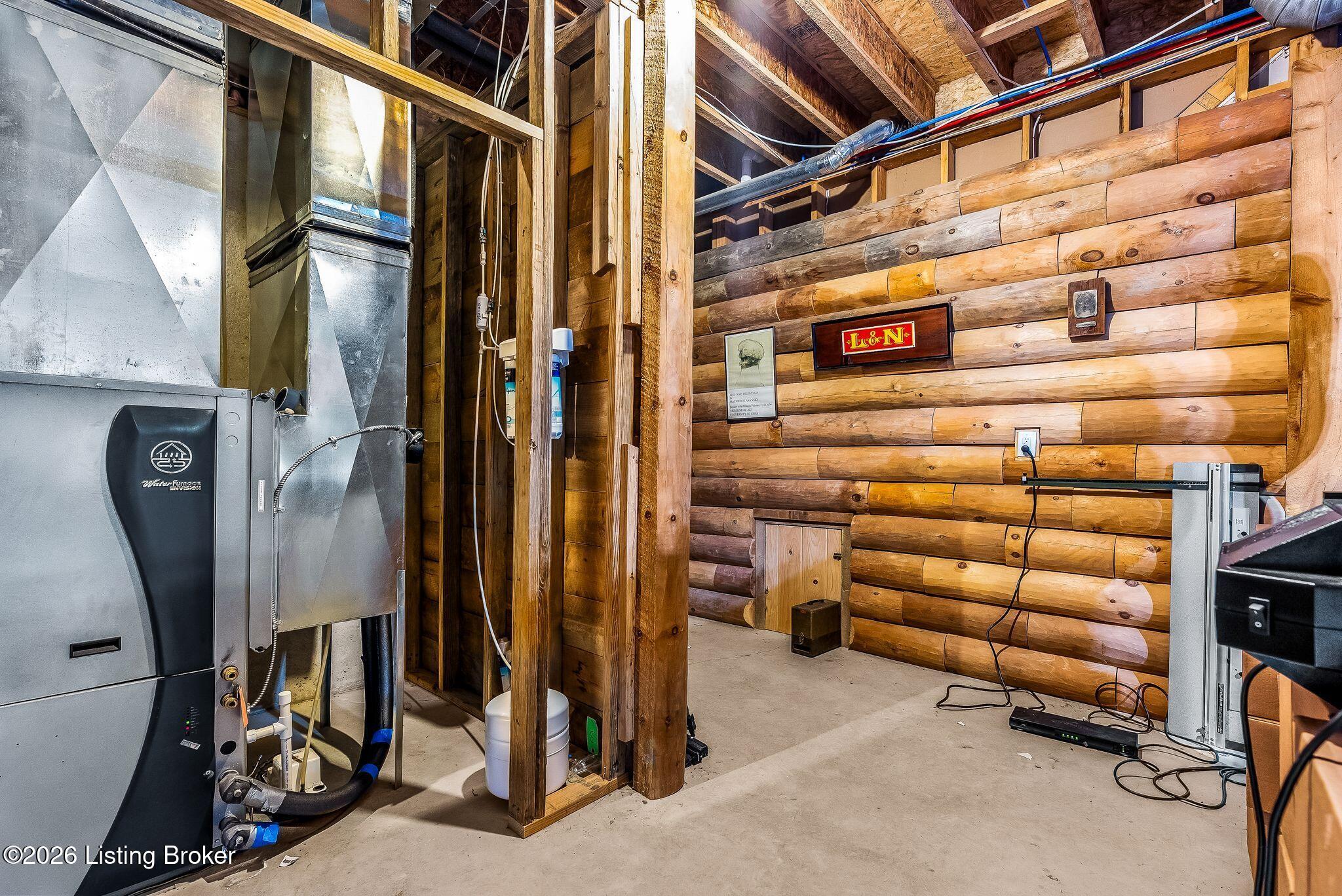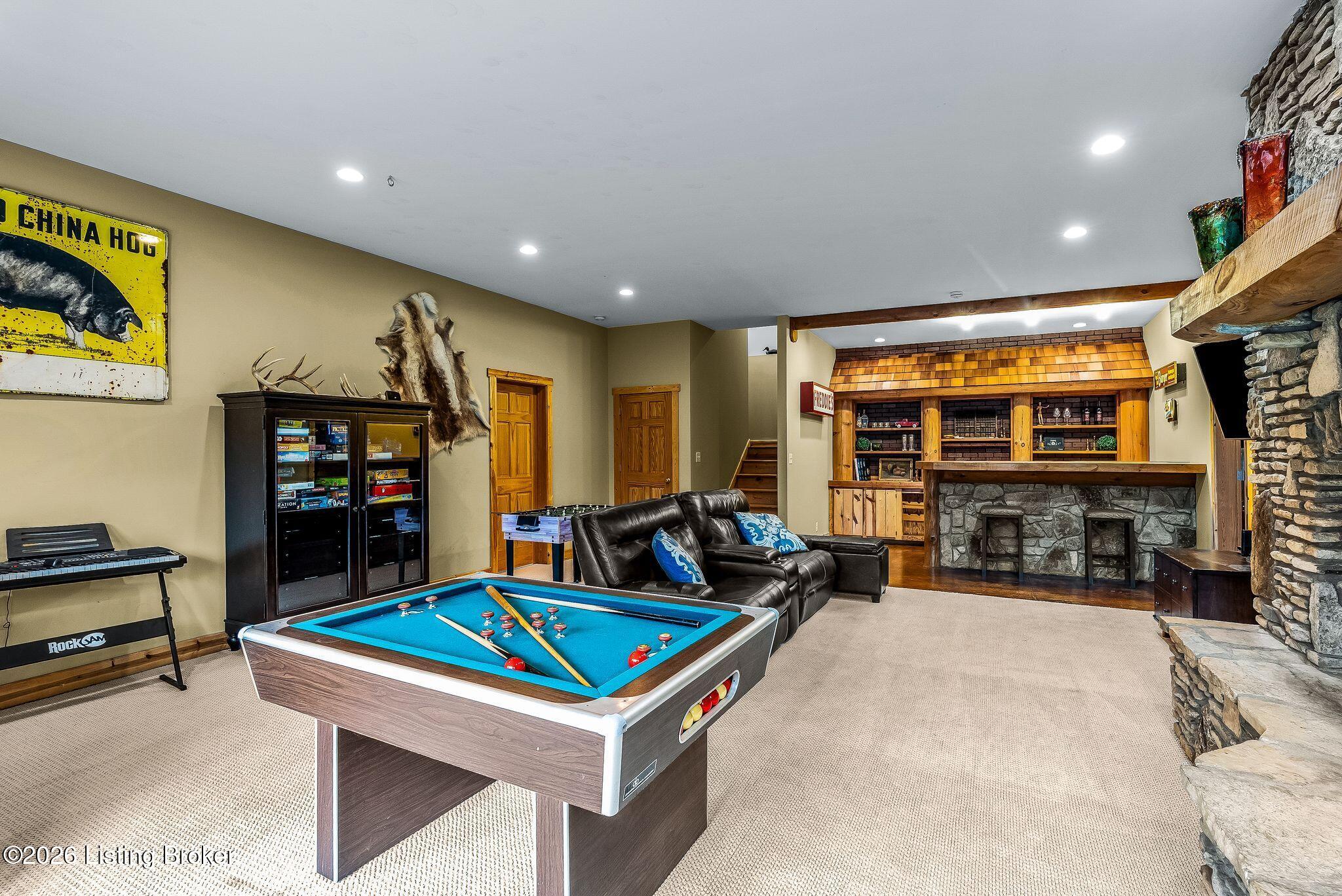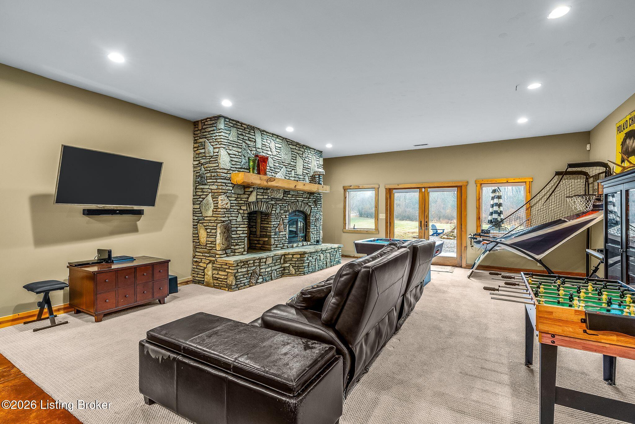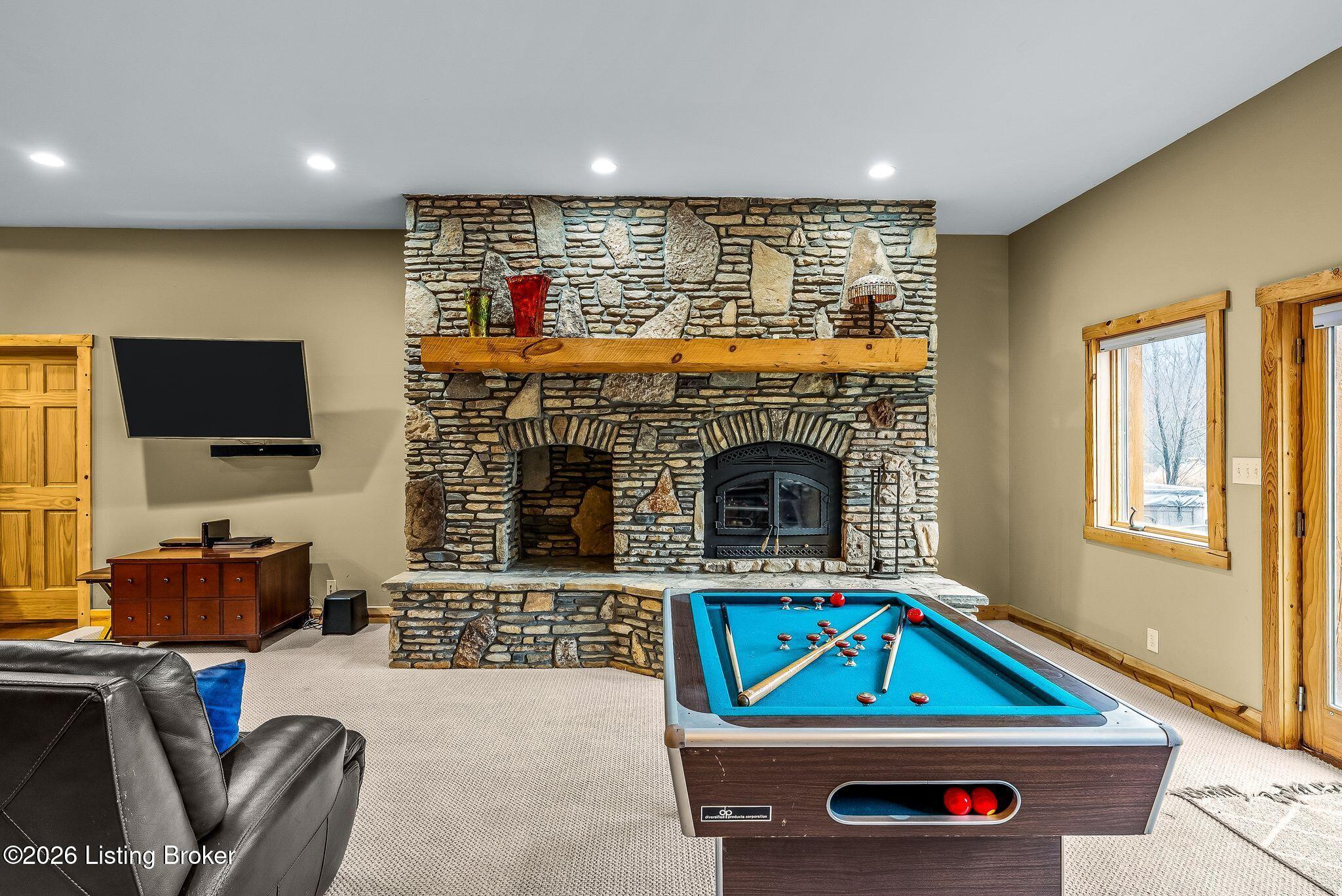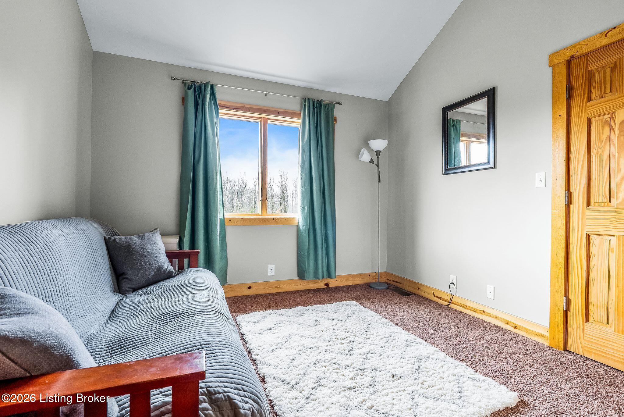 Welcome to 2212 Ballard School Rd in LaGrange, a spectacular custom-built log estate set on 16 private acres with breathtaking views of woods and pasture in every direction. Tucked mile off the main road, this property offers exceptional privacy while still being just minutes from LaGrange shopping, dining, and I-71. Step inside to a breathtaking great room defined by a dramatic 2.5-story vaulted ceiling and an expansive A-frame wall of windows that fills the space with sunlight and captures sweeping views of the peaceful surroundings. Extraordinary, handcrafted stone masonry anchors the room with a beautiful fireplace and continues throughout both the interior and exterior of the home, highlighting the craftsmanship of this one-of-a-kind property. Acacia wood floors run through the entry, great room, kitchen, and primary suite, adding warmth and character. The first-floor primary suite offers a relaxing retreat with a trey ceiling, sitting area, dual walk-in closets, and private deck overlooking the rear property. The spacious bath includes dual vanity, large tub and walk in shower creating a comfortable and functional layout. Designed for everyday living and entertaining, the kitchen opens to the dining and living areas and includes an oversized pantry, mudroom, and convenient laundry access with direct entry to the oversized two-car garage. Built-in speakers enhance both the kitchen and outdoor deck spaces. Off the dining area, a large deck provides the perfect setting for enjoying the surrounding countryside. Upstairs, youll find four generously sized bedrooms, including one with a private balcony overlooking the front of the property and another with an en-suite bath. The upper level also features a loft and an additional full bathroom. The finished walkout lower level offers additional living and entertaining space, featuring a bar area and a beautifully crafted hearth with a wood stove, along with doors that open to the rear patio and outdoor gathering area. An additional 1,600 square feet of unfinished basement provide excellent expansion potential, including two framed and electrically wired rooms ready to be finished and plumbing already installed for a future basement bathroom. Outdoor living is equally impressive with five patios and decks, including the private primary suite balcony. The property also features an outdoor firepit, stone pizza oven, outdoor grilling area, deer stands, dog kennels, and even an ATV included with the property, making the acreage a true outdoor playground. Recent improvements include newly stripped and resealed logs along the rear of the home and rebuilt balcony railings. The home is also equipped with dual geothermal heat pump systems and a whole-house Culligan water filtration system with separate drinking water filtration including a new water heater (2025). With 16 acres of rolling land, partial woods, expansive views, and unmatched privacy, this extraordinary property offers the perfect blend of rustic elegance, modern efficiency, and convenient location. A rare opportunity to own this one-of-a-kind property that offers privacy, character, and incredible craftsmanship while still being conveniently located near LaGrange amenities.