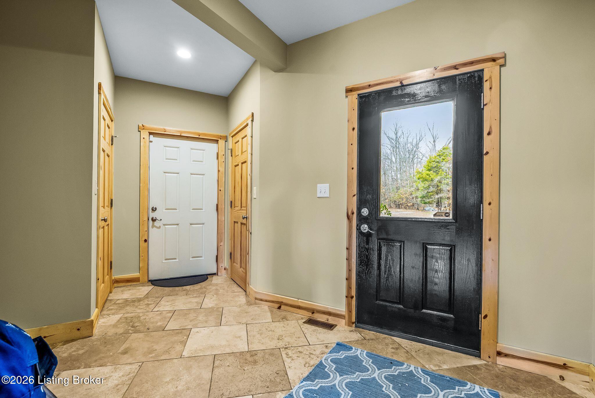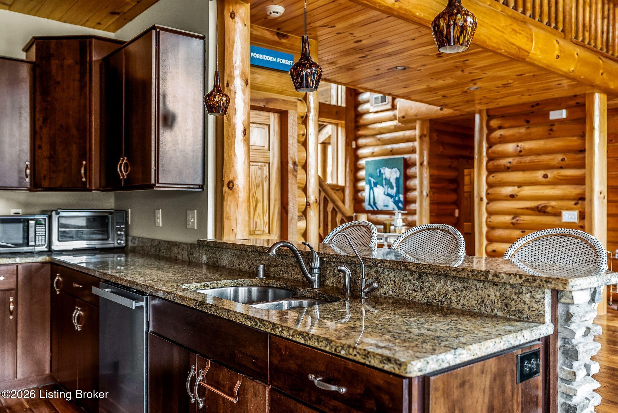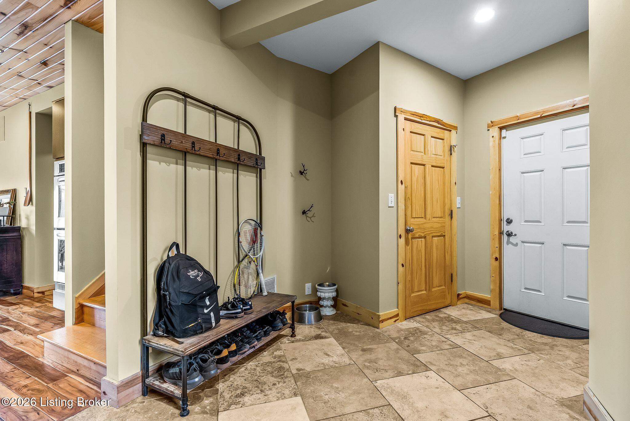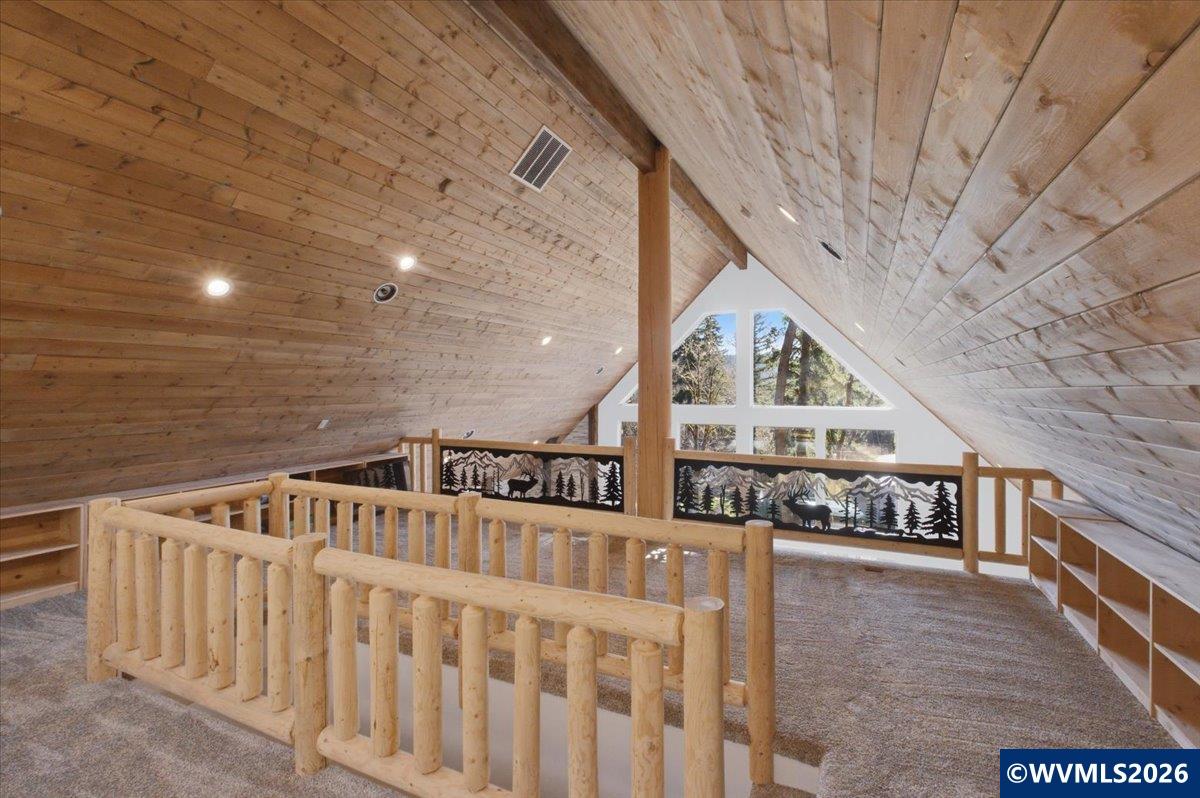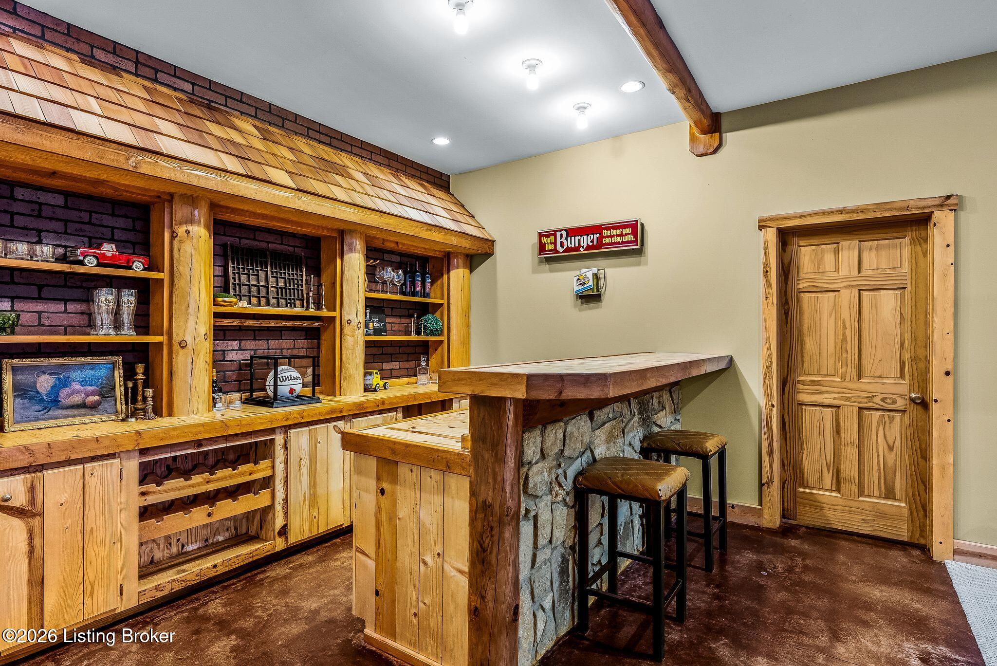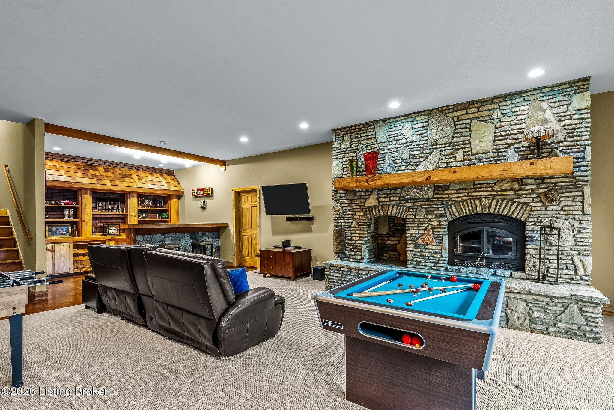 Welcome to 2212 Ballard School Rd in LaGrange, a spectacular custom-built log estate set on 16 private acres with breathtaking views of woods and pasture in every direction. Tucked mile off the main road, this property offers exceptional privacy while still being just minutes from LaGrange shopping, dining, and I-71. Step inside to a breathtaking great room defined by a dramatic 2.5-story vaulted ceiling and an expansive A-frame wall of windows that fills the space with sunlight and captures sweeping views of the peaceful surroundings. Extraordinary, handcrafted stone masonry anchors the room with a beautiful fireplace and continues throughout both the interior and exterior of the home, highlighting the craftsmanship of this one-of-a-kind property. Acacia wood floors run through the entry, great room, kitchen, and primary suite, adding warmth and character. The first-floor primary suite offers a relaxing retreat with a trey ceiling, sitting area, dual walk-in closets, and private deck overlooking the rear property. The spacious bath includes dual vanity, large tub and walk in shower creating a comfortable and functional layout. Designed for everyday living and entertaining, the kitchen opens to the dining and living areas and includes an oversized pantry, mudroom, and convenient laundry access with direct entry to the oversized two-car garage. Built-in speakers enhance both the kitchen and outdoor deck spaces. Off the dining area, a large deck provides the perfect setting for enjoying the surrounding countryside. Upstairs, youll find four generously sized bedrooms, including one with a private balcony overlooking the front of the property and another with an en-suite bath. The upper level also features a loft and an additional full bathroom. The finished walkout lower level offers additional living and entertaining space, featuring a bar area and a beautifully crafted hearth with a wood stove, along with doors that open to the rear patio and outdoor gathering area. An additional 1,600 square feet of unfinished basement provide excellent expansion potential, including two framed and electrically wired rooms ready to be finished and plumbing already installed for a future basement bathroom. Outdoor living is equally impressive with five patios and decks, including the private primary suite balcony. The property also features an outdoor firepit, stone pizza oven, outdoor grilling area, deer stands, dog kennels, and even an ATV included with the property, making the acreage a true outdoor playground. Recent improvements include newly stripped and resealed logs along the rear of the home and rebuilt balcony railings. The home is also equipped with dual geothermal heat pump systems and a whole-house Culligan water filtration system with separate drinking water filtration including a new water heater (2025). With 16 acres of rolling land, partial woods, expansive views, and unmatched privacy, this extraordinary property offers the perfect blend of rustic elegance, modern efficiency, and convenient location. A rare opportunity to own this one-of-a-kind property that offers privacy, character, and incredible craftsmanship while still being conveniently located near LaGrange amenities.