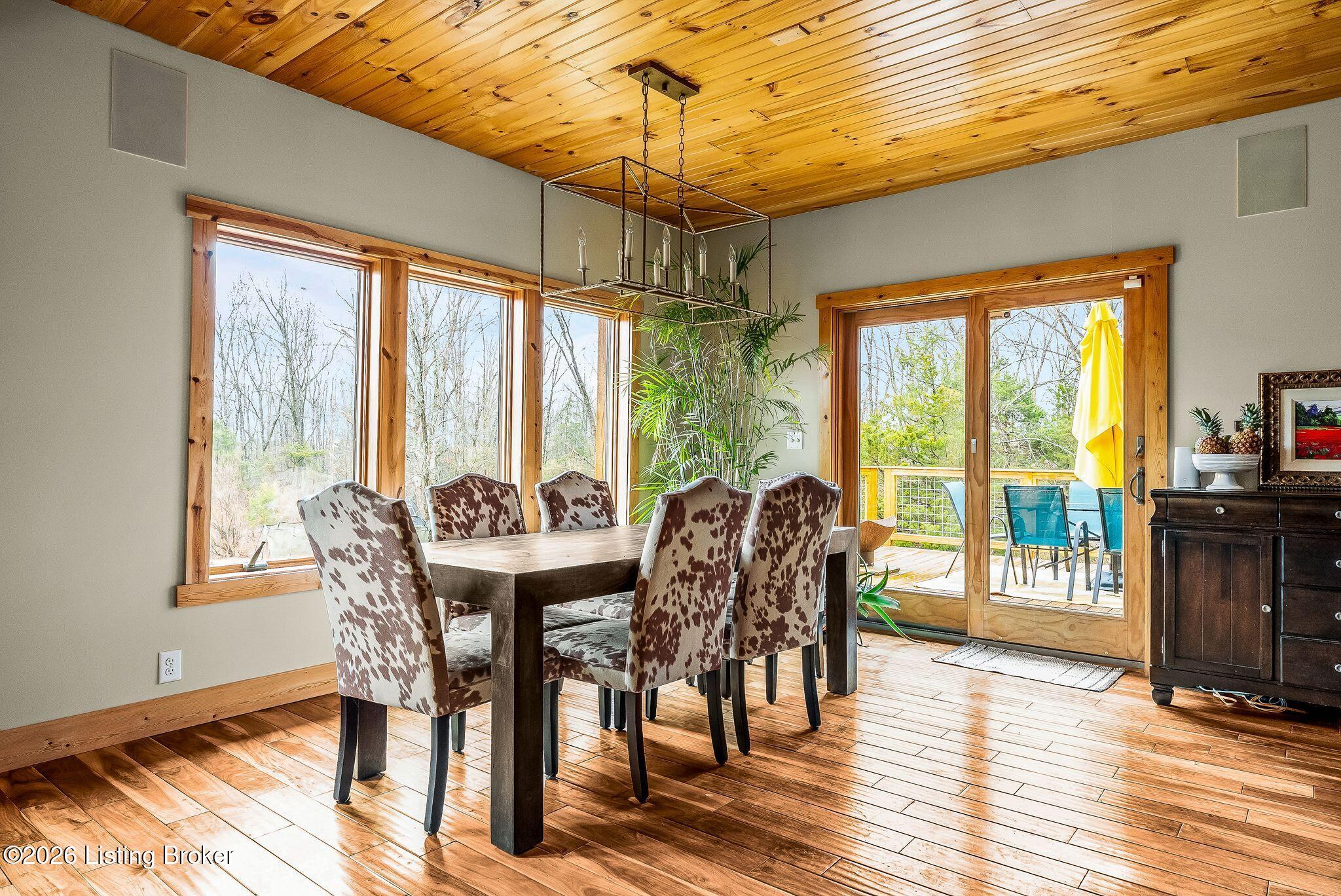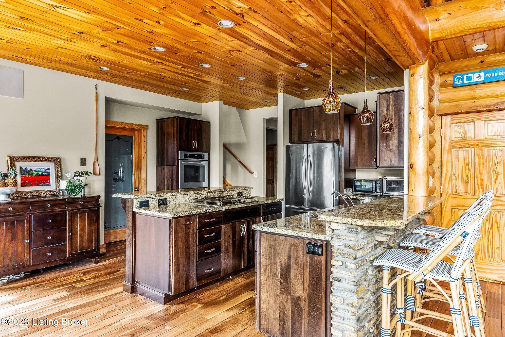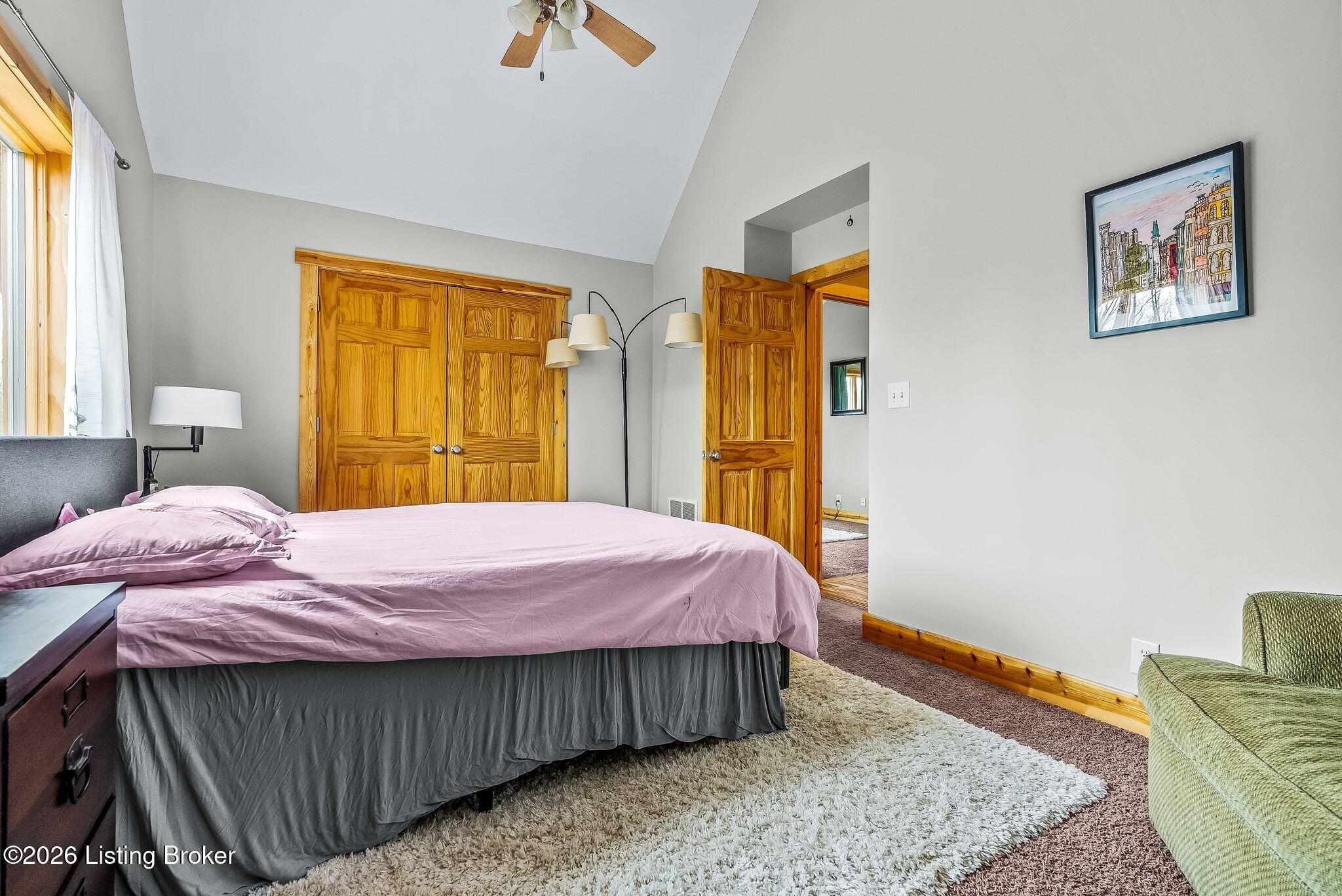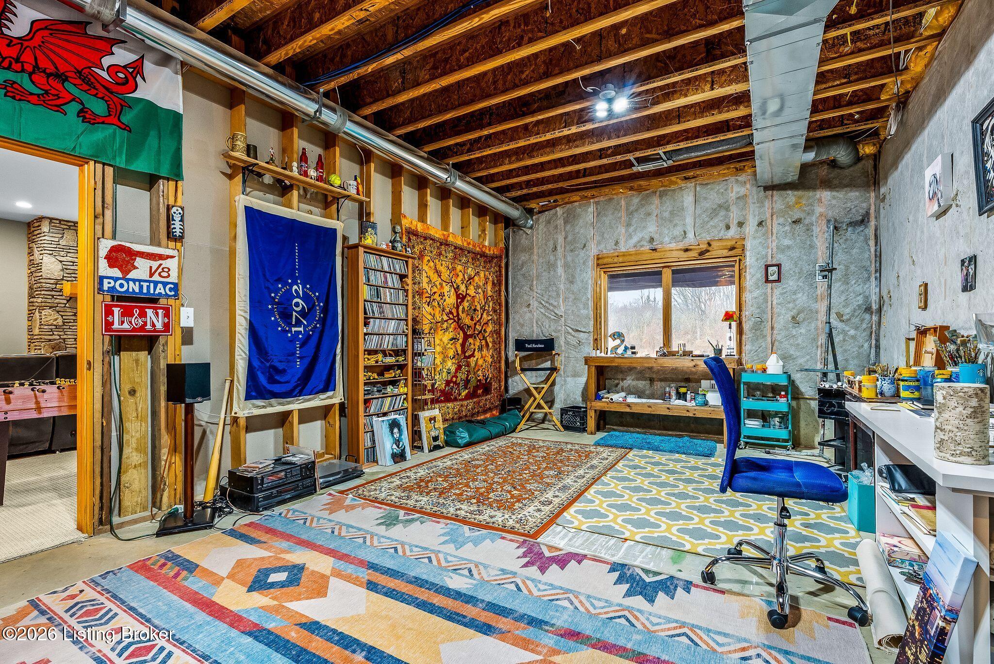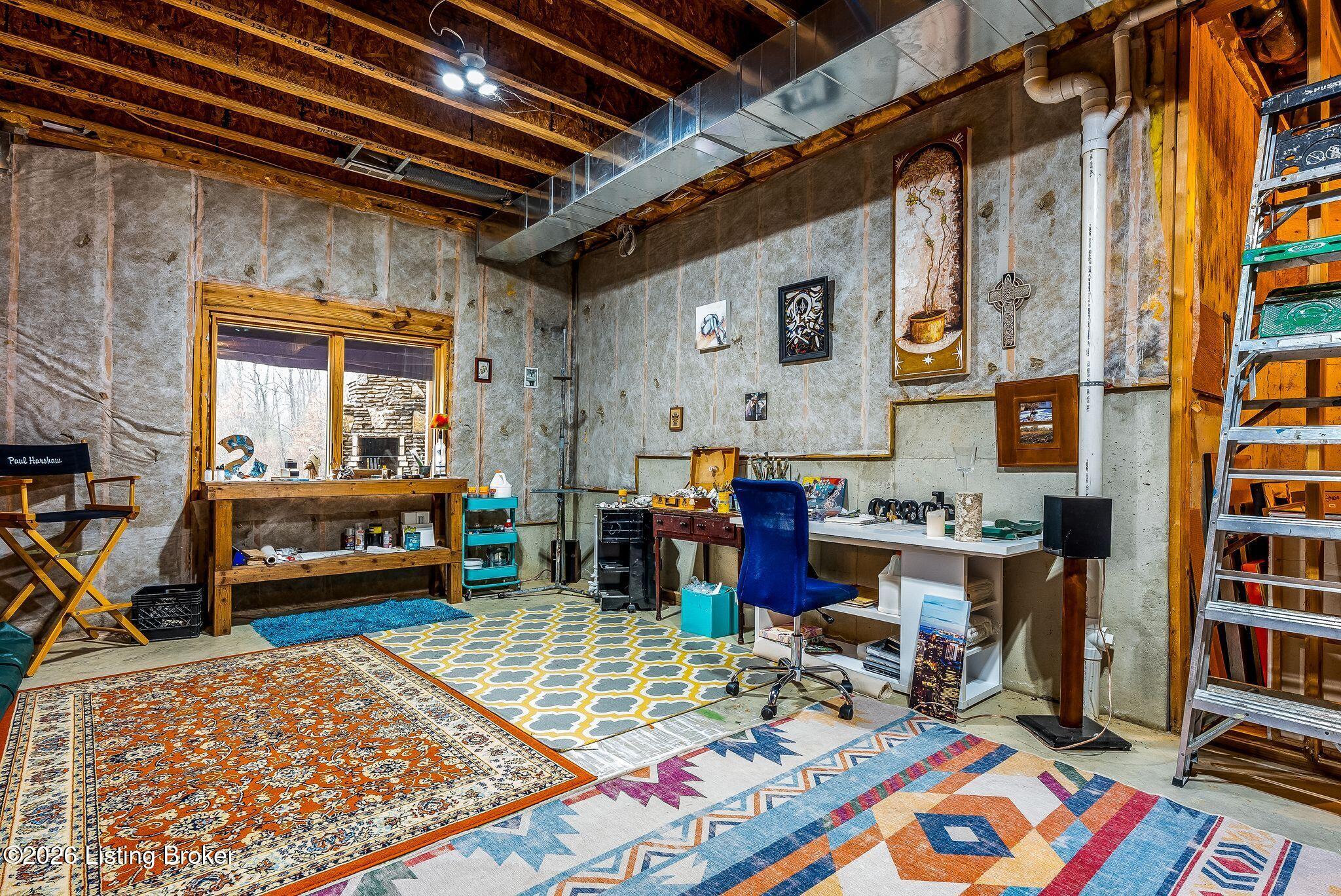 Welcome to 2212 Ballard School Rd in LaGrange, a spectacular custom-built log estate set on 16 private acres with breathtaking views of woods and pasture in every direction. Tucked mile off the main road, this property offers exceptional privacy while still being just minutes from LaGrange shopping, dining, and I-71. Step inside to a breathtaking great room defined by a dramatic 2.5-story vaulted ceiling and an expansive A-frame wall of windows that fills the space with sunlight and captures sweeping views of the peaceful surroundings. Extraordinary, handcrafted stone masonry anchors the room with a beautiful fireplace and continues throughout both the interior and exterior of the home, highlighting the craftsmanship of this one-of-a-kind property. Acacia wood floors run through the entry, great room, kitchen, and primary suite, adding warmth and character. The first-floor primary suite offers a relaxing retreat with a trey ceiling, sitting area, dual walk-in closets, and private deck overlooking the rear property. The spacious bath includes dual vanity, large tub and walk in shower creating a comfortable and functional layout. Designed for everyday living and entertaining, the kitchen opens to the dining and living areas and includes an oversized pantry, mudroom, and convenient laundry access with direct entry to the oversized two-car garage. Built-in speakers enhance both the kitchen and outdoor deck spaces. Off the dining area, a large deck provides the perfect setting for enjoying the surrounding countryside. Upstairs, youll find four generously sized bedrooms, including one with a private balcony overlooking the front of the property and another with an en-suite bath. The upper level also features a loft and an additional full bathroom. The finished walkout lower level offers additional living and entertaining space, featuring a bar area and a beautifully crafted hearth with a wood stove, along with doors that open to the rear patio and outdoor gathering area. An additional 1,600 square feet of unfinished basement provide excellent expansion potential, including two framed and electrically wired rooms ready to be finished and plumbing already installed for a future basement bathroom. Outdoor living is equally impressive with five patios and decks, including the private primary suite balcony. The property also features an outdoor firepit, stone pizza oven, outdoor grilling area, deer stands, dog kennels, and even an ATV included with the property, making the acreage a true outdoor playground. Recent improvements include newly stripped and resealed logs along the rear of the home and rebuilt balcony railings. The home is also equipped with dual geothermal heat pump systems and a whole-house Culligan water filtration system with separate drinking water filtration including a new water heater (2025). With 16 acres of rolling land, partial woods, expansive views, and unmatched privacy, this extraordinary property offers the perfect blend of rustic elegance, modern efficiency, and convenient location. A rare opportunity to own this one-of-a-kind property that offers privacy, character, and incredible craftsmanship while still being conveniently located near LaGrange amenities.