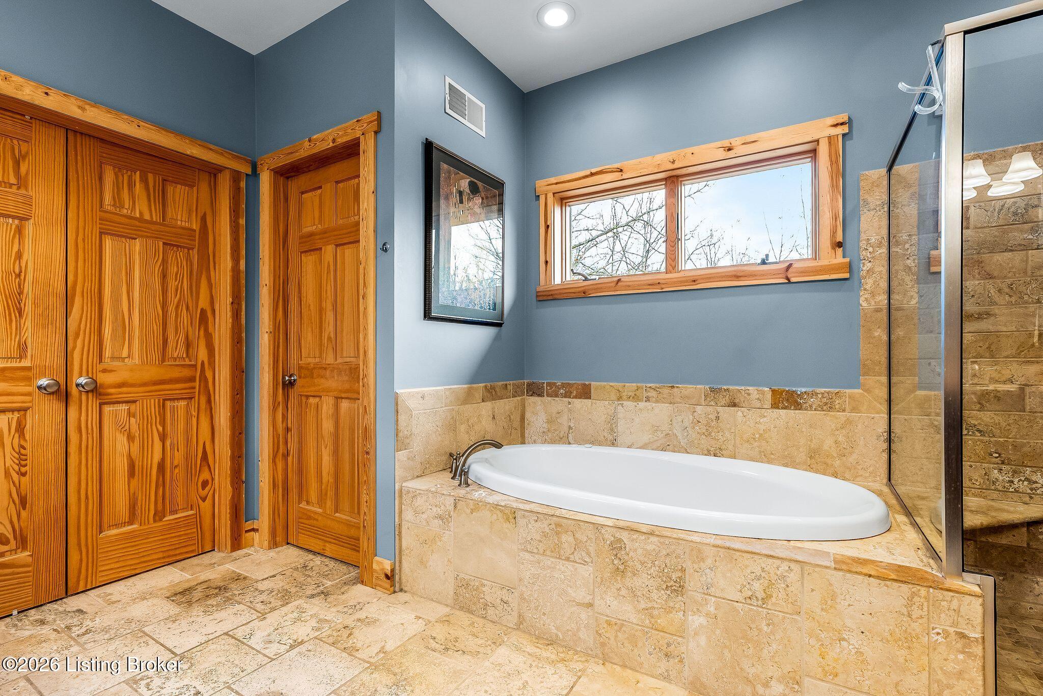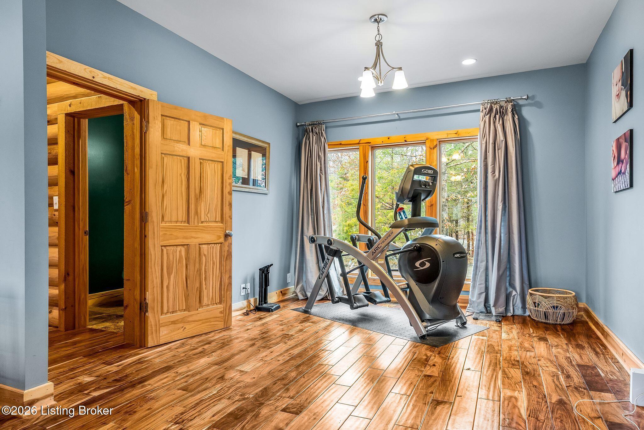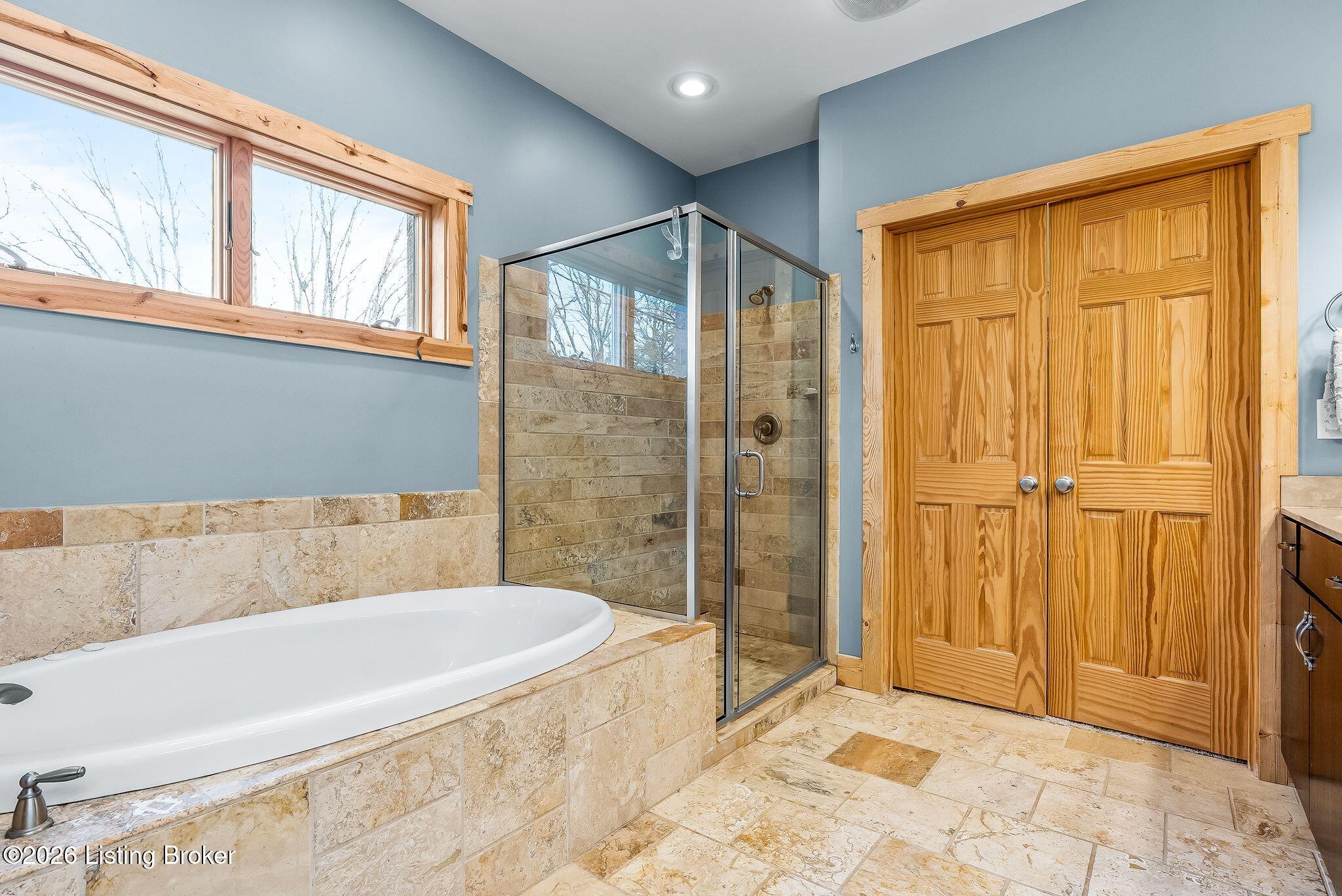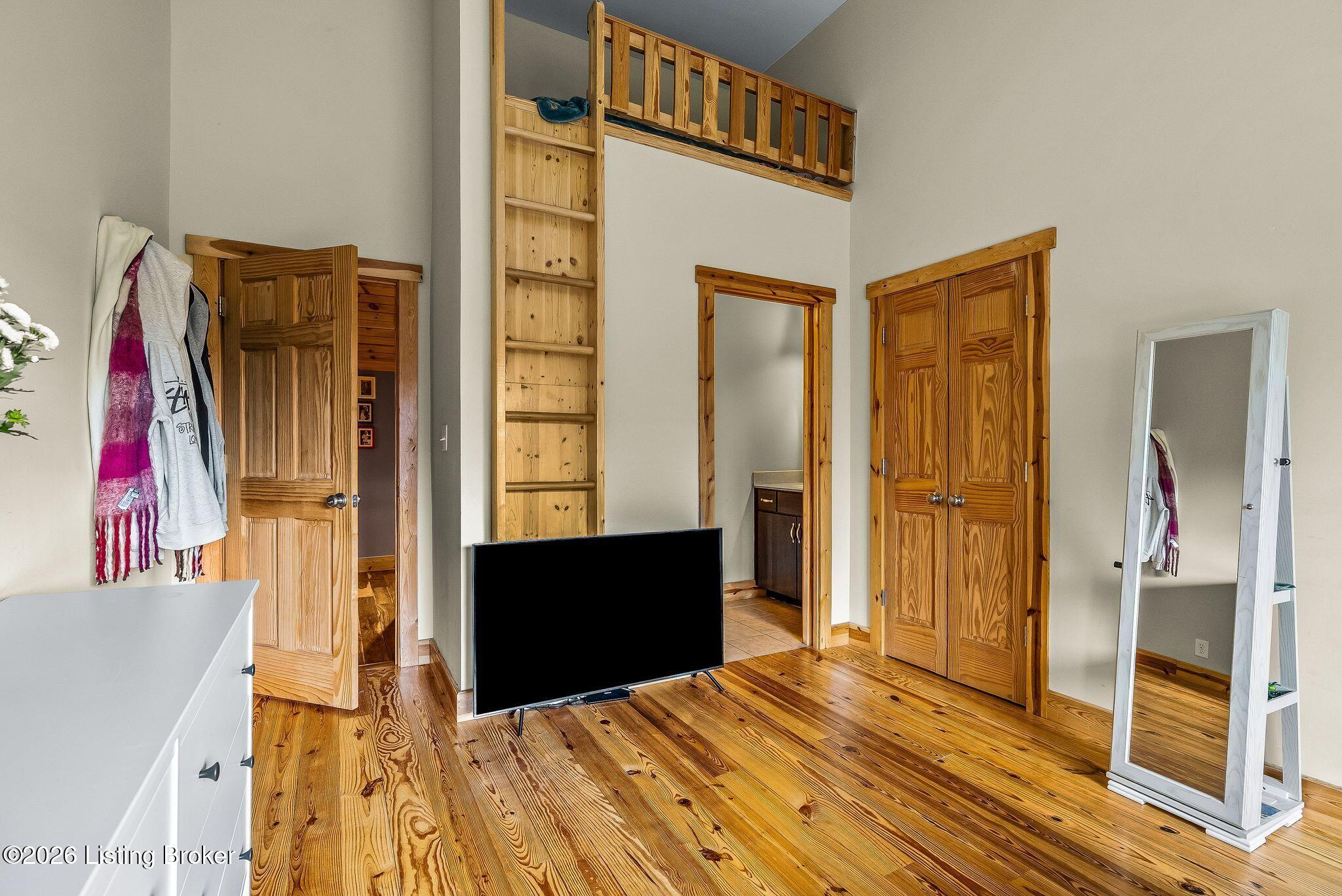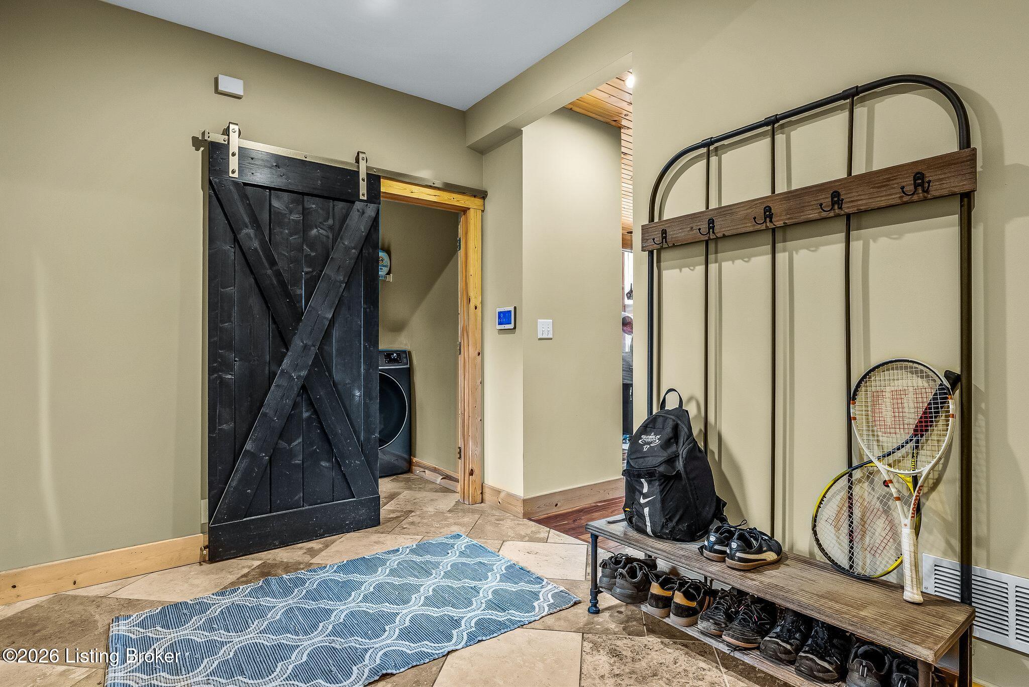 Welcome to 2212 Ballard School Rd in LaGrange, a spectacular custom-built log estate set on 16 private acres with breathtaking views of woods and pasture in every direction. Tucked mile off the main road, this property offers exceptional privacy while still being just minutes from LaGrange shopping, dining, and I-71. Step inside to a breathtaking great room defined by a dramatic 2.5-story vaulted ceiling and an expansive A-frame wall of windows that fills the space with sunlight and captures sweeping views of the peaceful surroundings. Extraordinary, handcrafted stone masonry anchors the room with a beautiful fireplace and continues throughout both the interior and exterior of the home, highlighting the craftsmanship of this one-of-a-kind property. Acacia wood floors run through the entry, great room, kitchen, and primary suite, adding warmth and character. The first-floor primary suite offers a relaxing retreat with a trey ceiling, sitting area, dual walk-in closets, and private deck overlooking the rear property. The spacious bath includes dual vanity, large tub and walk in shower creating a comfortable and functional layout. Designed for everyday living and entertaining, the kitchen opens to the dining and living areas and includes an oversized pantry, mudroom, and convenient laundry access with direct entry to the oversized two-car garage. Built-in speakers enhance both the kitchen and outdoor deck spaces. Off the dining area, a large deck provides the perfect setting for enjoying the surrounding countryside. Upstairs, youll find four generously sized bedrooms, including one with a private balcony overlooking the front of the property and another with an en-suite bath. The upper level also features a loft and an additional full bathroom. The finished walkout lower level offers additional living and entertaining space, featuring a bar area and a beautifully crafted hearth with a wood stove, along with doors that open to the rear patio and outdoor gathering area. An additional 1,600 square feet of unfinished basement provide excellent expansion potential, including two framed and electrically wired rooms ready to be finished and plumbing already installed for a future basement bathroom. Outdoor living is equally impressive with five patios and decks, including the private primary suite balcony. The property also features an outdoor firepit, stone pizza oven, outdoor grilling area, deer stands, dog kennels, and even an ATV included with the property, making the acreage a true outdoor playground. Recent improvements include newly stripped and resealed logs along the rear of the home and rebuilt balcony railings. The home is also equipped with dual geothermal heat pump systems and a whole-house Culligan water filtration system with separate drinking water filtration including a new water heater (2025). With 16 acres of rolling land, partial woods, expansive views, and unmatched privacy, this extraordinary property offers the perfect blend of rustic elegance, modern efficiency, and convenient location. A rare opportunity to own this one-of-a-kind property that offers privacy, character, and incredible craftsmanship while still being conveniently located near LaGrange amenities.