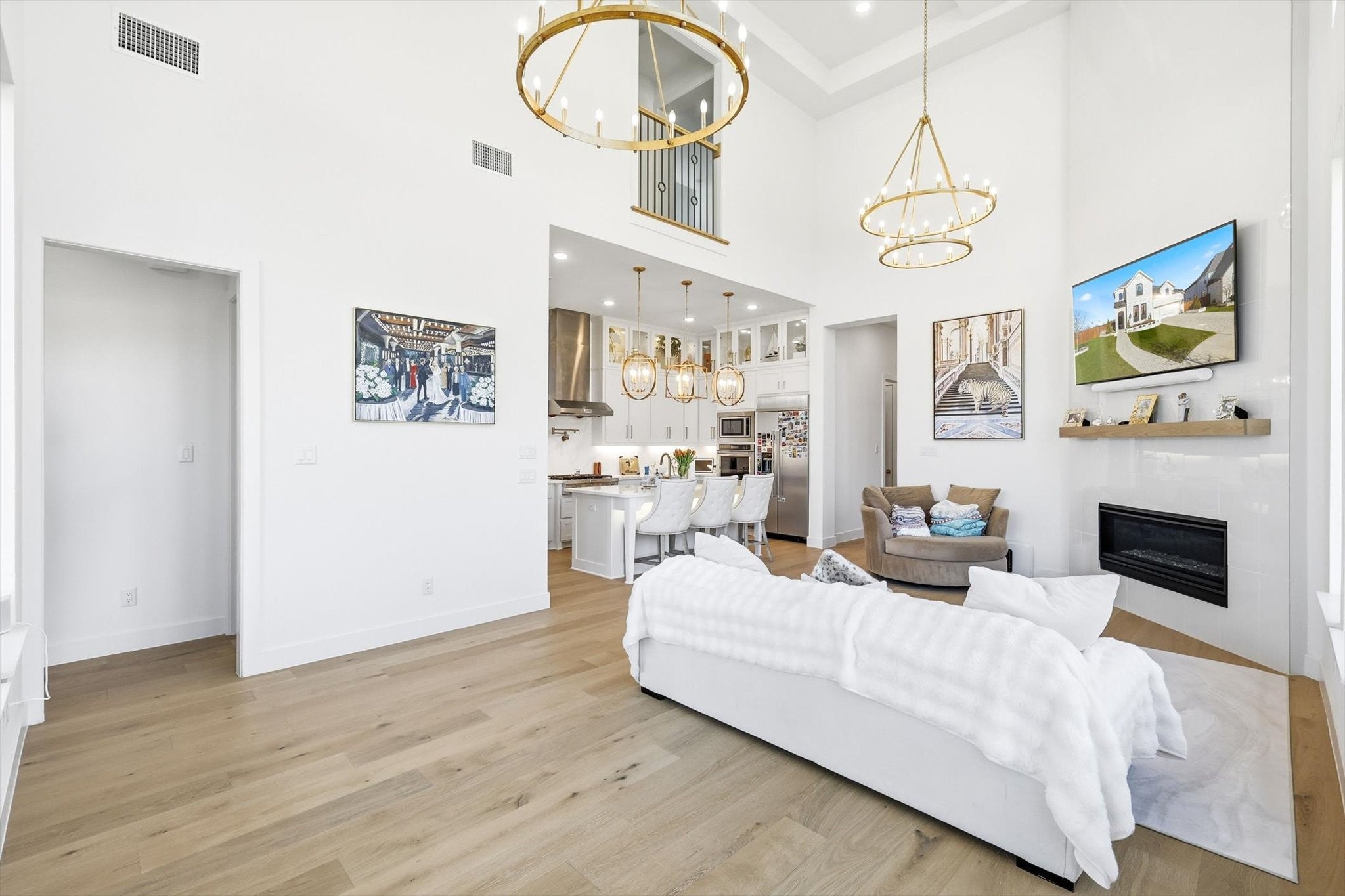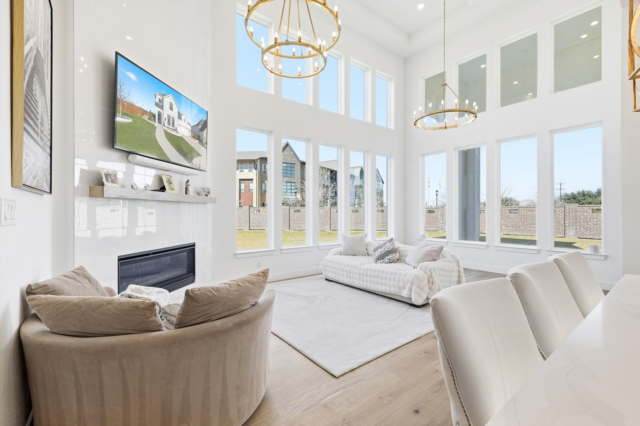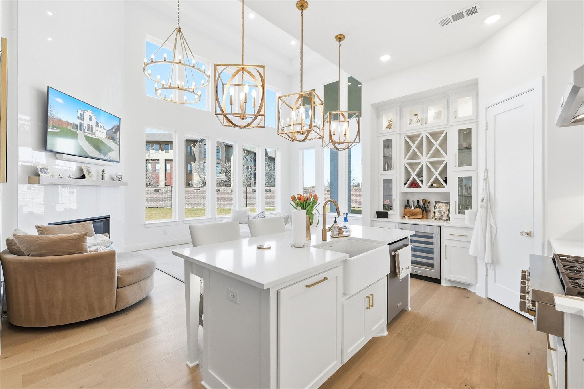 Step into luxury in this breathtaking three-level masterpiece, located in a quiet cul-de-sac, where a grand two-story foyer, framed by soaring ceilings, dramatic windows, and a statement chandelier, sets the tone for the elegance that unfolds throughout. Sunlight cascades through expansive windows, illuminating every corner of the home, from the living room, anchored by a beautiful fireplace, to the stunning chefs kitchen with its 8-burner gas range, under-cabinet lighting, butlers pantry, and charming architectural arch. Up the wide staircase, the primary suite awaits a massive, light-drenched retreat with a serene spa-inspired ensuite and a custom walk-in closet. The upper level also features a beautiful Jack and Jill bathroom, thoughtfully designed to connect bedrooms with both style and convenience. Additional spaces include a dedicated exercise room and a luxurious hot tub, offering wellness and relaxation at home. Designer light fixtures, dimmable lighting, and Apple smart home integration add sophistication and modern ease. With quick access to 35W and proximity to premier shopping, this home blends luxury, comfort, and convenience effortlessly. A sanctuary of light, space, and refined living crafted for the life youve always imagined.