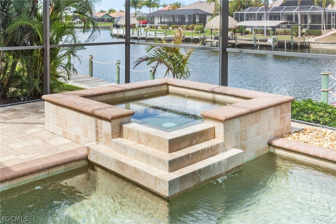 Located in a highly sought after Gulf Access area for boaters in SW Cape Coral, this Frei & Sons built 4-bedroom, 3-bathroom pool home combines a sense of elegance with relaxing everyday comfort. Situated on the 150-foot-wide Julep Canal, it is approximately a 30-minute boat ride from your backyard to the docks at Rumrunners, and only about 3-1/2 miles from there to the open waters of the Gulf of America off of Sanibel. This home features a large dock with a 10,000 pound covered boatlift for single or cat hulls, a jet ski lift, Tiki Hut, and an impressive paver dockside deck with a wide paver ramp providing easy accessibility going to and from the screened pool and lanai to the dock, making it a perfect spot for canal side entertaining and watching sunsets. The heated pool and spa combine with a large pool deck and lanai featuring an outdoor kitchen, an outdoor shower, plus access to a pool bath. This home is designed for outdoor living, entertaining, and a boating lifestyle.Moving back inside of this spacious 2,348 square foot split floor plan home, there is tile flooring throughout the main living area and tall Low E PGT hurricane impact sliders and windows, which combine with the high ceilings for a bright and open feeling. The kitchen features granite countertops, 42 inch tall wood cabinets, a pantry closet, stainless steel appliances, and a breakfast bar. There is also an informal dining nook providing relaxing views of the pool and canal through a large mitered window and a separate formal dining room with a high ceiling off of the kitchen. The master bedroom has engineered wood flooring and impact slider doors with access to the lanai and pool area, along with a large master bathroom featuring two separate vanities with granite tops, a glass enclosed walk-in shower, a garden-style soaking tub, and a private water closet. The three large guest bedrooms, all with engineered wood flooring, offer privacy on the other side of this home. One of the guest bathrooms serves as a pool bath with a walk-in shower, while the other guest bathroom features a combination tub/shower, with granite countertop vanities in both guest bathrooms. The laundry room has a full sized washer, dryer, and a sink, and it leads out to an oversized three car garage with epoxy floors, a WiFi-operated garage door opener, and a generator plug. This home is move-in ready with a new roof and new AC, both installed in 2023. This low-traffic, quiet neighborhood is ideal for walkers, joggers, and bike riders. Publix at Camelot Isles, Walgreens, a variety of restaurants, banks, and medical offices are just minutes away. Shops and waterfront dining at Cape Harbour are within walking and biking distance, with Tarpon Point Marina restaurants and the Rotary Dog Park nearby. This home has had no flooding or water intrusion from past hurricanes.
