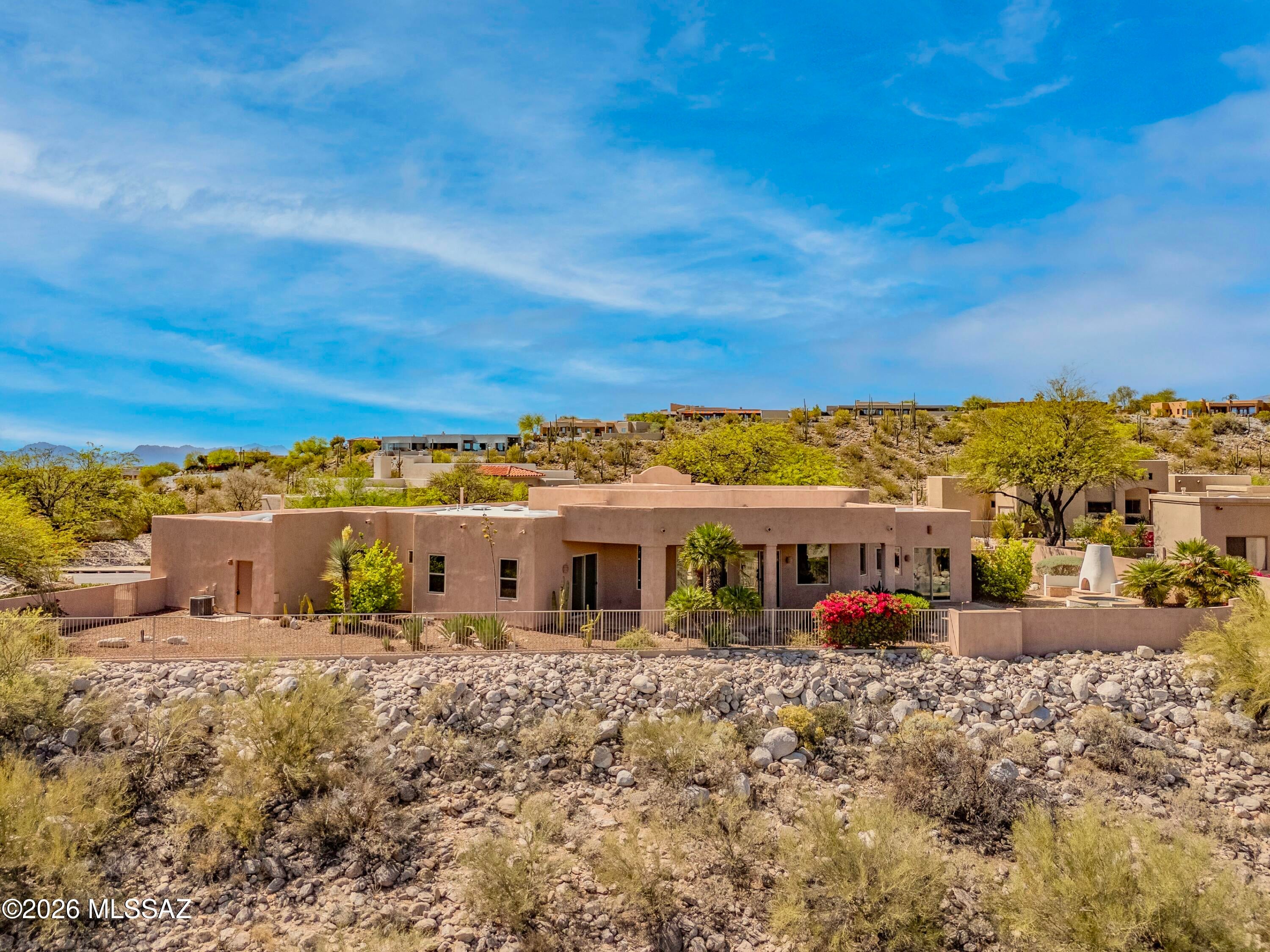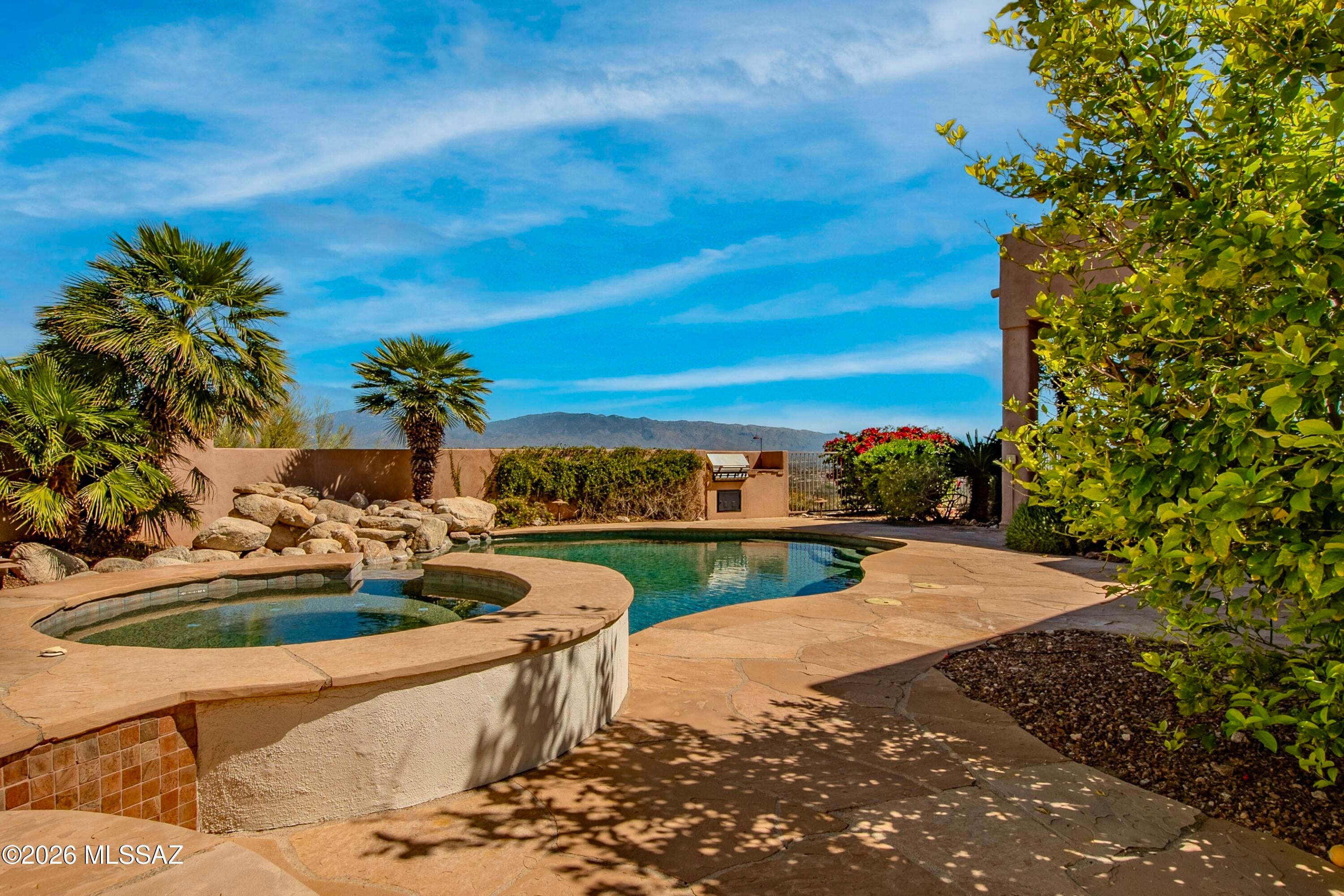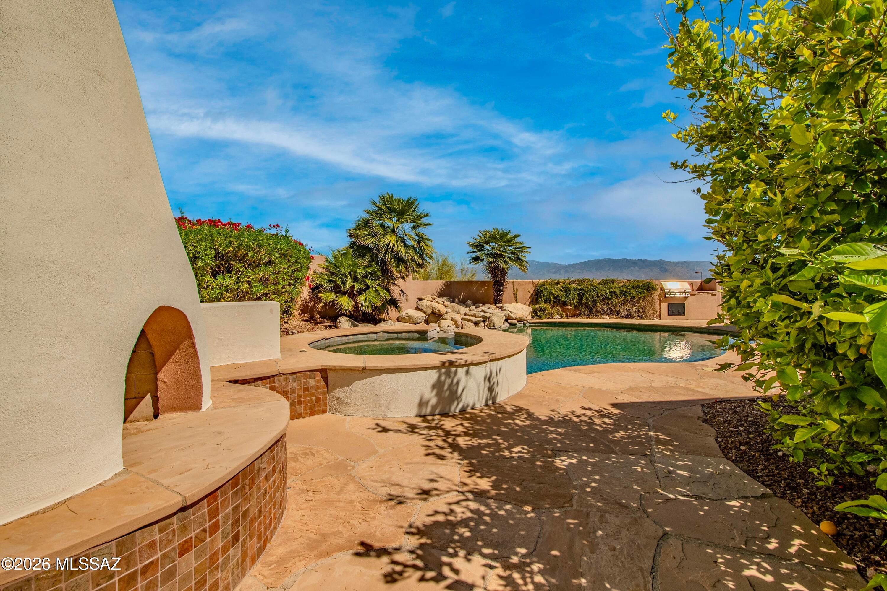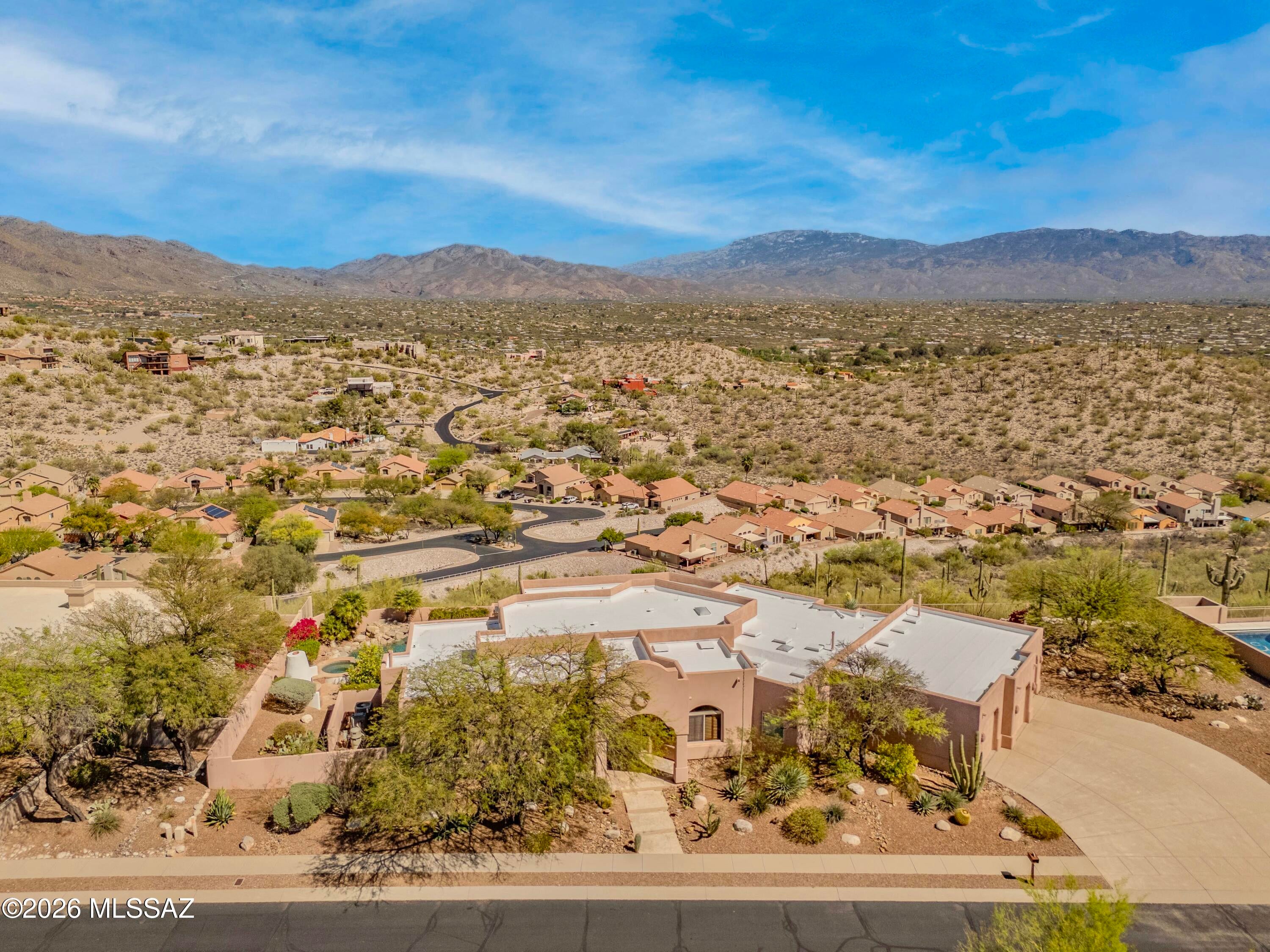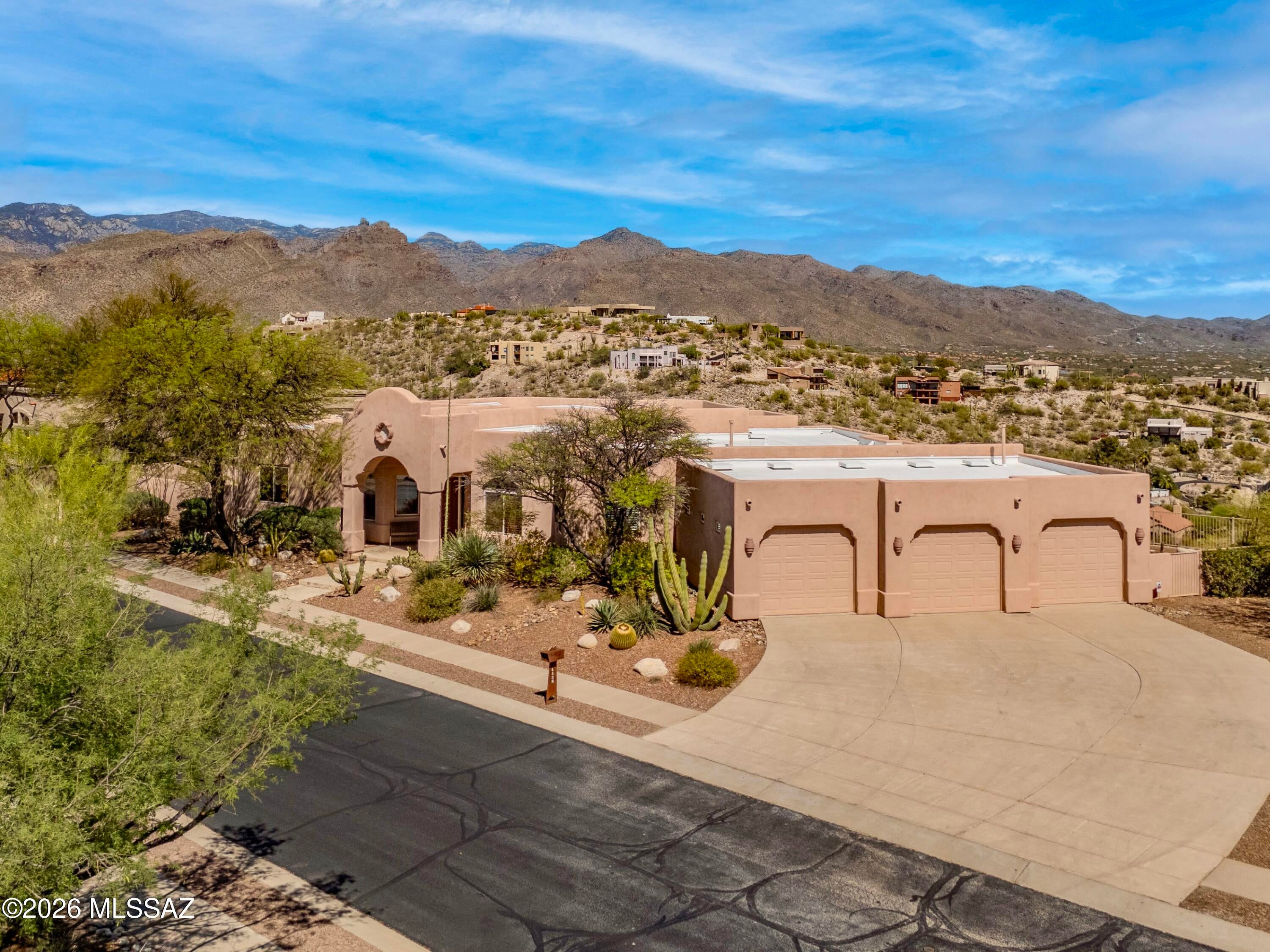 Elevated on a premier ridge-top homesite, this exceptional residence in Sabino Mountain offers a rare combination of privacy, architectural integrity, and truly breathtaking, unobstructed panoramic mountain views. Set on 1.14 acres within one of Tucsons most coveted gated enclaves, distinguished by its dramatic setting and rare neighborhood sidewalks.Built in 2001 and thoughtfully positioned to capture the surrounding beauty, the home embodies timeless contemporary design with a seamless, easy-living single-level layout. From the moment you enter, the foyer frames sweeping views through the expansive great room, where soaring ceilings, gallery walls, and artful niches are filled with natural light. The ideal split-bedroom floor plan ensures both comfort and privacy, complemented by solid wood paneled doors, expansive tile flooring, and architectural details throughout.Designed for everyday living and effortless entertaining alike, the kitchen is a standout centerpiece. Anchored by a central island and surrounded by expansive granite surfaces, it features custom cabinetry with pull-outs, display shelving, and integrated lighting. High-end appliances include a Jenn-Air commercial gas range with hood and heat lamps, double-wall ovens, and an Advantium microwave. A beverage bar with a built-in chiller enhances entertaining, while both casual and formal dining spaces, complete with a coffered ceiling and a built-in buffet, offer versatility.The desirable east-facing backyard invites year-round enjoyment with a large covered patio, flagstone hardscape, and a Pebble Tec pool and spa with a spillway water feature. A charming kiva fireplace anchors a separate niche patio, creating an intimate space. Mature, lush desert landscaping, enhanced by a new drip system (2025), surrounds the fully fenced yard, offering both beauty and ease of care.The owners suite is a peaceful retreat, opening directly to the patio and featuring a 5-piece bath with a garden tub, walk-in shower, and a customized closet system. Spacious secondary bedrooms provide flexibility, including one with private access to a hall bath. A well-appointed den, complete with a stately library cabinet and patio access, offers the option of a 4th bedroom, a recreational space, or an office.Additional highlights include an inviting covered entry, a gently sloped, extended driveway, a spacious three-car garage with 8-foot door headers, and a large, light-filled laundry room with workspace, storage, and a built-in desk, perfect for hobbies or organization.Ideally located near Sabino Canyon Recreation Area and Ventana Canyon Resort & Country Club, residents enjoy immediate access to world-class hiking, cycling, golf, tennis, and pickleball, as well as premier dining, shopping, and top-rated schools.Lovingly maintained by its long-term owner, the home features a new roof and sealed parapets (2026), along with recent updates to low-E glass and window seals.This is a rare opportunity to own a view property of this caliber in one of Tucsons most sought-after foothills communities.