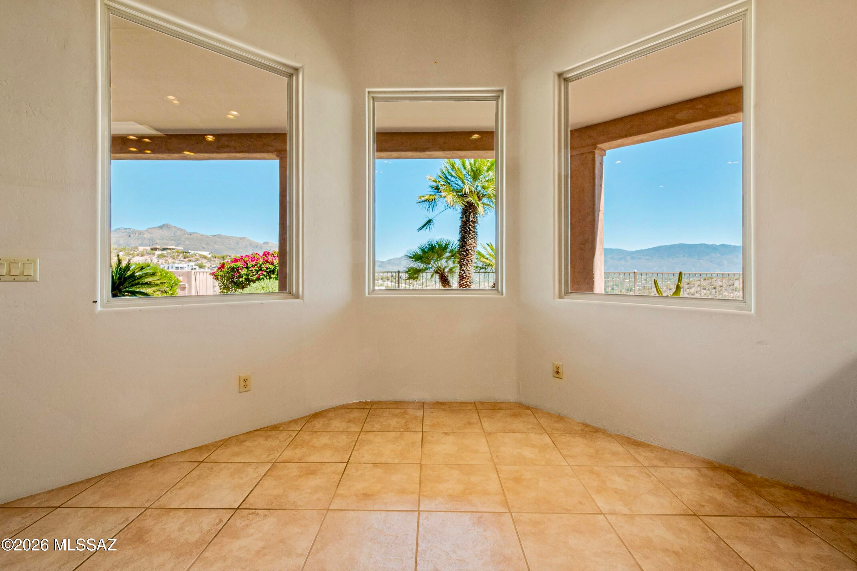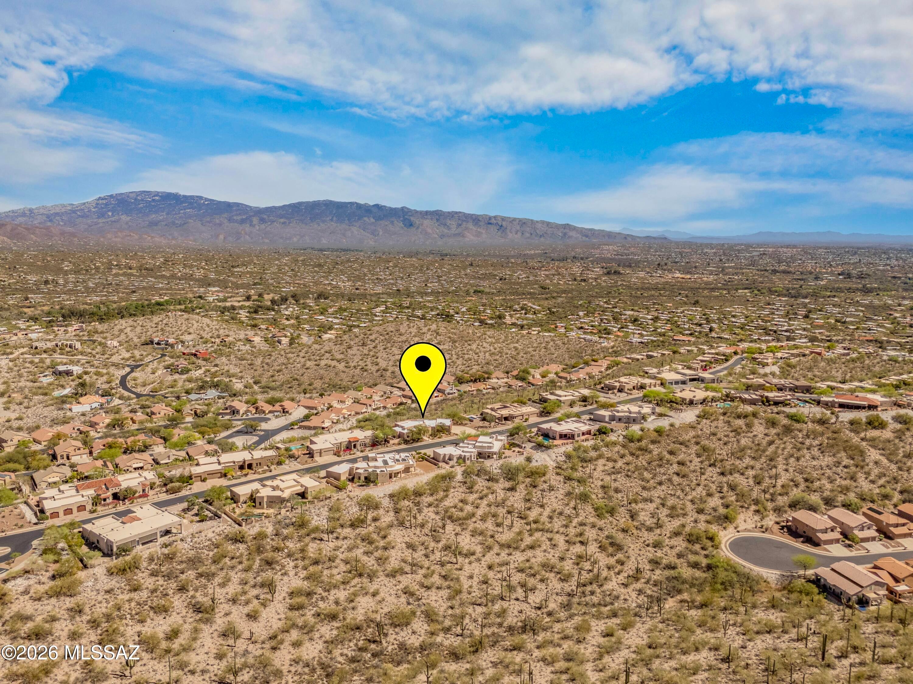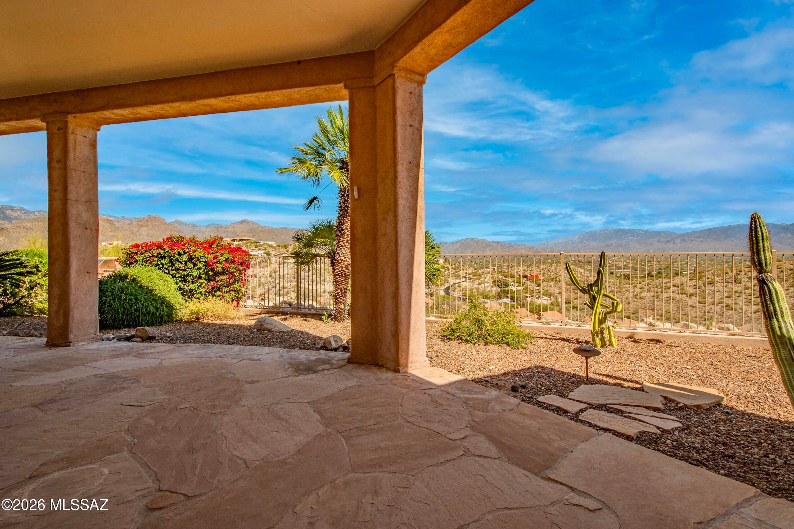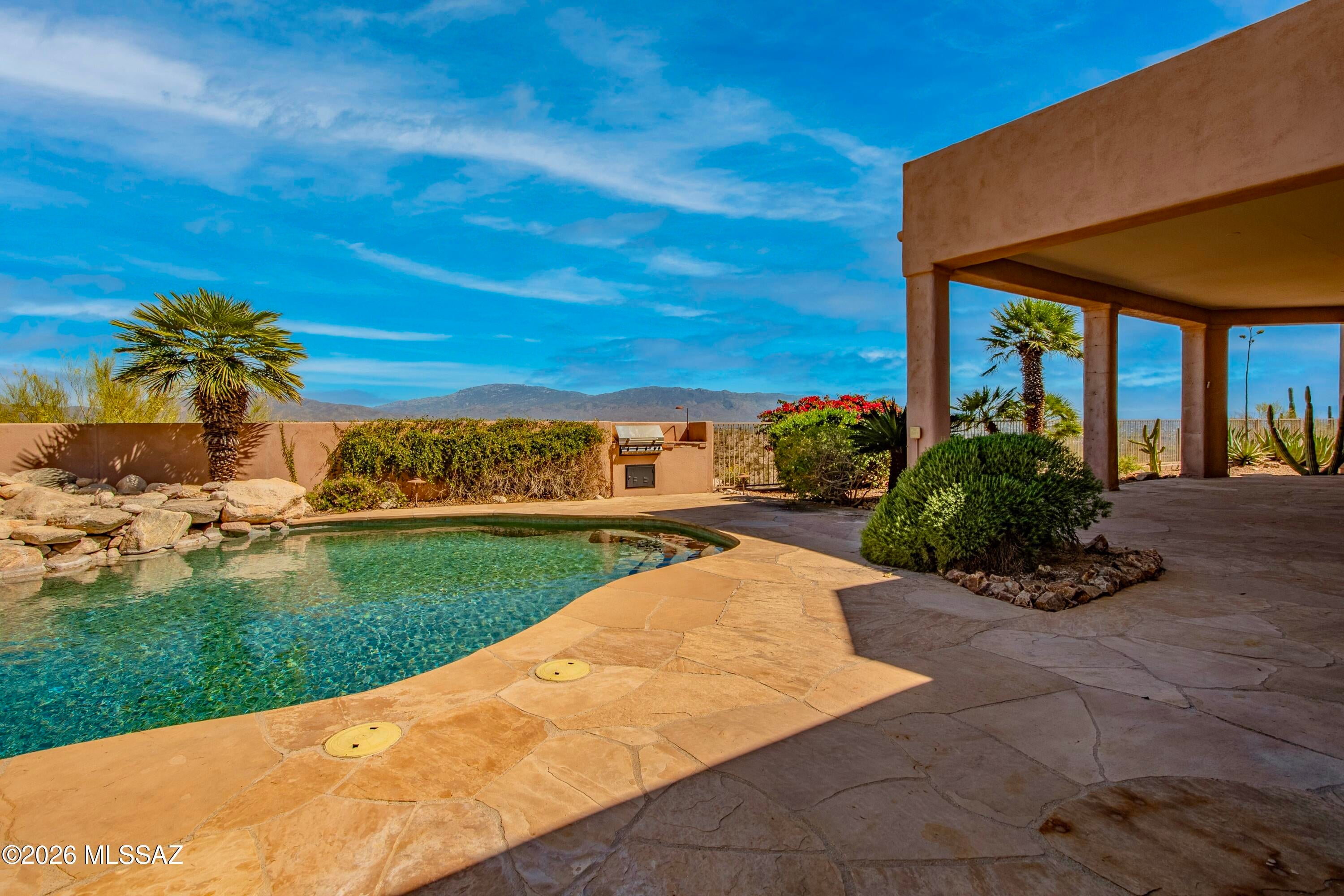 Elevated on a premier ridge-top homesite, this exceptional residence in Sabino Mountain offers a rare combination of privacy, architectural integrity, and truly breathtaking, unobstructed panoramic mountain views. Set on 1.14 acres within one of Tucsons most coveted gated enclaves, distinguished by its dramatic setting and rare neighborhood sidewalks.Built in 2001 and thoughtfully positioned to capture the surrounding beauty, the home embodies timeless contemporary design with a seamless, easy-living single-level layout. From the moment you enter, the foyer frames sweeping views through the expansive great room, where soaring ceilings, gallery walls, and artful niches are filled with natural light. The ideal split-bedroom floor plan ensures both comfort and privacy, complemented by solid wood paneled doors, expansive tile flooring, and architectural details throughout.Designed for everyday living and effortless entertaining alike, the kitchen is a standout centerpiece. Anchored by a central island and surrounded by expansive granite surfaces, it features custom cabinetry with pull-outs, display shelving, and integrated lighting. High-end appliances include a Jenn-Air commercial gas range with hood and heat lamps, double-wall ovens, and an Advantium microwave. A beverage bar with a built-in chiller enhances entertaining, while both casual and formal dining spaces, complete with a coffered ceiling and a built-in buffet, offer versatility.The desirable east-facing backyard invites year-round enjoyment with a large covered patio, flagstone hardscape, and a Pebble Tec pool and spa with a spillway water feature. A charming kiva fireplace anchors a separate niche patio, creating an intimate space. Mature, lush desert landscaping, enhanced by a new drip system (2025), surrounds the fully fenced yard, offering both beauty and ease of care.The owners suite is a peaceful retreat, opening directly to the patio and featuring a 5-piece bath with a garden tub, walk-in shower, and a customized closet system. Spacious secondary bedrooms provide flexibility, including one with private access to a hall bath. A well-appointed den, complete with a stately library cabinet and patio access, offers the option of a 4th bedroom, a recreational space, or an office.Additional highlights include an inviting covered entry, a gently sloped, extended driveway, a spacious three-car garage with 8-foot door headers, and a large, light-filled laundry room with workspace, storage, and a built-in desk, perfect for hobbies or organization.Ideally located near Sabino Canyon Recreation Area and Ventana Canyon Resort & Country Club, residents enjoy immediate access to world-class hiking, cycling, golf, tennis, and pickleball, as well as premier dining, shopping, and top-rated schools.Lovingly maintained by its long-term owner, the home features a new roof and sealed parapets (2026), along with recent updates to low-E glass and window seals.This is a rare opportunity to own a view property of this caliber in one of Tucsons most sought-after foothills communities.