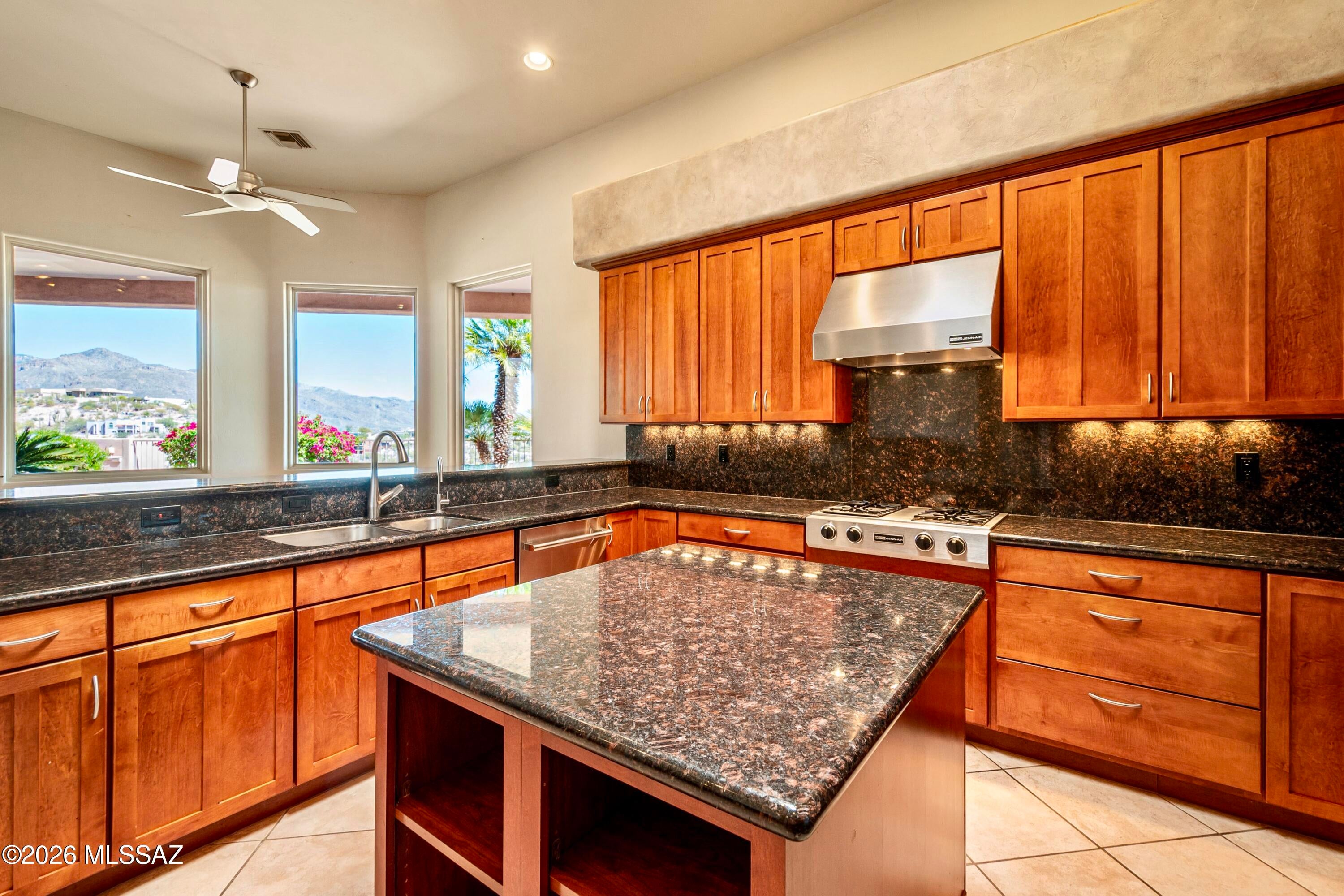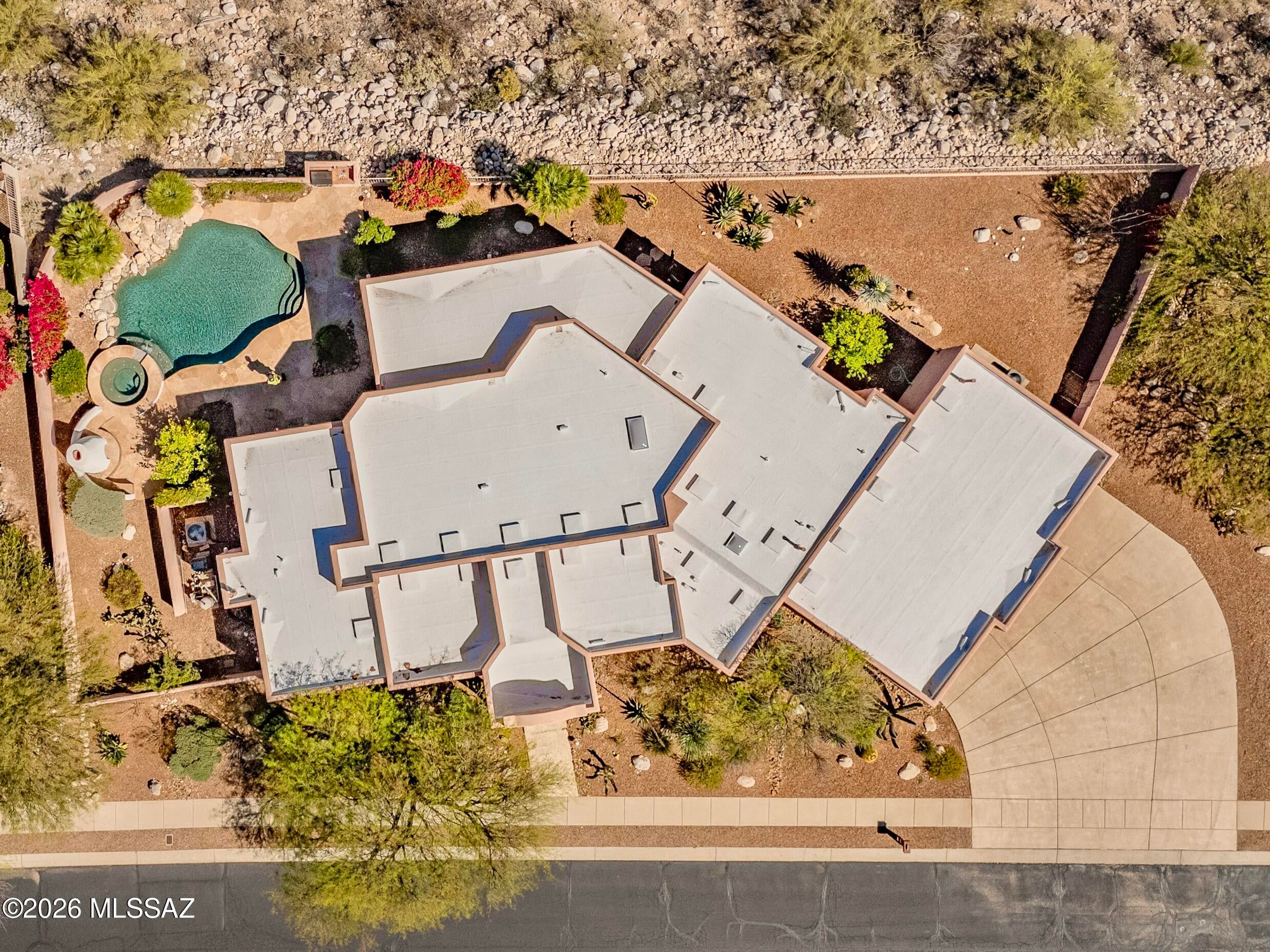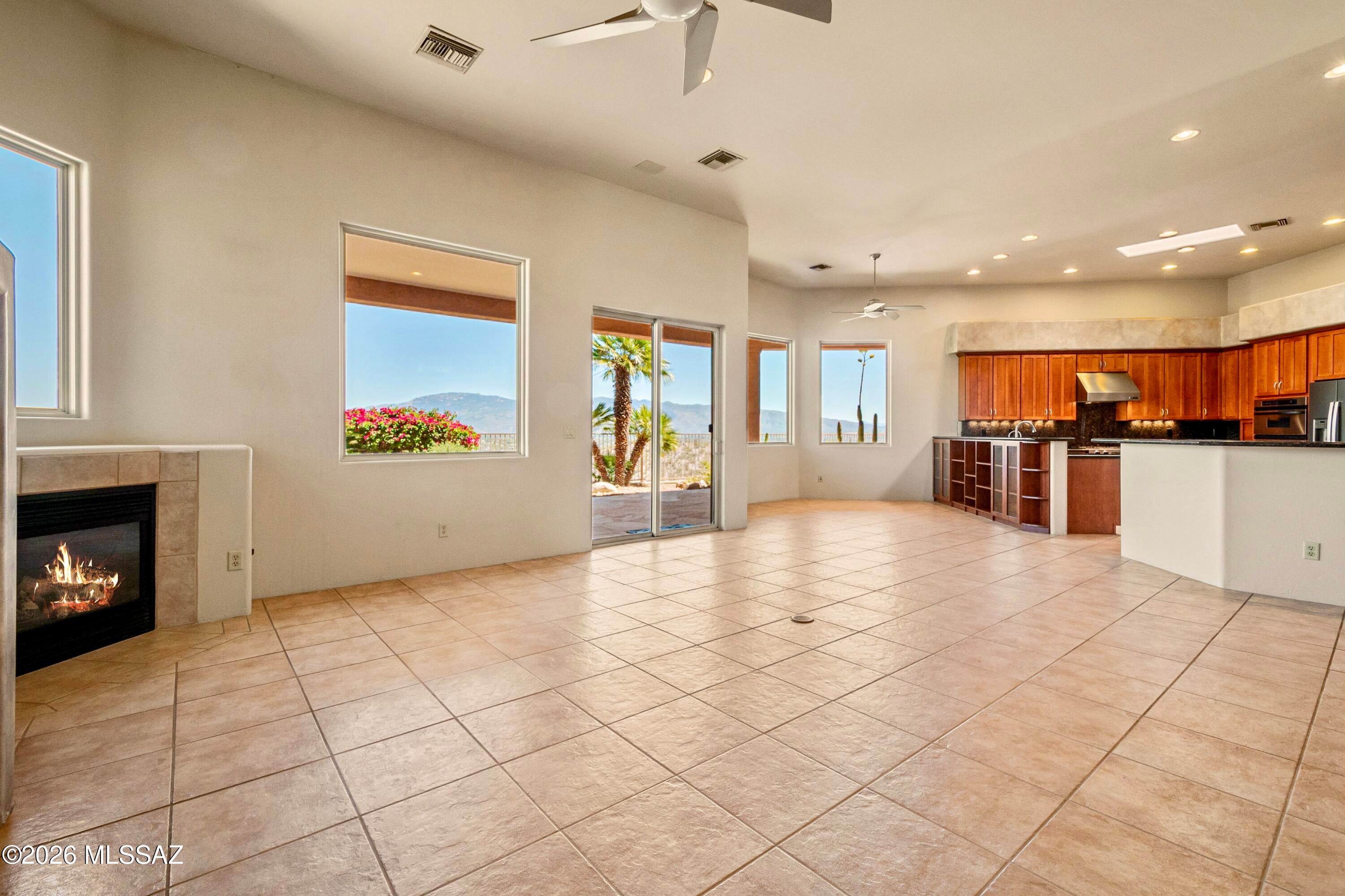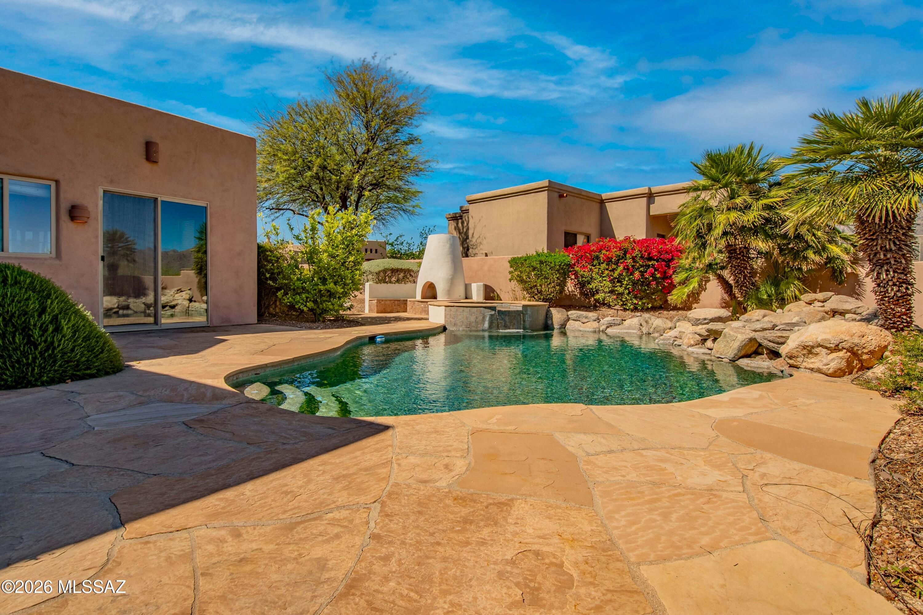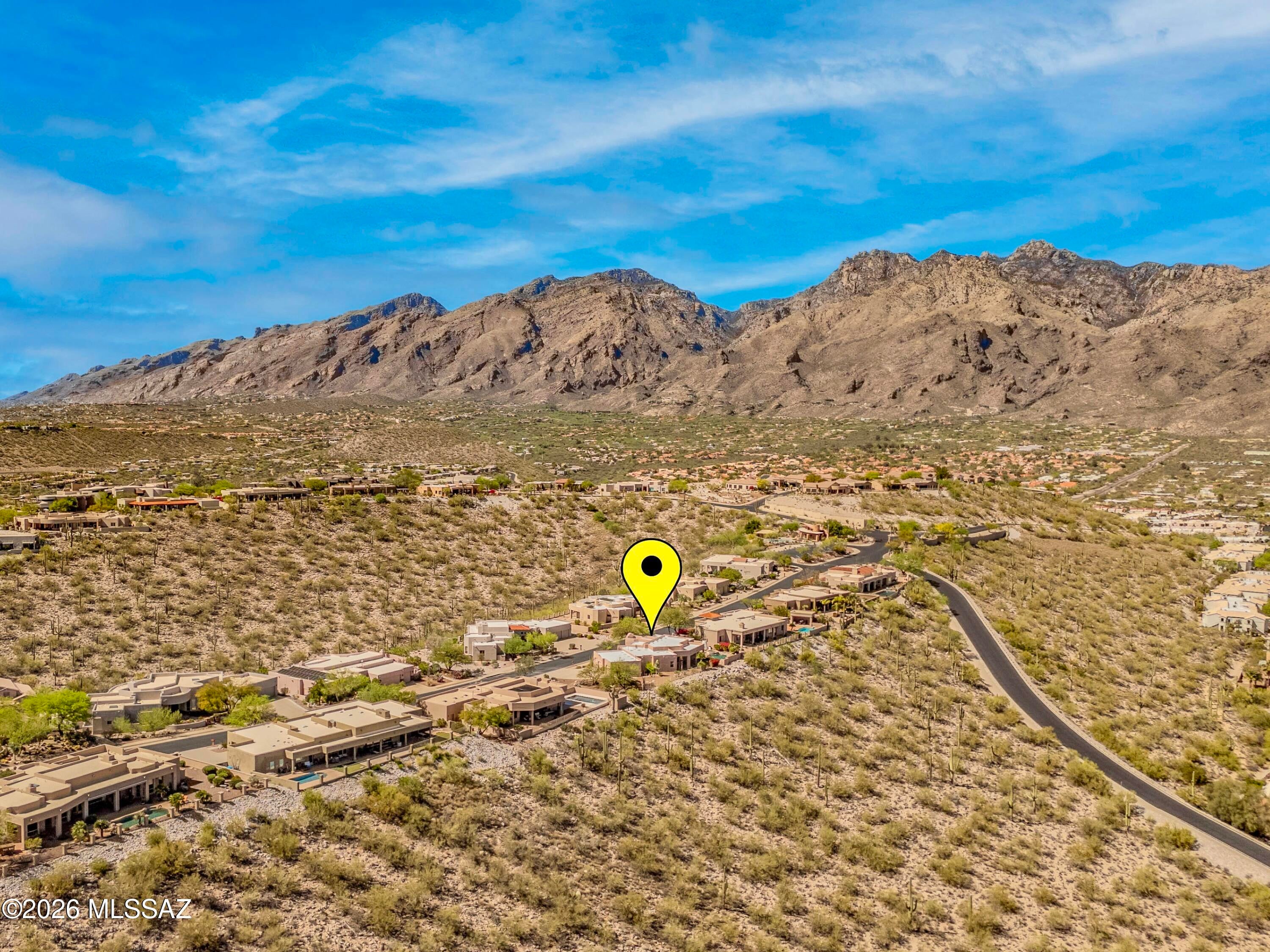 Elevated on a premier ridge-top homesite, this exceptional residence in Sabino Mountain offers a rare combination of privacy, architectural integrity, and truly breathtaking, unobstructed panoramic mountain views. Set on 1.14 acres within one of Tucsons most coveted gated enclaves, distinguished by its dramatic setting and rare neighborhood sidewalks.Built in 2001 and thoughtfully positioned to capture the surrounding beauty, the home embodies timeless contemporary design with a seamless, easy-living single-level layout. From the moment you enter, the foyer frames sweeping views through the expansive great room, where soaring ceilings, gallery walls, and artful niches are filled with natural light. The ideal split-bedroom floor plan ensures both comfort and privacy, complemented by solid wood paneled doors, expansive tile flooring, and architectural details throughout.Designed for everyday living and effortless entertaining alike, the kitchen is a standout centerpiece. Anchored by a central island and surrounded by expansive granite surfaces, it features custom cabinetry with pull-outs, display shelving, and integrated lighting. High-end appliances include a Jenn-Air commercial gas range with hood and heat lamps, double-wall ovens, and an Advantium microwave. A beverage bar with a built-in chiller enhances entertaining, while both casual and formal dining spaces, complete with a coffered ceiling and a built-in buffet, offer versatility.The desirable east-facing backyard invites year-round enjoyment with a large covered patio, flagstone hardscape, and a Pebble Tec pool and spa with a spillway water feature. A charming kiva fireplace anchors a separate niche patio, creating an intimate space. Mature, lush desert landscaping, enhanced by a new drip system (2025), surrounds the fully fenced yard, offering both beauty and ease of care.The owners suite is a peaceful retreat, opening directly to the patio and featuring a 5-piece bath with a garden tub, walk-in shower, and a customized closet system. Spacious secondary bedrooms provide flexibility, including one with private access to a hall bath. A well-appointed den, complete with a stately library cabinet and patio access, offers the option of a 4th bedroom, a recreational space, or an office.Additional highlights include an inviting covered entry, a gently sloped, extended driveway, a spacious three-car garage with 8-foot door headers, and a large, light-filled laundry room with workspace, storage, and a built-in desk, perfect for hobbies or organization.Ideally located near Sabino Canyon Recreation Area and Ventana Canyon Resort & Country Club, residents enjoy immediate access to world-class hiking, cycling, golf, tennis, and pickleball, as well as premier dining, shopping, and top-rated schools.Lovingly maintained by its long-term owner, the home features a new roof and sealed parapets (2026), along with recent updates to low-E glass and window seals.This is a rare opportunity to own a view property of this caliber in one of Tucsons most sought-after foothills communities.