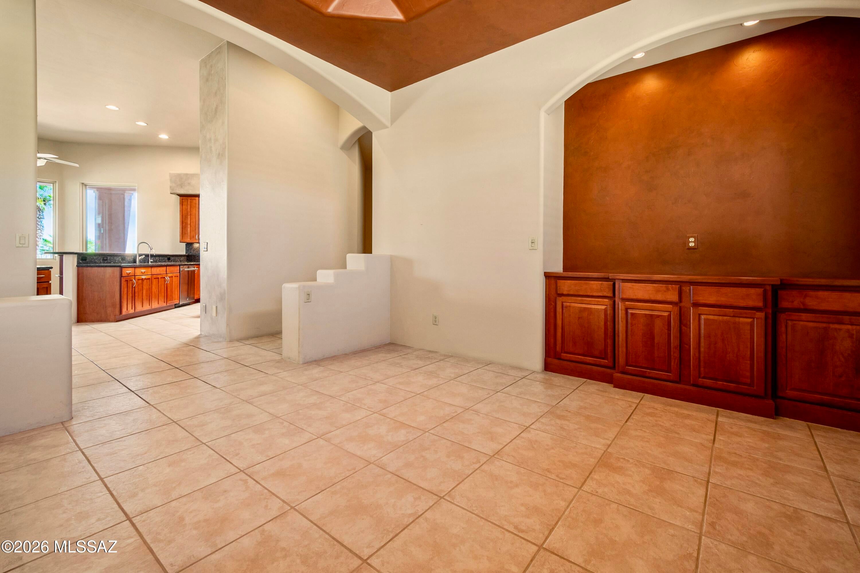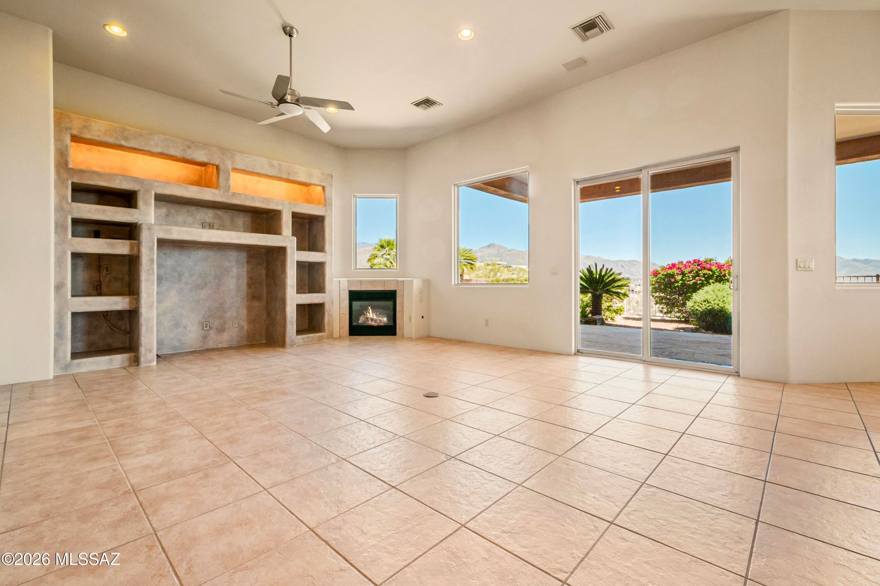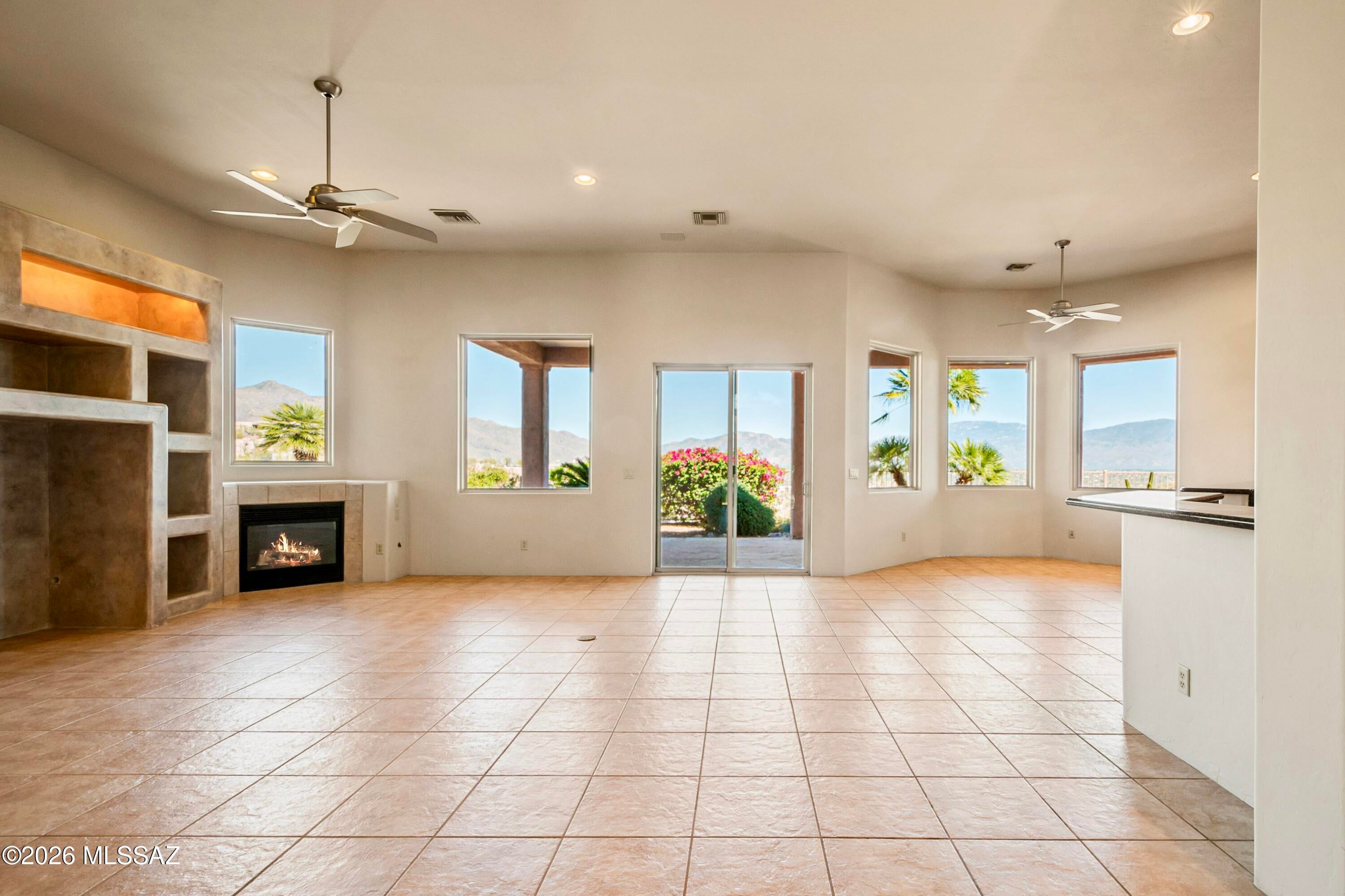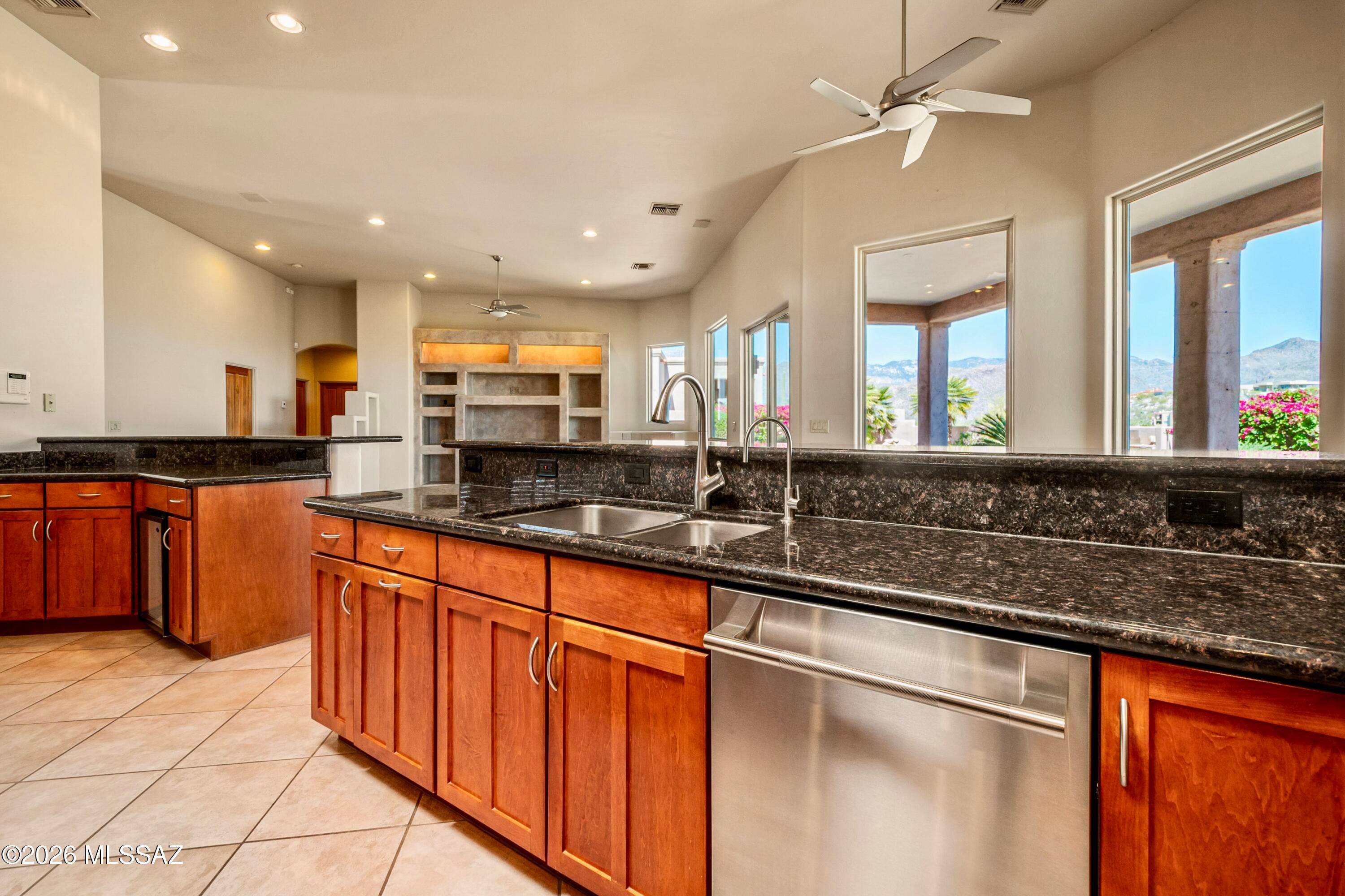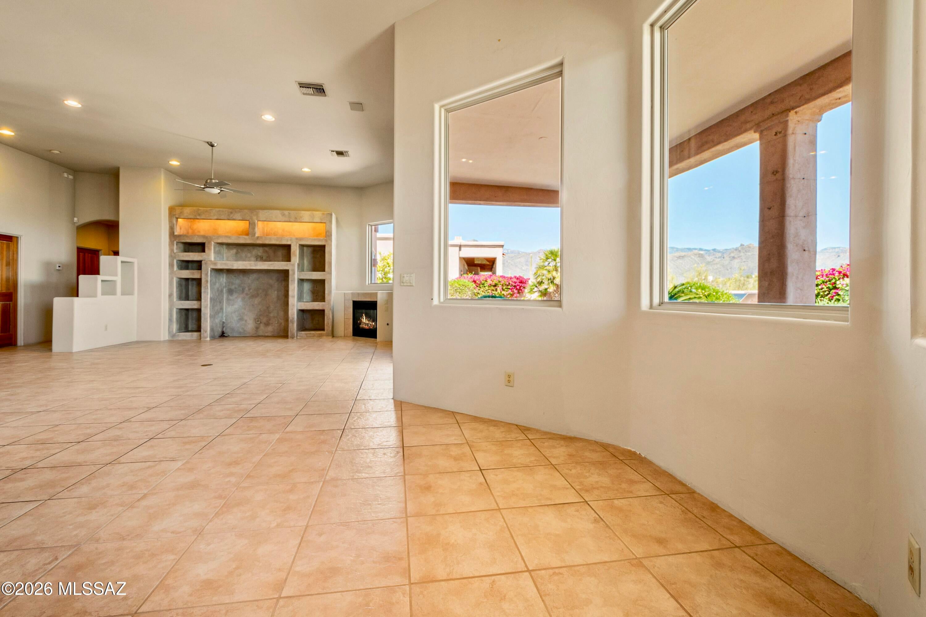 Elevated on a premier ridge-top homesite, this exceptional residence in Sabino Mountain offers a rare combination of privacy, architectural integrity, and truly breathtaking, unobstructed panoramic mountain views. Set on 1.14 acres within one of Tucsons most coveted gated enclaves, distinguished by its dramatic setting and rare neighborhood sidewalks.Built in 2001 and thoughtfully positioned to capture the surrounding beauty, the home embodies timeless contemporary design with a seamless, easy-living single-level layout. From the moment you enter, the foyer frames sweeping views through the expansive great room, where soaring ceilings, gallery walls, and artful niches are filled with natural light. The ideal split-bedroom floor plan ensures both comfort and privacy, complemented by solid wood paneled doors, expansive tile flooring, and architectural details throughout.Designed for everyday living and effortless entertaining alike, the kitchen is a standout centerpiece. Anchored by a central island and surrounded by expansive granite surfaces, it features custom cabinetry with pull-outs, display shelving, and integrated lighting. High-end appliances include a Jenn-Air commercial gas range with hood and heat lamps, double-wall ovens, and an Advantium microwave. A beverage bar with a built-in chiller enhances entertaining, while both casual and formal dining spaces, complete with a coffered ceiling and a built-in buffet, offer versatility.The desirable east-facing backyard invites year-round enjoyment with a large covered patio, flagstone hardscape, and a Pebble Tec pool and spa with a spillway water feature. A charming kiva fireplace anchors a separate niche patio, creating an intimate space. Mature, lush desert landscaping, enhanced by a new drip system (2025), surrounds the fully fenced yard, offering both beauty and ease of care.The owners suite is a peaceful retreat, opening directly to the patio and featuring a 5-piece bath with a garden tub, walk-in shower, and a customized closet system. Spacious secondary bedrooms provide flexibility, including one with private access to a hall bath. A well-appointed den, complete with a stately library cabinet and patio access, offers the option of a 4th bedroom, a recreational space, or an office.Additional highlights include an inviting covered entry, a gently sloped, extended driveway, a spacious three-car garage with 8-foot door headers, and a large, light-filled laundry room with workspace, storage, and a built-in desk, perfect for hobbies or organization.Ideally located near Sabino Canyon Recreation Area and Ventana Canyon Resort & Country Club, residents enjoy immediate access to world-class hiking, cycling, golf, tennis, and pickleball, as well as premier dining, shopping, and top-rated schools.Lovingly maintained by its long-term owner, the home features a new roof and sealed parapets (2026), along with recent updates to low-E glass and window seals.This is a rare opportunity to own a view property of this caliber in one of Tucsons most sought-after foothills communities.