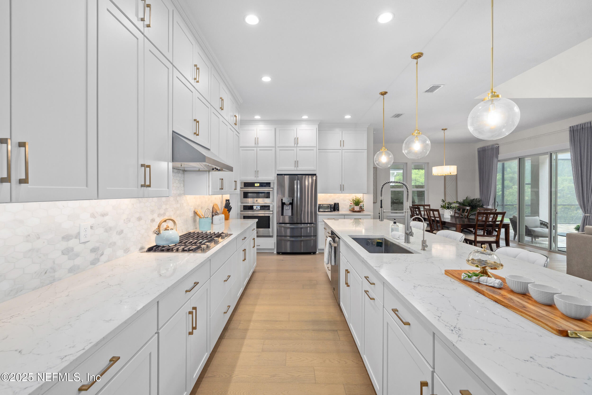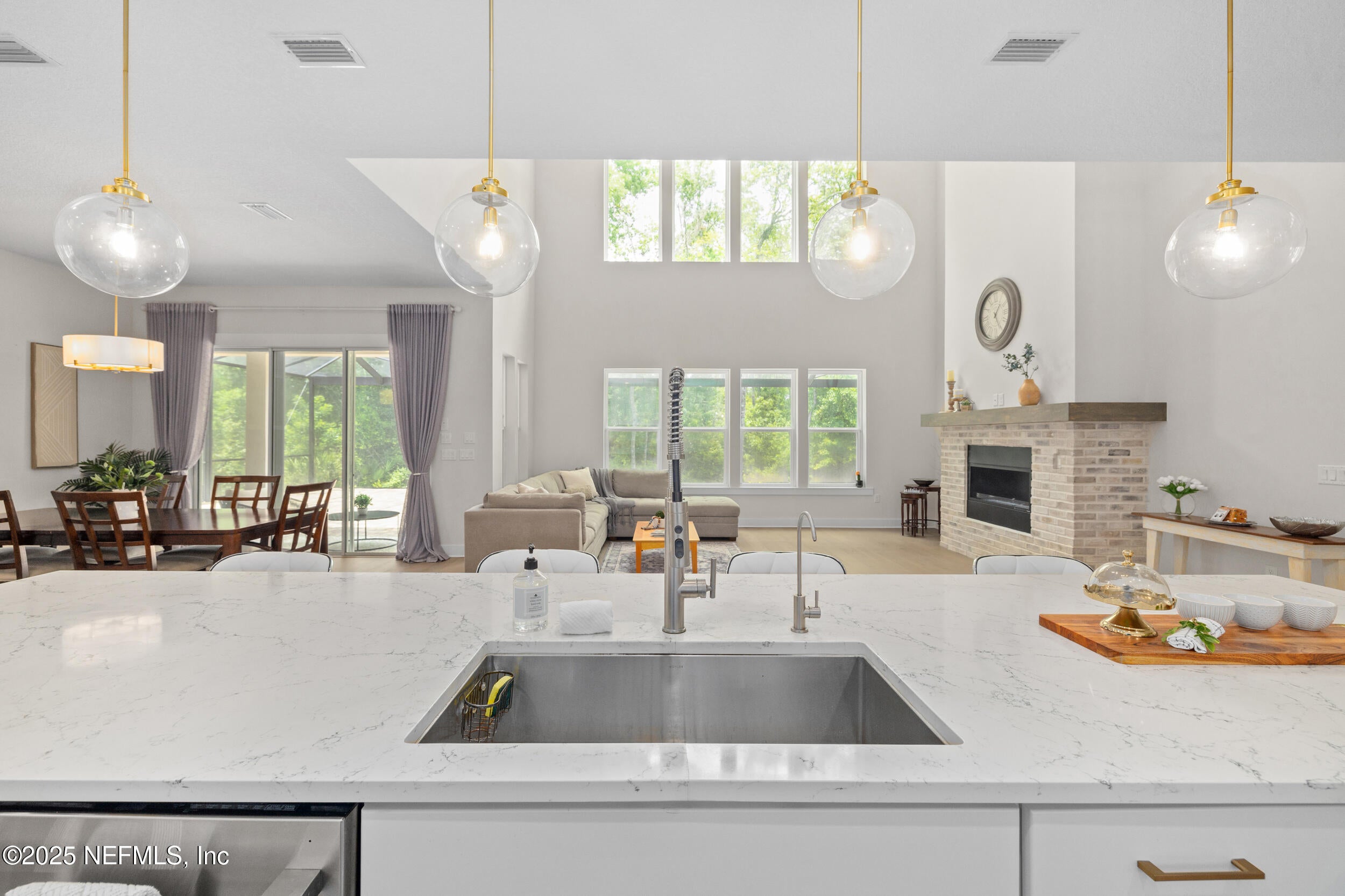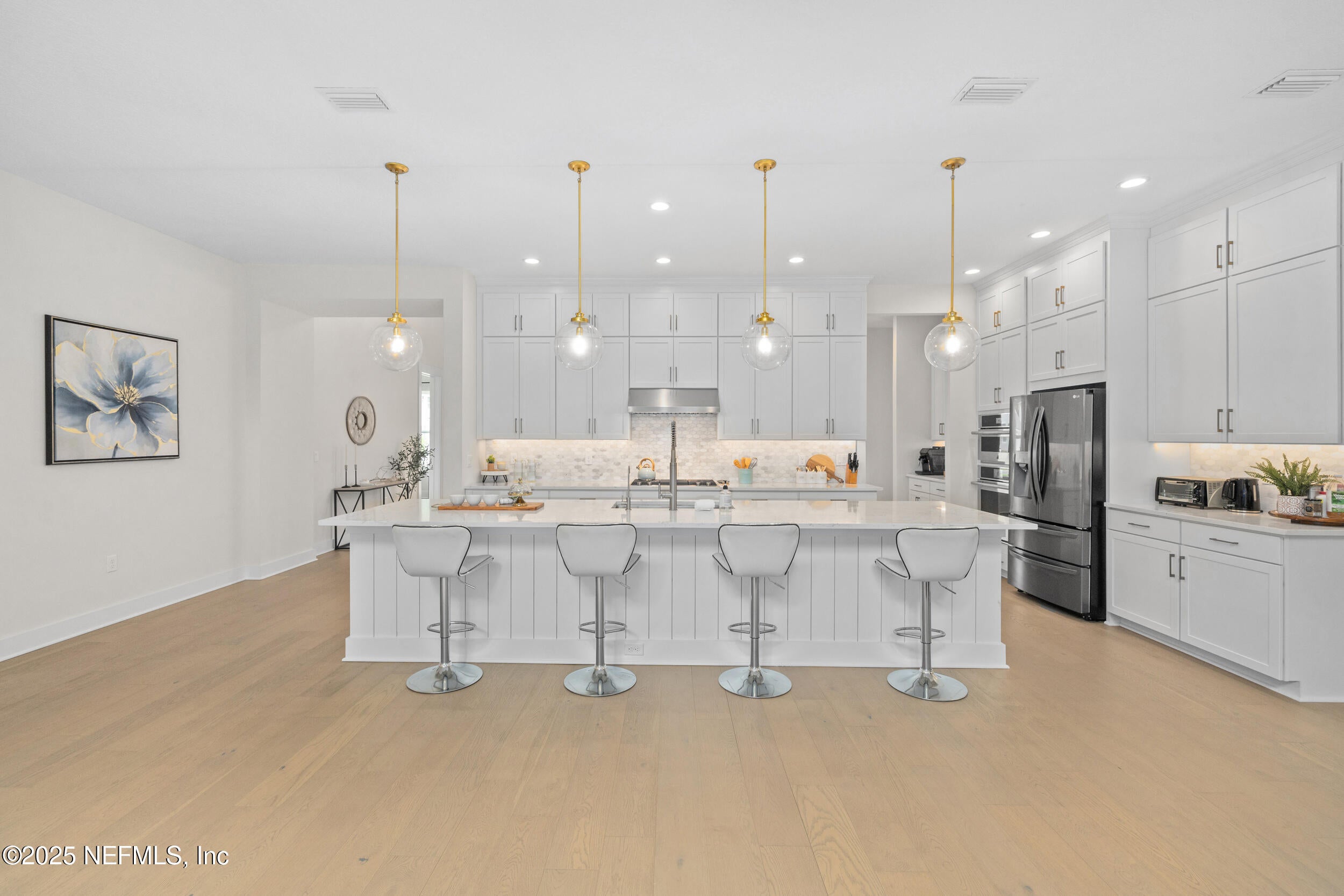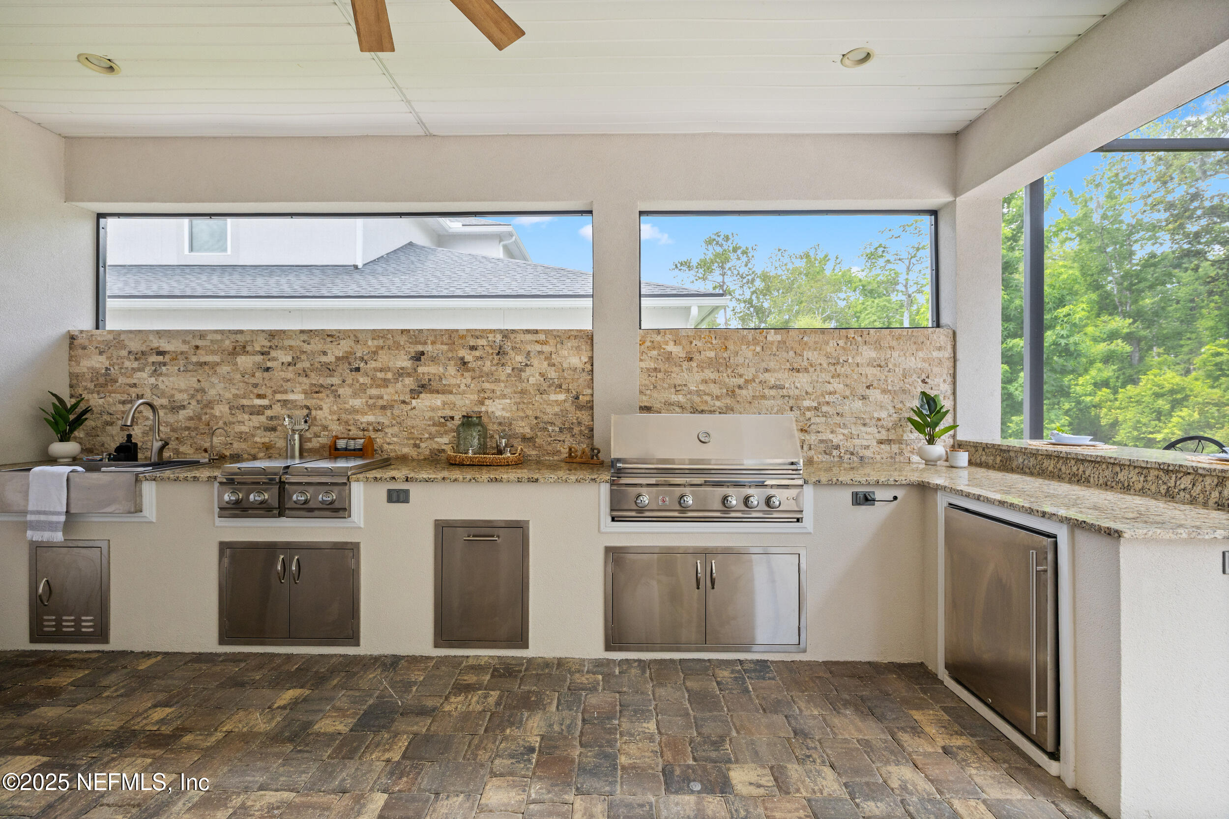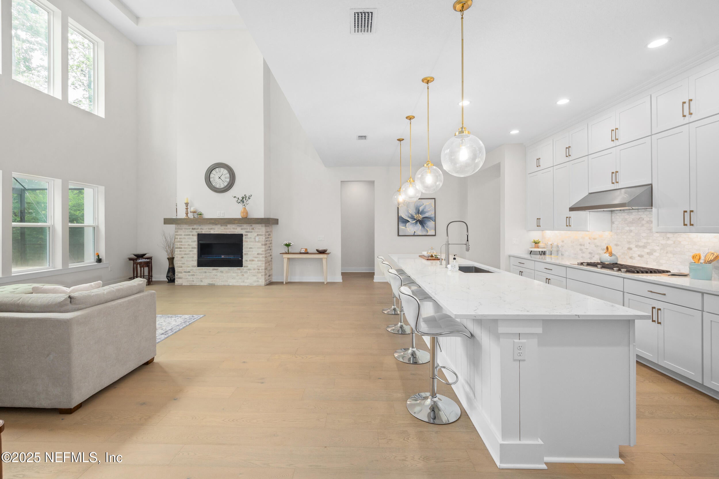 Welcome to this beautifully designed Toll Brothers Westbrook model located in the sought-after eTown community of Jacksonville, Florida.This spacious home offers 4 bedrooms, plus a dedicated study(non-conforming bedroom), and 3 full bathrooms, combining modern design with functionality.Step into the heart of the homean upgraded gourmet kitchen featuring an oversized island with seating for six, a walk-in pantry, stacked cabinets, high-level quartz countertops, a stylish tile backsplash and stainless steel sink. The impressive two-story great room includes an artisan gas fireplace and is filled with natural light from many large windows. The elegant primary suite on the main floor showcases a Cowford ceiling, two walk-in closets, and a spa-like bathroom with dual vanities, a freestanding soaking tub, walk-in shower, and upgraded flooring.Upstairs, youll find a generous loft, two additional bedrooms, and a full bathroom, offering great separation of space. Two more bedrooms and two full bathrooms are conveniently located downstairs.Outside, enjoy the extended paver driveway, paved walkways on both sides of the home, updated landscaping, and a custom summer kitchen complete with a high quality built-in grill, 4 gas burners, refrigerator, sink, storage, and granite countertops. Get ready to fall in love with the ultimate outdoor hangout! This oversized screened-in, paved patio offers all the space you need to relax, entertain, or simply enjoy the fresh airwithout the bugs. Whether youre sipping morning coffee, having dinner with friends, or stretching out with a good book, this patio feels like an outdoor extension of your home.Engineered Mohawk wood flooring runs throughout the main living areas, with upgraded tile in the bathrooms and laundry room.Residents of eTown enjoy access to Recharge, a 5-acre amenity center featuring a resort-style pool, lap lanes, high-tech fitness center, rooftop yoga patio, playground, event lawn, and dog parkall just minutes from the beach and St. Johns Town Center.Welcome home!