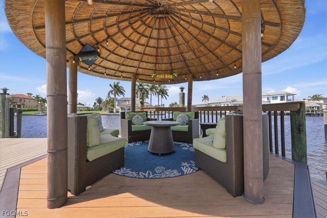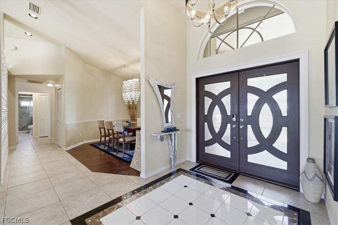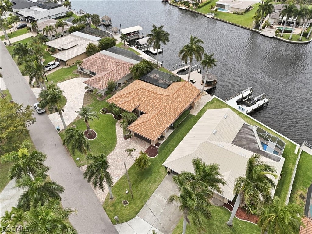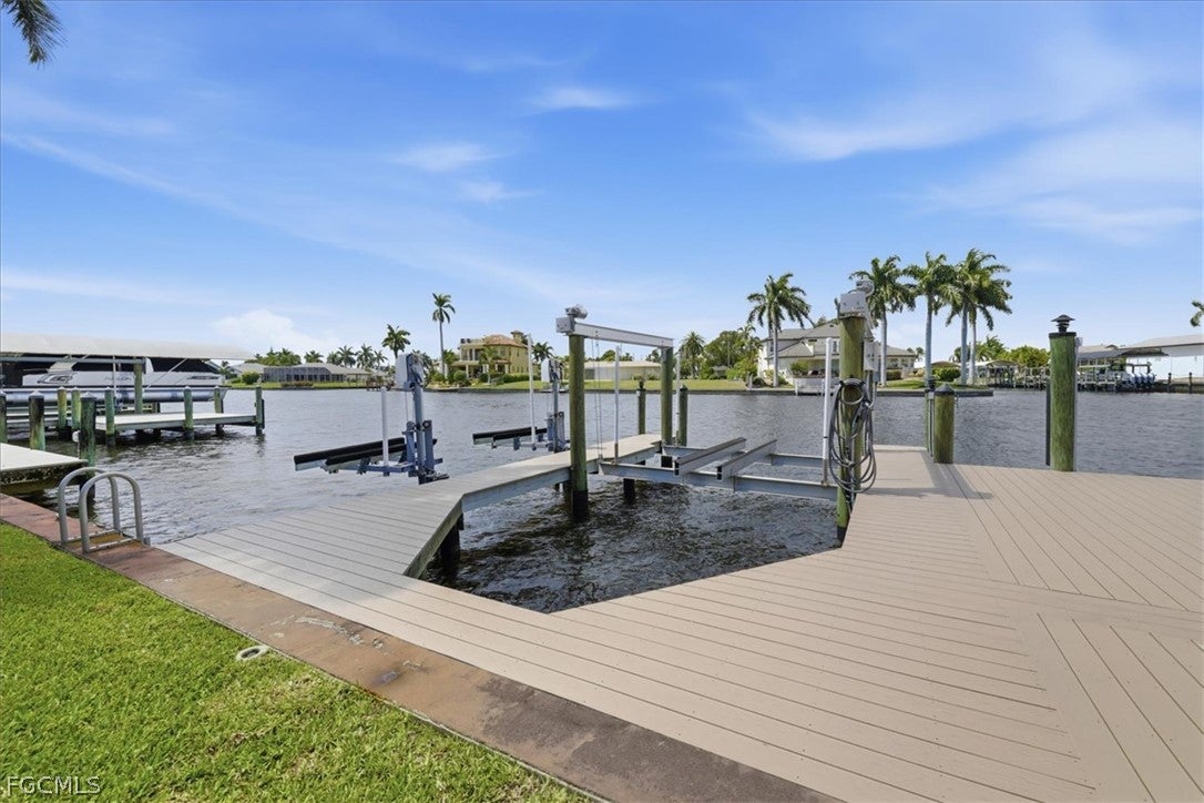 Welcome to refined waterfront living in one of Cape Corals most sought-after neighborhoods. This exceptional residence offers over 2,400 square feet of beautifully designed living space with an expansive open-concept floor plan that seamlessly blends comfort, style, and effortless entertaining. Step outside to your own private resort-style oasis. The sparkling pool with a dramatic grotto and cascading waterfall creates a tranquil tropical retreat, while the convenient pool bath makes outdoor living and entertaining effortless. Whether hosting gatherings or enjoying a quiet afternoon poolside, this space is designed to embrace the Florida lifestyle. Boating enthusiasts will appreciate the brand-new dock complete with a boat lift and jet ski lifts, offering easy access to the water for days spent exploring Southwest Floridas beautiful waterways. With no bridges to open water, boaters have the freedom to accommodate larger vessels with ease. The dock also features a charming tiki hut which is perfect for relaxing, entertaining, or unwinding with a drink while taking in breathtaking Florida sunsets. This home offers exceptional peace of mind with numerous recent upgrades, including a new metal tile-like roof (2023), new water heater (2023), impact-resistant/low E windows (2022), hurricane-rated garage door, new dock decking (2025), new paver patio & retaining wall (2025), new Generac generator hookup to electric system (2023) and fresh professional landscaping. Ideally located just minutes from the shopping, dining, and entertainment of downtown Cape Coral, this property perfectly captures the essence of luxury waterfront living where elegance, comfort, and the boating lifestyle come together.