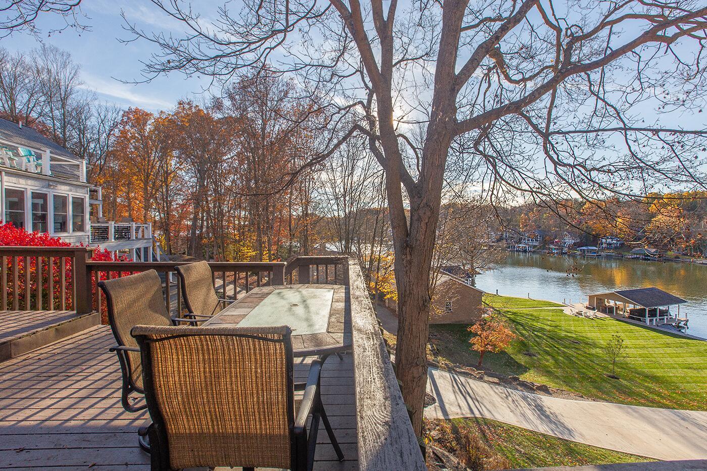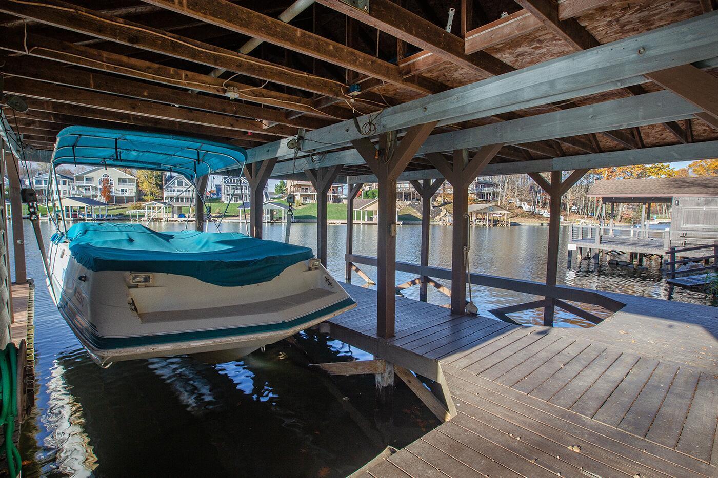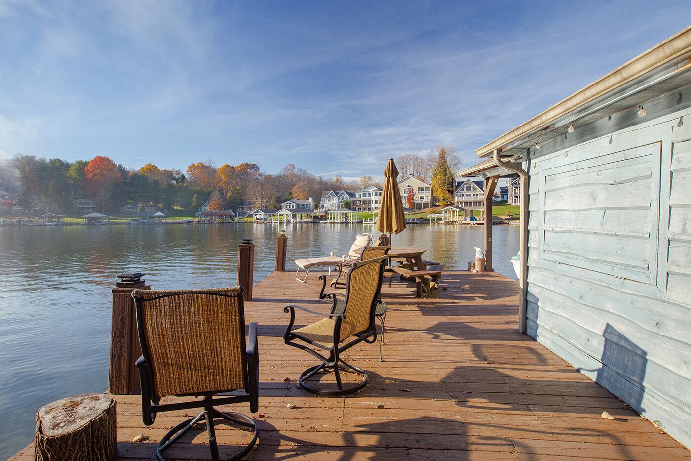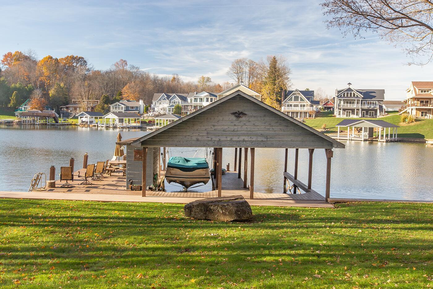 Lakefront living designed for relaxation and entertaining. This custom-built Amish home offers 4 bedrooms, 3 baths, comfortable living spaces, and beautiful water views throughout. The spacious kitchen with oak cabinetry and appliances opens to a warm four-season room, perfect for morning coffee or quiet evenings overlooking the lake. Step onto the large rear deck or enjoy the covered lower deck with steps leading down to the dock. The vaulted living room features a striking floor-to-ceiling brick fireplace that creates a cozy focal point. The private primary suite includes its own bath and two walk-in closets, with an additional bedroom on the main level. The finished lower level offers great flexibility with a large family room with a second propane gas-log fireplace, two additional bedrooms, a full bath, recreation room, office space, and workshop area. Outside, enjoy 101 FT of water frontage with a safe swimming area, 2024 Amish-built seawall and 2-bay covered boat dock. Also, enjoy the wonderful 3-car garage with workshop space. We got this on early so you can enjoy the start of the boating season!! .