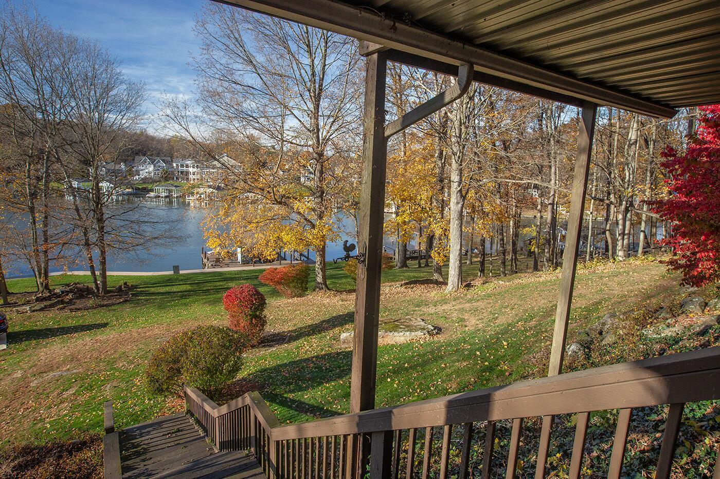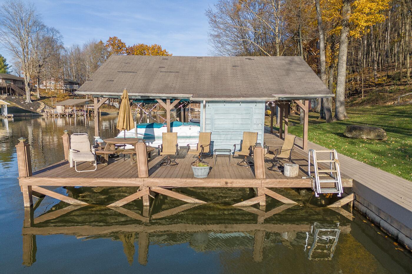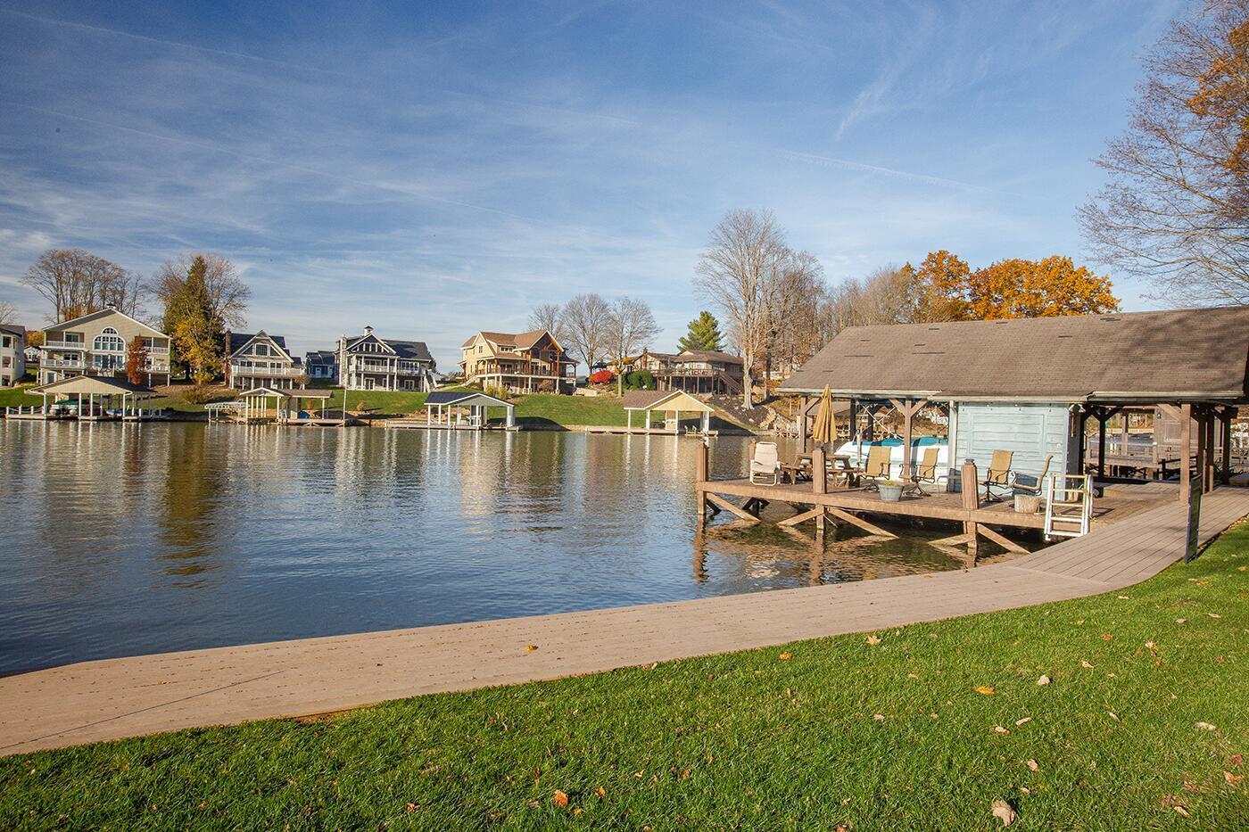 Lakefront living designed for relaxation and entertaining. This custom-built Amish home offers 4 bedrooms, 3 baths, comfortable living spaces, and beautiful water views throughout. The spacious kitchen with oak cabinetry and appliances opens to a warm four-season room, perfect for morning coffee or quiet evenings overlooking the lake. Step onto the large rear deck or enjoy the covered lower deck with steps leading down to the dock. The vaulted living room features a striking floor-to-ceiling brick fireplace that creates a cozy focal point. The private primary suite includes its own bath and two walk-in closets, with an additional bedroom on the main level. The finished lower level offers great flexibility with a large family room with a second propane gas-log fireplace, two additional bedrooms, a full bath, recreation room, office space, and workshop area. Outside, enjoy 101 FT of water frontage with a safe swimming area, 2024 Amish-built seawall and 2-bay covered boat dock. Also, enjoy the wonderful 3-car garage with workshop space. We got this on early so you can enjoy the start of the boating season!! .
