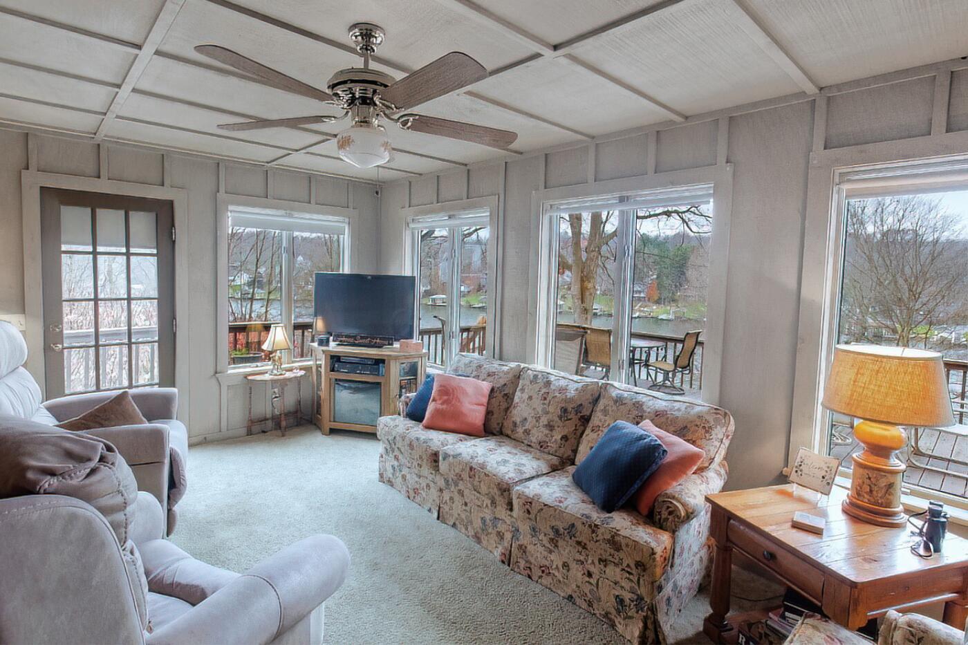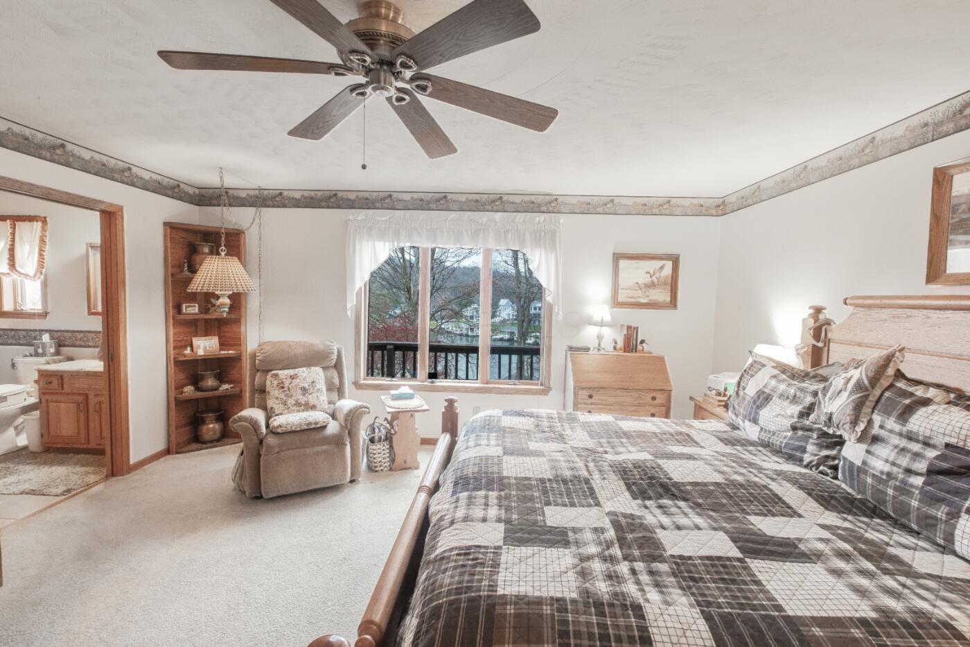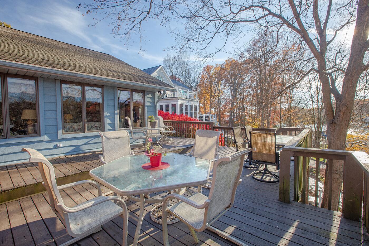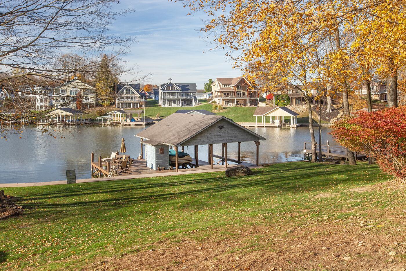 Lakefront living designed for relaxation and entertaining. This custom-built Amish home offers 4 bedrooms, 3 baths, comfortable living spaces, and beautiful water views throughout. The spacious kitchen with oak cabinetry and appliances opens to a warm four-season room, perfect for morning coffee or quiet evenings overlooking the lake. Step onto the large rear deck or enjoy the covered lower deck with steps leading down to the dock. The vaulted living room features a striking floor-to-ceiling brick fireplace that creates a cozy focal point. The private primary suite includes its own bath and two walk-in closets, with an additional bedroom on the main level. The finished lower level offers great flexibility with a large family room with a second propane gas-log fireplace, two additional bedrooms, a full bath, recreation room, office space, and workshop area. Outside, enjoy 101 FT of water frontage with a safe swimming area, 2024 Amish-built seawall and 2-bay covered boat dock. Also, enjoy the wonderful 3-car garage with workshop space. We got this on early so you can enjoy the start of the boating season!! .