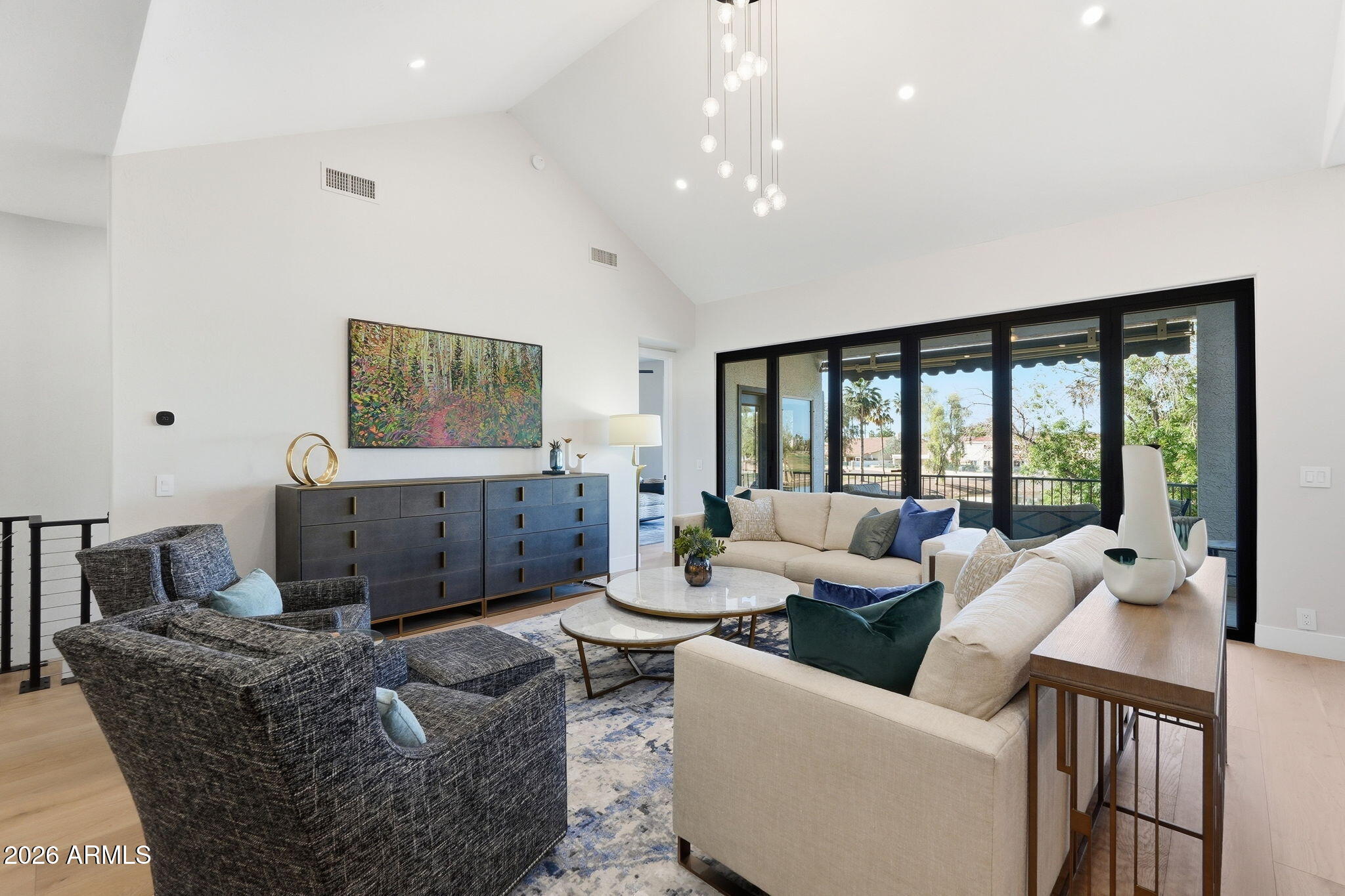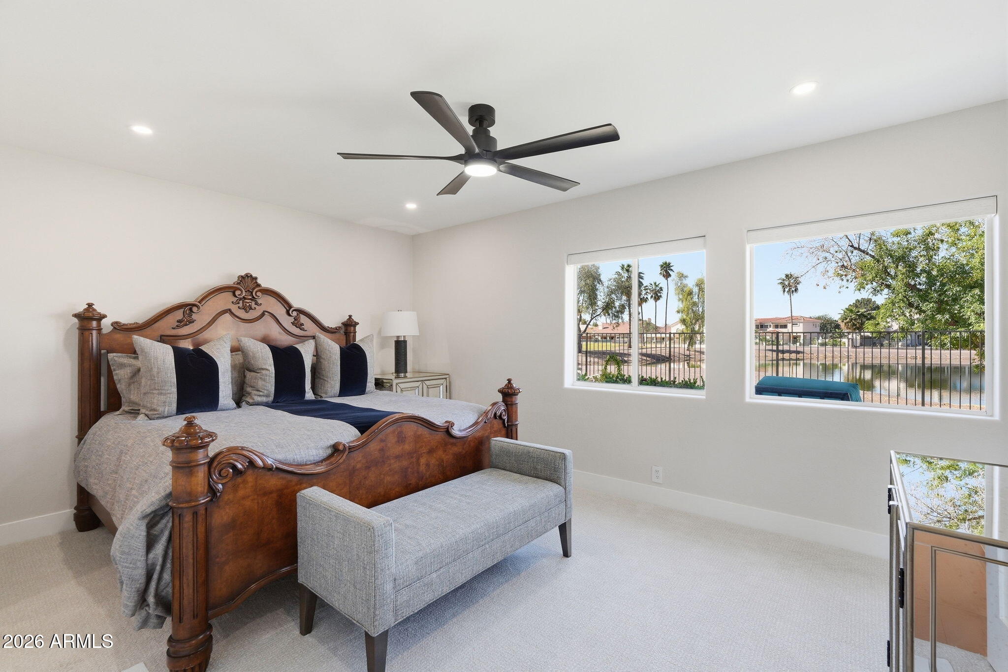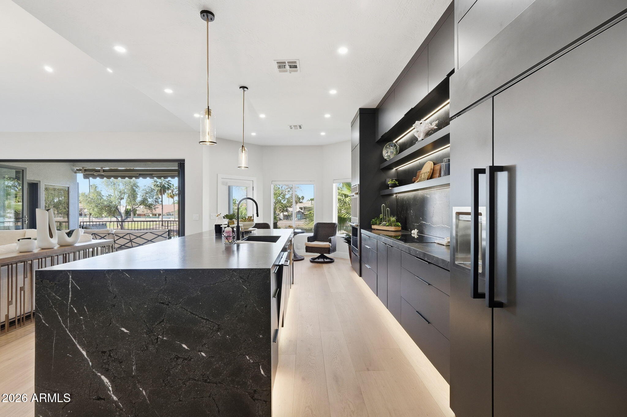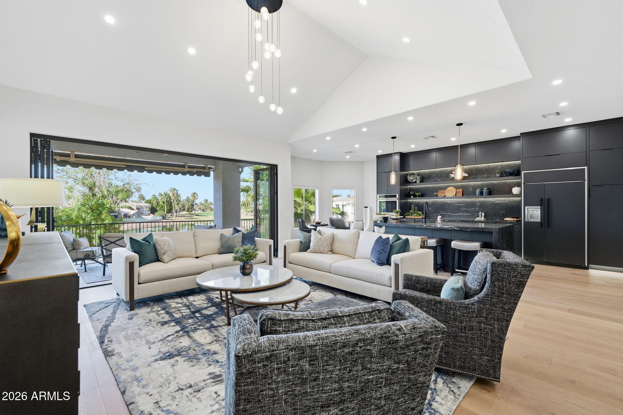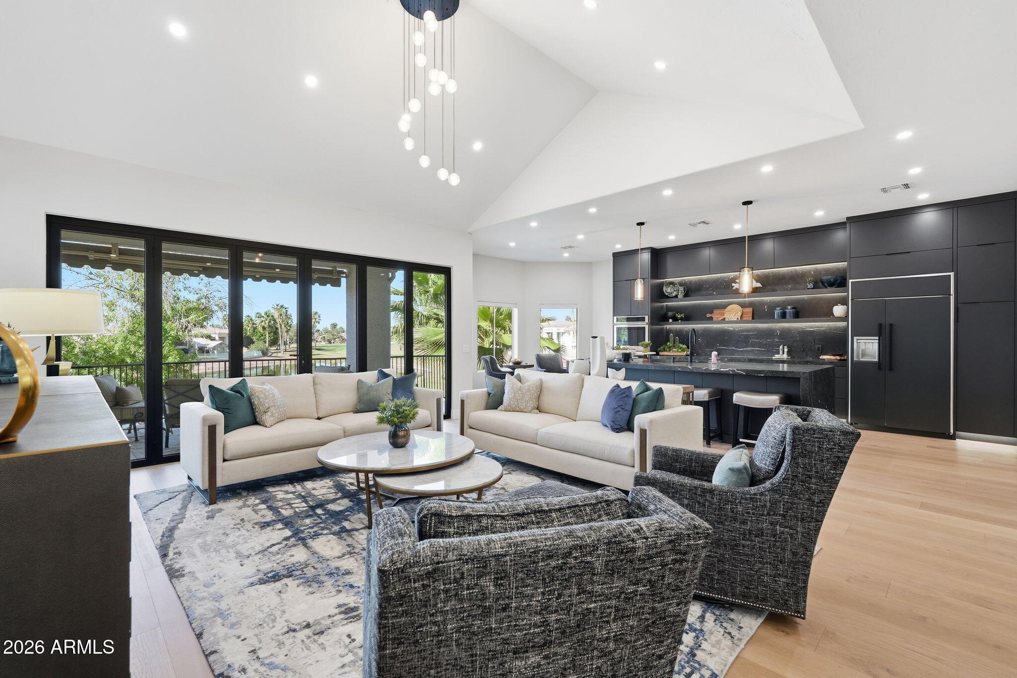 Welcome to an exceptional, luxury residence in the highly coveted Arrowhead Ranch community. This home has been completely redesigned to embrace todays modern lifestyle, offering an incredible location with stunning golf course and pond views that provide the perfect backdrop for enjoying those beautiful Arizona sunsets.The thoughtfully crafted layout features three spacious bedrooms and three-and-a-half bathrooms, along with the rare convenience of two laundry rooms. The kitchen stands out as a true chefs dream, equipped with top-of-the-line Monogram appliances, an induction cooktop, sleek flat-panel cabinets, and a striking quartzite waterfall island complemented by matching quartzite countertops and backsplash. A high-end Rohl kitchen faucet adds to the refined touches. Throughout the home, contemporary lighting elevates every space, with 4-inch LED ceiling cans on dimmer switches creating the ideal ambiance. High-end hardwood flooring flows seamlessly through the main living areas, while upgraded carpet and padding grace bedrooms one and two. A sophisticated metal staircase and a stunning metal-and-glass 48-inch front entry door make a dramatic first impression, paired with two-panel solid wood doors and premium Emtek hardware found throughout.The master bath is a luxurious retreat, boasting double-sided lighted mirrors, high-end upgraded Brizo plumbing fixtures in both the bath and shower, and premium master faucets, along with upgraded cabinetry in the master closets. A dedicated wet bar area features quartzite tops, upgraded cabinets, and an integrated wine room for effortless entertaining.Additional high-end upgrades include a whole-house water filtration system, an epoxy-finished garage floor, built-in wood stairs, Ecobee thermostats for smart climate control, and two separate AC and heating units for zoned comfort. The home is further enhanced by cabinet upgrades in the master closets and impressive full 12x9 Arcadia doors on each level that fully open, seamlessly blending indoor living with the outdoor views.This meticulously updated residence combines premium finishes, practical luxury features, and an unbeatable setting in one of the areas most desirable communities--ideal for those seeking turnkey elegance with resort-like surroundings. Primary, is on main living area with bonus room, wet bar and additional bedrooms on lower level. Home is being sold below appraisal from last year.