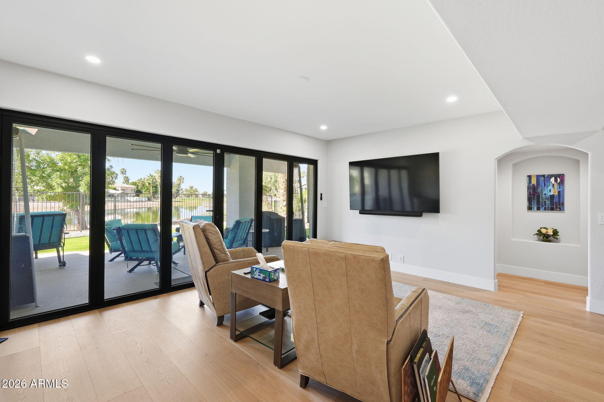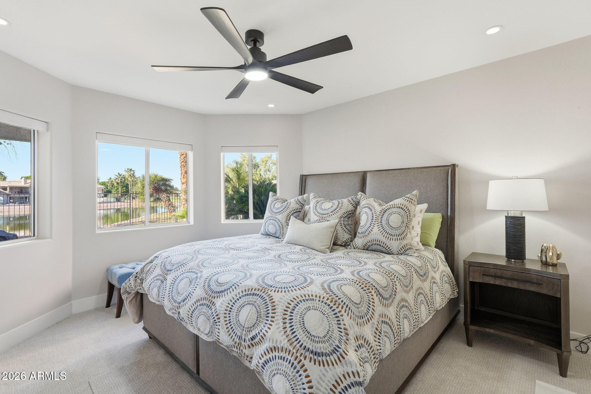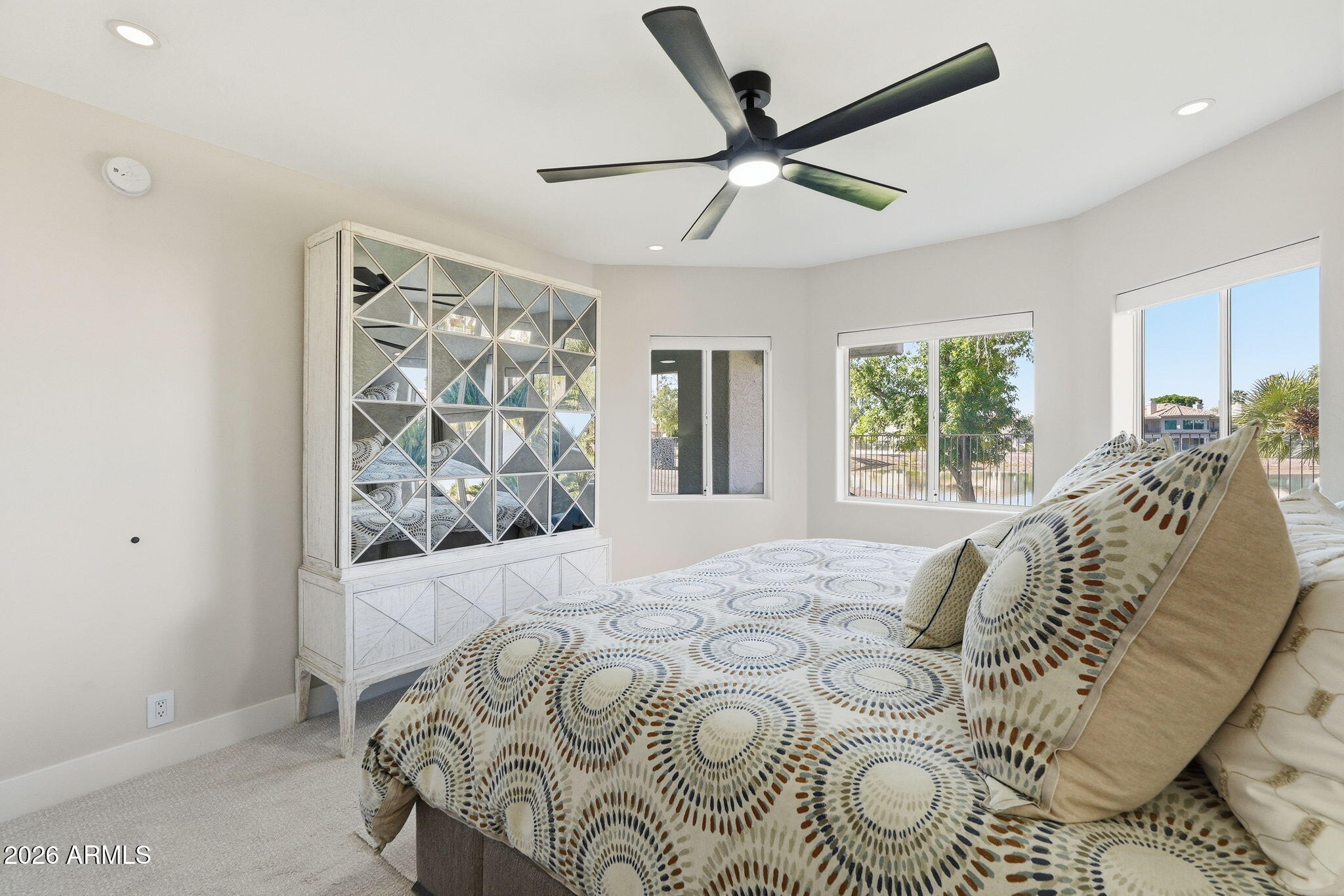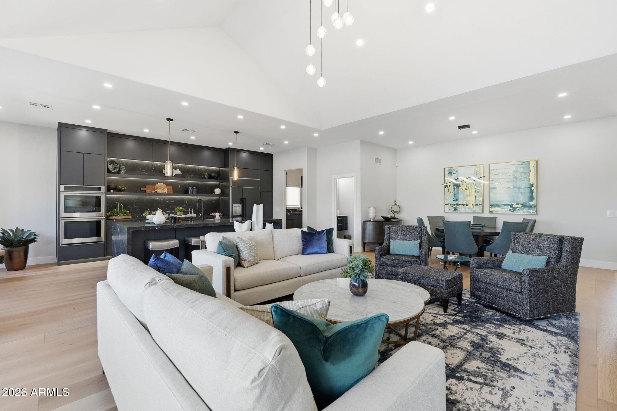 Welcome to an exceptional, luxury residence in the highly coveted Arrowhead Ranch community. This home has been completely redesigned to embrace todays modern lifestyle, offering an incredible location with stunning golf course and pond views that provide the perfect backdrop for enjoying those beautiful Arizona sunsets.The thoughtfully crafted layout features three spacious bedrooms and three-and-a-half bathrooms, along with the rare convenience of two laundry rooms. The kitchen stands out as a true chefs dream, equipped with top-of-the-line Monogram appliances, an induction cooktop, sleek flat-panel cabinets, and a striking quartzite waterfall island complemented by matching quartzite countertops and backsplash. A high-end Rohl kitchen faucet adds to the refined touches. Throughout the home, contemporary lighting elevates every space, with 4-inch LED ceiling cans on dimmer switches creating the ideal ambiance. High-end hardwood flooring flows seamlessly through the main living areas, while upgraded carpet and padding grace bedrooms one and two. A sophisticated metal staircase and a stunning metal-and-glass 48-inch front entry door make a dramatic first impression, paired with two-panel solid wood doors and premium Emtek hardware found throughout.The master bath is a luxurious retreat, boasting double-sided lighted mirrors, high-end upgraded Brizo plumbing fixtures in both the bath and shower, and premium master faucets, along with upgraded cabinetry in the master closets. A dedicated wet bar area features quartzite tops, upgraded cabinets, and an integrated wine room for effortless entertaining.Additional high-end upgrades include a whole-house water filtration system, an epoxy-finished garage floor, built-in wood stairs, Ecobee thermostats for smart climate control, and two separate AC and heating units for zoned comfort. The home is further enhanced by cabinet upgrades in the master closets and impressive full 12x9 Arcadia doors on each level that fully open, seamlessly blending indoor living with the outdoor views.This meticulously updated residence combines premium finishes, practical luxury features, and an unbeatable setting in one of the areas most desirable communities--ideal for those seeking turnkey elegance with resort-like surroundings. Primary, is on main living area with bonus room, wet bar and additional bedrooms on lower level. Home is being sold below appraisal from last year.
