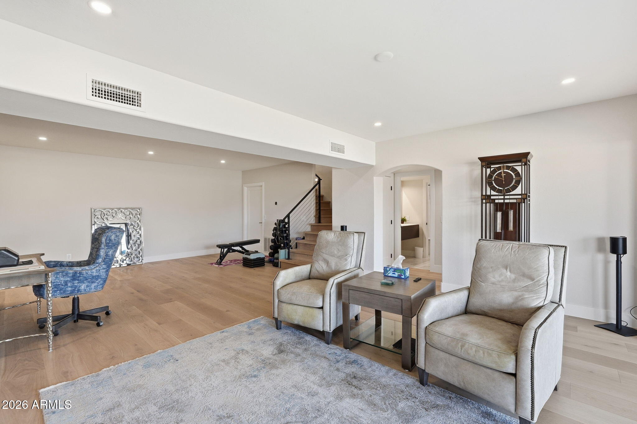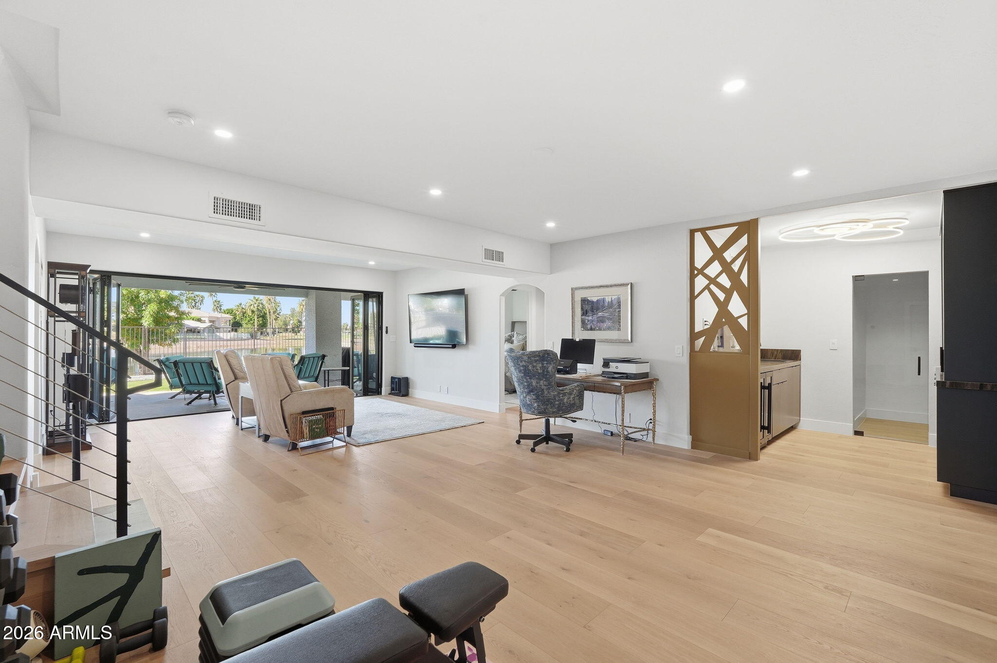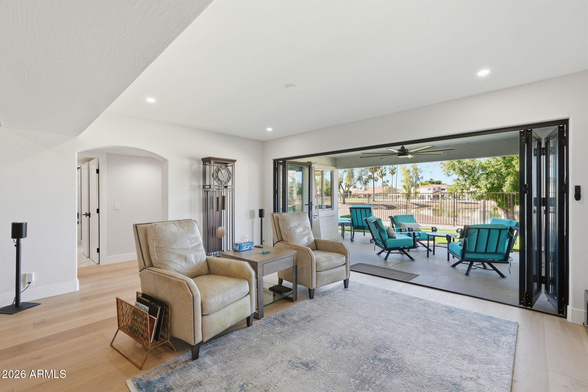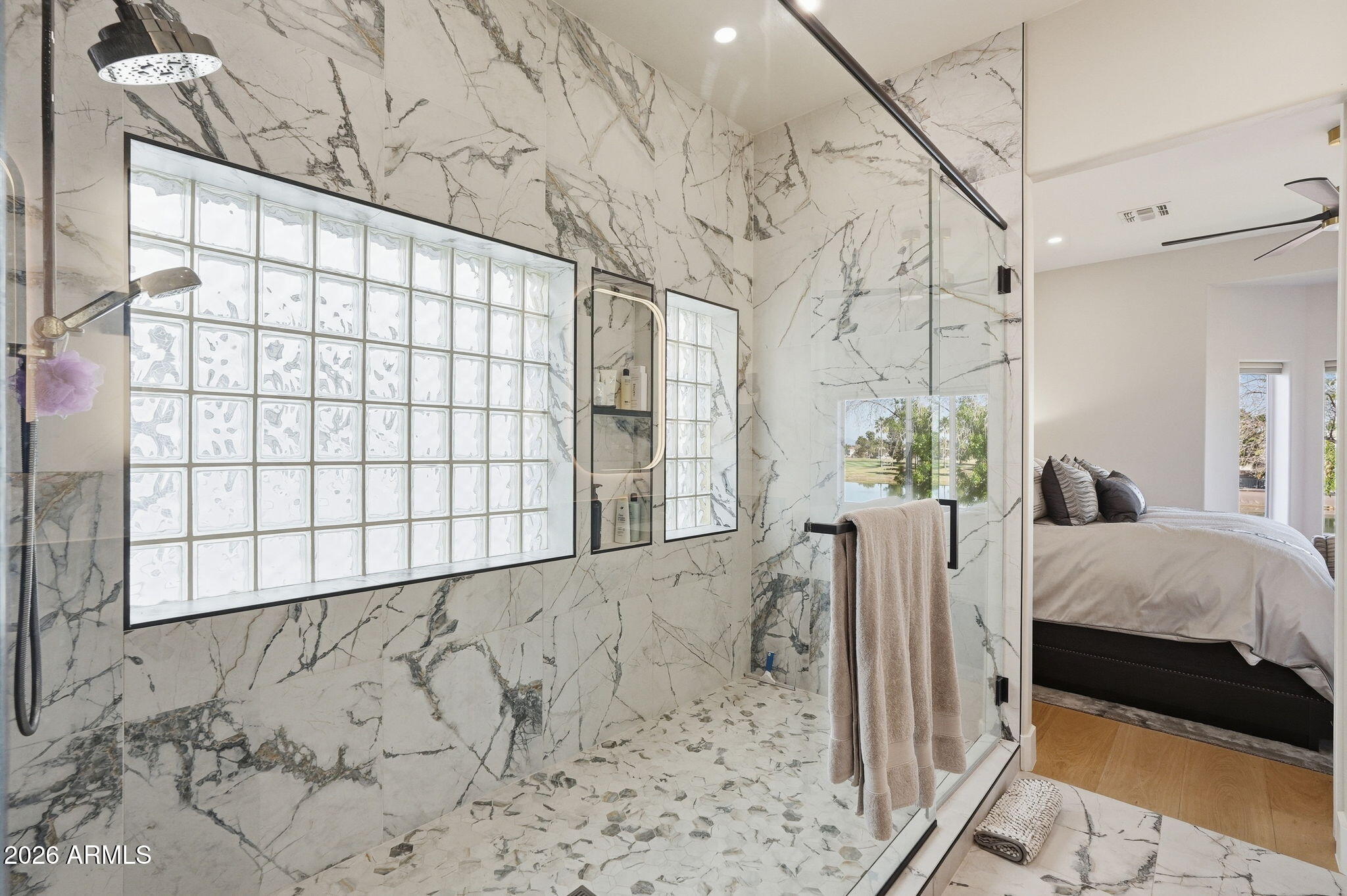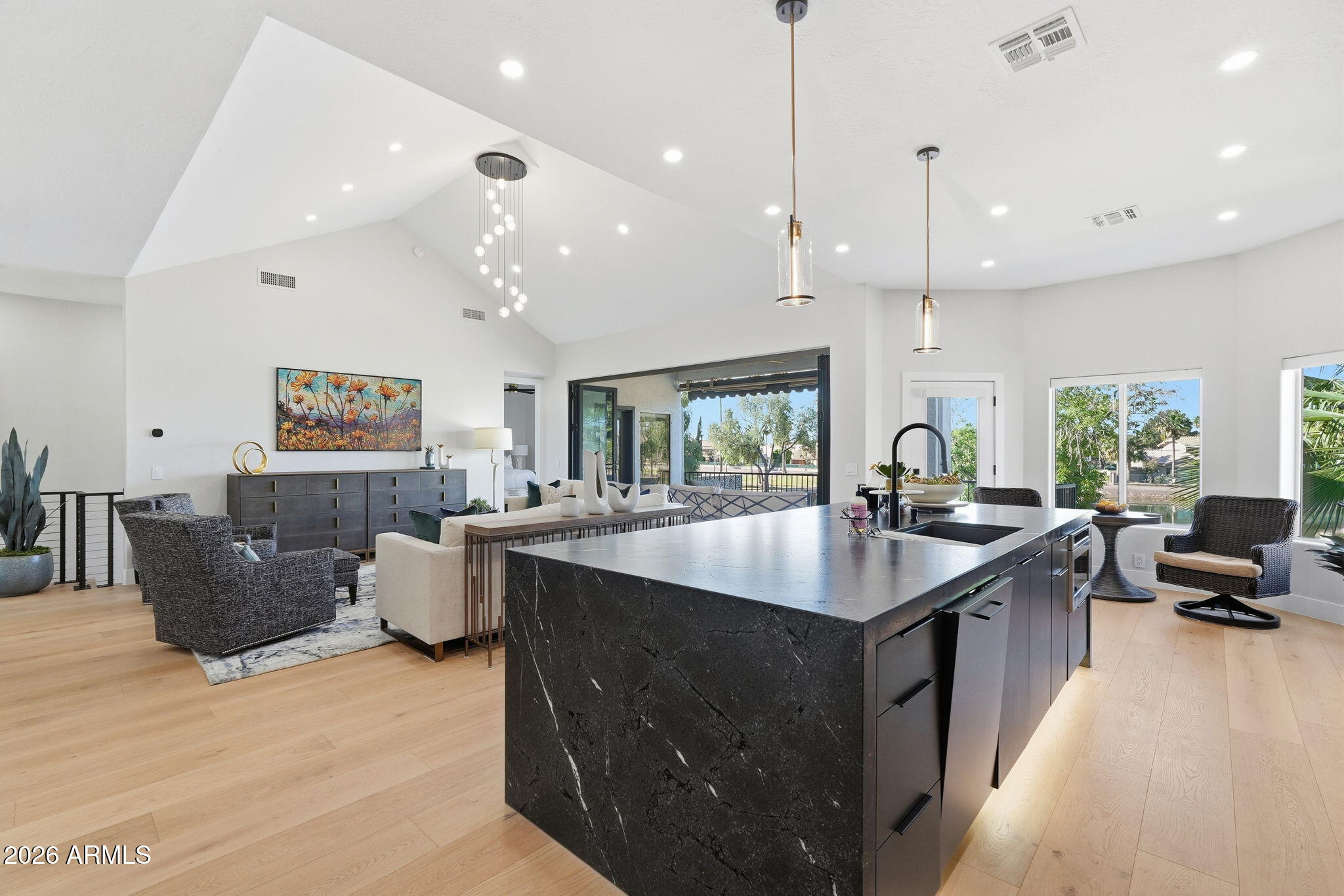 Welcome to an exceptional, luxury residence in the highly coveted Arrowhead Ranch community. This home has been completely redesigned to embrace todays modern lifestyle, offering an incredible location with stunning golf course and pond views that provide the perfect backdrop for enjoying those beautiful Arizona sunsets.The thoughtfully crafted layout features three spacious bedrooms and three-and-a-half bathrooms, along with the rare convenience of two laundry rooms. The kitchen stands out as a true chefs dream, equipped with top-of-the-line Monogram appliances, an induction cooktop, sleek flat-panel cabinets, and a striking quartzite waterfall island complemented by matching quartzite countertops and backsplash. A high-end Rohl kitchen faucet adds to the refined touches. Throughout the home, contemporary lighting elevates every space, with 4-inch LED ceiling cans on dimmer switches creating the ideal ambiance. High-end hardwood flooring flows seamlessly through the main living areas, while upgraded carpet and padding grace bedrooms one and two. A sophisticated metal staircase and a stunning metal-and-glass 48-inch front entry door make a dramatic first impression, paired with two-panel solid wood doors and premium Emtek hardware found throughout.The master bath is a luxurious retreat, boasting double-sided lighted mirrors, high-end upgraded Brizo plumbing fixtures in both the bath and shower, and premium master faucets, along with upgraded cabinetry in the master closets. A dedicated wet bar area features quartzite tops, upgraded cabinets, and an integrated wine room for effortless entertaining.Additional high-end upgrades include a whole-house water filtration system, an epoxy-finished garage floor, built-in wood stairs, Ecobee thermostats for smart climate control, and two separate AC and heating units for zoned comfort. The home is further enhanced by cabinet upgrades in the master closets and impressive full 12x9 Arcadia doors on each level that fully open, seamlessly blending indoor living with the outdoor views.This meticulously updated residence combines premium finishes, practical luxury features, and an unbeatable setting in one of the areas most desirable communities--ideal for those seeking turnkey elegance with resort-like surroundings. Primary, is on main living area with bonus room, wet bar and additional bedrooms on lower level. Home is being sold below appraisal from last year.