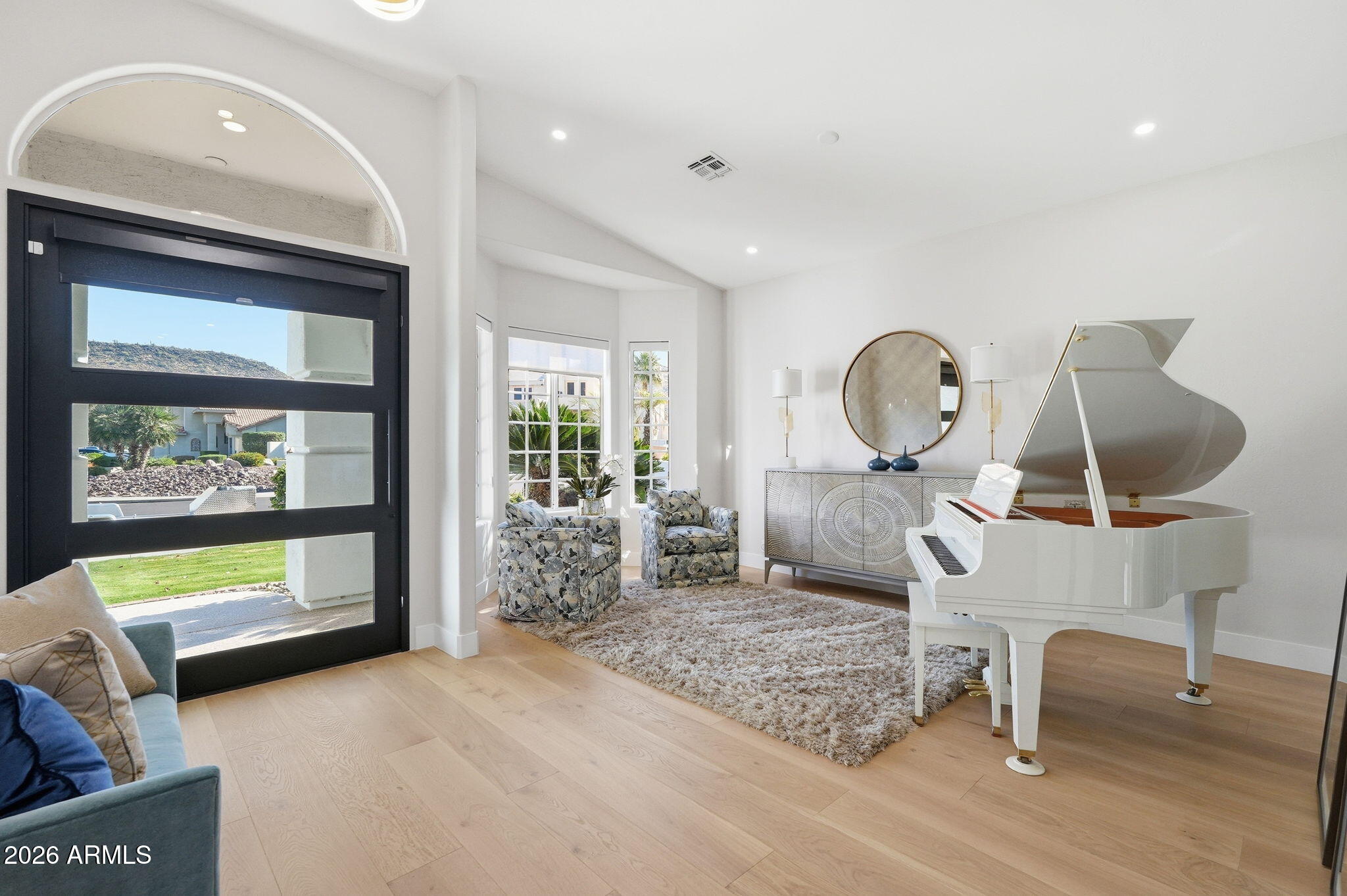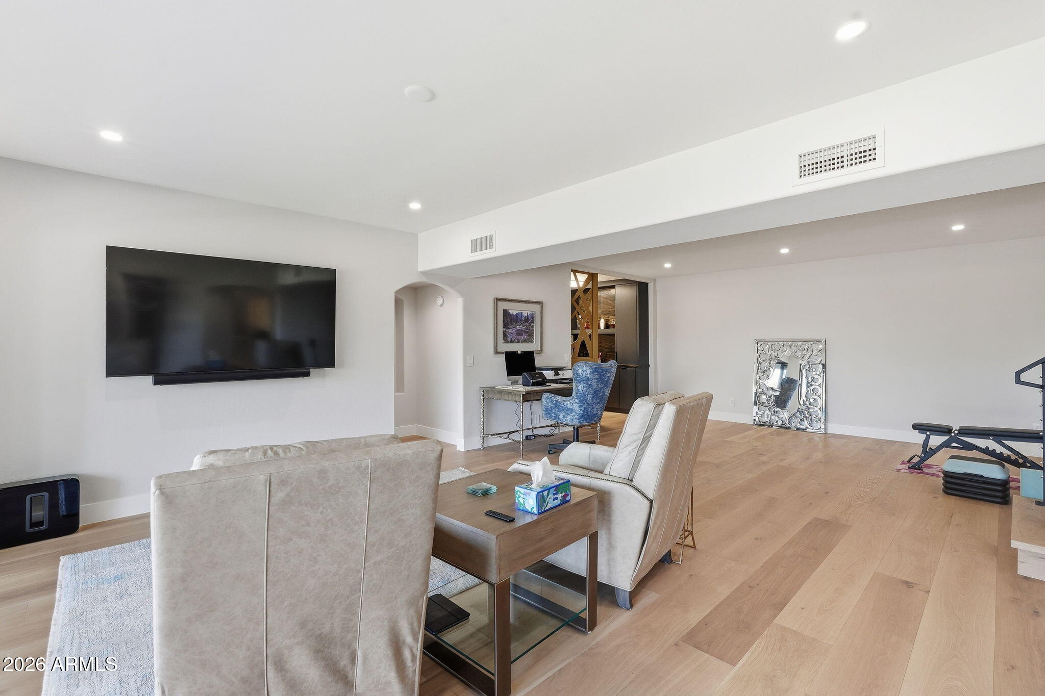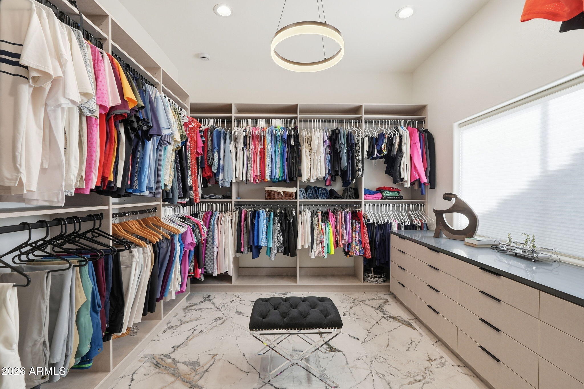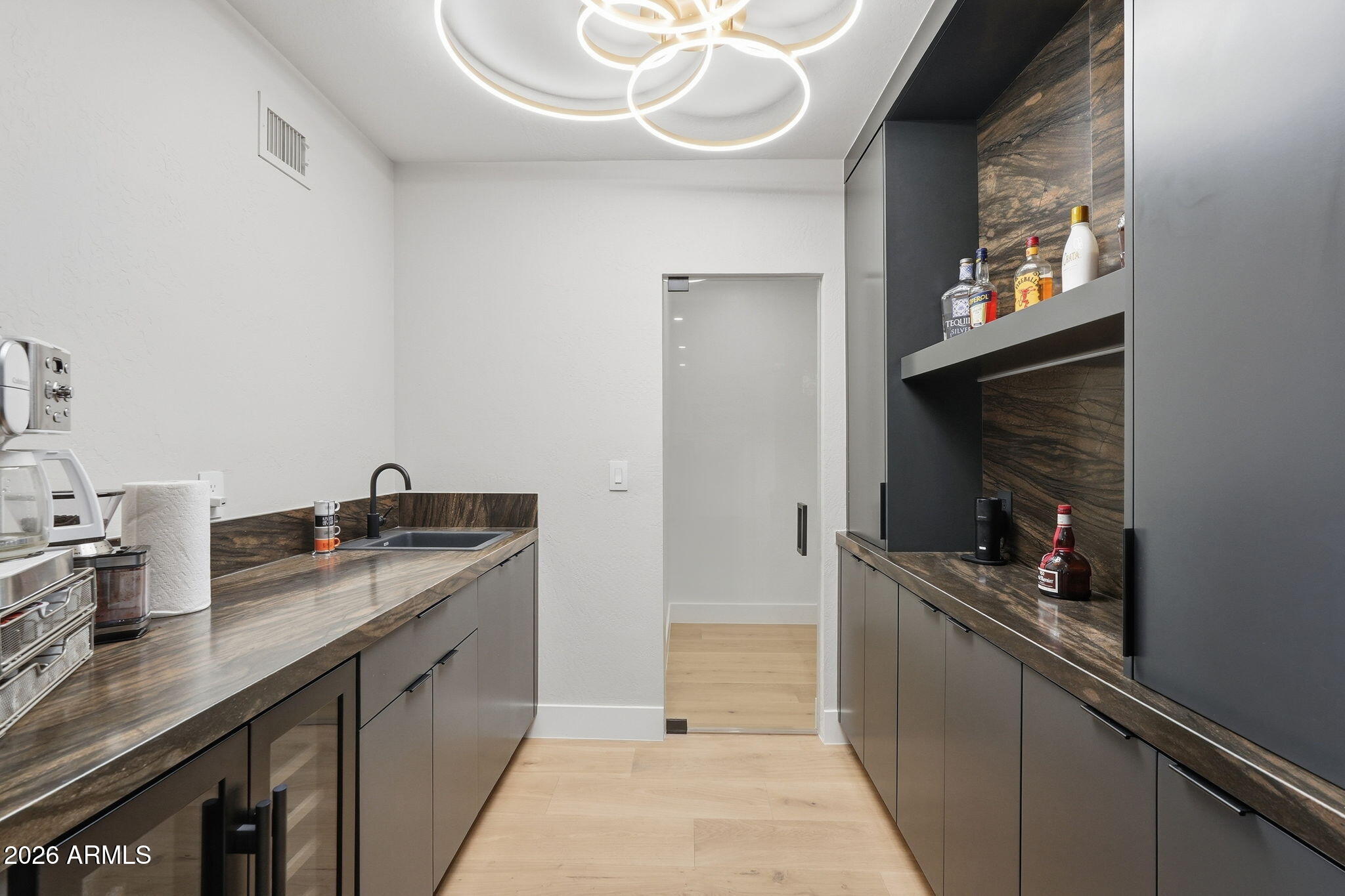 Welcome to an exceptional, luxury residence in the highly coveted Arrowhead Ranch community. This home has been completely redesigned to embrace todays modern lifestyle, offering an incredible location with stunning golf course and pond views that provide the perfect backdrop for enjoying those beautiful Arizona sunsets.The thoughtfully crafted layout features three spacious bedrooms and three-and-a-half bathrooms, along with the rare convenience of two laundry rooms. The kitchen stands out as a true chefs dream, equipped with top-of-the-line Monogram appliances, an induction cooktop, sleek flat-panel cabinets, and a striking quartzite waterfall island complemented by matching quartzite countertops and backsplash. A high-end Rohl kitchen faucet adds to the refined touches. Throughout the home, contemporary lighting elevates every space, with 4-inch LED ceiling cans on dimmer switches creating the ideal ambiance. High-end hardwood flooring flows seamlessly through the main living areas, while upgraded carpet and padding grace bedrooms one and two. A sophisticated metal staircase and a stunning metal-and-glass 48-inch front entry door make a dramatic first impression, paired with two-panel solid wood doors and premium Emtek hardware found throughout.The master bath is a luxurious retreat, boasting double-sided lighted mirrors, high-end upgraded Brizo plumbing fixtures in both the bath and shower, and premium master faucets, along with upgraded cabinetry in the master closets. A dedicated wet bar area features quartzite tops, upgraded cabinets, and an integrated wine room for effortless entertaining.Additional high-end upgrades include a whole-house water filtration system, an epoxy-finished garage floor, built-in wood stairs, Ecobee thermostats for smart climate control, and two separate AC and heating units for zoned comfort. The home is further enhanced by cabinet upgrades in the master closets and impressive full 12x9 Arcadia doors on each level that fully open, seamlessly blending indoor living with the outdoor views.This meticulously updated residence combines premium finishes, practical luxury features, and an unbeatable setting in one of the areas most desirable communities--ideal for those seeking turnkey elegance with resort-like surroundings. Primary, is on main living area with bonus room, wet bar and additional bedrooms on lower level. Home is being sold below appraisal from last year.