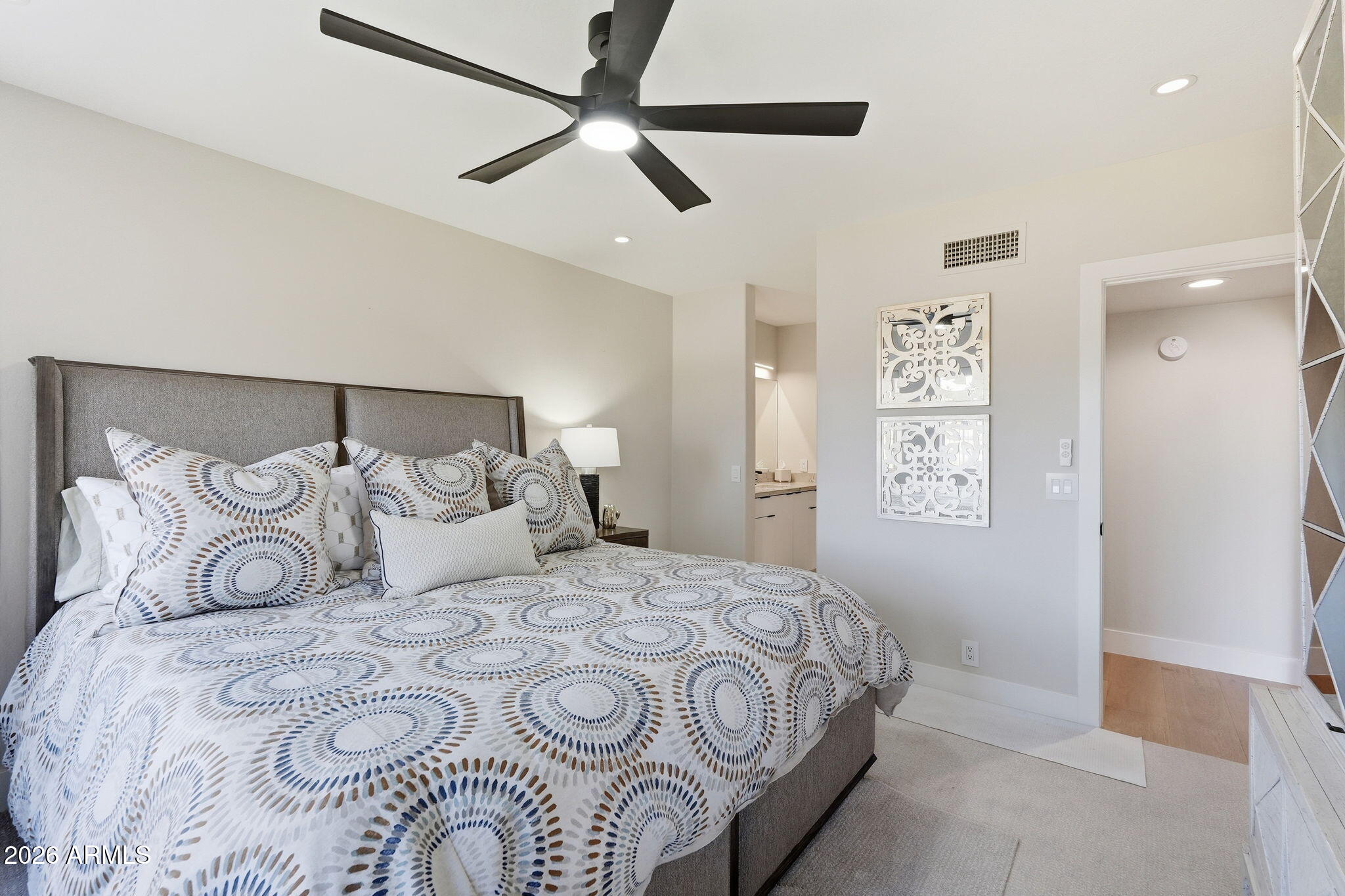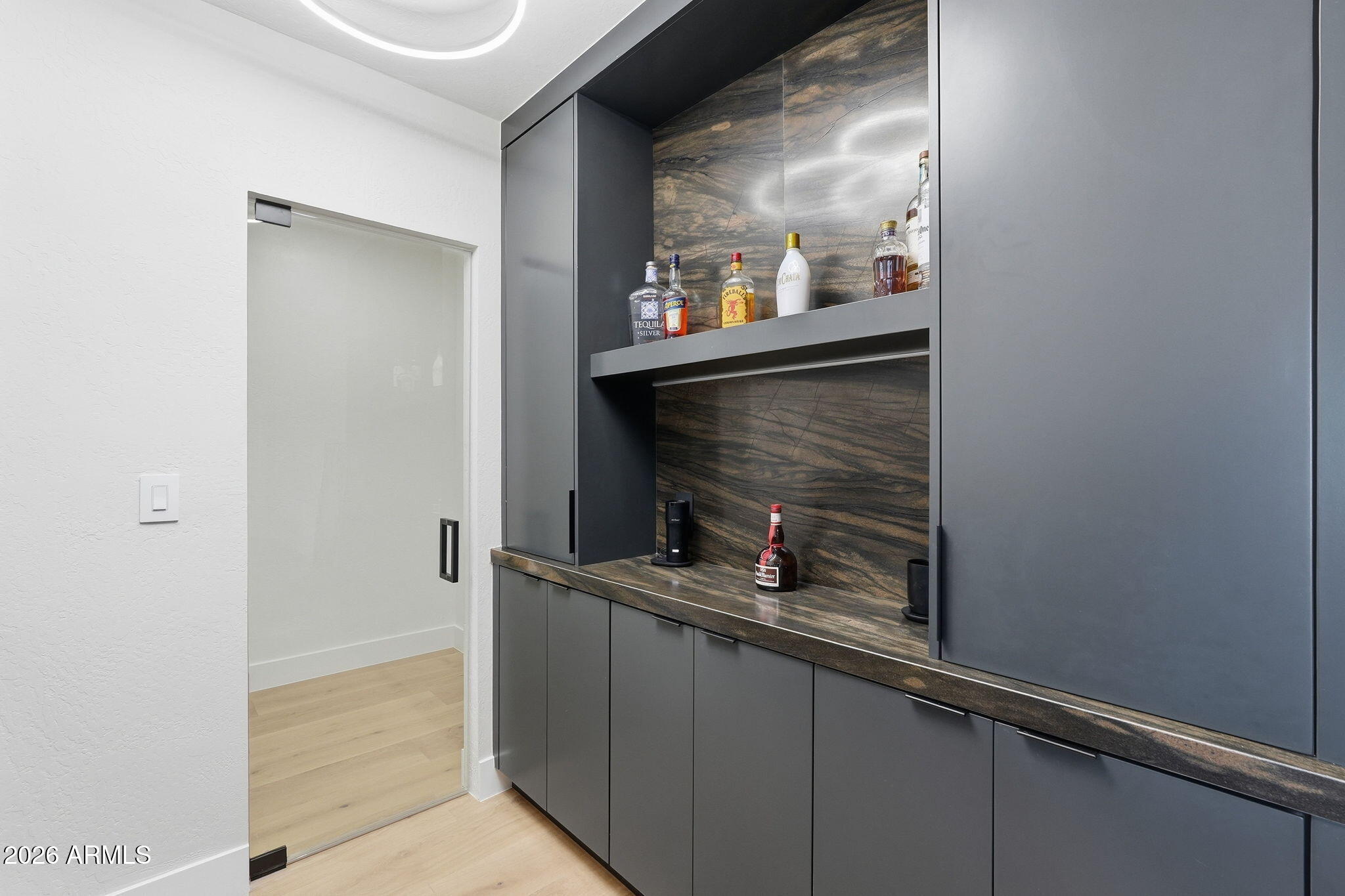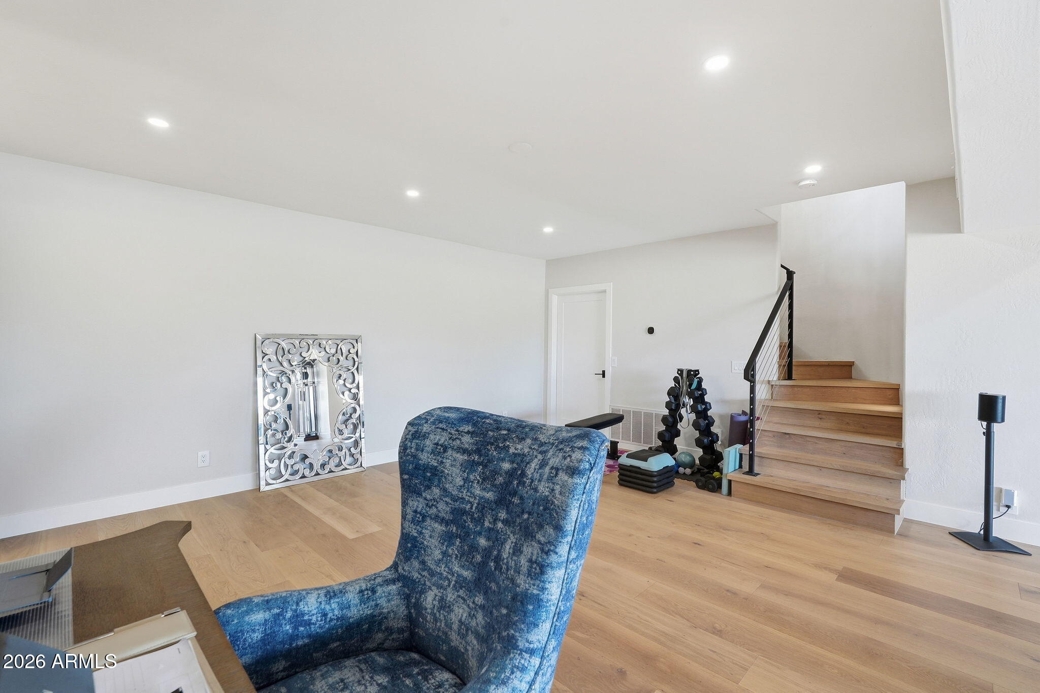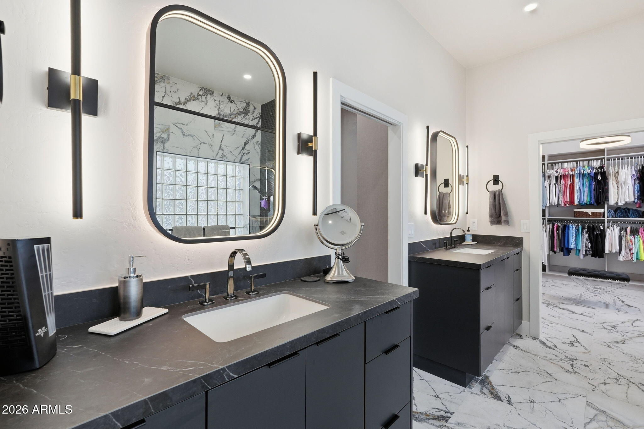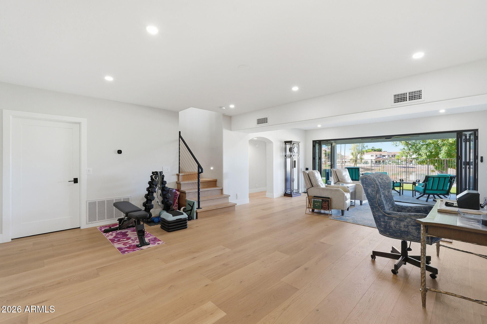 Welcome to an exceptional, luxury residence in the highly coveted Arrowhead Ranch community. This home has been completely redesigned to embrace todays modern lifestyle, offering an incredible location with stunning golf course and pond views that provide the perfect backdrop for enjoying those beautiful Arizona sunsets.The thoughtfully crafted layout features three spacious bedrooms and three-and-a-half bathrooms, along with the rare convenience of two laundry rooms. The kitchen stands out as a true chefs dream, equipped with top-of-the-line Monogram appliances, an induction cooktop, sleek flat-panel cabinets, and a striking quartzite waterfall island complemented by matching quartzite countertops and backsplash. A high-end Rohl kitchen faucet adds to the refined touches. Throughout the home, contemporary lighting elevates every space, with 4-inch LED ceiling cans on dimmer switches creating the ideal ambiance. High-end hardwood flooring flows seamlessly through the main living areas, while upgraded carpet and padding grace bedrooms one and two. A sophisticated metal staircase and a stunning metal-and-glass 48-inch front entry door make a dramatic first impression, paired with two-panel solid wood doors and premium Emtek hardware found throughout.The master bath is a luxurious retreat, boasting double-sided lighted mirrors, high-end upgraded Brizo plumbing fixtures in both the bath and shower, and premium master faucets, along with upgraded cabinetry in the master closets. A dedicated wet bar area features quartzite tops, upgraded cabinets, and an integrated wine room for effortless entertaining.Additional high-end upgrades include a whole-house water filtration system, an epoxy-finished garage floor, built-in wood stairs, Ecobee thermostats for smart climate control, and two separate AC and heating units for zoned comfort. The home is further enhanced by cabinet upgrades in the master closets and impressive full 12x9 Arcadia doors on each level that fully open, seamlessly blending indoor living with the outdoor views.This meticulously updated residence combines premium finishes, practical luxury features, and an unbeatable setting in one of the areas most desirable communities--ideal for those seeking turnkey elegance with resort-like surroundings. Primary, is on main living area with bonus room, wet bar and additional bedrooms on lower level. Home is being sold below appraisal from last year.