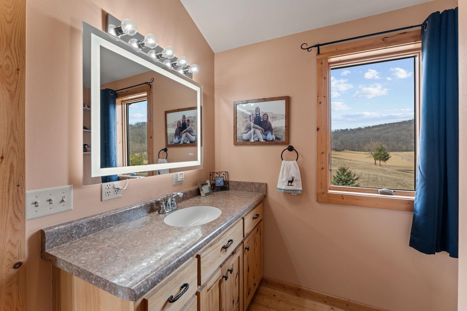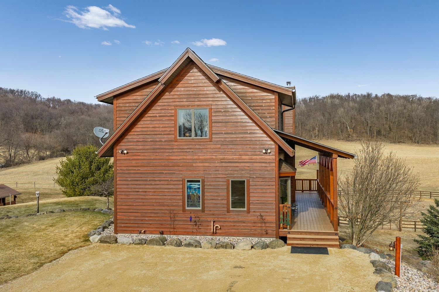 Sauk Prairie School District. Discover timeless craftsmanship and refined country living at this North Woodsstyle post-and-beam home on 58.64 serene acres. Built in 2010, the 3 BR, 2.5 BA, 2,100 SF residence showcases cedar siding, vaulted ceilings, a loft, propane heat, lite speed Fiber Optic internet, drilled well, and at-grade septic. Enjoy scenic views, trophy deer, turkey.