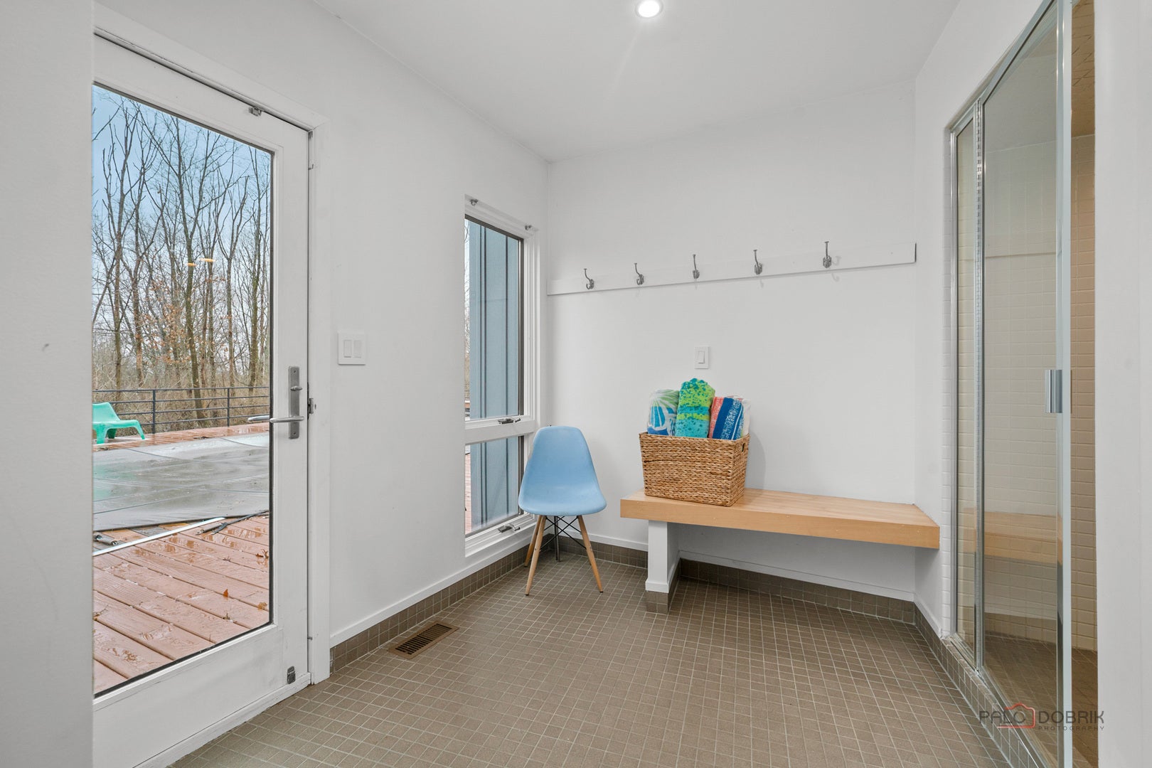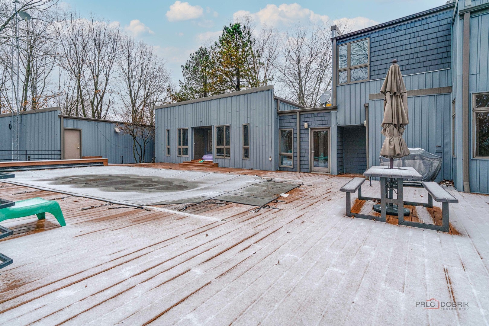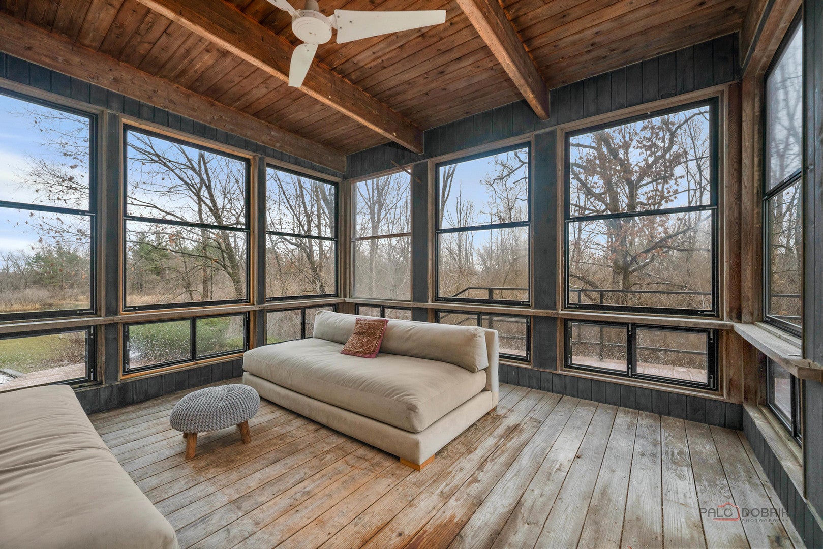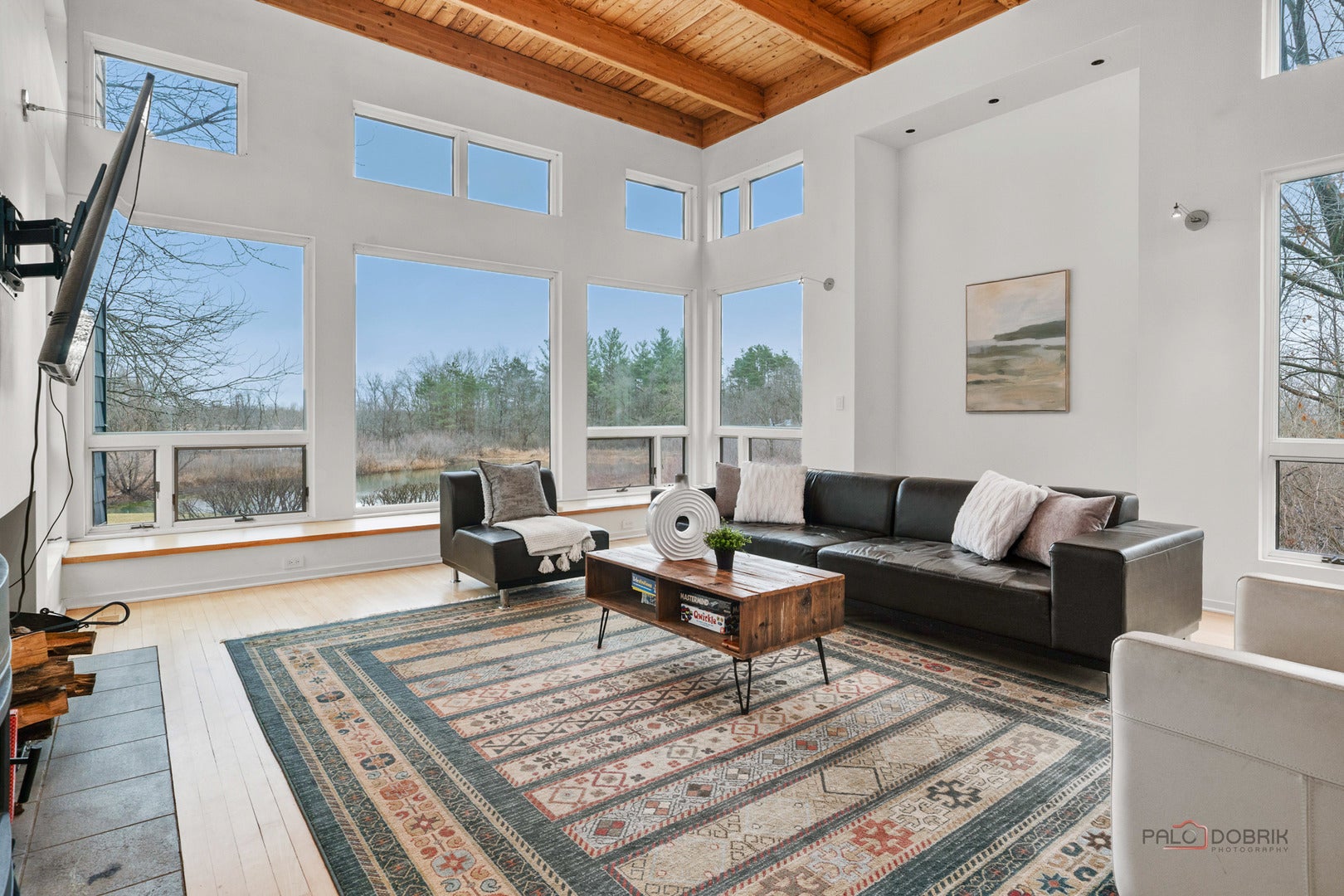 Welcome to this extraordinary 5-bedroom, 4-bathroom retreat nestled on a breathtaking, nature-surrounded 25-acre lot. Offering a rare blend of luxury, privacy, and resort-style living, this exceptional property features a private pond, tranquil forest views, and a sparkling in-ground pool-creating the ultimate escape just minutes from town conveniences. A dramatic two-story wood-beamed ceiling with skylights fills the home with natural light, seamlessly blending indoor elegance with the beauty of the outdoors. To the left of the foyer, a spectacular great room unites the living and family rooms. Walls of windows frame stunning pond views, while two fireplaces-one in the family room and a striking multi-sided fireplace shared between the living and dining areas-add warmth and architectural distinction. The dining area opens directly to an expansive deck, ideal for effortless indoor-outdoor entertaining. The gourmet kitchen is a true showpiece, highlighted by a luxurious oversized marble waterfall island with breakfast bar seating, a spacious pantry closet, and abundant cabinetry. Soaring wood-beamed ceilings and skylights enhance the bright, modern aesthetic, while direct access to the screened porch makes al fresco dining and seasonal relaxation a delight. A conveniently located first-floor laundry closet adds everyday ease. Designed with entertaining and poolside living in mind, a full bath on the main level offers direct access to the in-ground pool-perfect for guests and post-swim convenience. Down the hallway, two generously sized bedrooms share a Jack-and-Jill bath, each with access to the pool area for a seamless indoor-outdoor lifestyle. Upstairs, a stunning loft welcomes you with skylights, a private balcony, and a fireplace-an inviting space that captures panoramic nature views. The loft leads to the primary suite, featuring a spa-inspired ensuite with a soaking tub, separate shower, and expansive windows overlooking peaceful scenery. A second bedroom completes the upper level, which can easily function as an expansive private primary retreat if desired. The fully finished basement further expands the living space with a large recreation room, fifth bedroom, full bath, and walk-up access to the garage-offering privacy and flexibility for guests or extended family. This remarkable home delivers the perfect balance of refined luxury and natural beauty-an exceptional opportunity for buyers seeking a private retreat, vacation-style living, and a peaceful escape from the city.