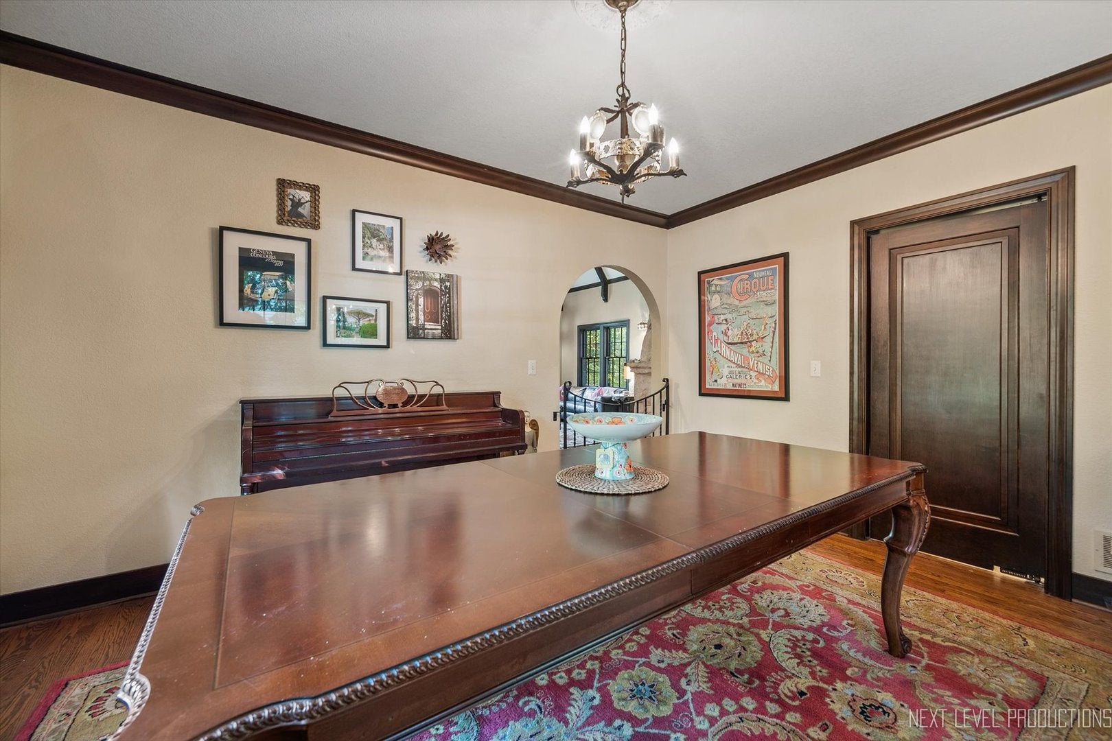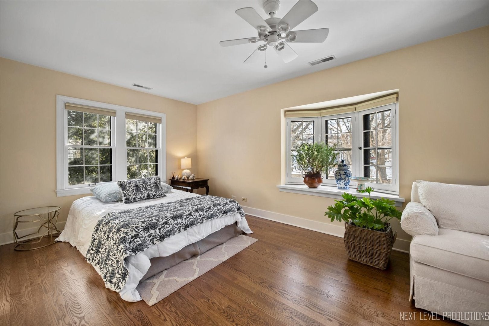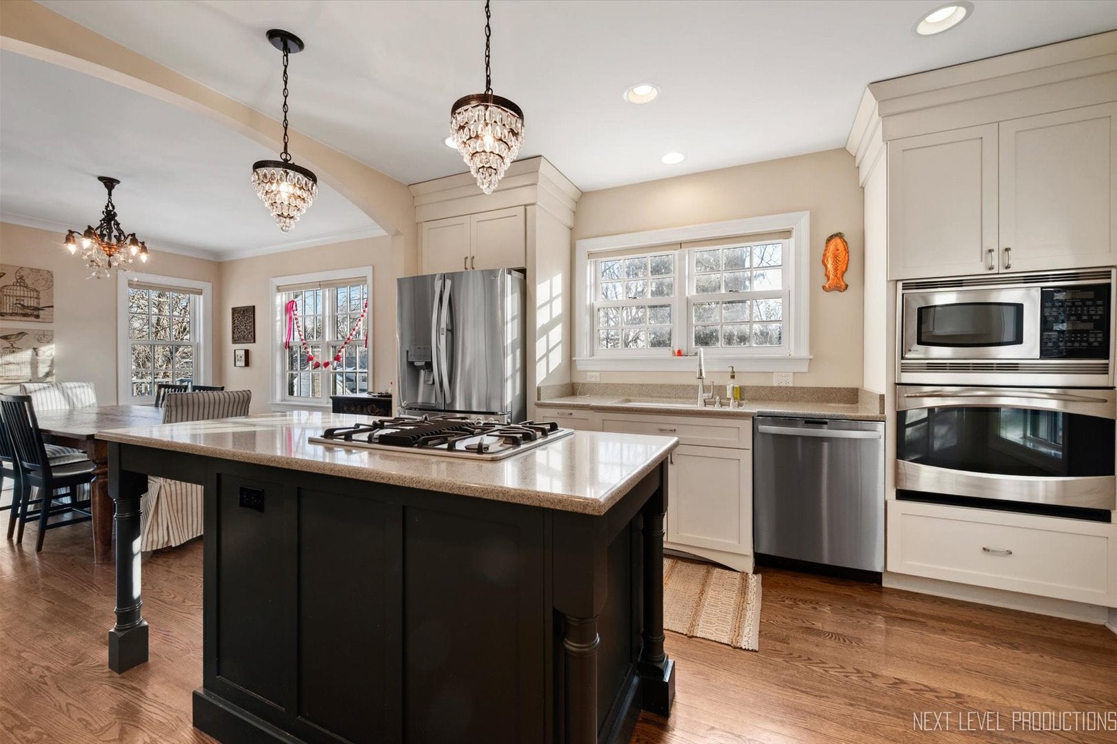 Step inside one of the most charming homes in downtown Geneva! This Tudor Revival style beauty is ideally located just one block from the Fox River and two blocks from historic Third Street with its boutique shopping and dining - this home truly has it all! A stunning brick and stone exterior and inviting side courtyard set the tone! An original arched entry door opens to a welcoming foyer with custom tile flooring and another arched doorway that leads into the dramatic two-story great room. Stunning hardwood floors flow throughout most of the main level! The breathtaking two-story great room features a beamed ceiling, striking stone fireplace, and Juliet balcony above. The formal dining room offers an arched entry, crown molding, and a corner built-in surrounded by windows. The chefs kitchen is beautifully appointed with 42 cabinetry (some with glass fronts) and crown molding, quartz countertops, stainless steel appliances, a large island with breakfast bar, and an eating area with arched entry and access to an elevated deck overlooking the picturesque, tree-lined yard. The spacious main floor primary suite features dual wall closets and a private bath with two vanities and an oversized glass-door shower, hardwood floors continue, and the Juliet balcony overlooks the great room below. Three additional bedrooms and two full baths complete the second level. The finished basement offers a media space and laundry room with utility sink. A rare 4-car garage provides incredible flexibility, and the fenced wooded lot includes a built-in fire pit and generous entertaining space. With its unbeatable location, nearby amenities, and acclaimed Geneva schools, this exceptional home is an obvious choice!