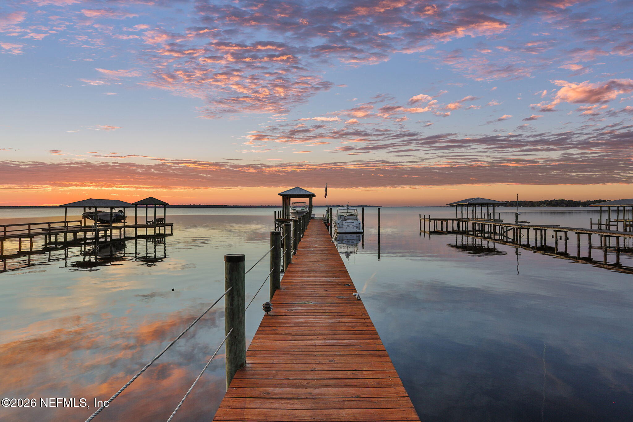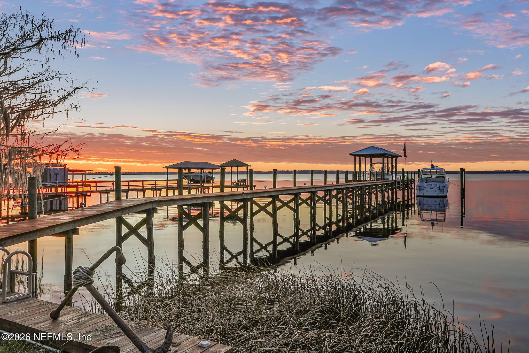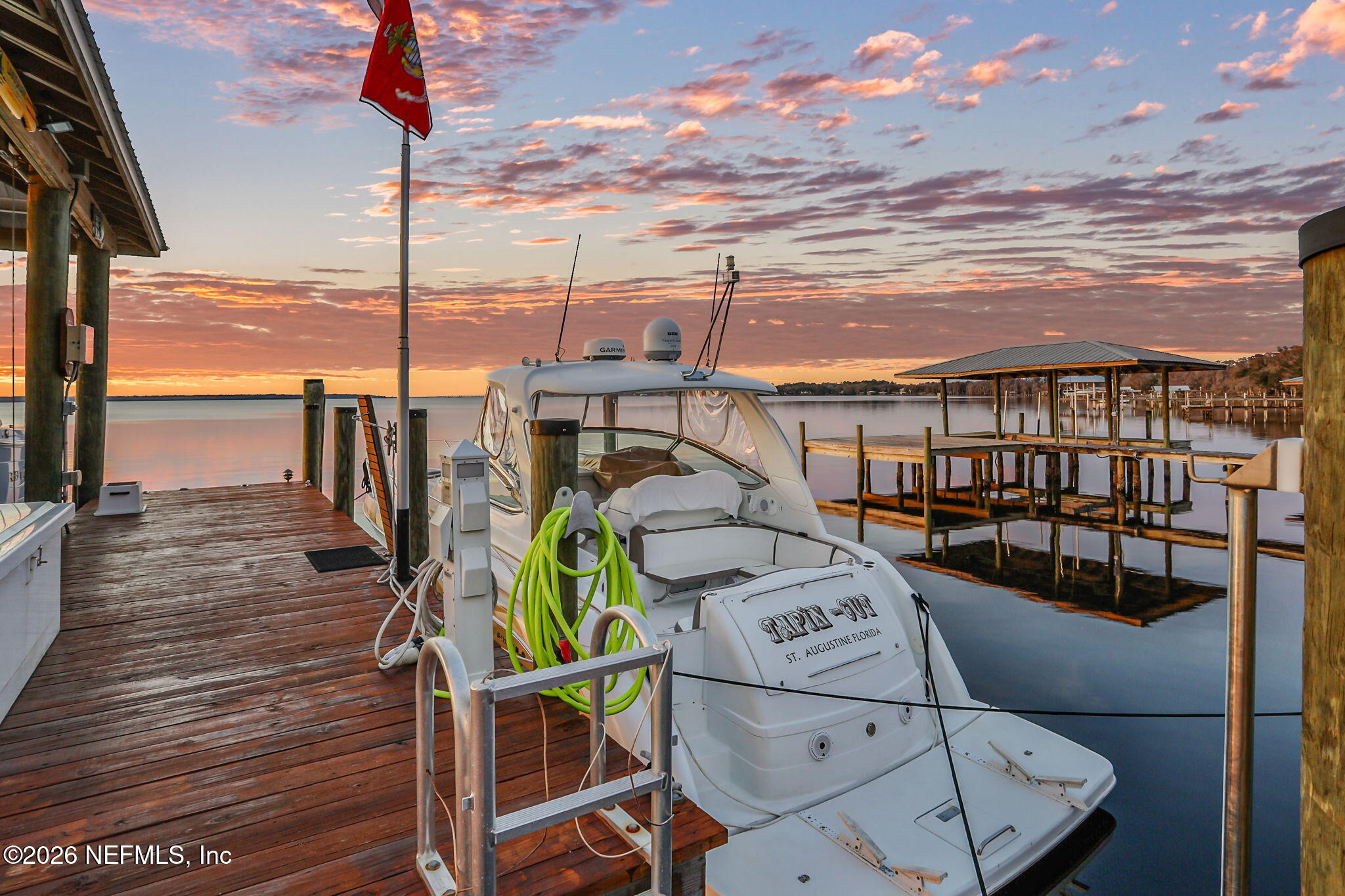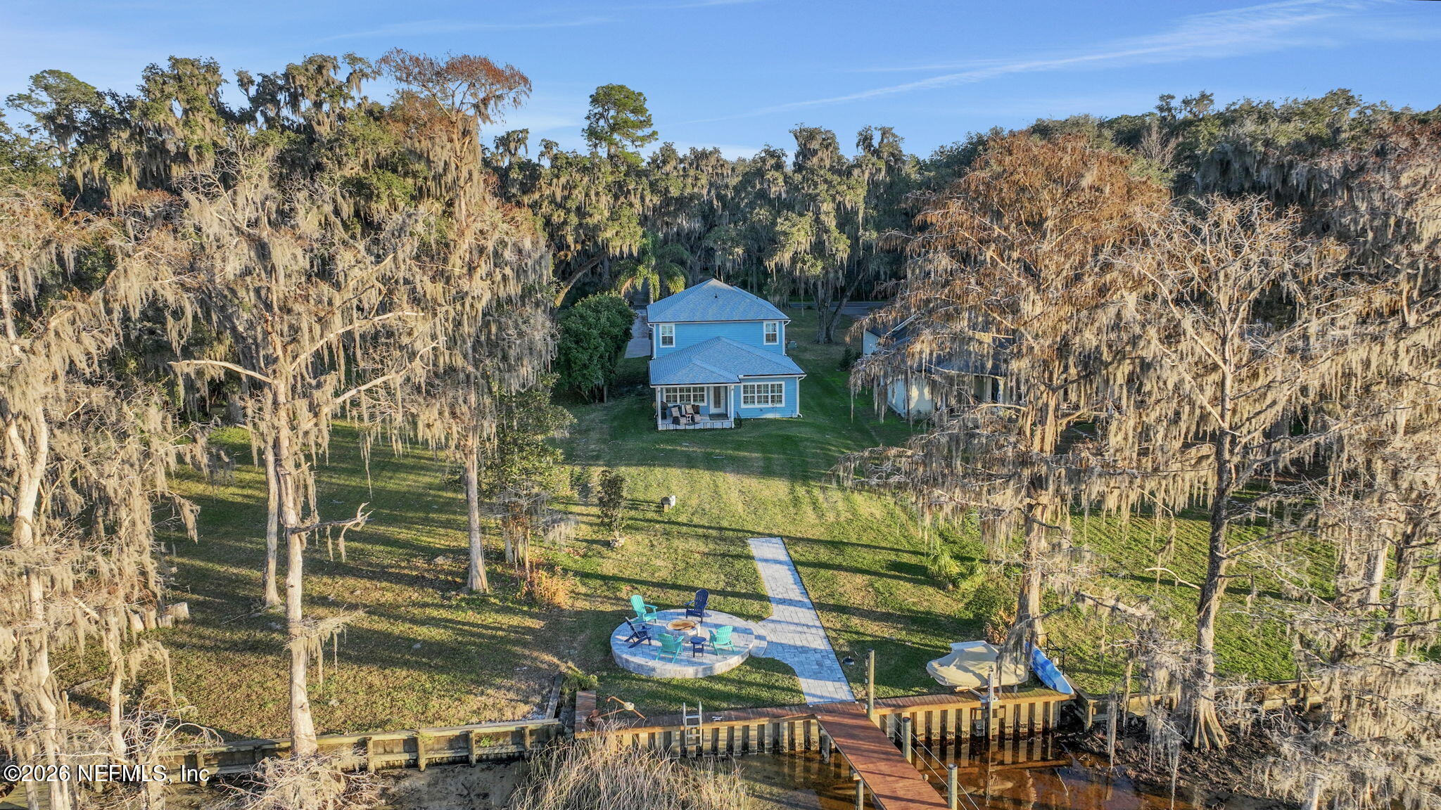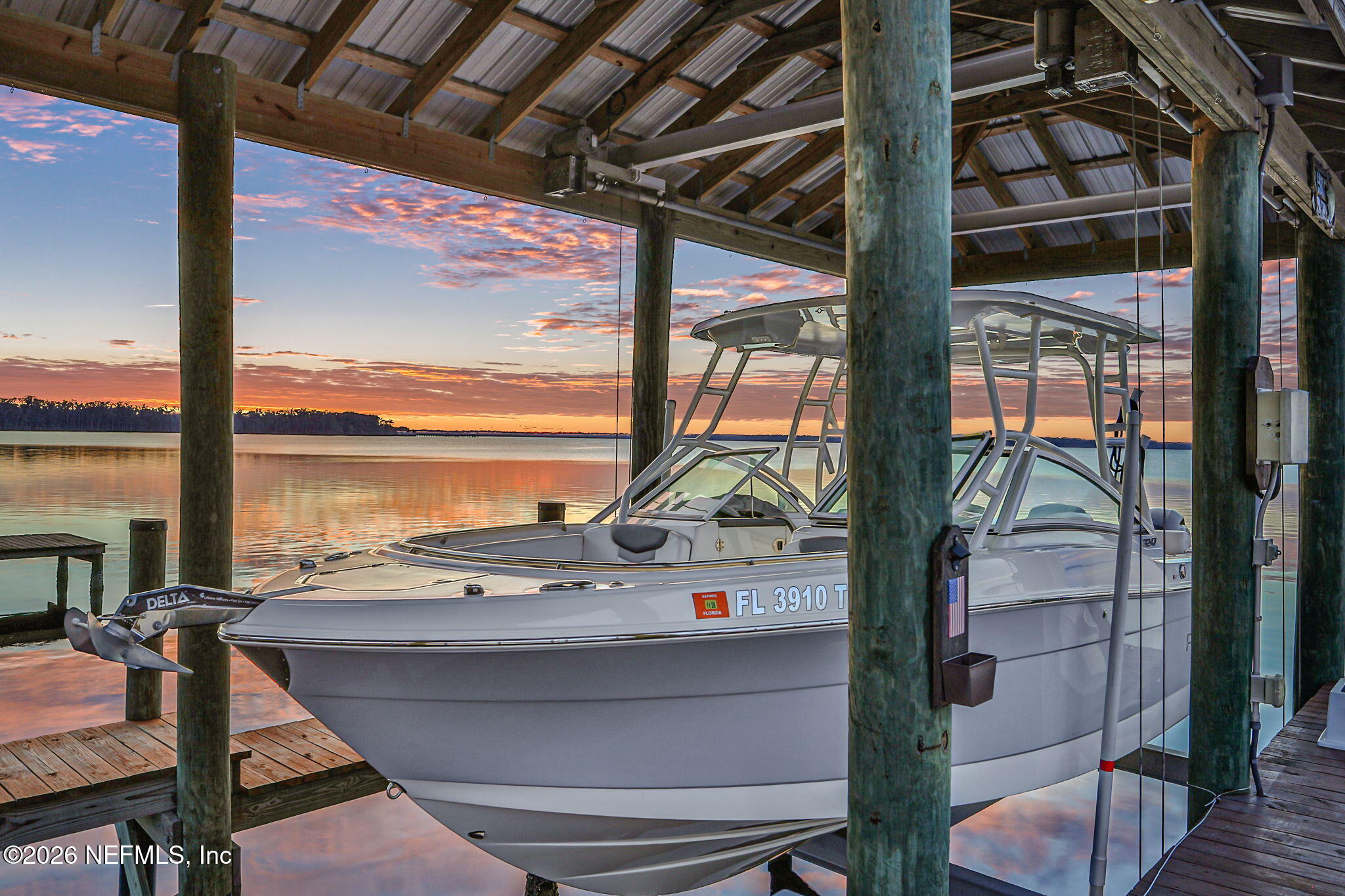 The river is the jewel of this home. Newly constructed in 2024 and set along the St. Johns River with 50 feet of prime frontage, this 4-bedroom, 2.5-bath property is designed for those who want to fully embrace waterfront livingboating, relaxing, and taking in unforgettable sunsets right from their backyard. Your private dock and boating setup are exceptional, featuring a 10,000-lb boat lift, 50-amp marine power, treated water, jet ski lift, and accommodations for up to a 50 yacht. The expansive 450-ft dock includes oversized custom pylons and 50,000-lb stainless steel tide slides, while the PVC vinyl bulkhead is just four years old. Shallow water near the property makes navigation easy, and youre only about two miles by boat or car to Outback Crab Shack for casual riverfront dining. Inside, panoramic water views fill the main living areas and the primary suite, which is conveniently located on the first floor. The suite offers a soaking tub, glass walk-in shower, and spacious custom closet. The open-concept layout features 10 ceilings, tile flooring on the main level, wood floors upstairs, and an inviting flow designed for everyday living and entertaining. The kitchen includes a large granite island, gas cooktop, stainless appliances, walk-in pantry, and tankless water heater. Upstairs are three guest bedrooms, a Jack-and-Jill bath, and a loft with custom built-ins. Built for comfort and efficiency, the home sits on a stem wall foundation elevated 3 feet above the FEMA flood plane and includes an 18kW Generac whole-home generator, 380 artesian well with treatment system, foam-sealed attic, and plantation shutters throughout. Storage and functionality are abundant with an attached two-car garage featuring attic storage and organizational systems, plus a detached garage with cooling fans and dehumidifier. The backyard is ready for your vision, already equipped with water, electric, and gas lines for a future pool.Whether youre cruising, fishing, jet skiing, or simply enjoying the view, this home offers a rare combination of new construction, thoughtful design, resilient construction, and unmatched river access, an opportunity to live the St. Johns River lifestyle every day.