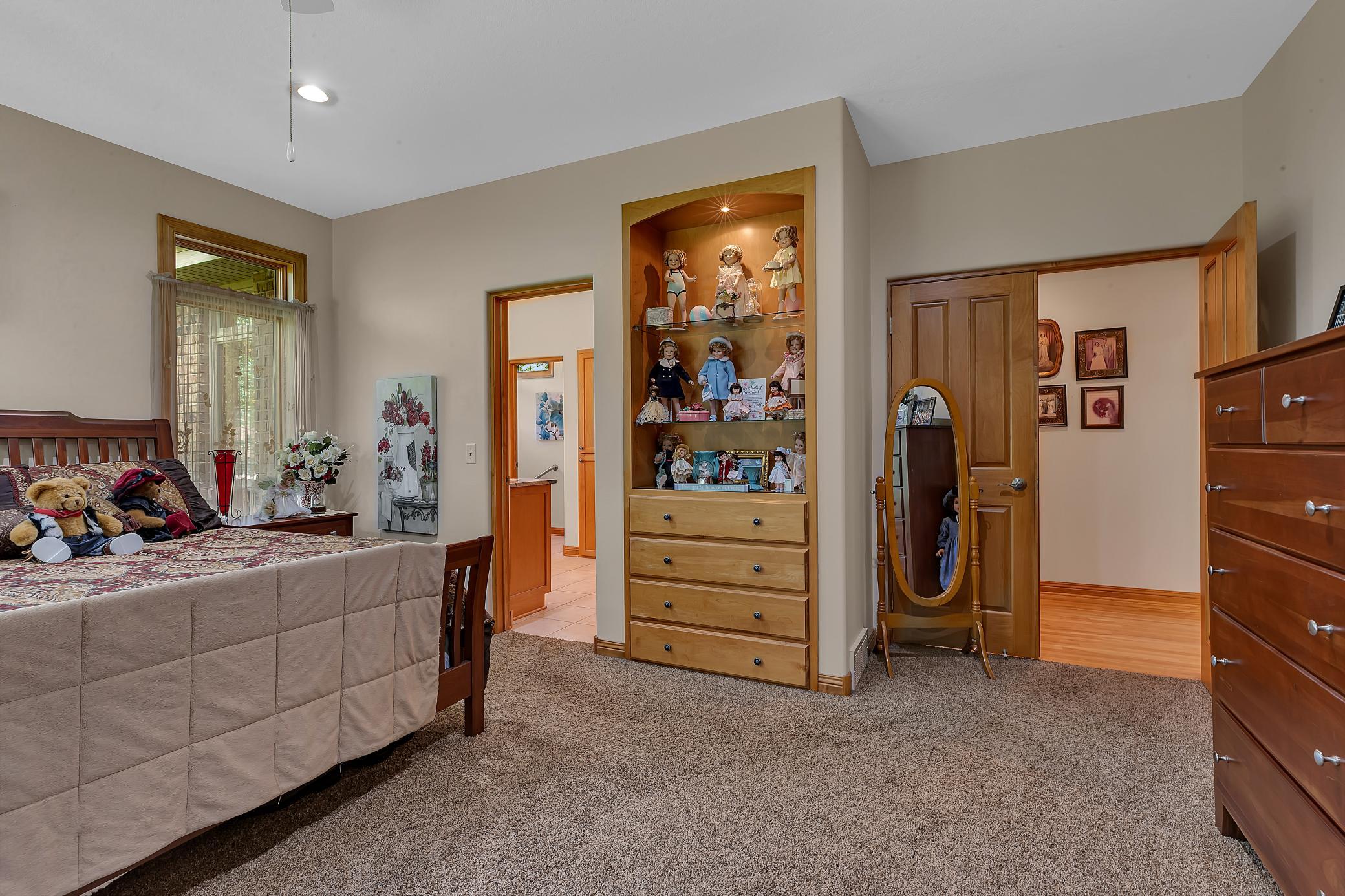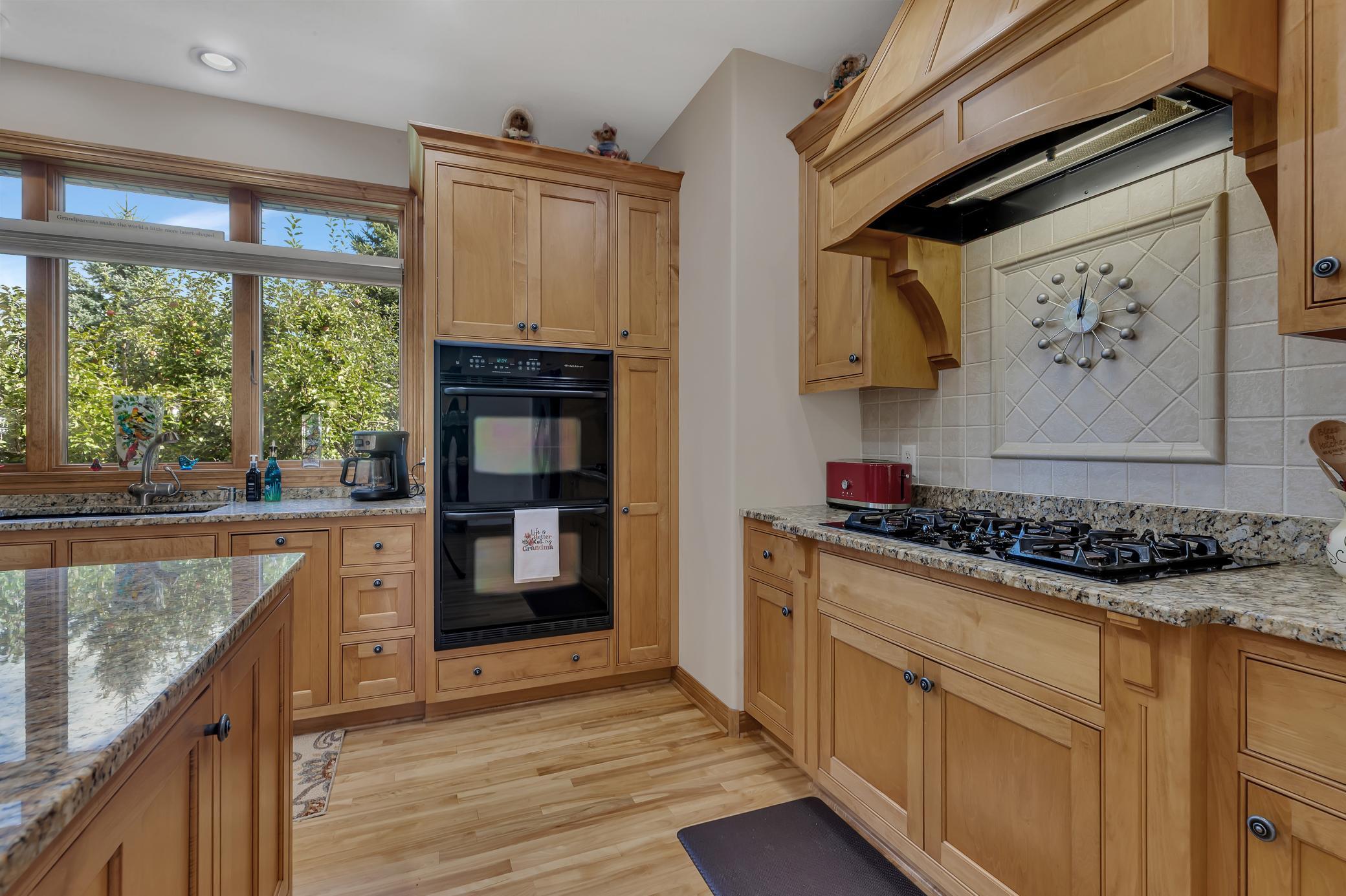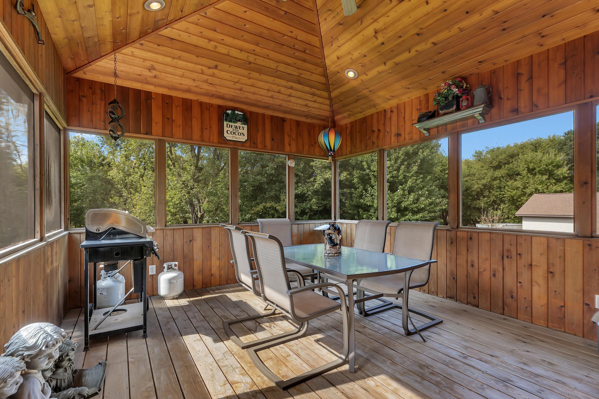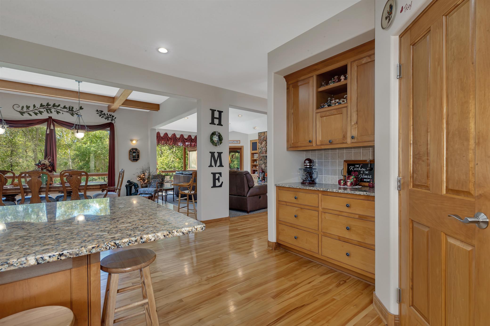 Welcome to your own private retreat - as you arrive, youre greeted by stunning all-stone and brick siding, setting a tone of elegance and durability. Recessed lighting tucked into the soffits illuminates the exterior beautifully in the evening, while stone accents and an arched, covered entryway offer a warm and inviting welcome. Architectural shingles on house and attached garage new in 2022.Step inside to find hardwood floors stretching through the foyer, dining room, kitchen, and hallways, all under knock-down textured ceilings and elegant crown molding. Rounded wall corners, four-panel birch doors, and dual-pane Andersen windows add refined touches throughout. The kitchen features flush-mount cabinetry, a large center island with an outlet and CAT-5 outlet, granite countertops, tiled backsplash, LED recessed lighting, and surround sound. A brand-new refrigerator/freezer (installed September 2025) ensures modern convenience.Adjacent, the dining room showcases exposed ceiling beams and a built-in kitchenette with granite countertops and accent lighting. The living room exudes warmth with its trey ceiling, gas fireplace framed in stone, and built-ins on both sides, all lit with recessed lighting and enriched by surround sound.The spacious primary suite is a private haven with double French doors, ceiling fan, recessed lighting, surround sound, and built-in cabinetry with glass shelving. The en-suite bath includes a double vanity, jetted tub, walk-in tiled shower with bench, enclosed toilet area, and transom windows that invite natural light. A generous walk-in closet with custom organizers completes the suite.A versatile second main-level bedroom features a walk-in closet and custom built-insideal for use as an office, craft space, or guest room. The Murphy bed remains with the home, adding flexibility. Just off the garage, a ceramic-tiled half bath and 10 x 11 storage room with built-in closet systems.The attached garage is a dream: fully finished, insulated, heated with a gas furnace, and includes floor drains, commercial-grade epoxy flooring, three overhead doors (all with openers), and a service door. A pull-down ladder leads to overhead storage, and a staircase descends to the lower-level tuck under garage with more epoxy floors, built-ins, refrigerator/freezer, and its own overhead garage door.The lower level of the home continues to impress with in-floor heating, LED recessed lighting, surround sound, and paneled doors throughout. The family room includes a stone-surround gas fireplace and built-in entertainment center, while the adjacent wet bar offers granite counters, custom cabinets, wrap-around raised seating, a refrigerator/freezer, and tiled backsplashperfect for entertaining. A separate bonus room opens to the backyard and is ready for game tables or hobby setups, complete with lighting and sound.Two lower-level bedrooms each feature large walk-in closets with built-in organizers, ceiling fans, and recessed lighting. The stylish three-quarter bath includes dual vanities, granite countertops, custom cabinetry, glass block shower with seating, and private stool area.An exercise room with surround sound and LED lighting opens directly into a sauna. Additional storage can be found under the stairs and in the mechanical room, while the laundry room offers ceramic tile, a built-in pedestal for the front-load washer and dryer (which stay), utility sink, & ample cabinetry.Enjoy evenings in the screened-in porch with a knotty pine ceiling, recessed lighting, and ceiling fanor gather around the paver stone patio near the detached 6 x 8 storage shed. Be sure to check out the small creek in the woods that runs year-round. The 28 x 36 detached garage features concrete flooring, built-in shelving, a workbench, an insulated overhead door, and a LiftMaster opener operable via smartphone (myQ app).This home is ideal for anyone seeking peace, privacy & premium features.