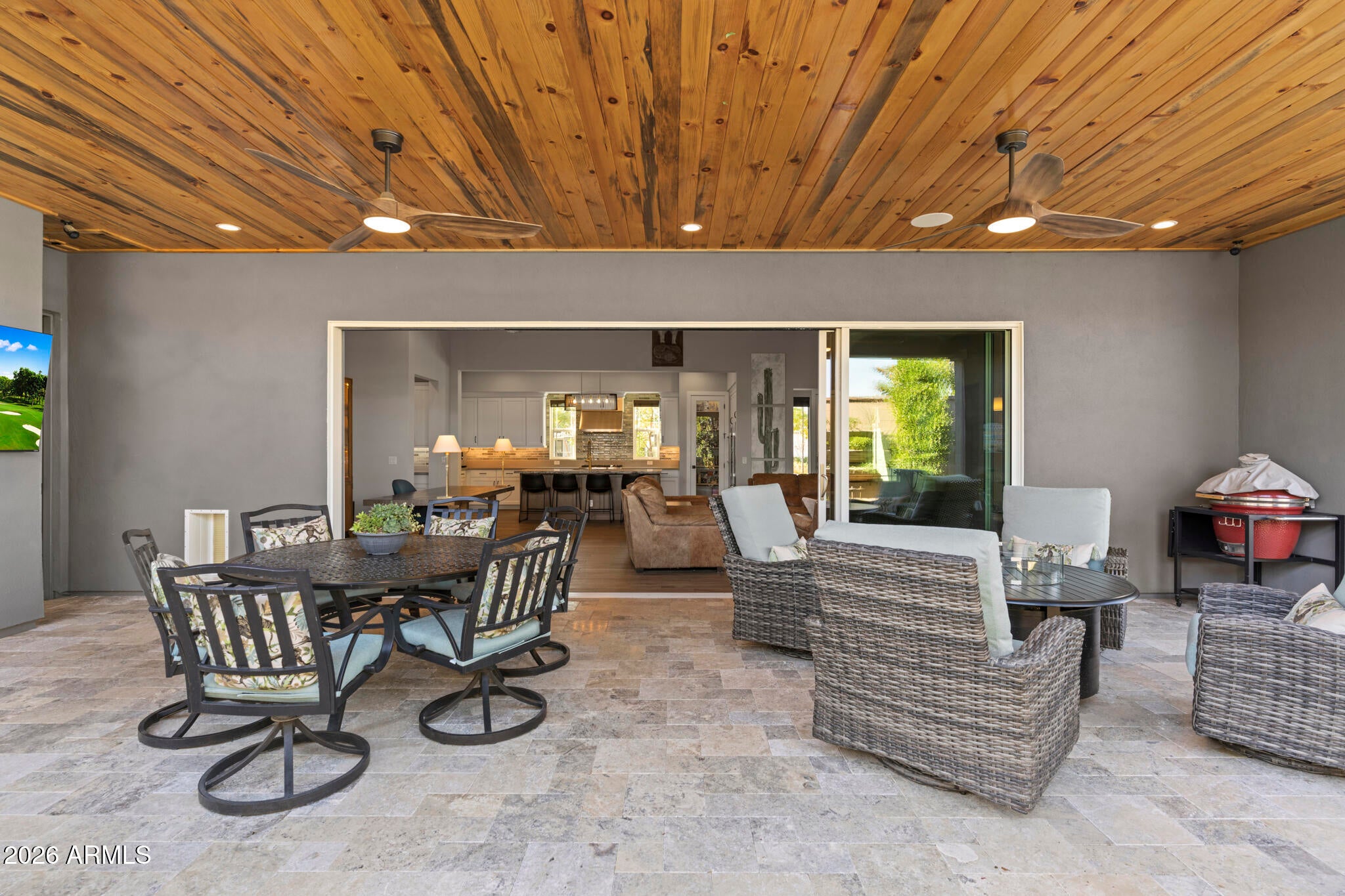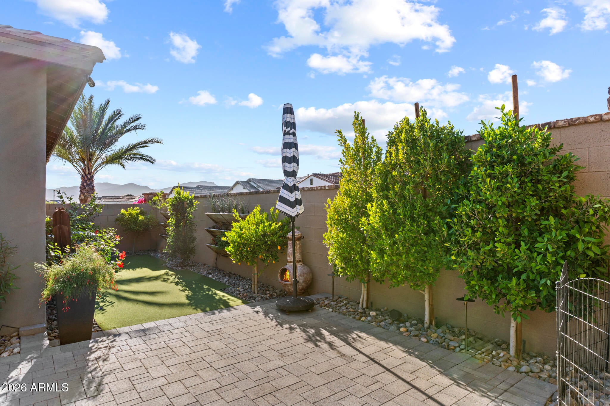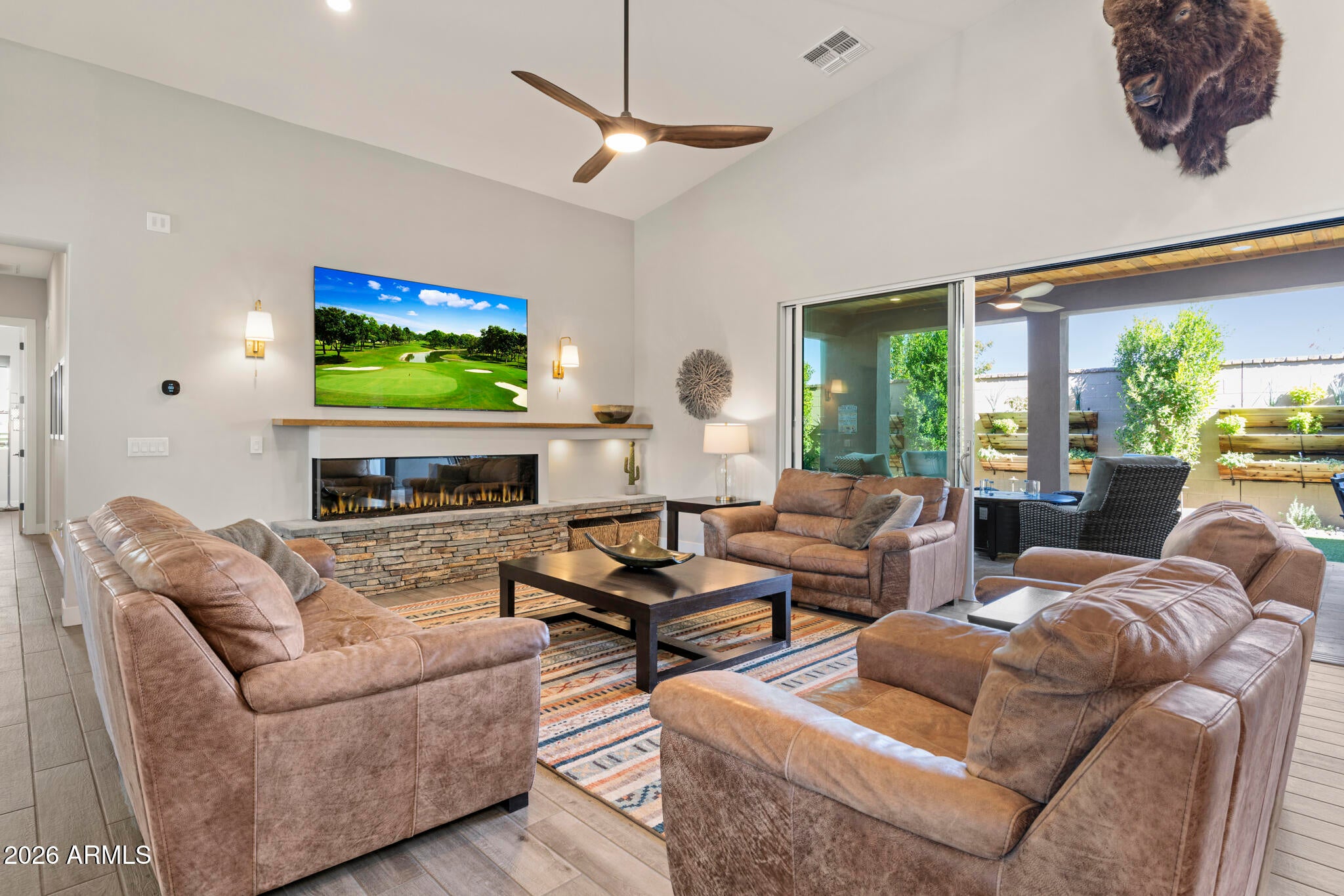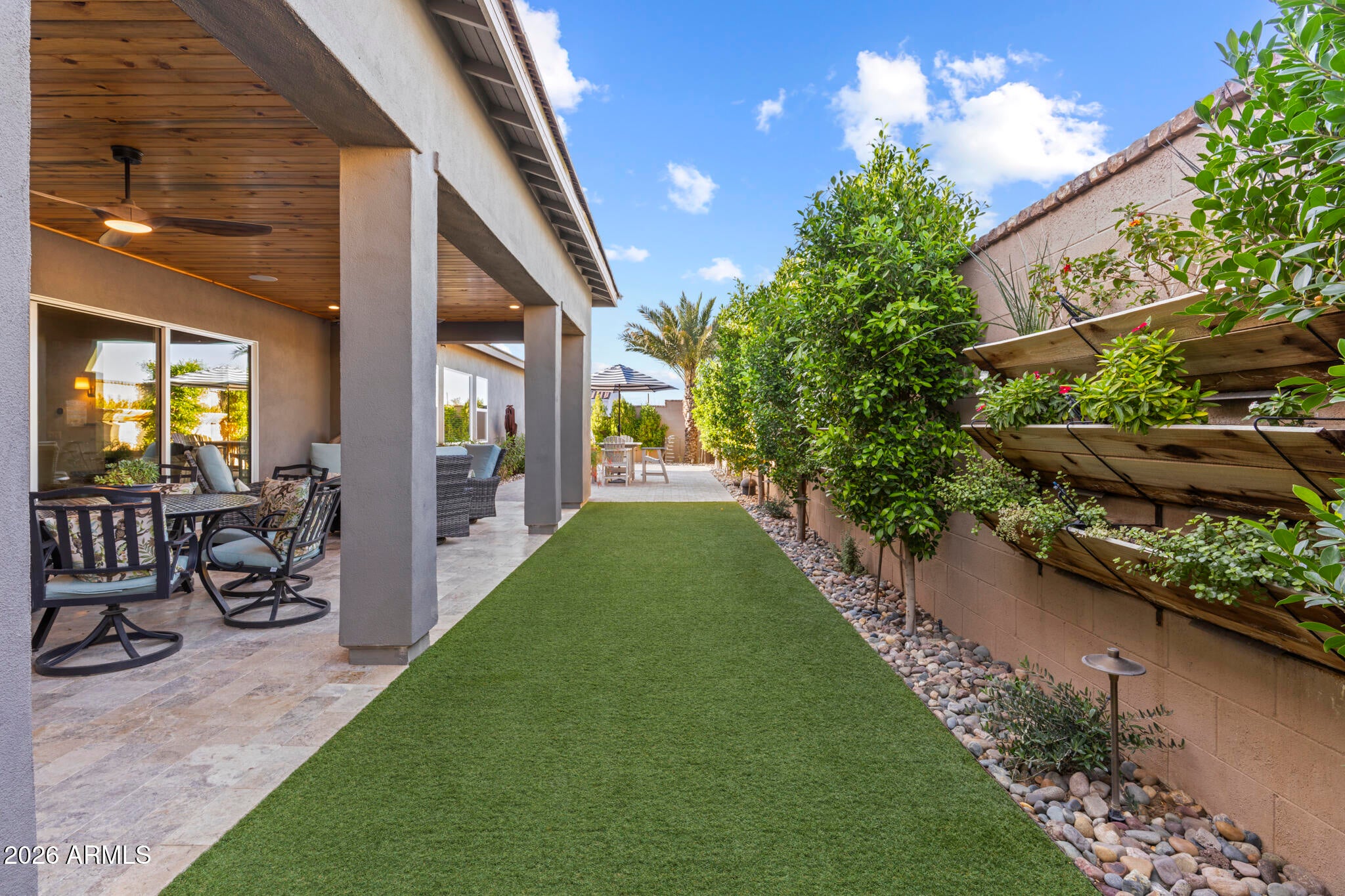 * Nearly 300K in designer renovations.* Located in the highly sought-after Vintage Condominium community, this 2 bed den, 2.5 bath extensively remodeled patio home offers a perfect blend of high-end design, modern functionality, and effortless lock-and-leave living, ideal as a full-time residence or year-round retreat, complete with a two-car garage with a charging station. Enter through the foyer into a spacious open-concept great room featuring soaring ceilings, all-new wood flooring throughout, and abundant natural light, with custom wood shutters and a built-in designer bar showcasing glass-front cabinetry and dual beverage refrigerators. The great room flows seamlessly into the dining area, highlighted by an elegant designer chandelier and sliding doors that open to the covered patio, while the fully renovated chef kitchen is open to the living spaces and also offers direct patio access, enhancing indoor-outdoor living. The kitchen impresses with white shaker cabinetry with soft-close features, quartz countertops, a striking designer tile backsplash, a contrasting oversized center island with seating and pendant lighting, all-new Bosch stainless appliances, a microwave drawer, reverse osmosis water system, and a commercial-grade six-burner gas range with dual ovens and a dramatic designer vent hood. The light-filled primary suite features designer paint, wood shutters, a custom walk-in closet with built-ins, and a completely reimagined spa-like bath with wood cabinetry, dual sinks, designer lighting and hardware, and a walk-in shower with custom glass enclosure and product niche. The additional bedroom is beautifully appointed, along with a completely remodeled guest bath, and a stylish den with two-tone paint offering a flexible living space. The private backyard backs to a wash with a view fence and is designed for relaxed entertaining, featuring a covered patio for outdoor dining, new pavers, synthetic turf, new plantings, new irrigation system with controller, and a new walkway. Extensively upgraded throughout with new sliding doors, new interior doors and trim, new flooring, new countertops, completely renovated bathrooms & kitchen, a tankless water heater, a new stackable Electrolux washer and dryer, new plumbing fixtures, a smart home electronics package, making this a truly turnkey, designer-finished home in one of Scottsdales most desirable communities.