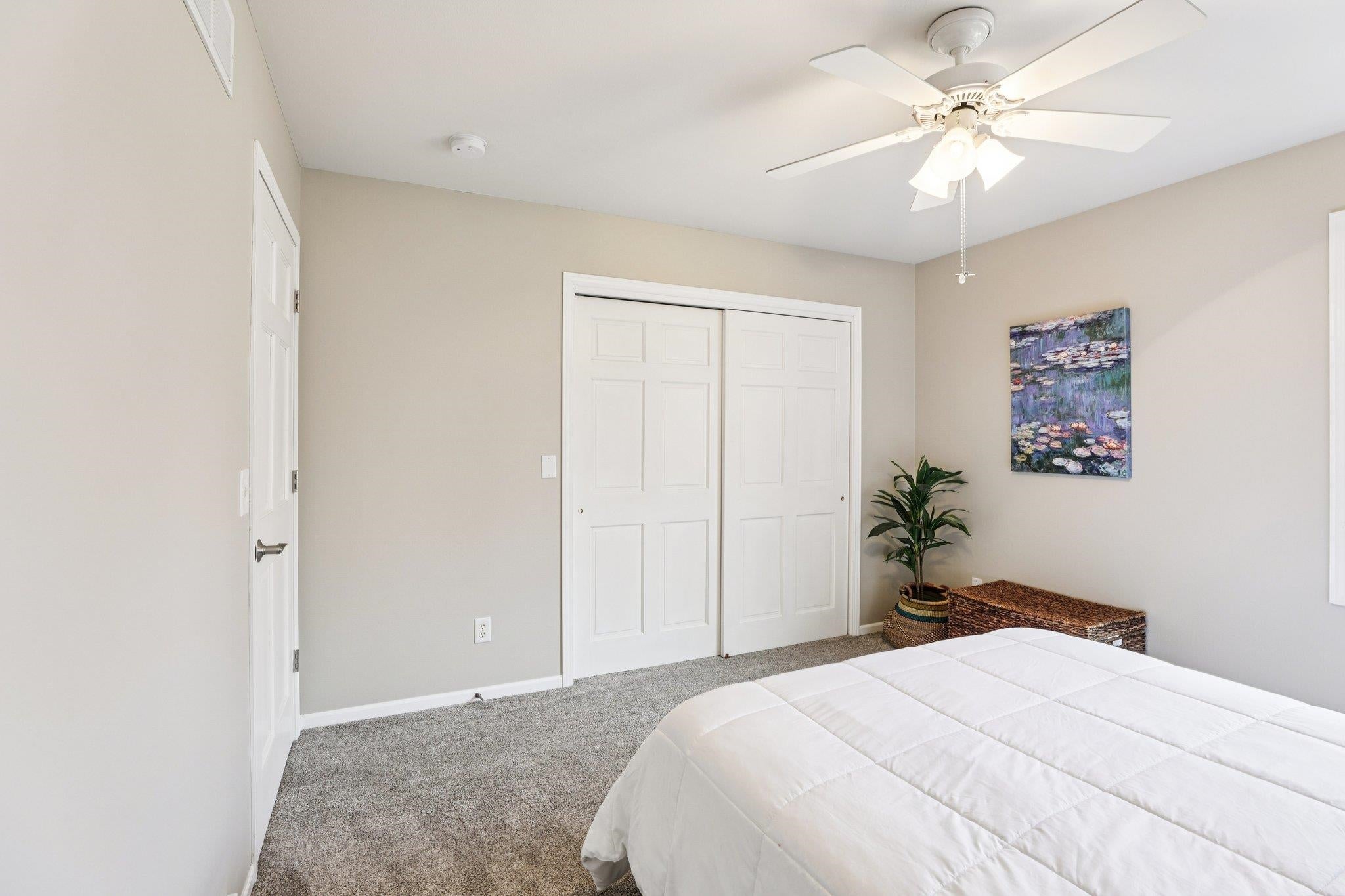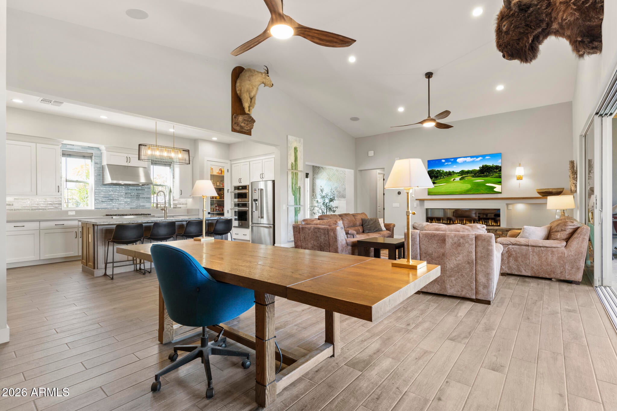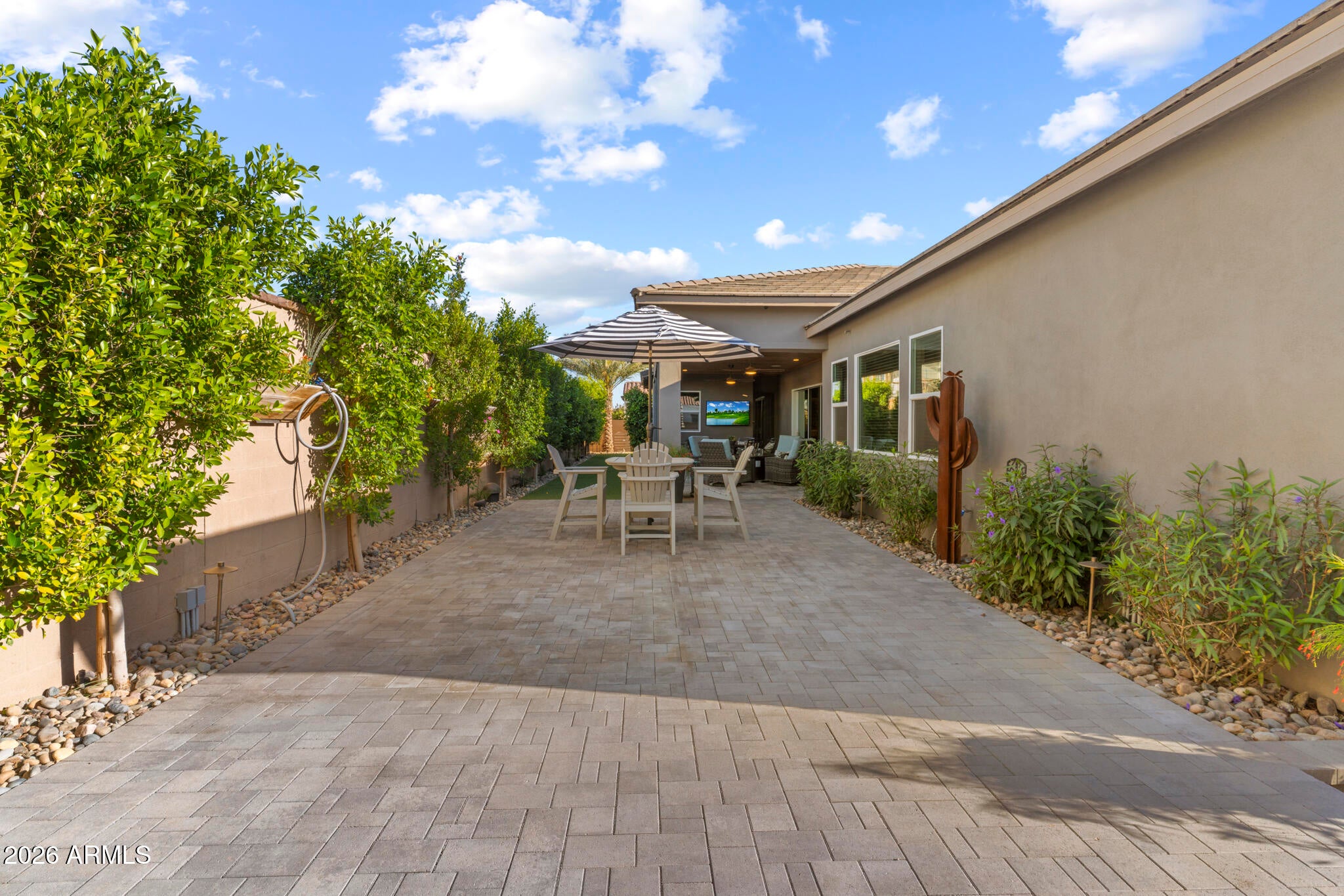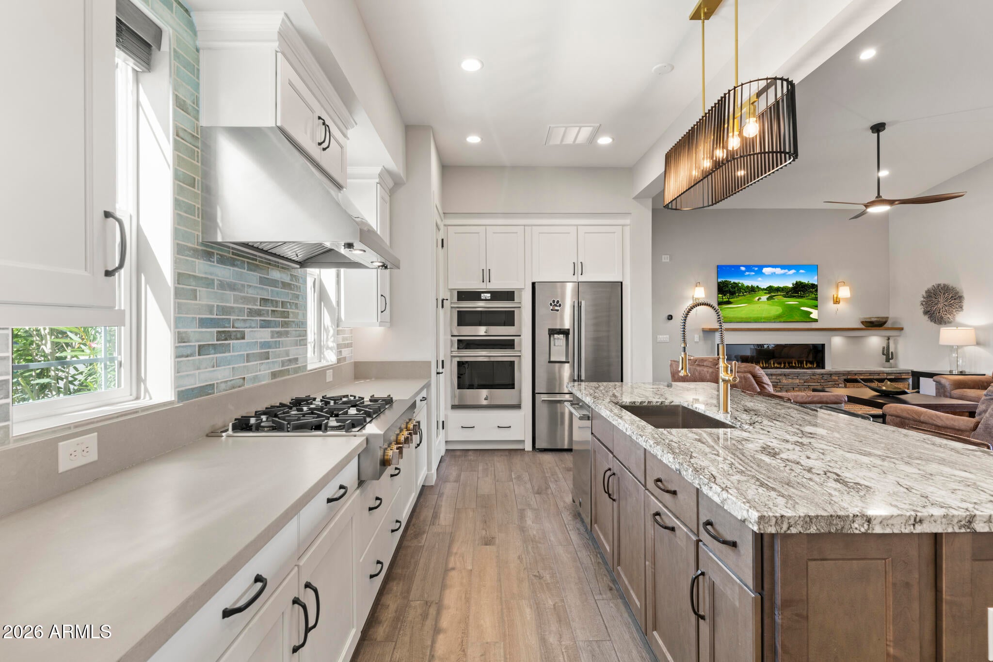 * Nearly 300K in designer renovations.* Located in the highly sought-after Vintage Condominium community, this 2 bed den, 2.5 bath extensively remodeled patio home offers a perfect blend of high-end design, modern functionality, and effortless lock-and-leave living, ideal as a full-time residence or year-round retreat, complete with a two-car garage with a charging station. Enter through the foyer into a spacious open-concept great room featuring soaring ceilings, all-new wood flooring throughout, and abundant natural light, with custom wood shutters and a built-in designer bar showcasing glass-front cabinetry and dual beverage refrigerators. The great room flows seamlessly into the dining area, highlighted by an elegant designer chandelier and sliding doors that open to the covered patio, while the fully renovated chef kitchen is open to the living spaces and also offers direct patio access, enhancing indoor-outdoor living. The kitchen impresses with white shaker cabinetry with soft-close features, quartz countertops, a striking designer tile backsplash, a contrasting oversized center island with seating and pendant lighting, all-new Bosch stainless appliances, a microwave drawer, reverse osmosis water system, and a commercial-grade six-burner gas range with dual ovens and a dramatic designer vent hood. The light-filled primary suite features designer paint, wood shutters, a custom walk-in closet with built-ins, and a completely reimagined spa-like bath with wood cabinetry, dual sinks, designer lighting and hardware, and a walk-in shower with custom glass enclosure and product niche. The additional bedroom is beautifully appointed, along with a completely remodeled guest bath, and a stylish den with two-tone paint offering a flexible living space. The private backyard backs to a wash with a view fence and is designed for relaxed entertaining, featuring a covered patio for outdoor dining, new pavers, synthetic turf, new plantings, new irrigation system with controller, and a new walkway. Extensively upgraded throughout with new sliding doors, new interior doors and trim, new flooring, new countertops, completely renovated bathrooms & kitchen, a tankless water heater, a new stackable Electrolux washer and dryer, new plumbing fixtures, a smart home electronics package, making this a truly turnkey, designer-finished home in one of Scottsdales most desirable communities.
